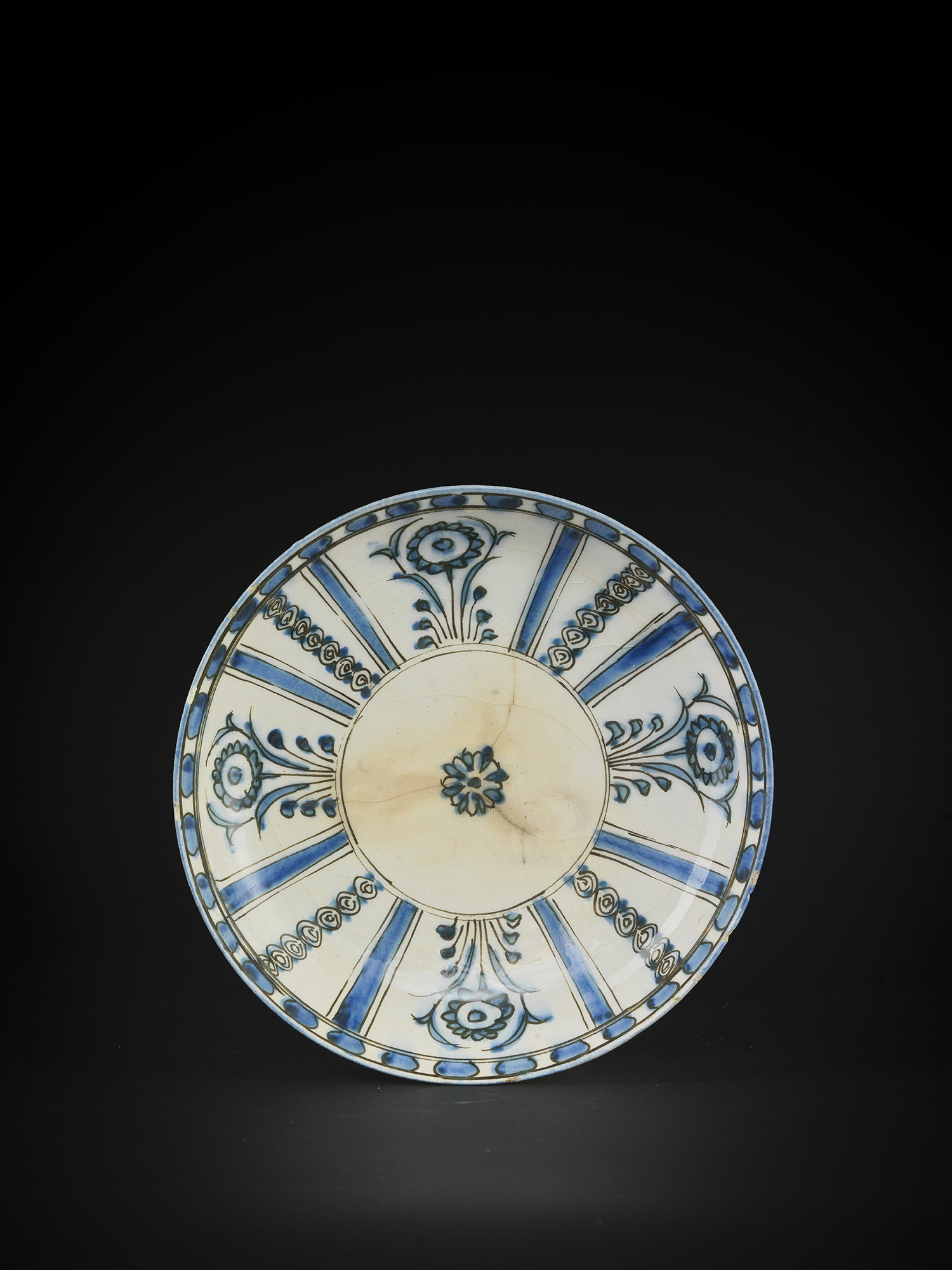 A Safavid pottery dish raised on a rim decorated in blue and black on white glaze with flowers and design. Iran 18th century.