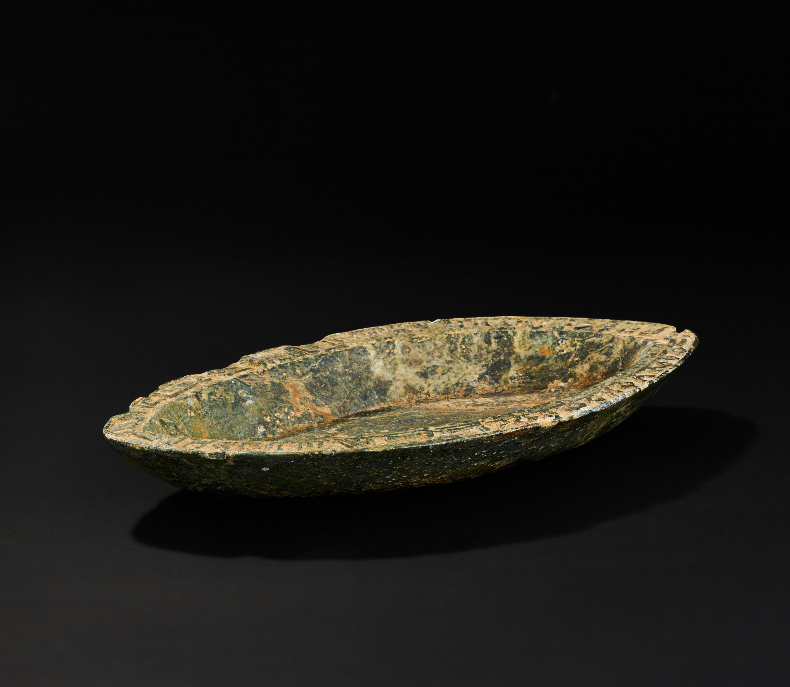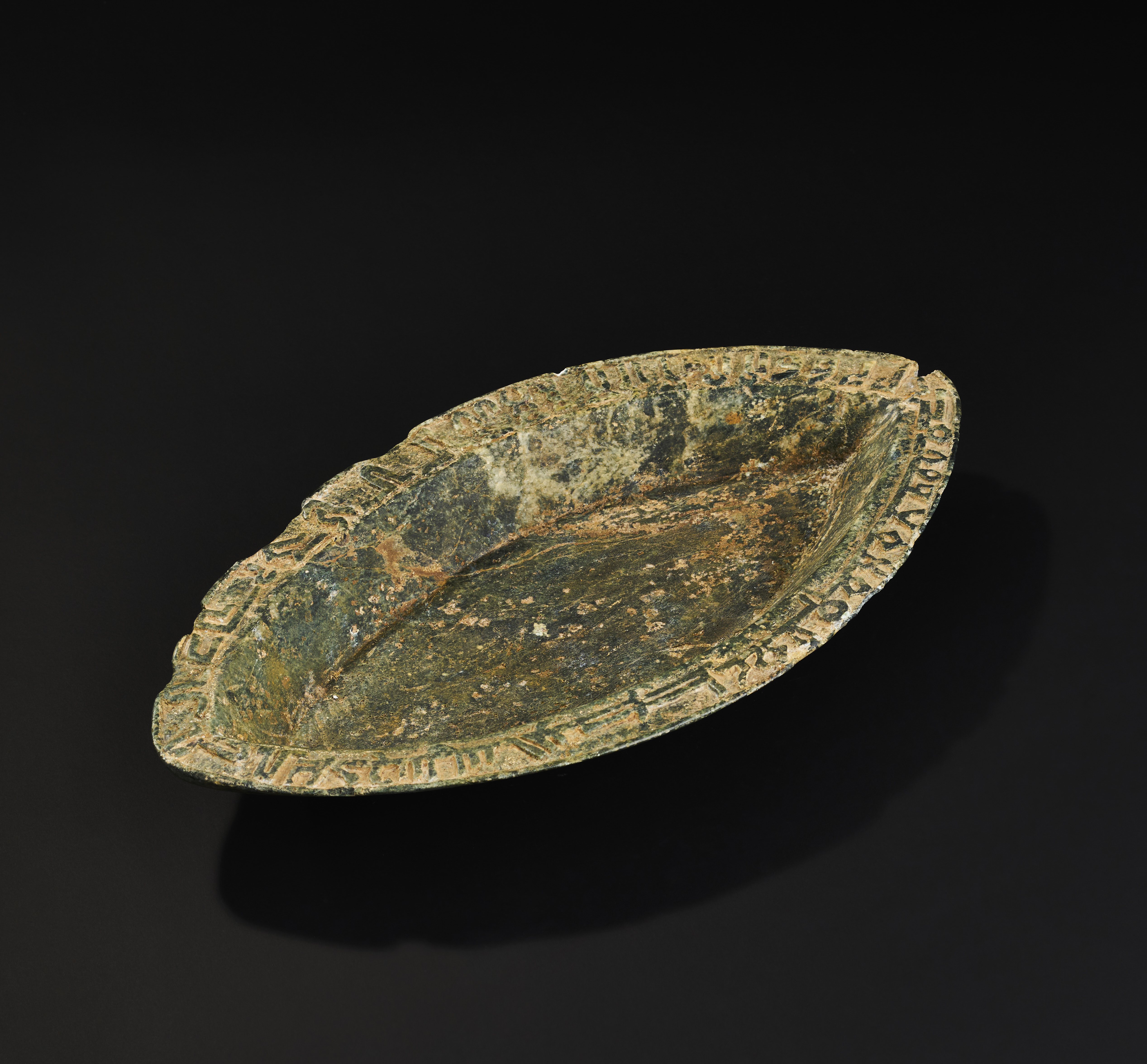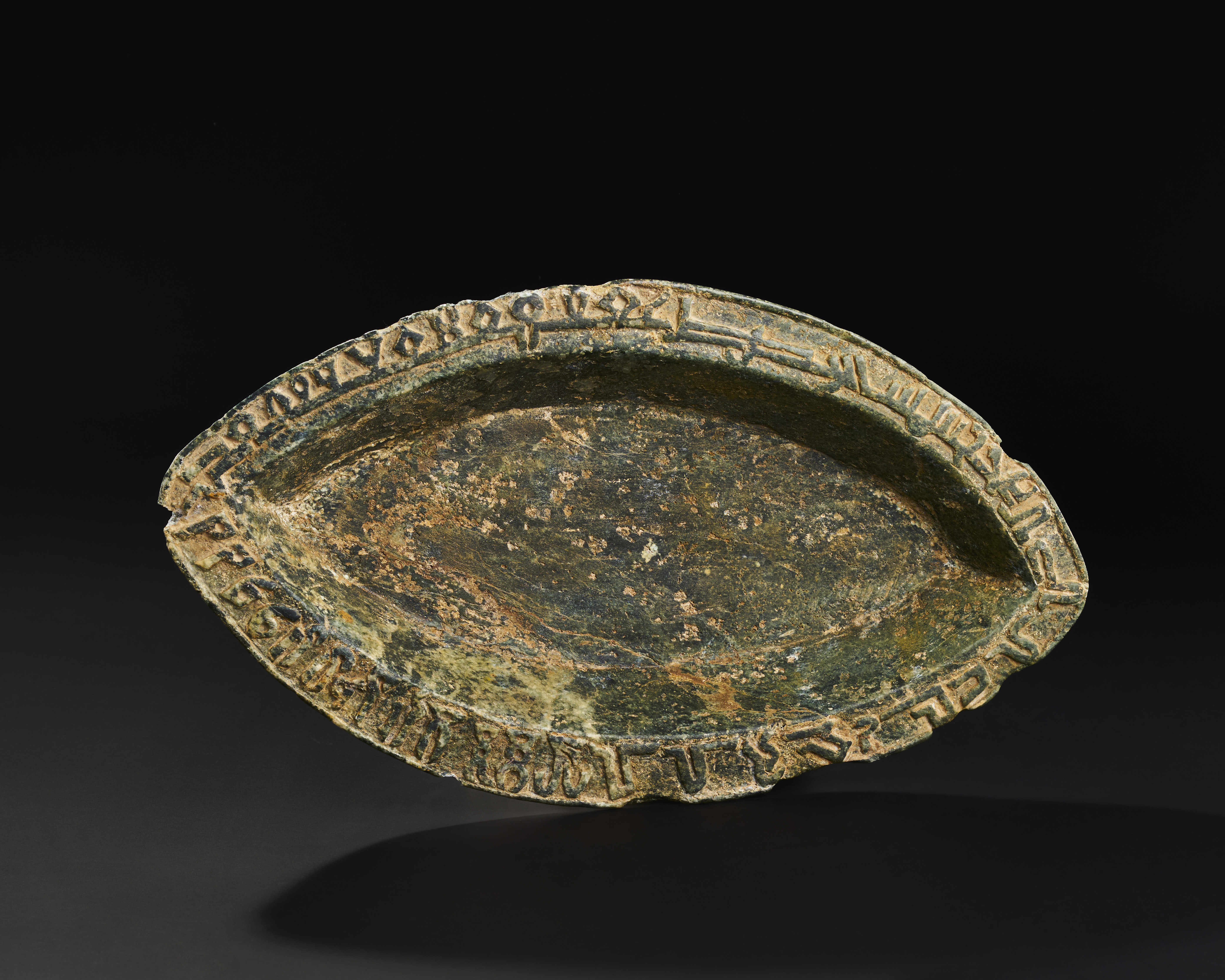 A green hard stone dish is exquisitely carved in a distinctive boat shape. Its rim is adorned with intricate inscriptions.