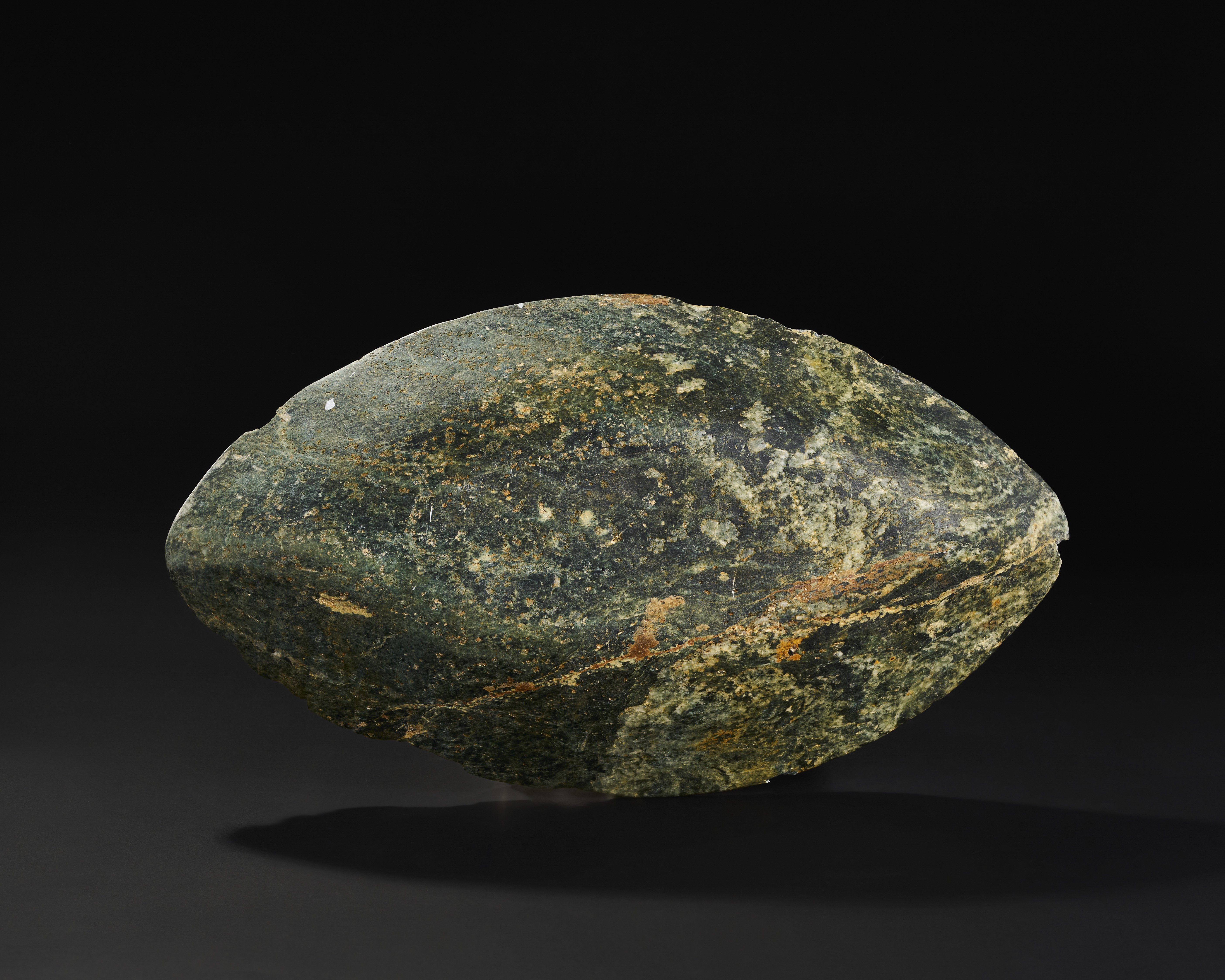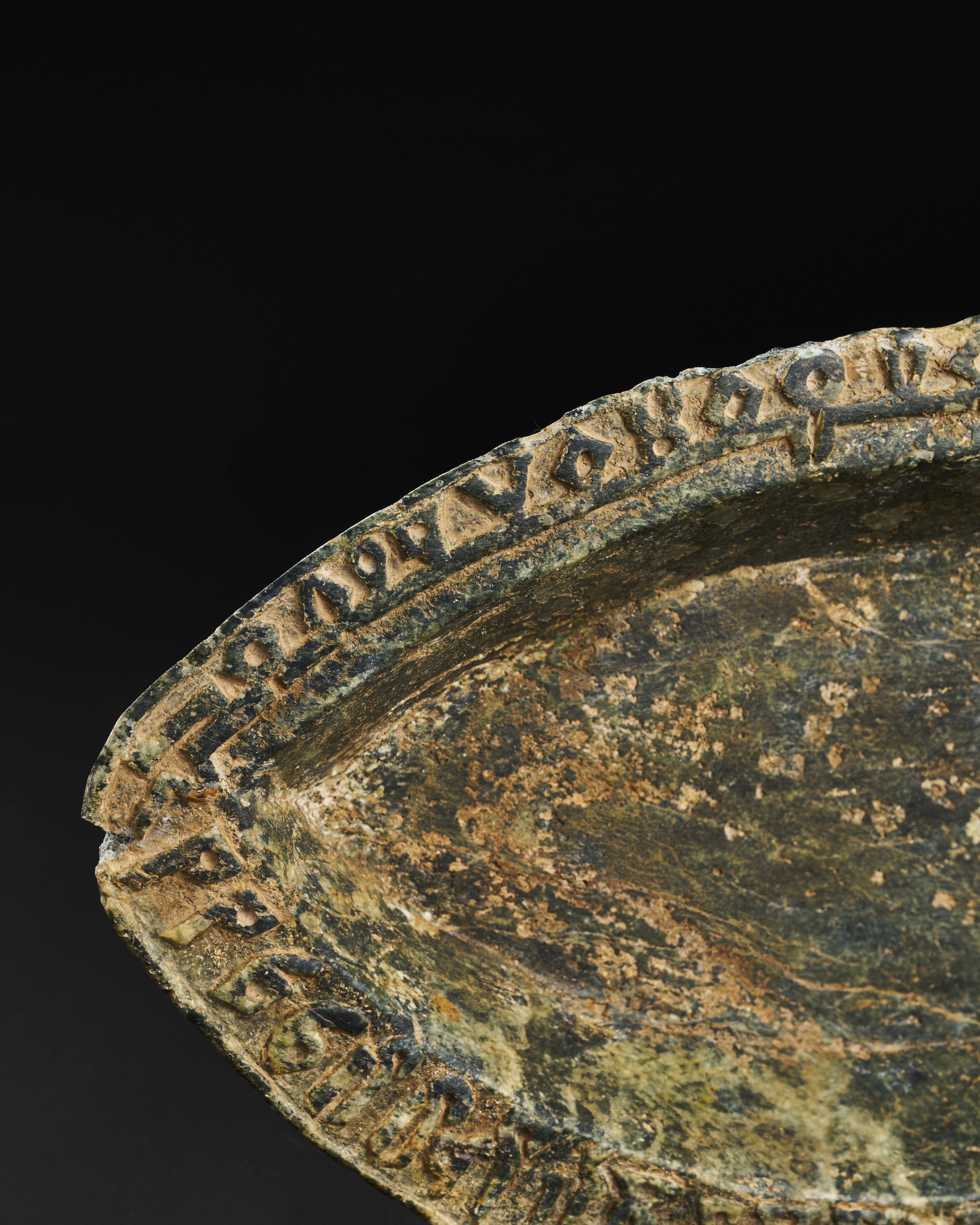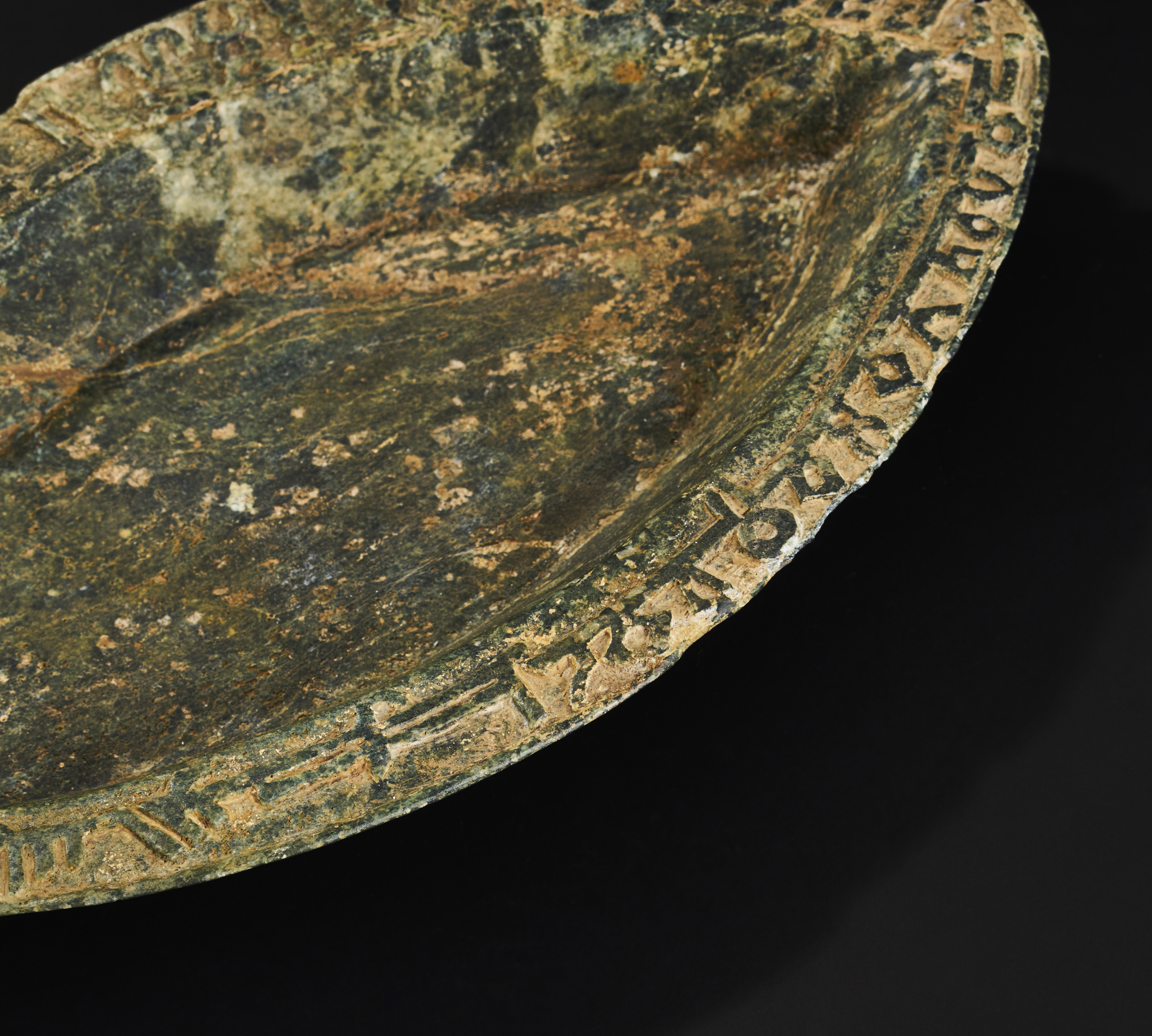 A green hard stone dish is exquisitely carved in a distinctive boat shape. Its rim is adorned with intricate inscriptions.