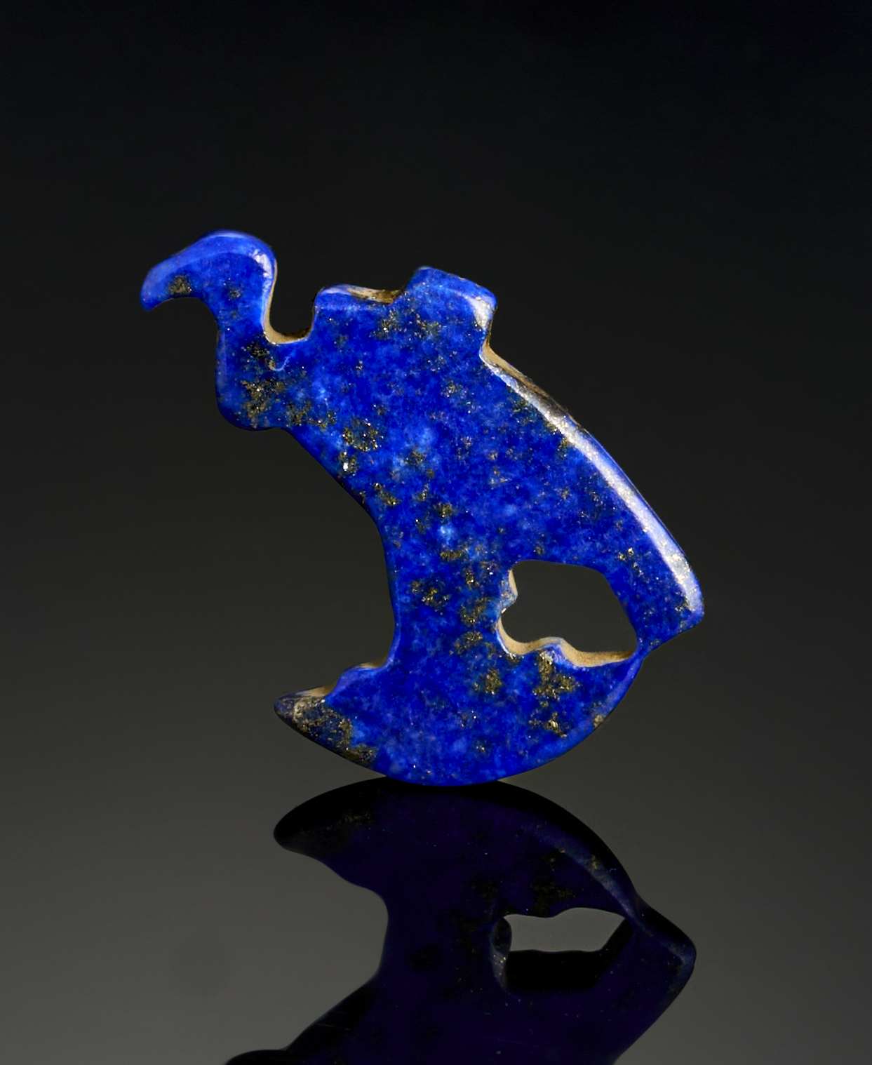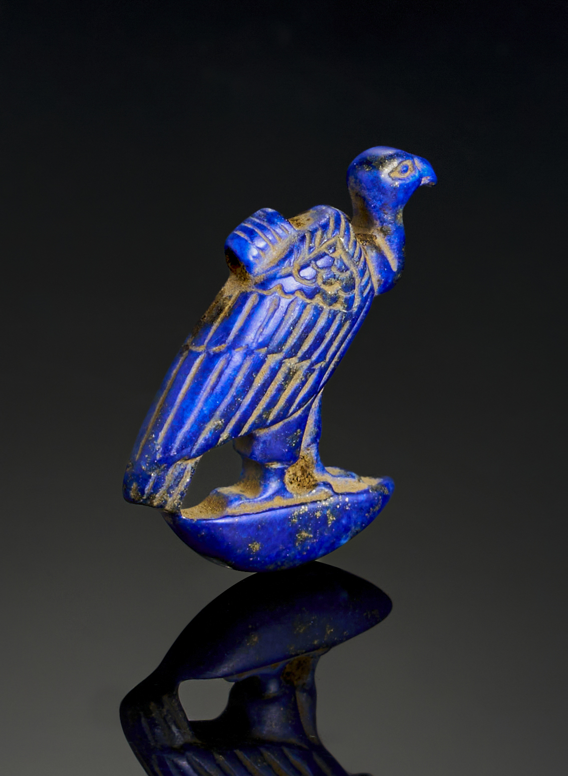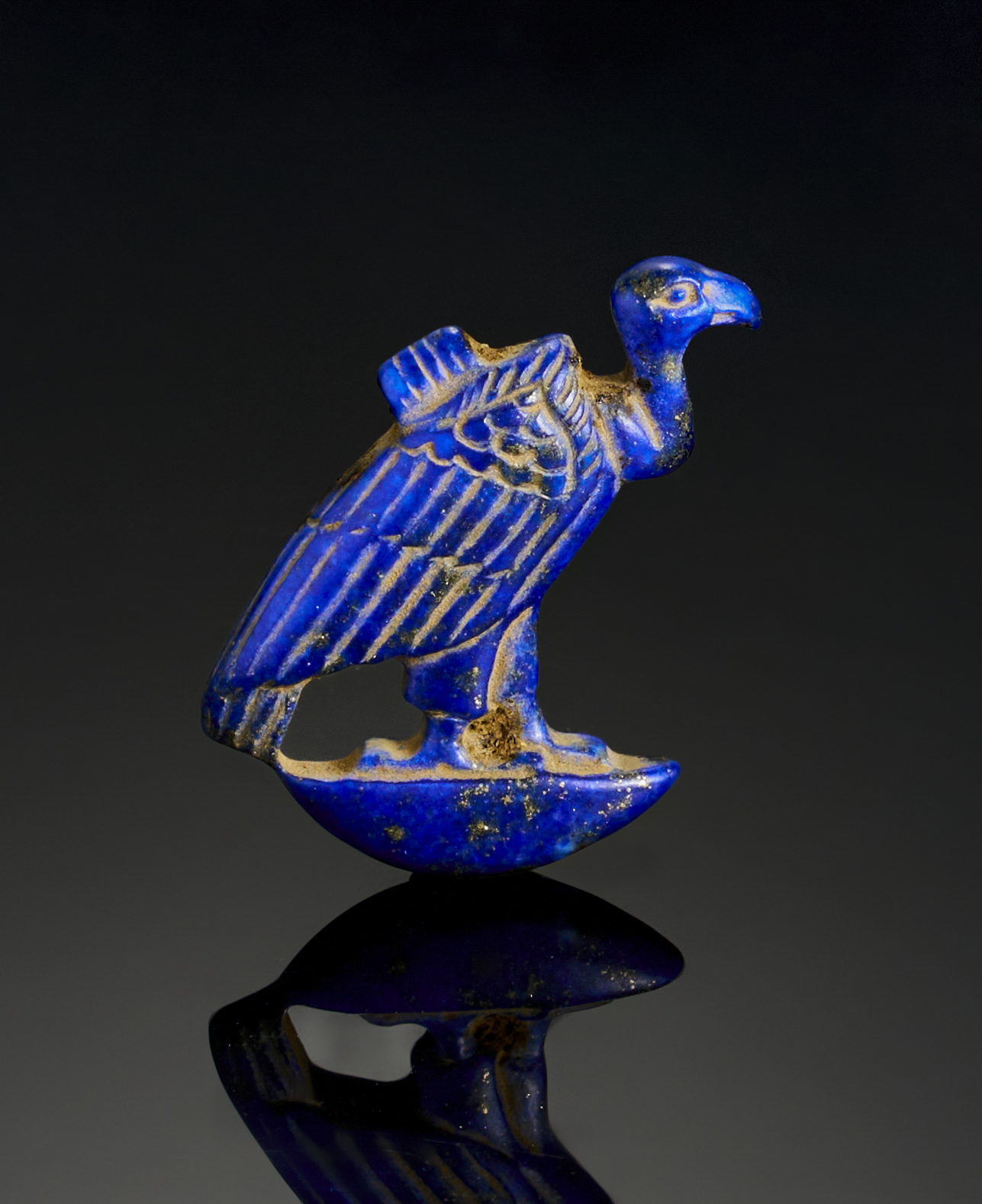 A finely carved lapis lazuli amulet, dating to the 26th Dynasty of ancient Egypt (664–525 B.C.). Depicting a vulture, a symbol of protection and maternal care in Egyptian iconography, the piece is meticulously detailed, with intricately incised feathers and a commanding posture. The vibrant deep blue of the lapis lazuli, complemented by traces of natural wear, reflects the amulet’s spiritual significance.