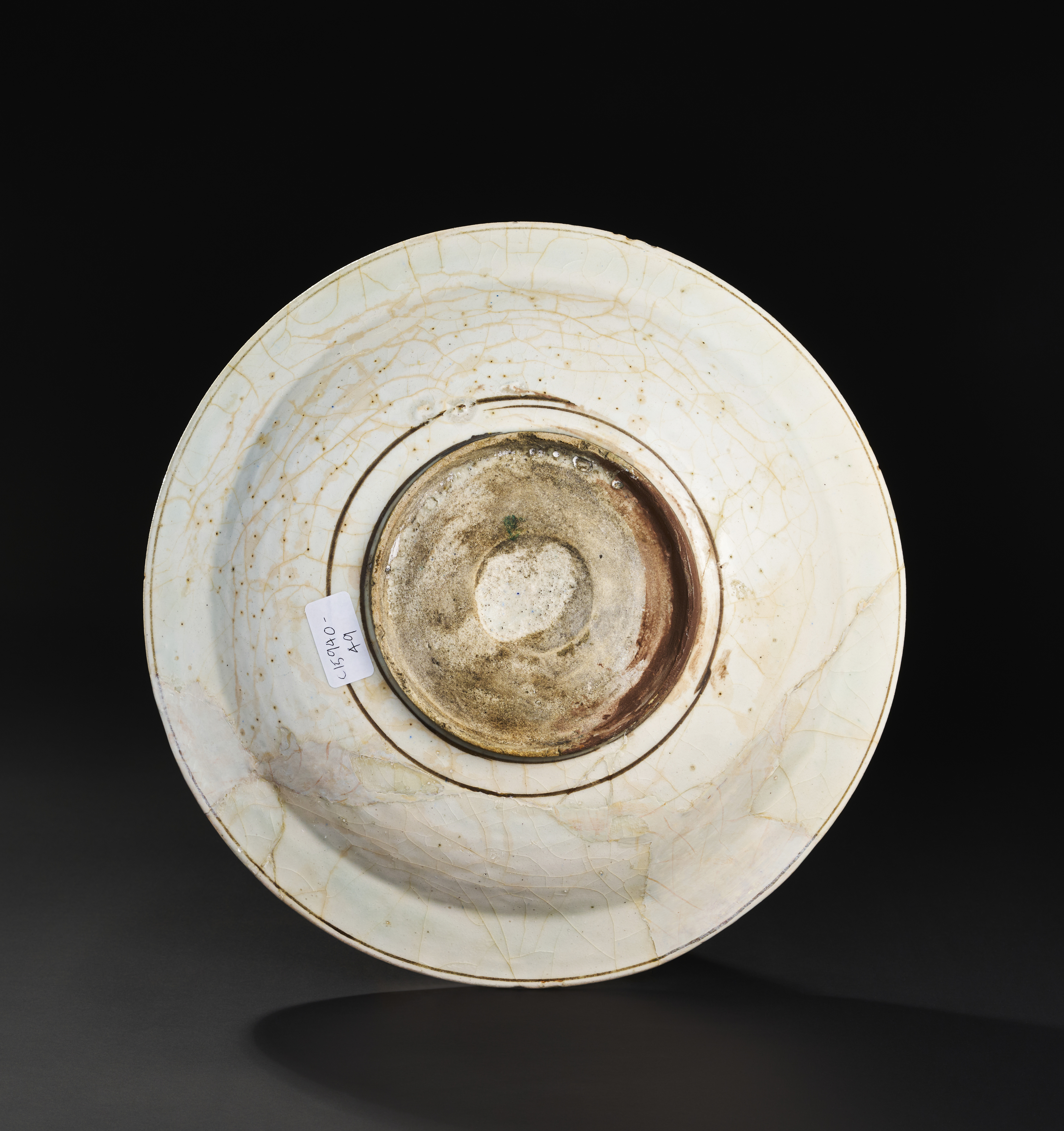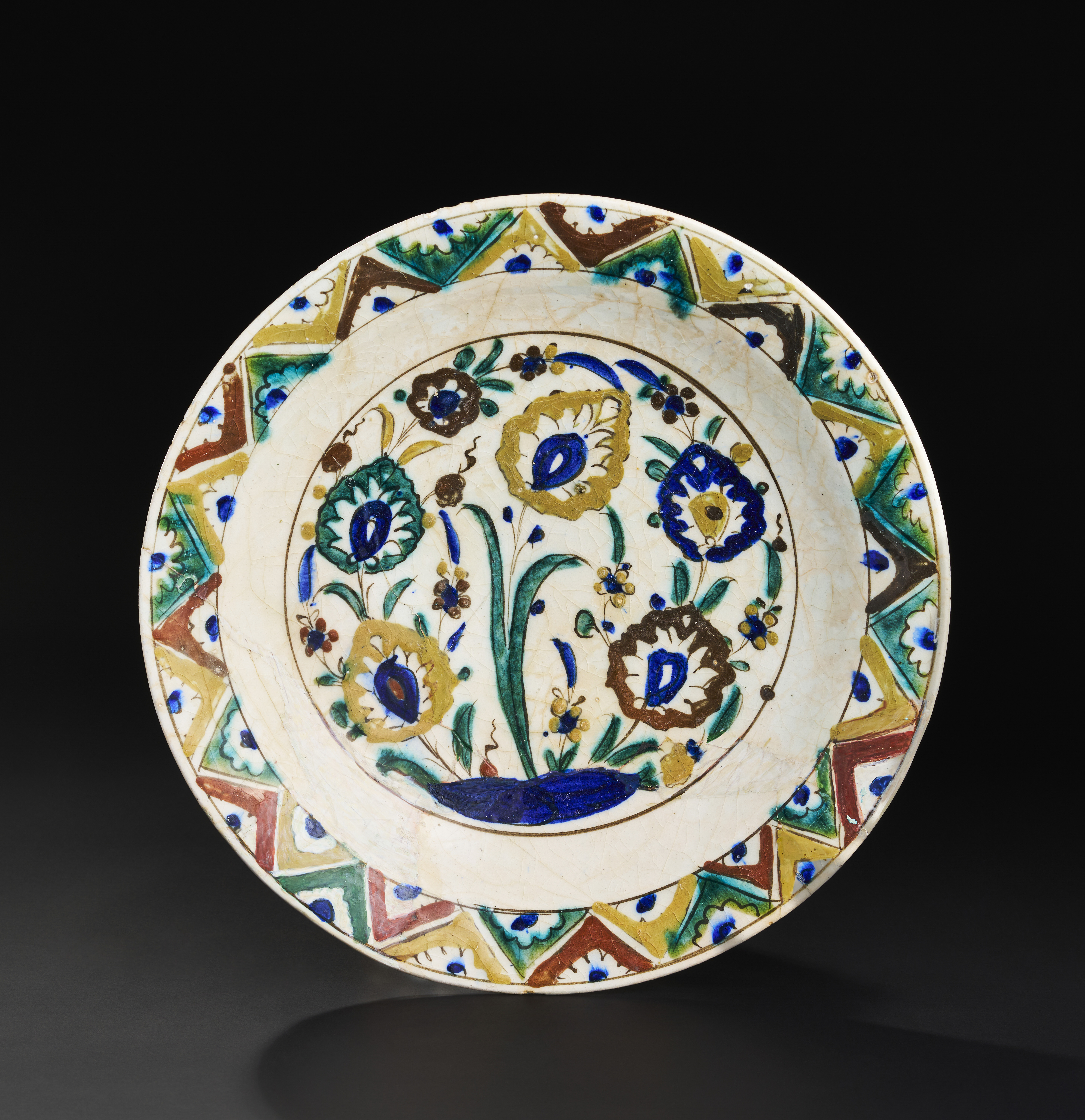 A LARGE KUBACHI GLAZED POTERY DISH, SAFAVID OR CENTRAL ASIA, 16TH-17TH CENTURY