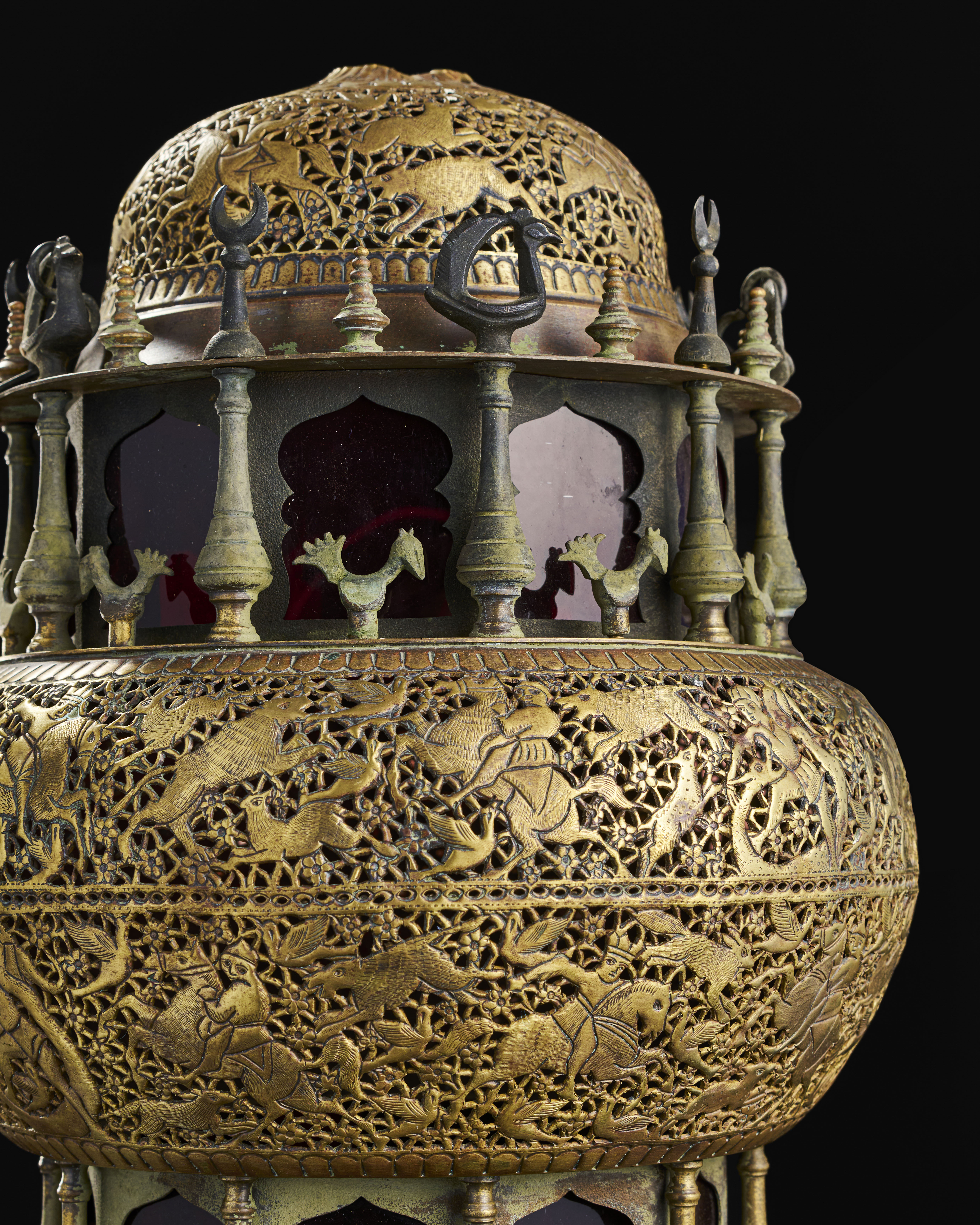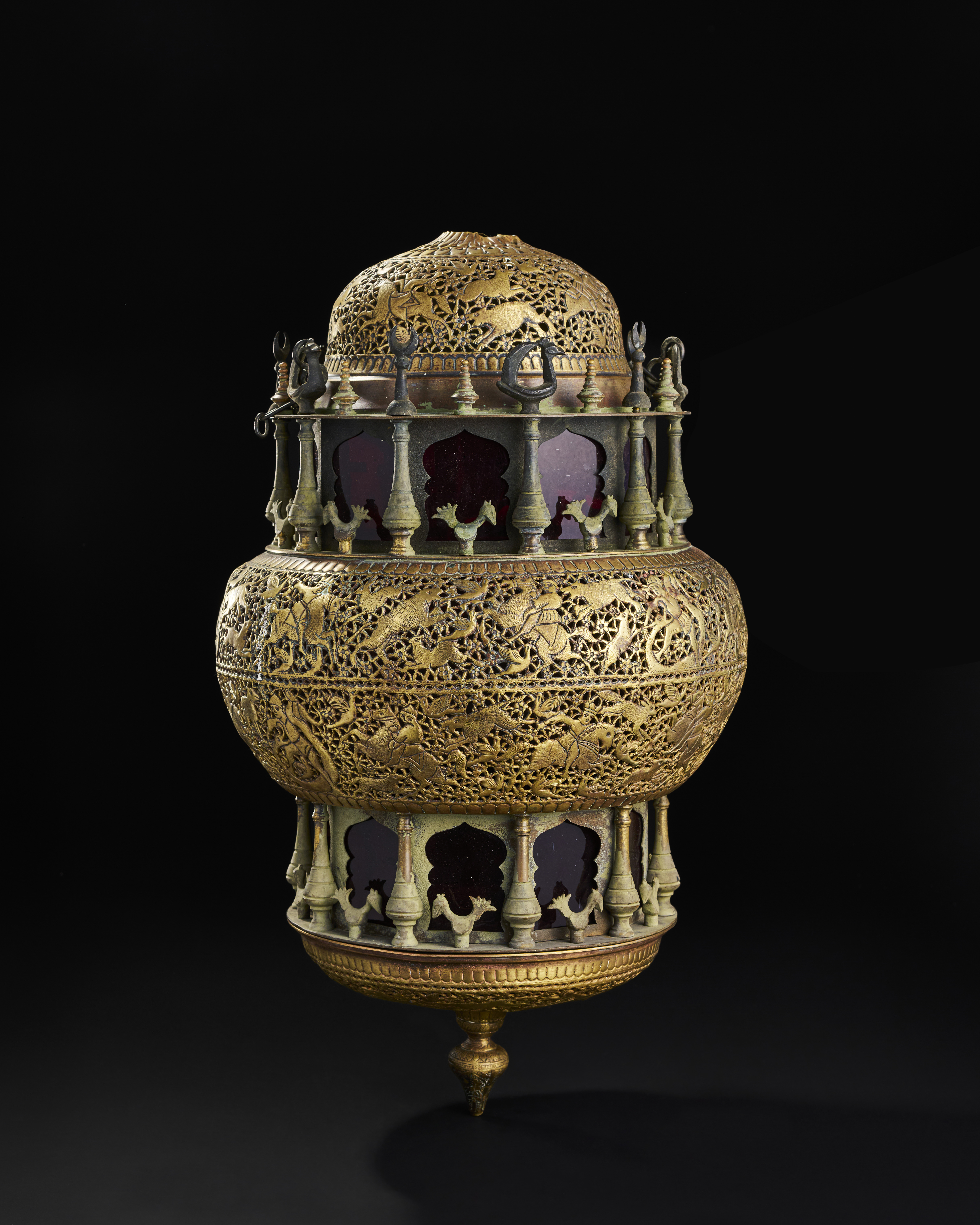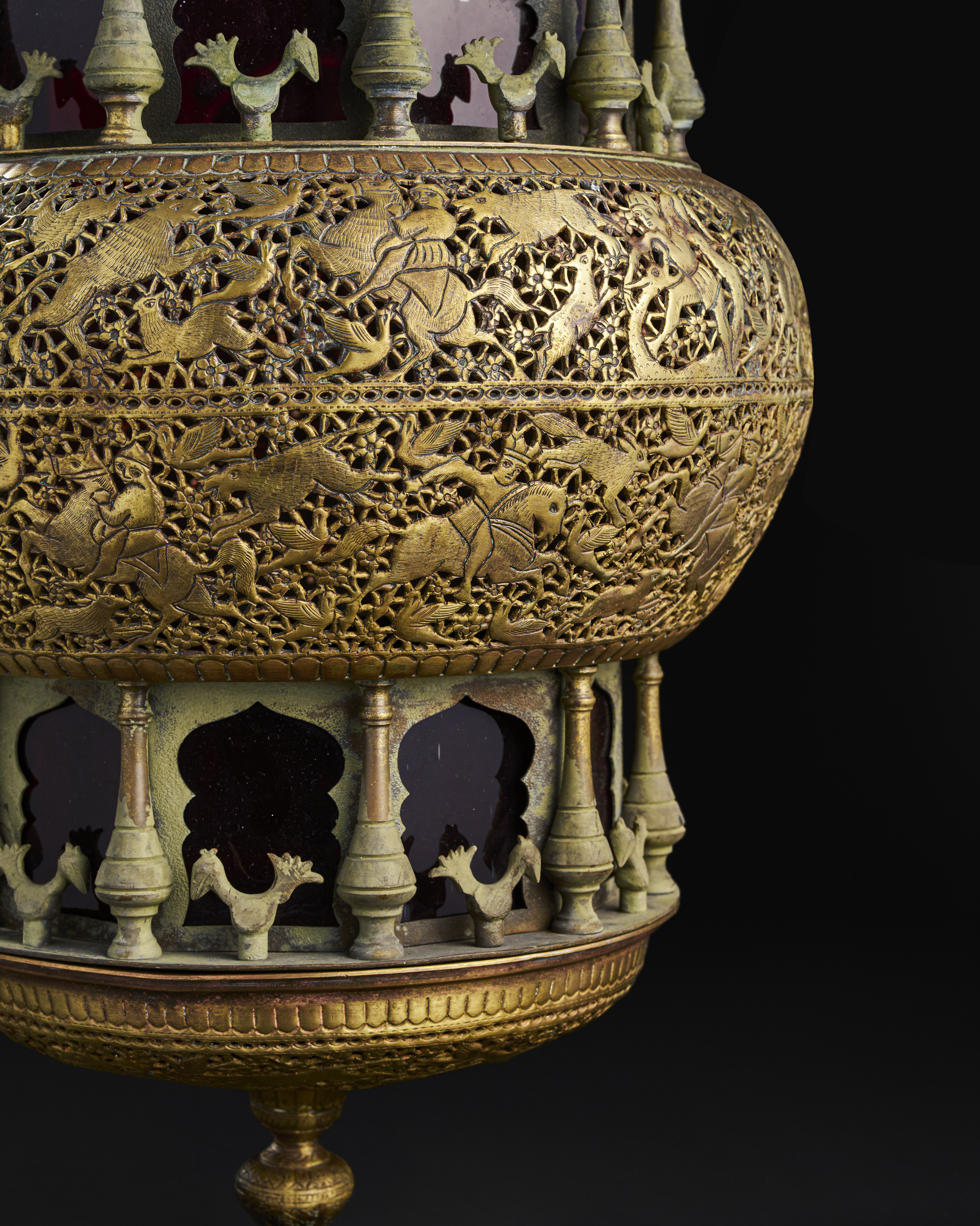 A19th-century brass lamp from the Qajar period, Designed in a multi-tiered structure, the lamp features finely detailed openwork engravings that depict a lively hunting scene, complete with horseback riders, animals, and floral motifs. The intricate perforated design creates a captivating play of light and shadow. The upper dome is adorned with delicate motifs and crowned with ornamental finials, while the central band boasts miniature columns and decorative animal figures.