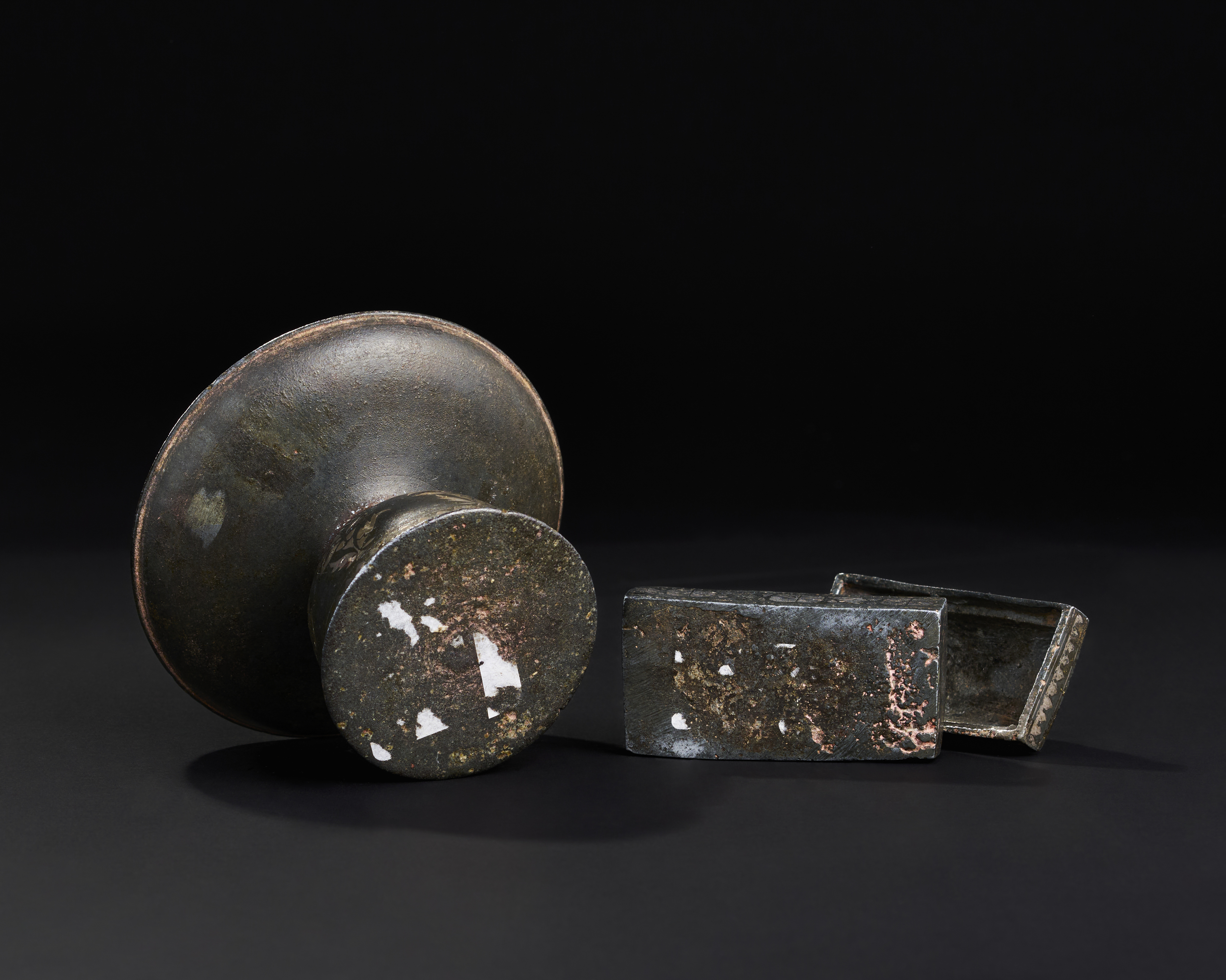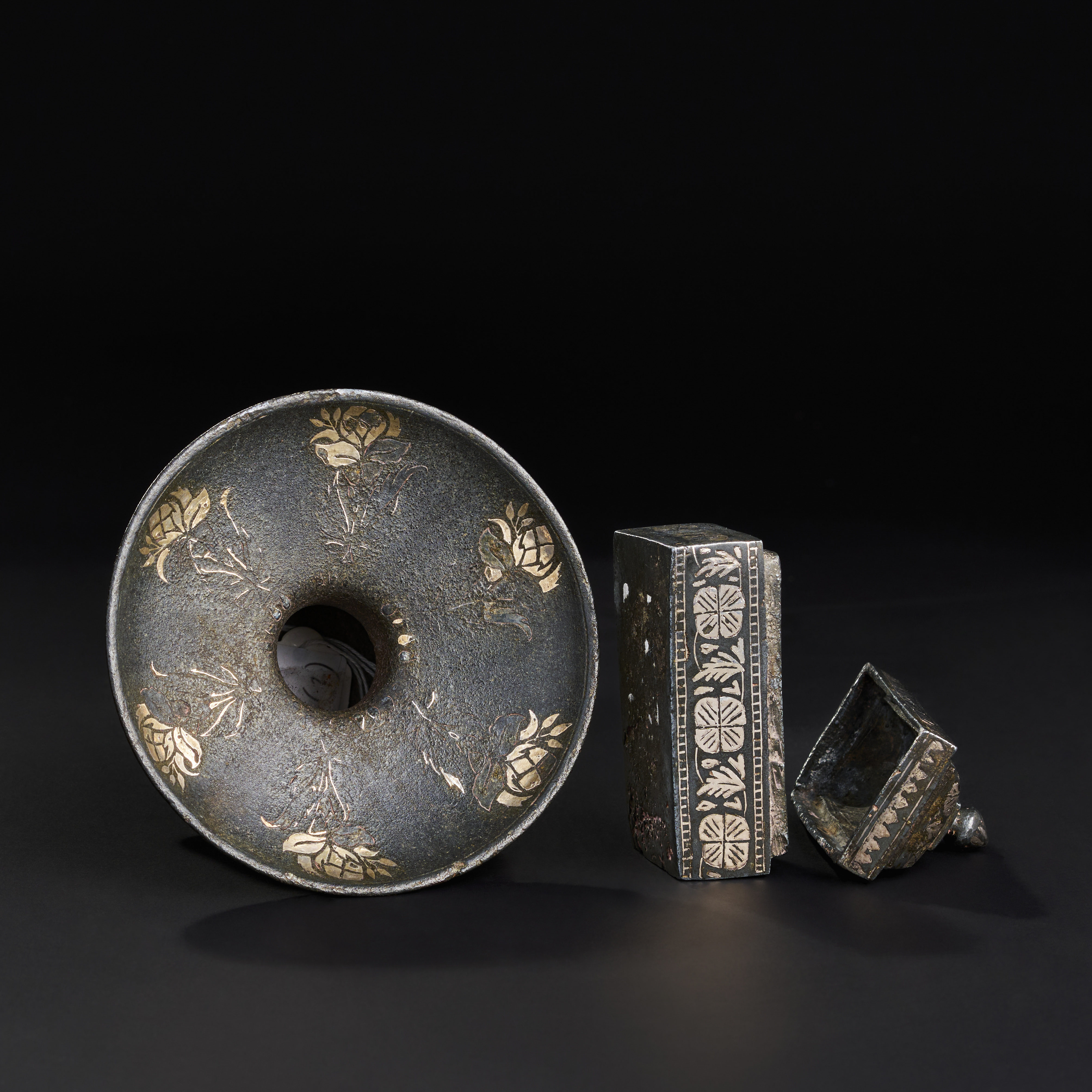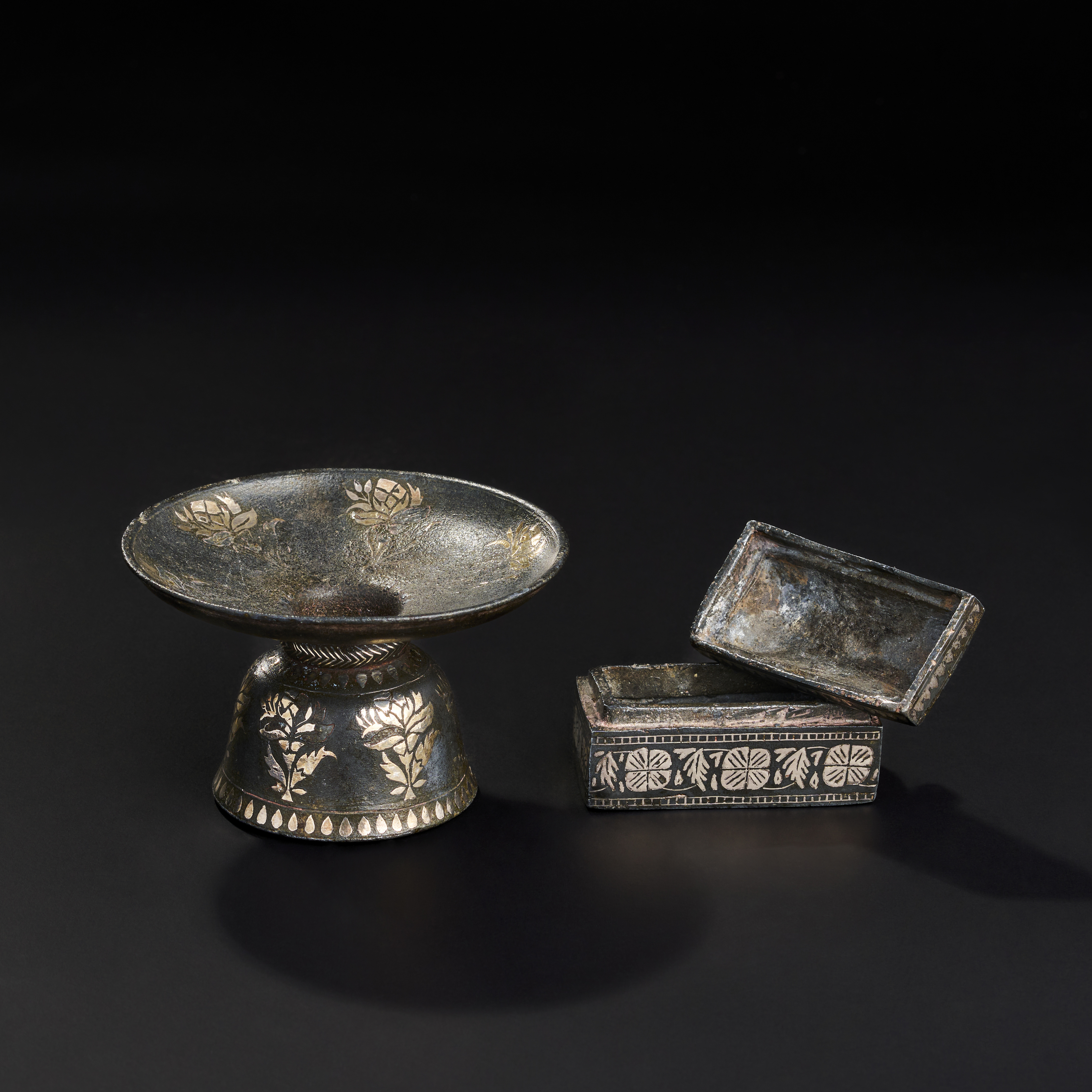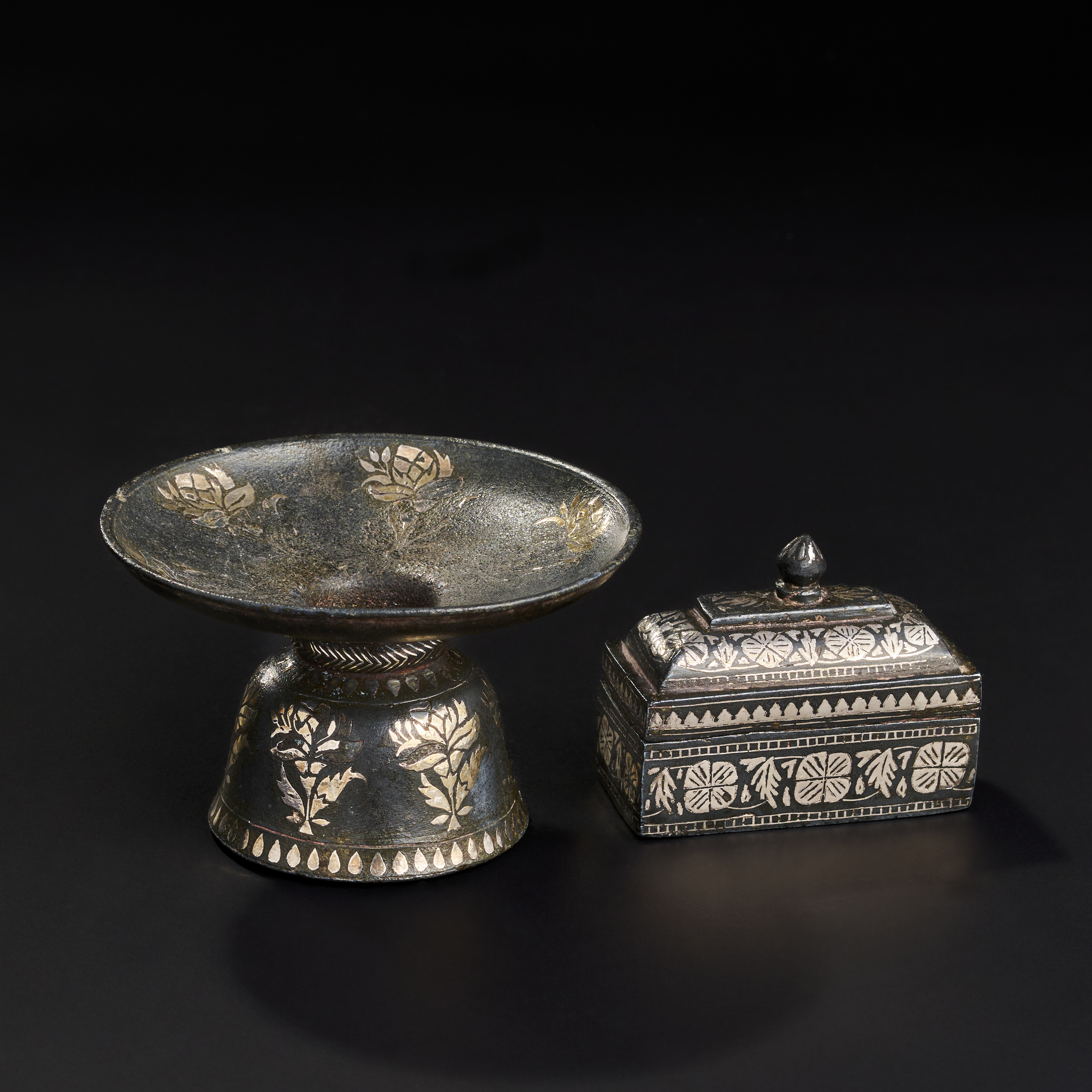 TWO INDIAN BIDRI SILVER INALID BOX AND SPITTOON, 19TH-20TH CENTURY