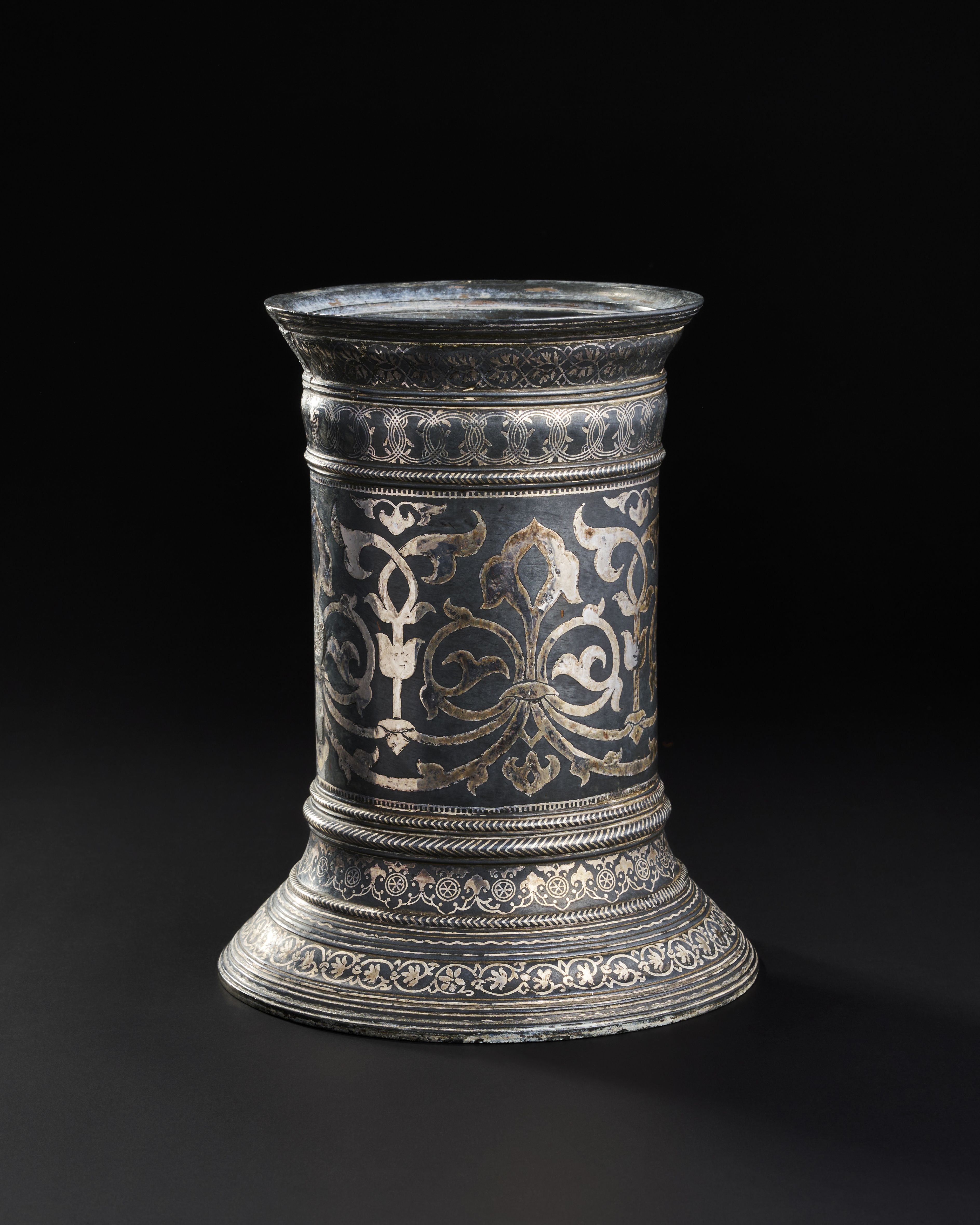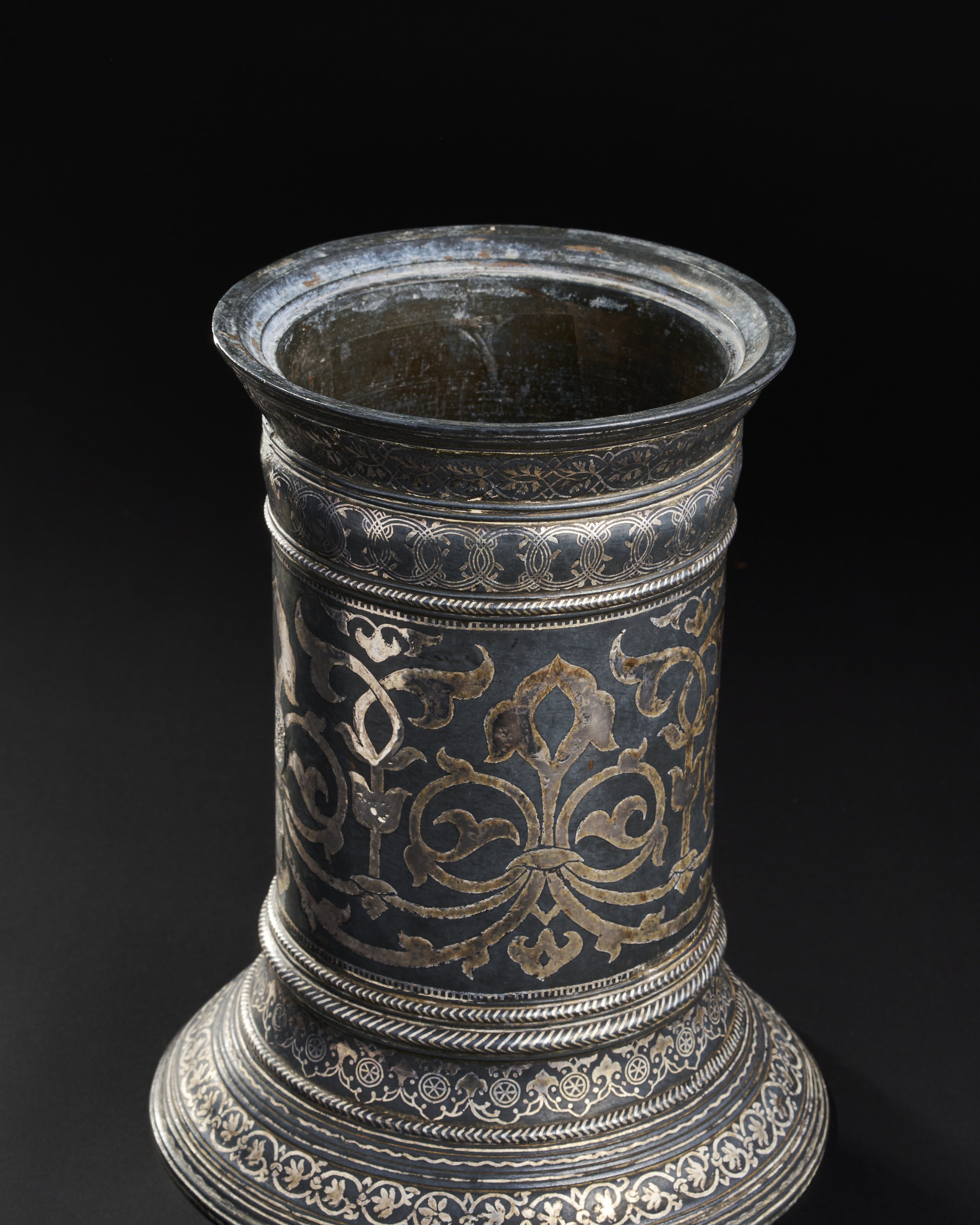 AN UNUSUAL LARGE INDIAN SILVER INALID BIDRI TORCH STAND / CANDLESTICK, 18TH – 19TH CENTURY