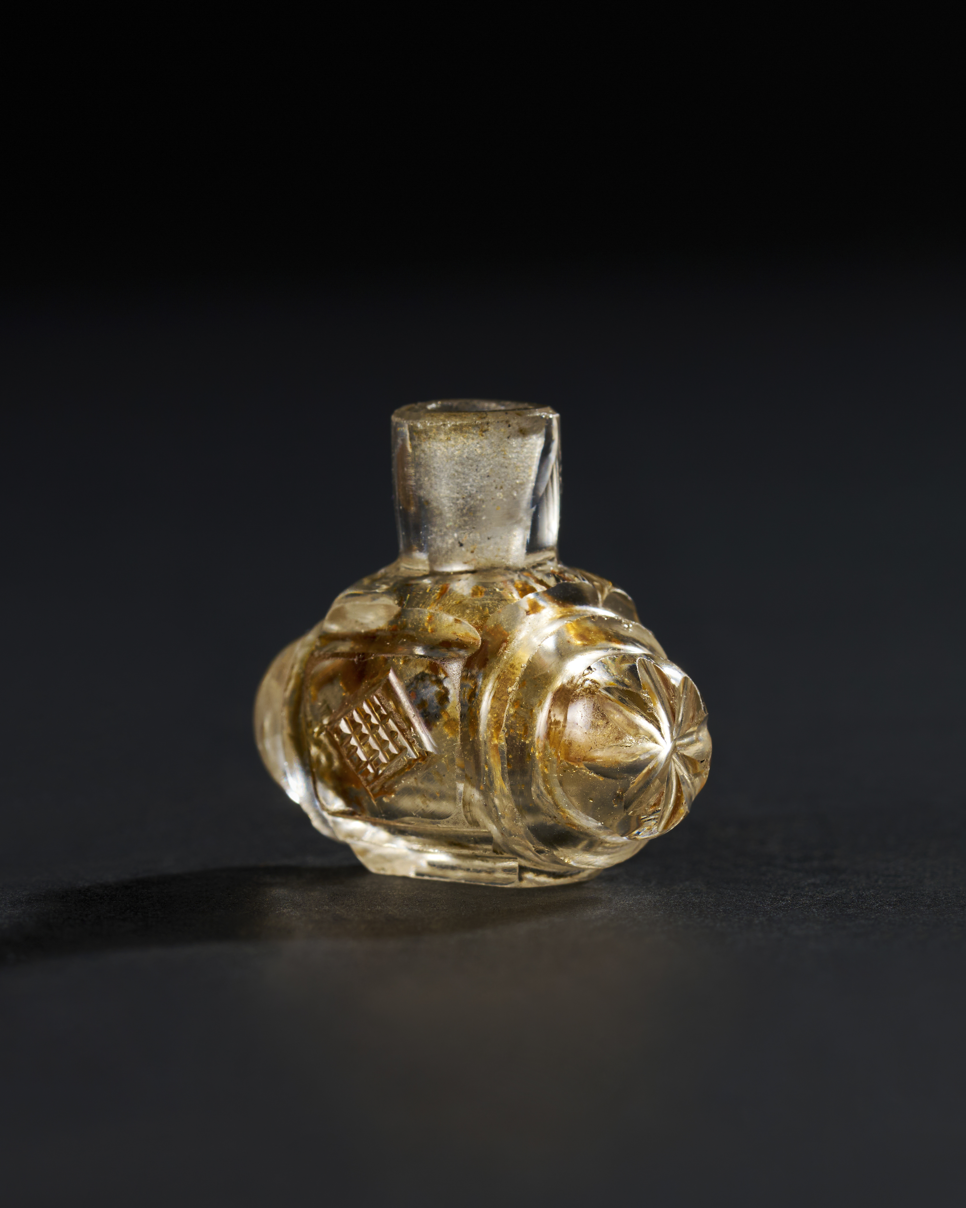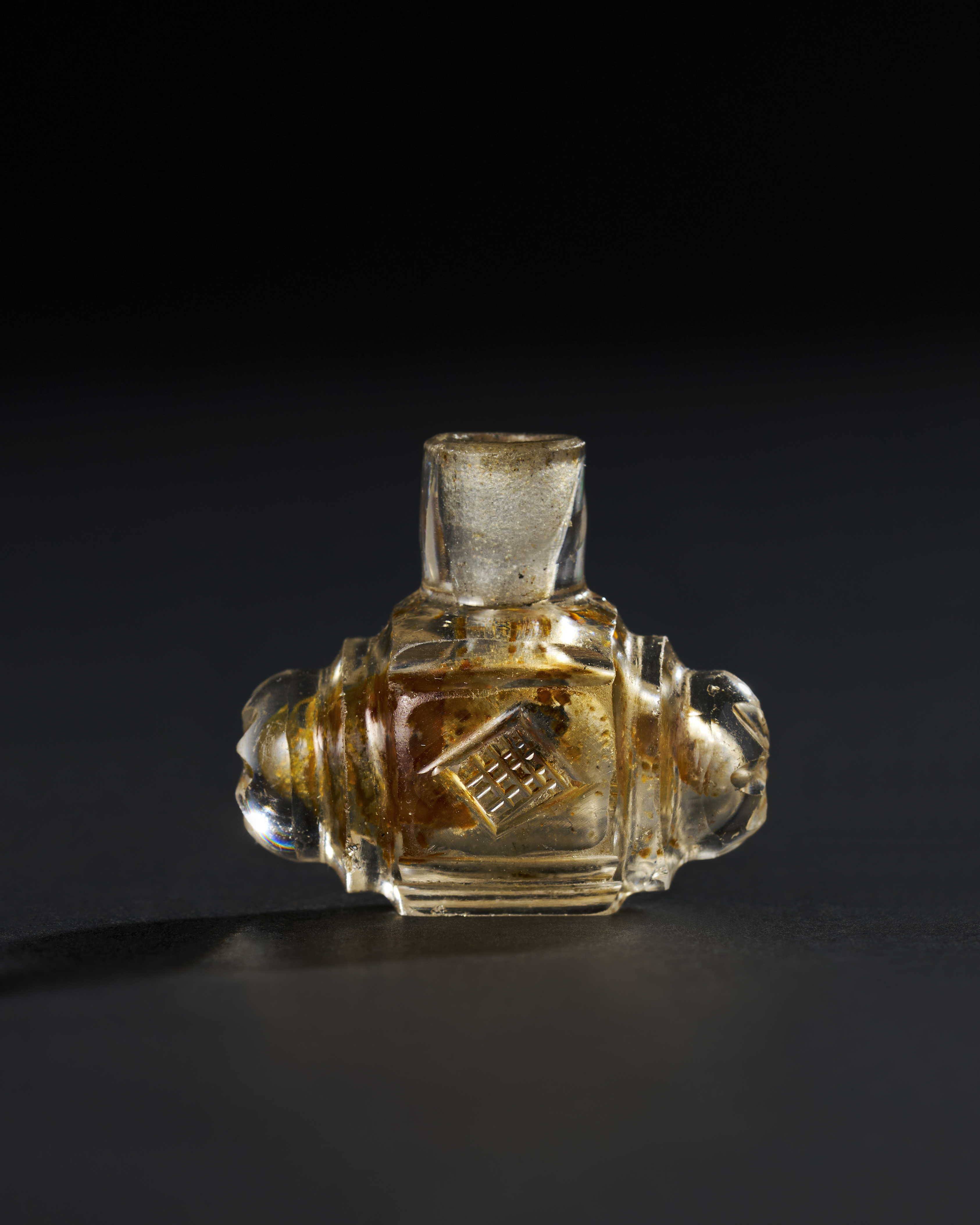 This exquisite Fatimid flask, dating from the 9th to 10th century, is a rare example of Islamic glasswork, likely originating from Egypt or Syria during the Fatimid Caliphate. The flask is crafted from clear rock crystal, with subtle yellow-brown inclusions, and features beautifully carved decorative elements. The body of the flask is adorned with geometric patterns, including a diamond-shaped motif. The ends of the flask are embellished with rounded, almost floral-like decorations, enhancing its visual symmetry and balance.