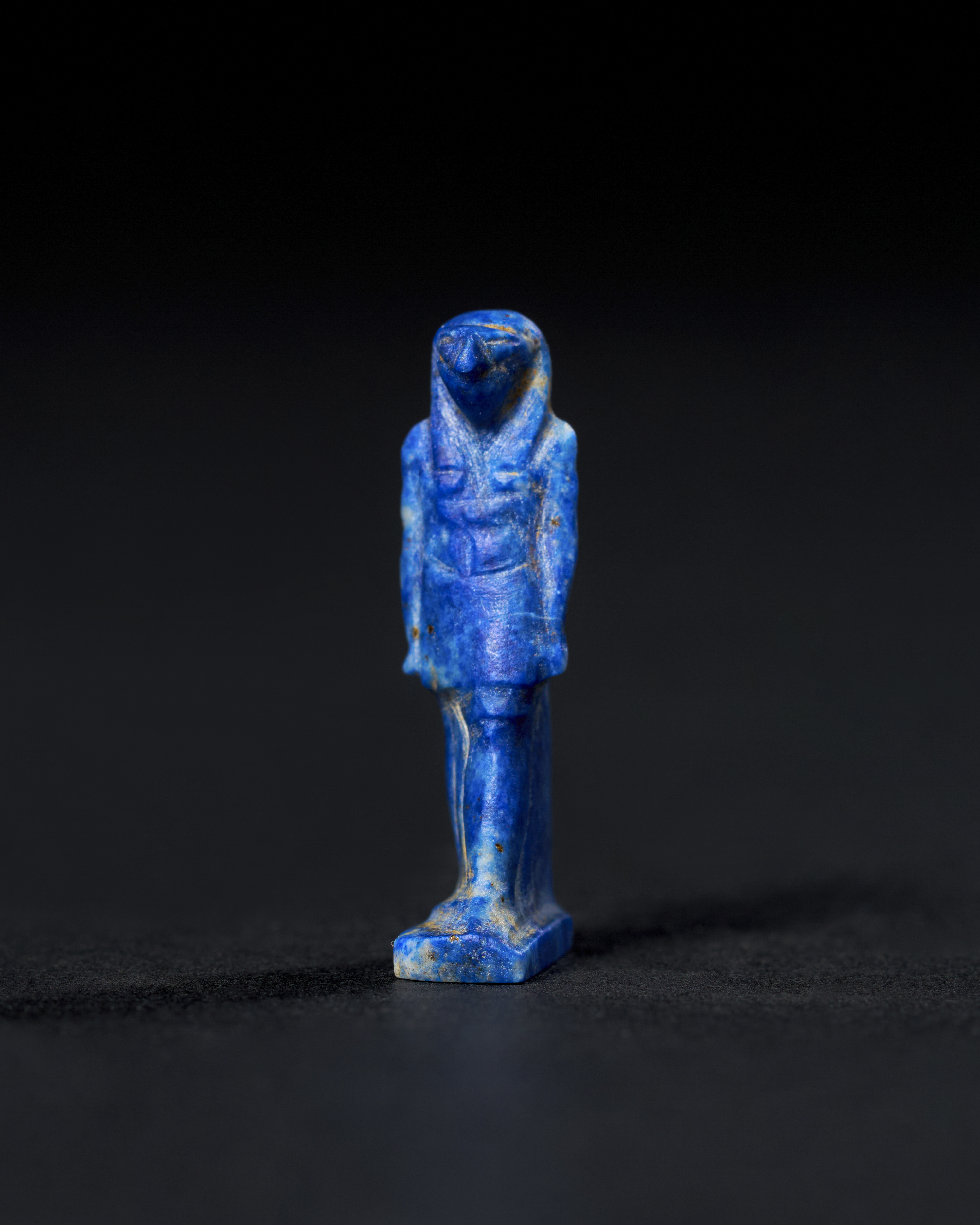 This exceptional amulet is carved from lapis lazuli, a semi-precious stone highly prized in ancient Egypt for its deep blue color, often associated with the heavens and the divine. The amulet portrays a standing figure with the head of a falcon, likely representing the god Horus or Ra-Horakhty, deities connected to kingship, protection, and the sky.