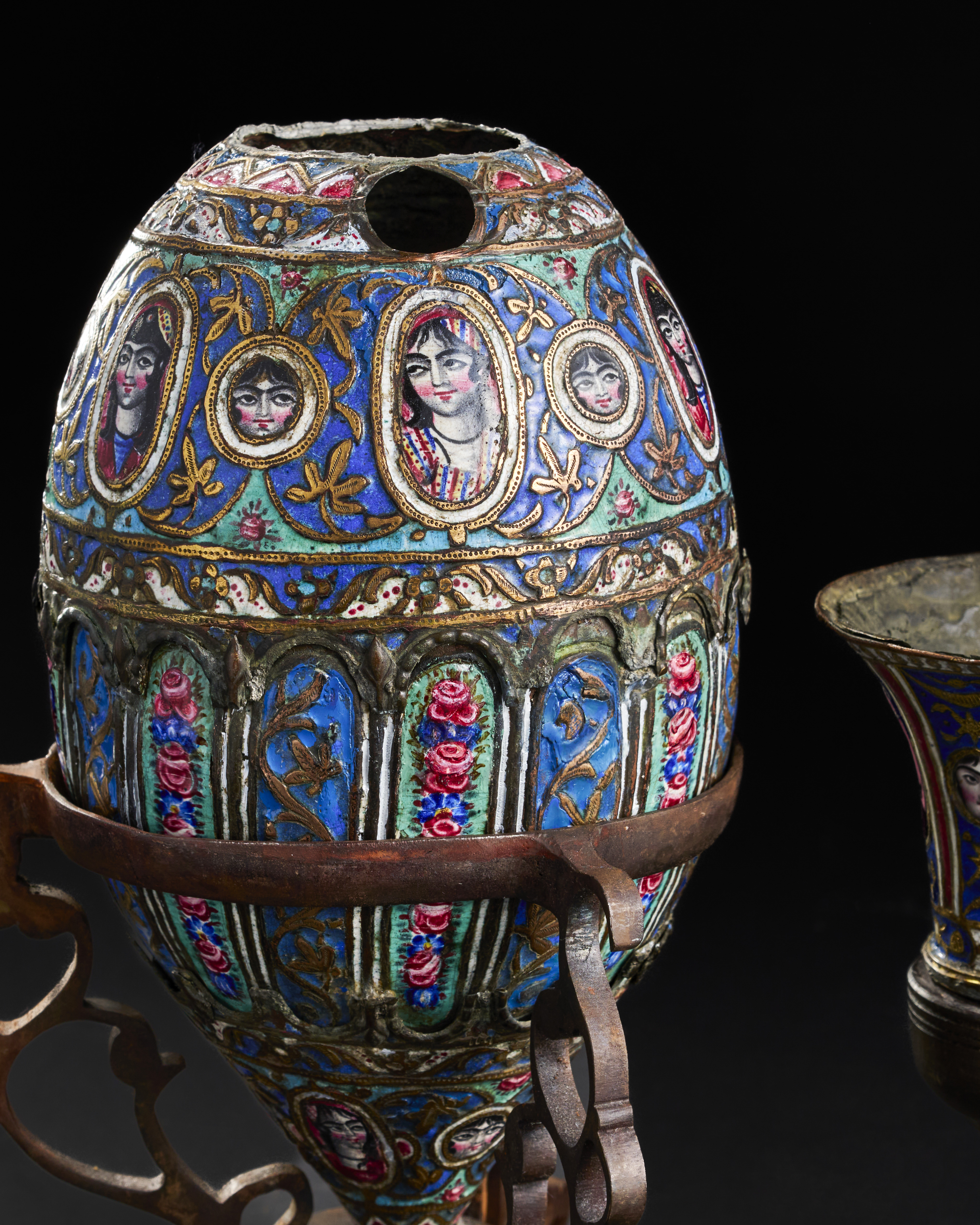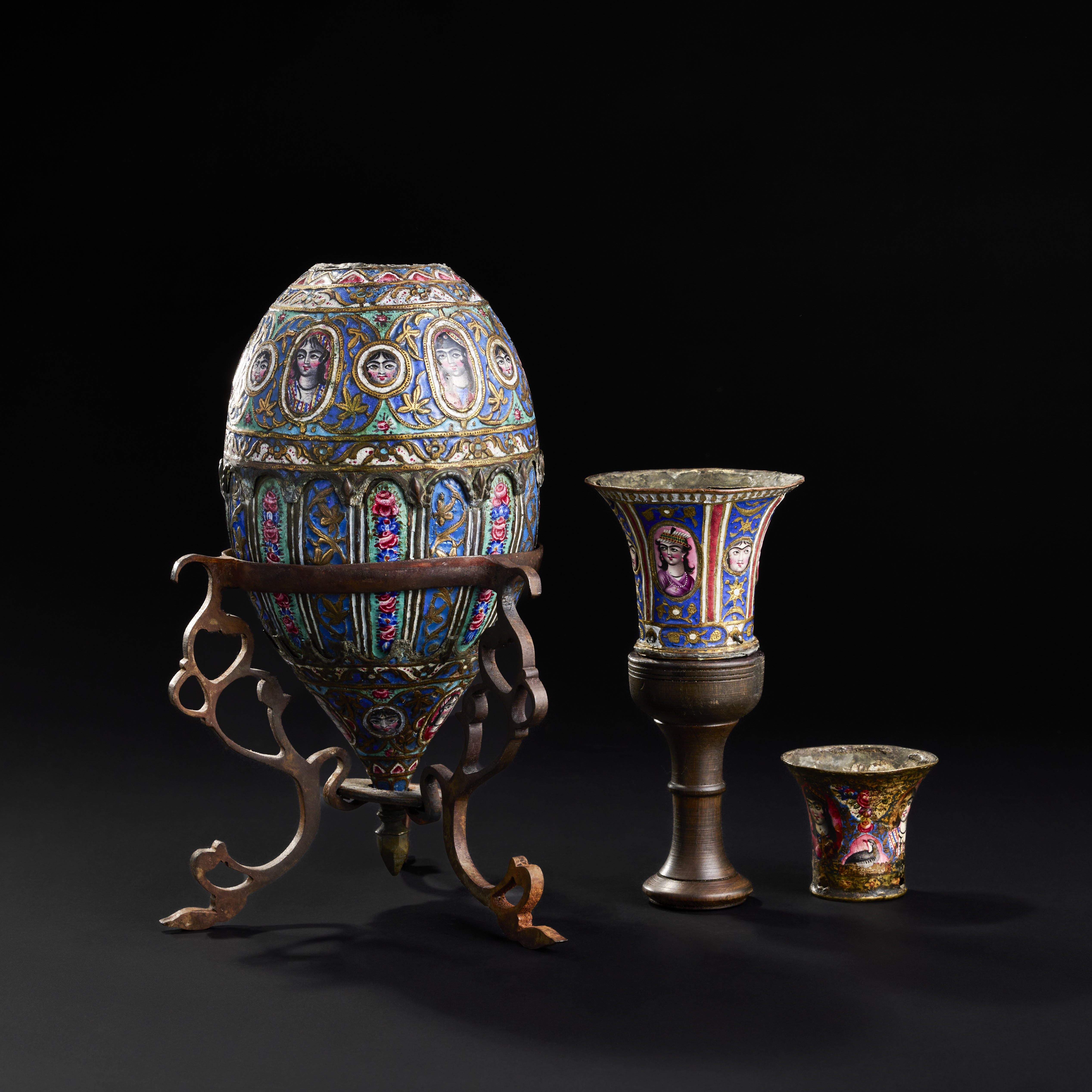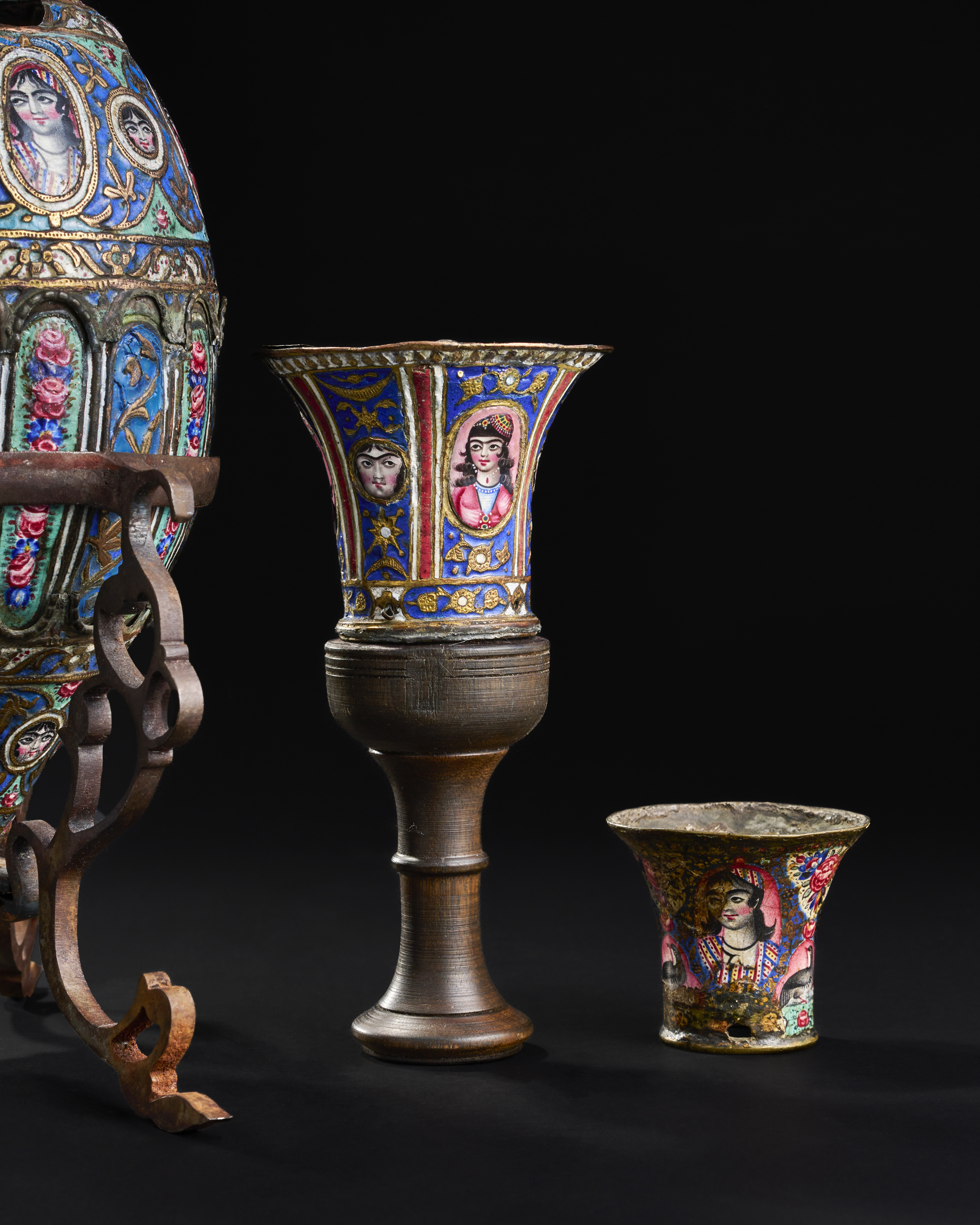 A QAJAR ENAMELLED HOQQA BASE AND CUPS, 19TH CENTURY