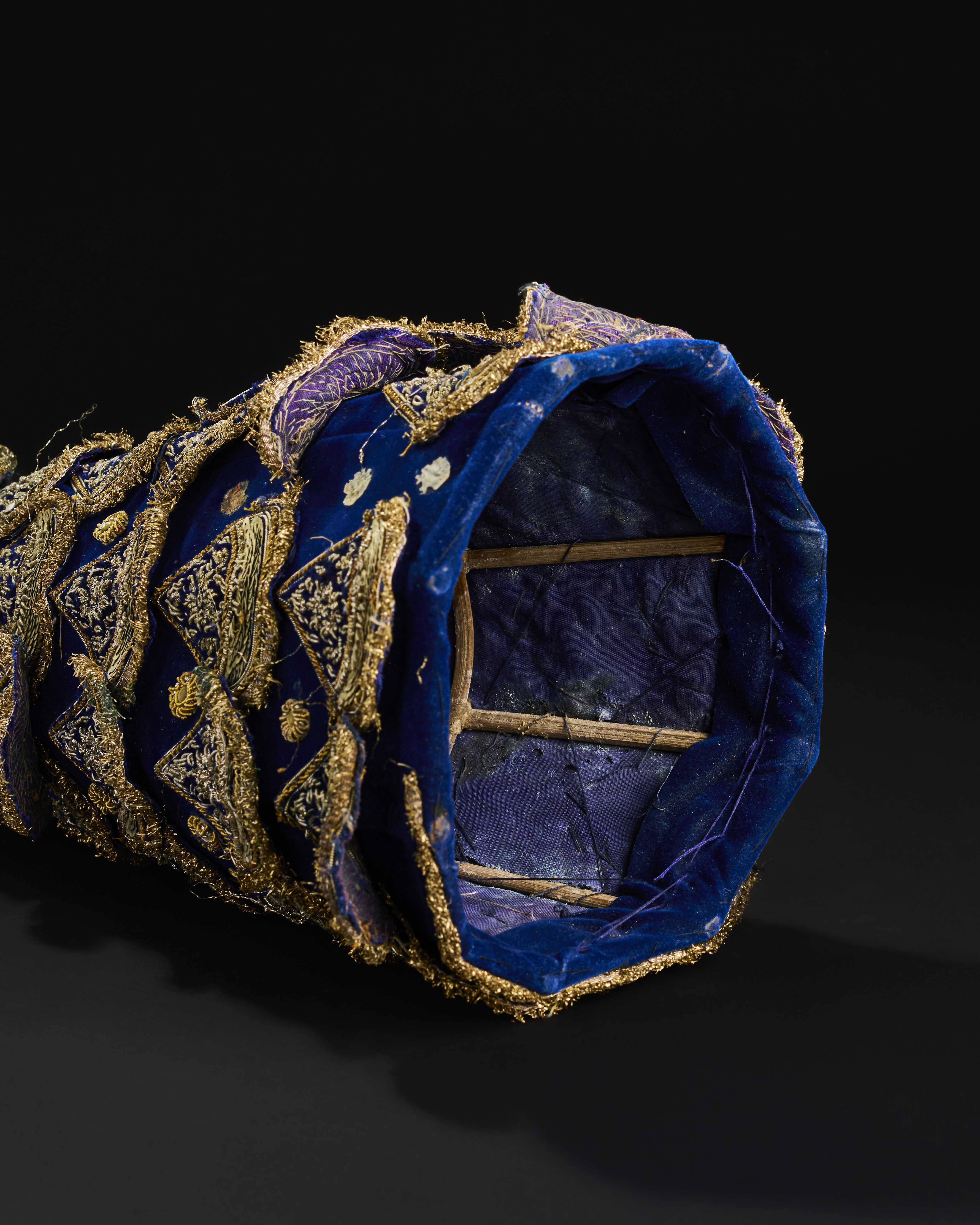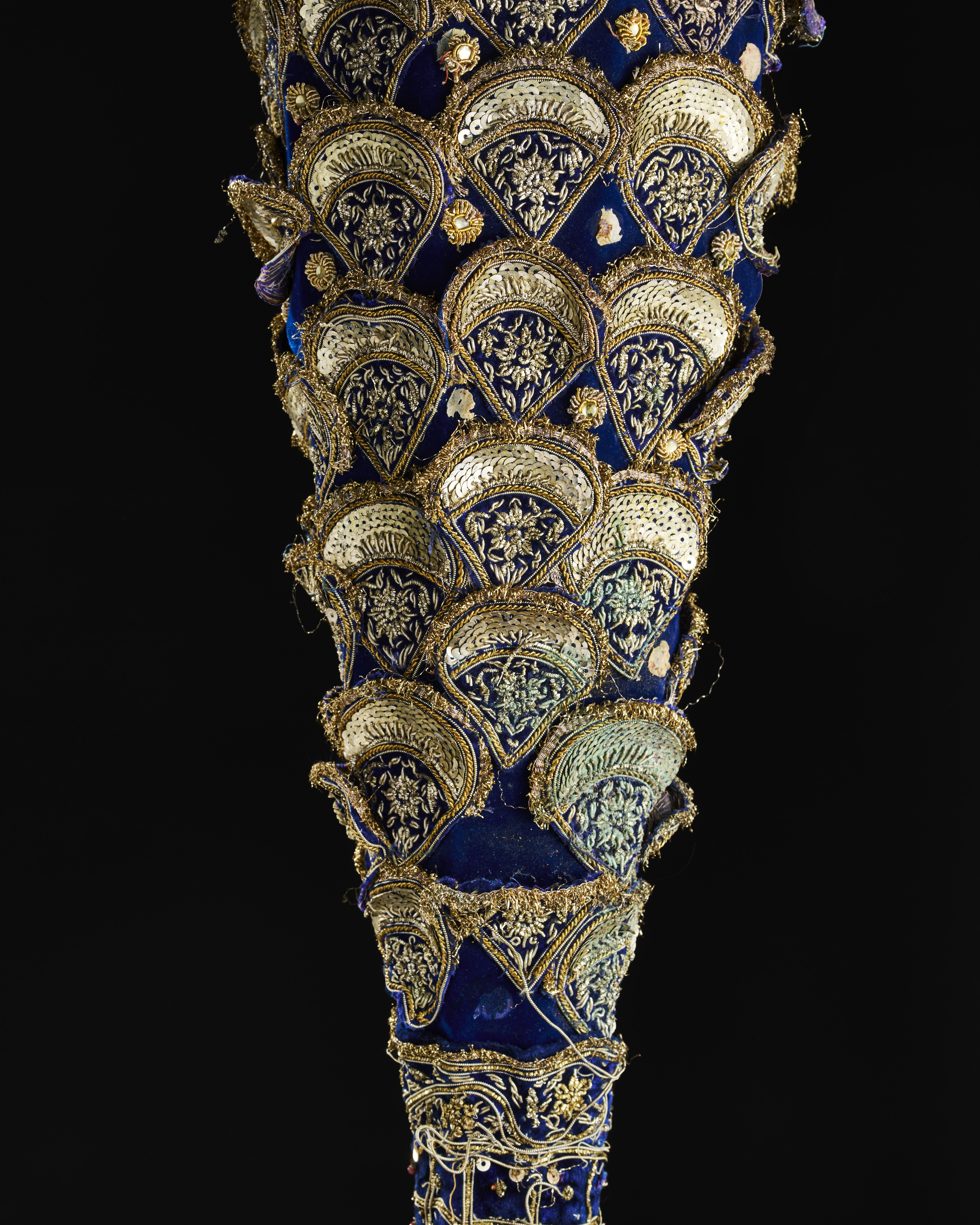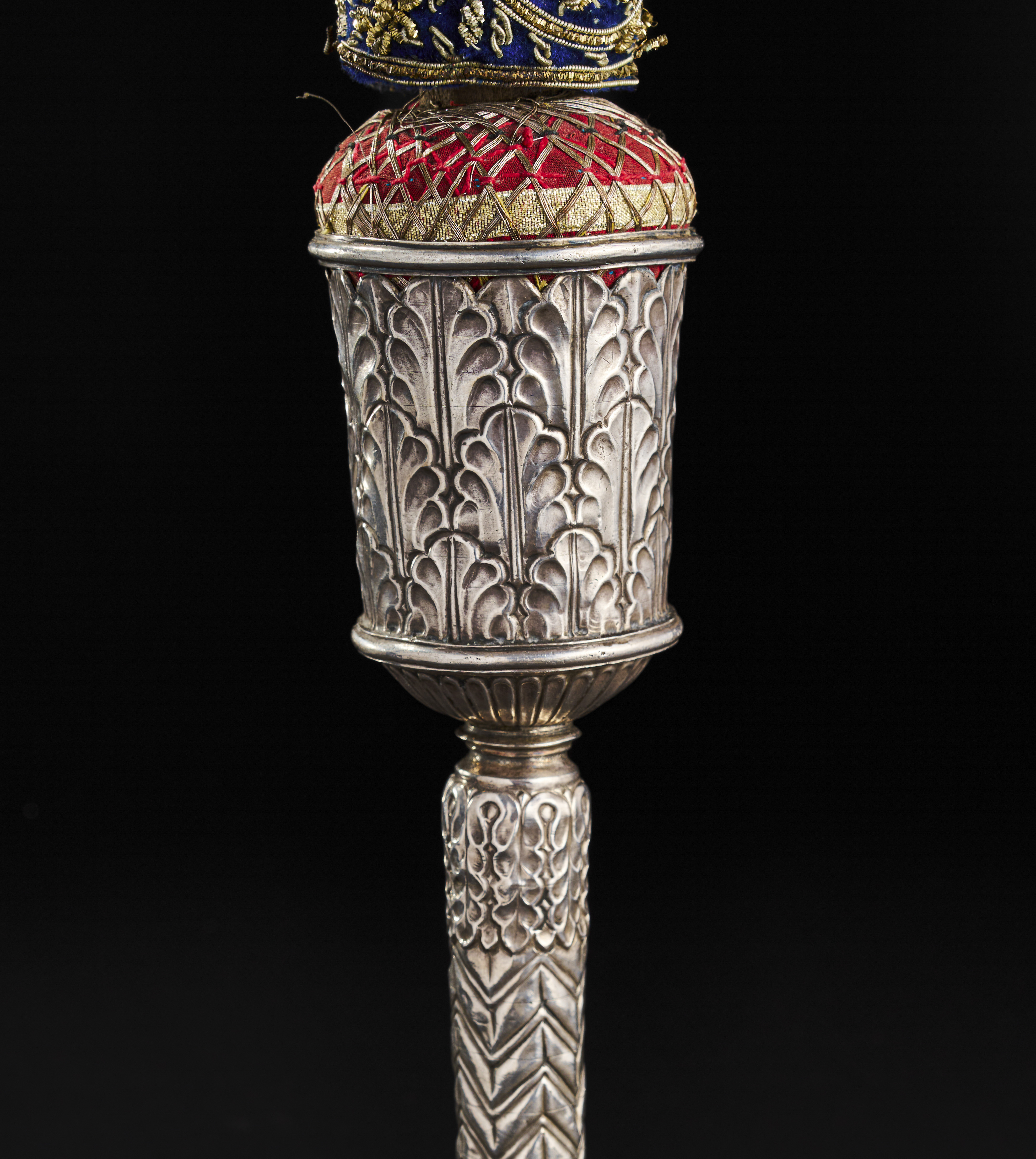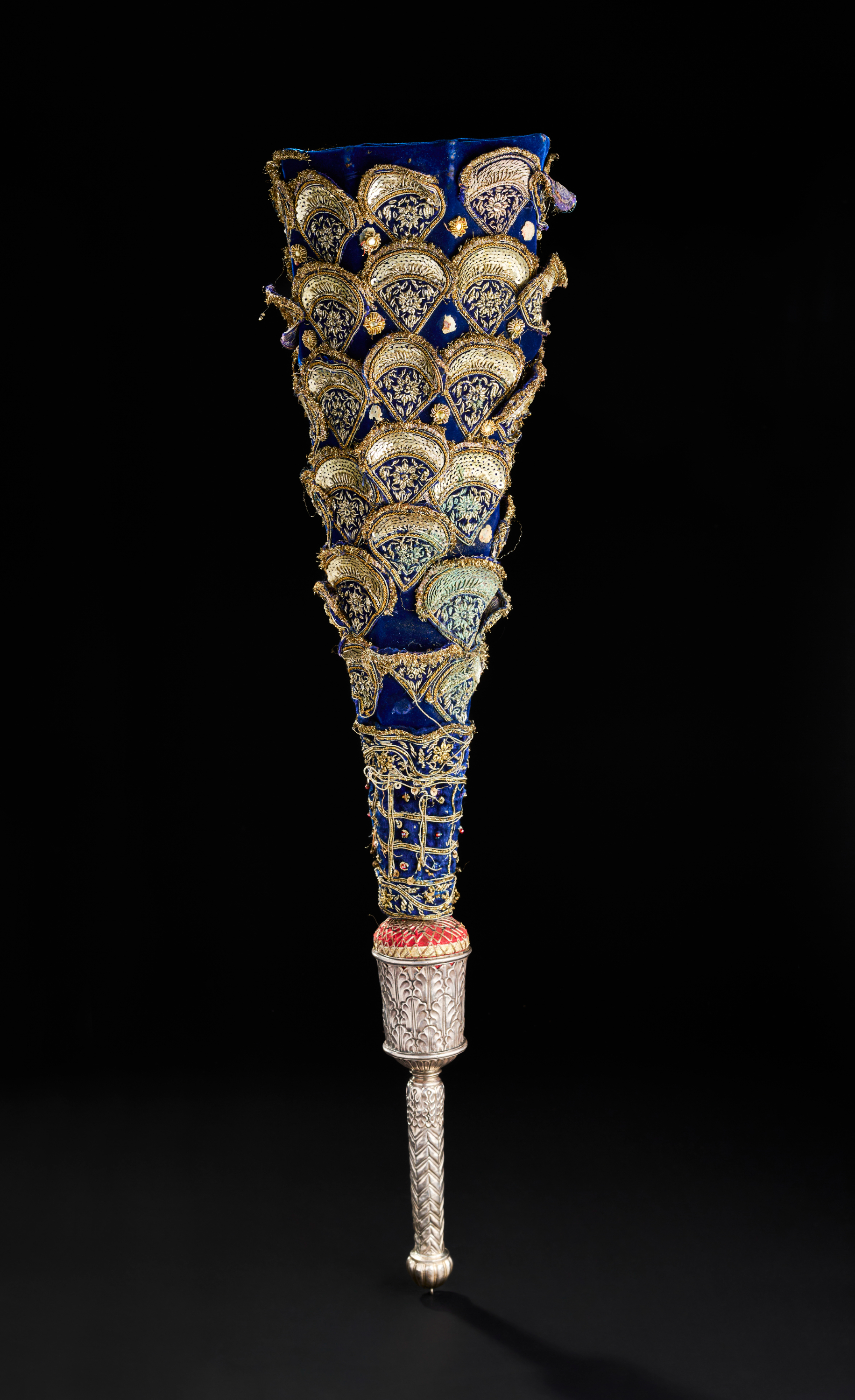 A SILVER FLY WHISK HANDLE WITH ORIGINAL METAL THREADED VELVET PEACOCK FEATHERS STYLE, MUGHAL INDIA, EARLY 19TH CENTURY