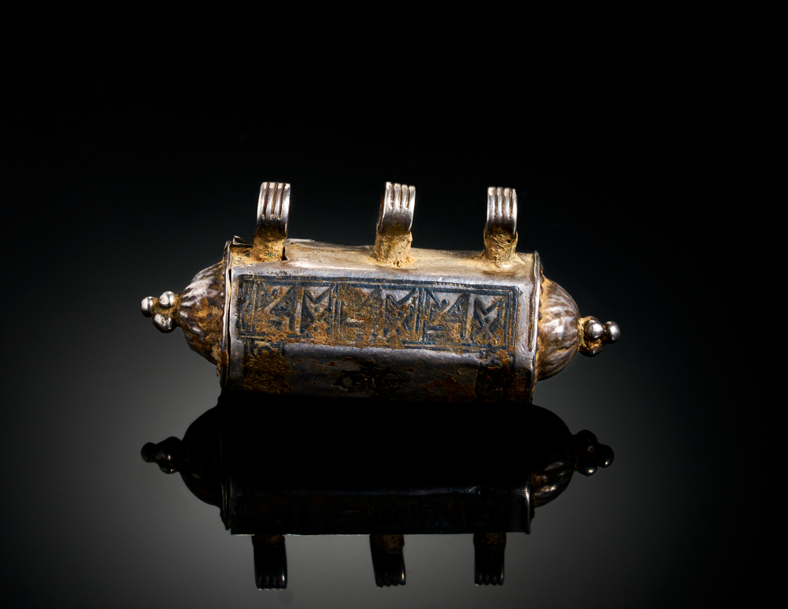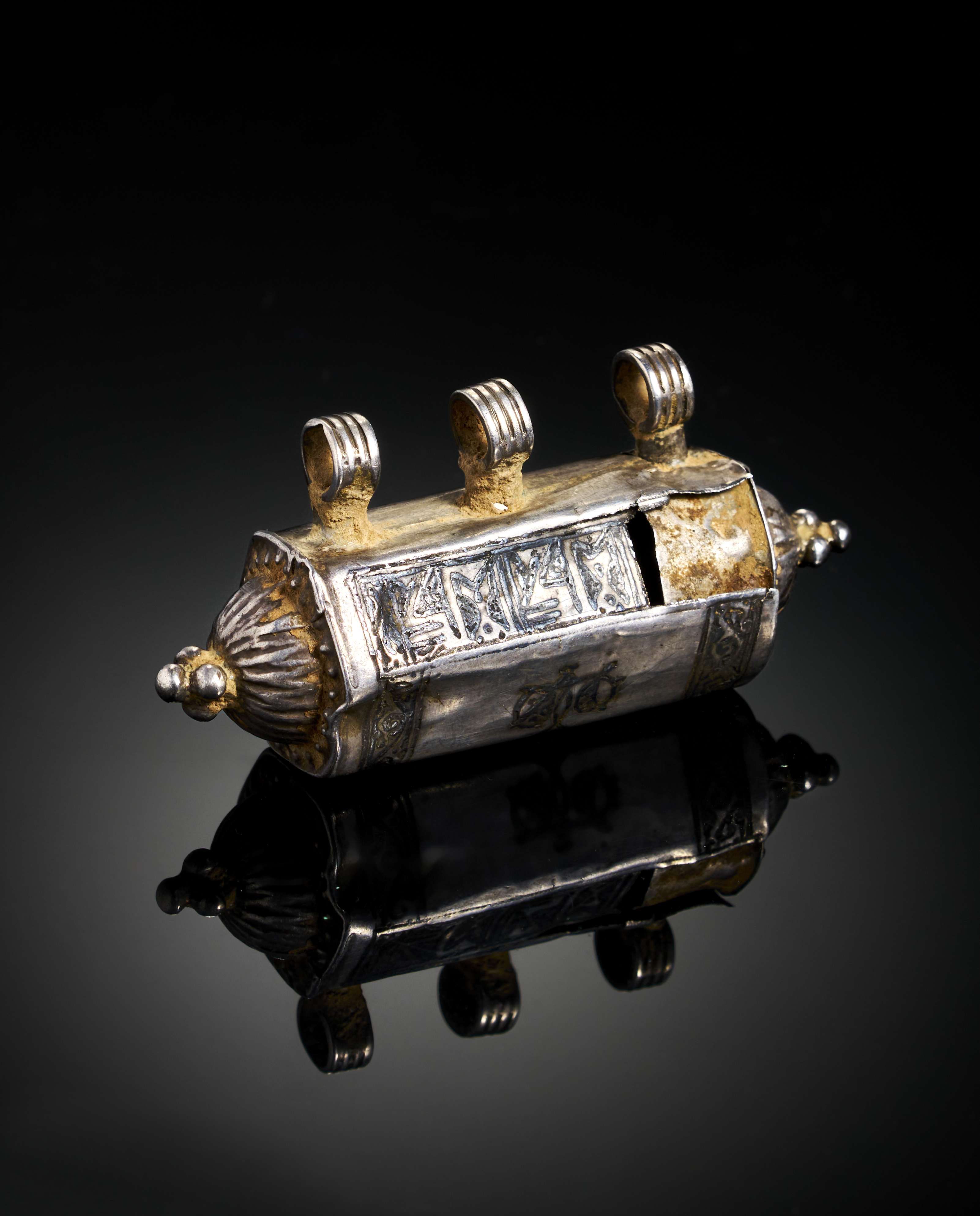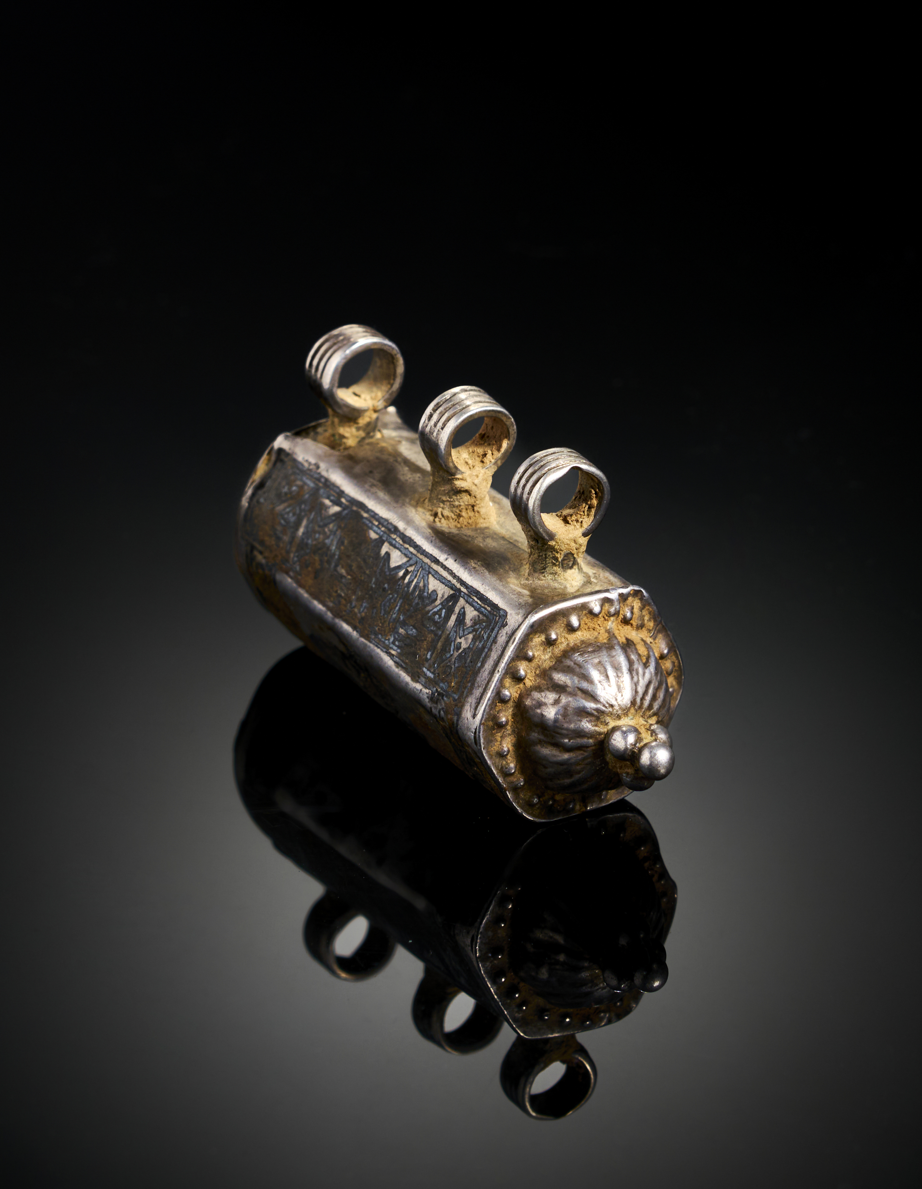A SELJUK NIELLO AND GOLD INALID SILVER PENDANT OR AMULET WITH KUFIC CALLIGRAPHY, PERSIA, 12TH – 13TH CENTURY