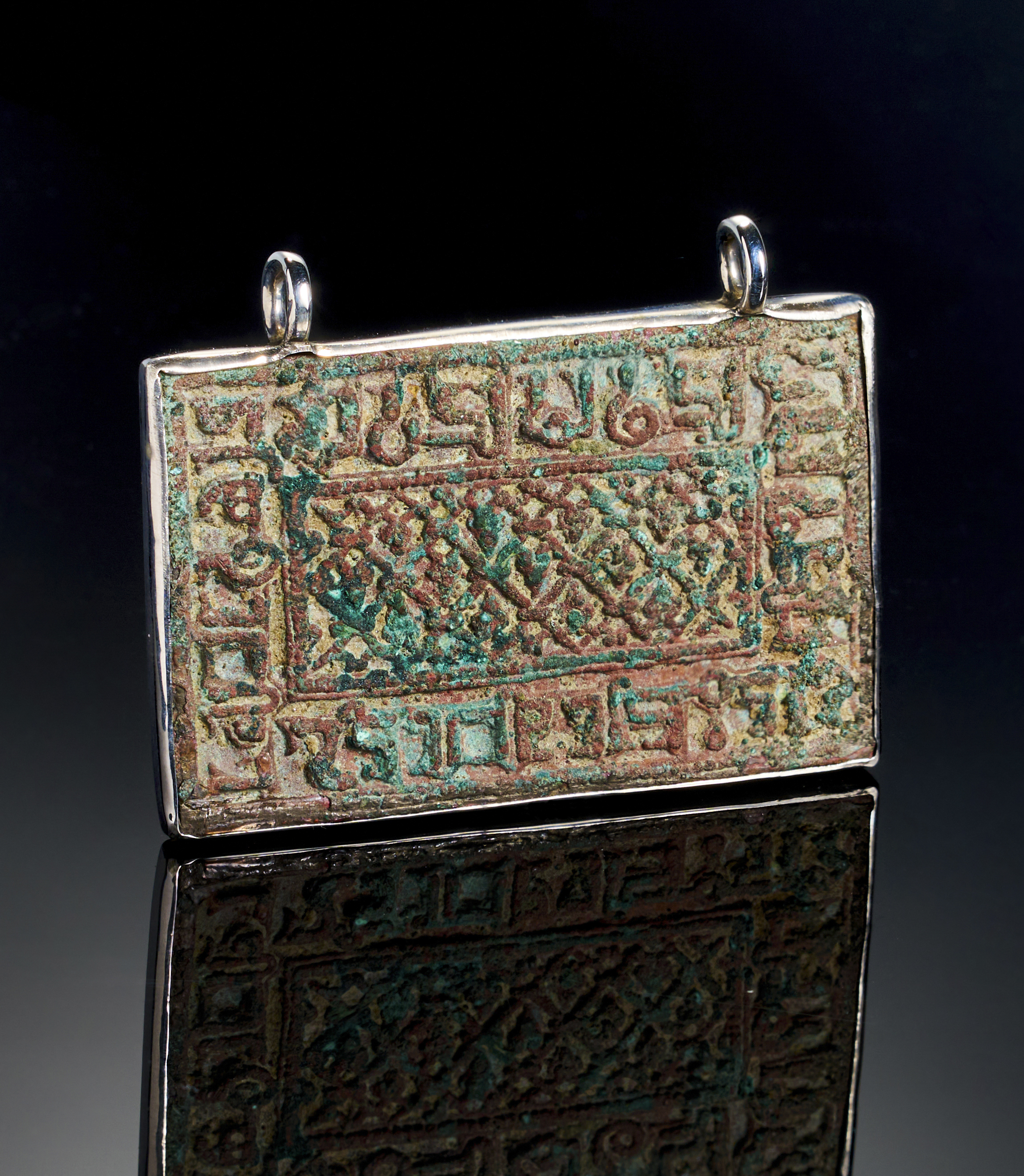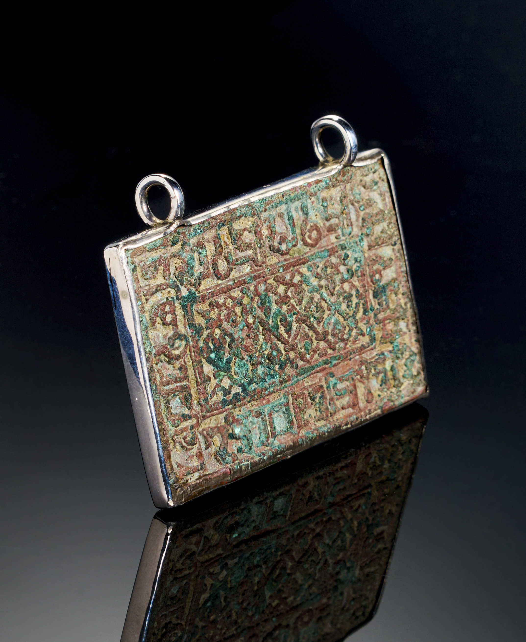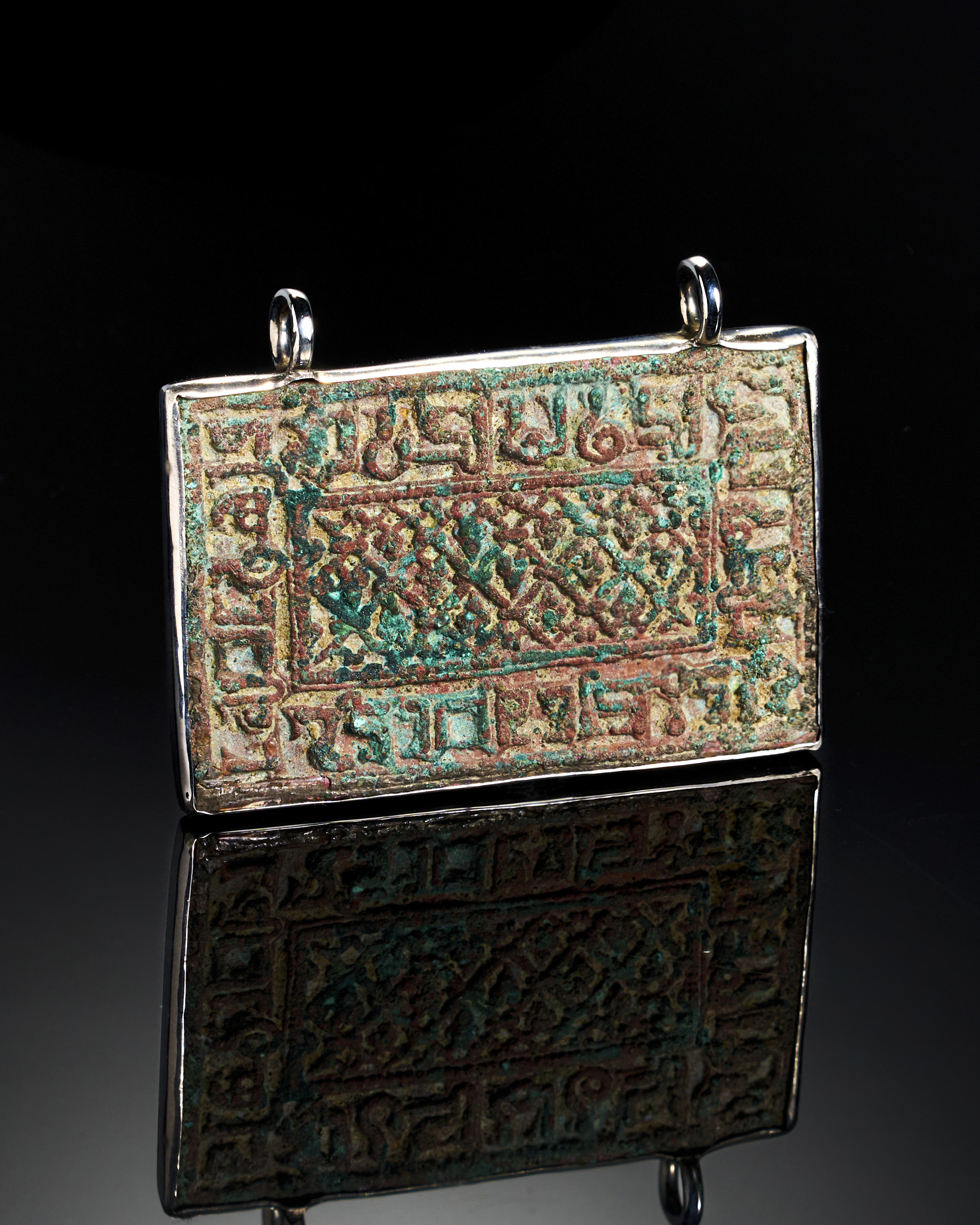 A FATIMID BRONZE PLAQUE WITH ARABESQUE DECORATION AND KUFIC CALLIGRAPHY (SURAT AL IKHLAS) IN A LATER SILVER FRAME, 9TH-11TH CENTURY