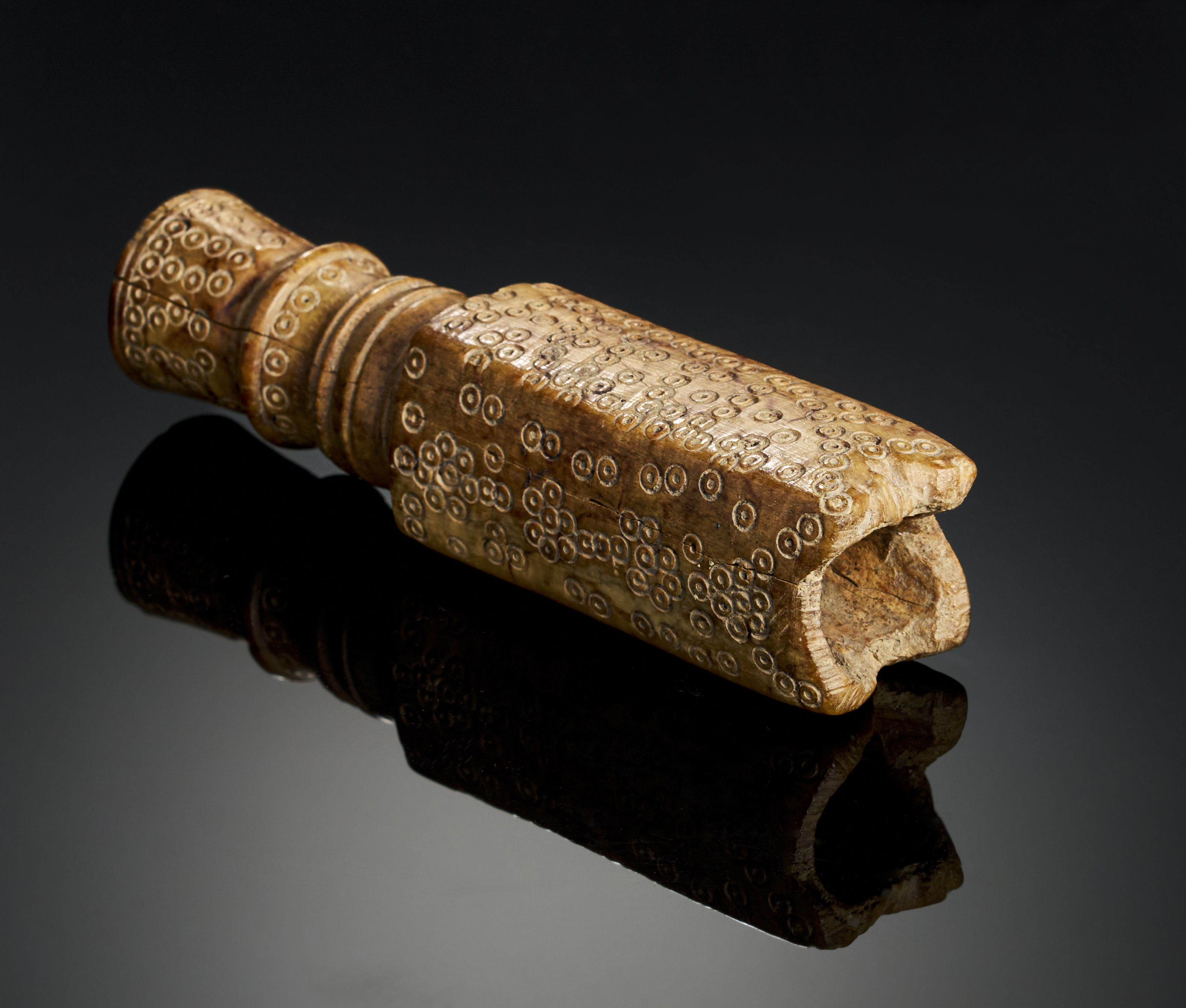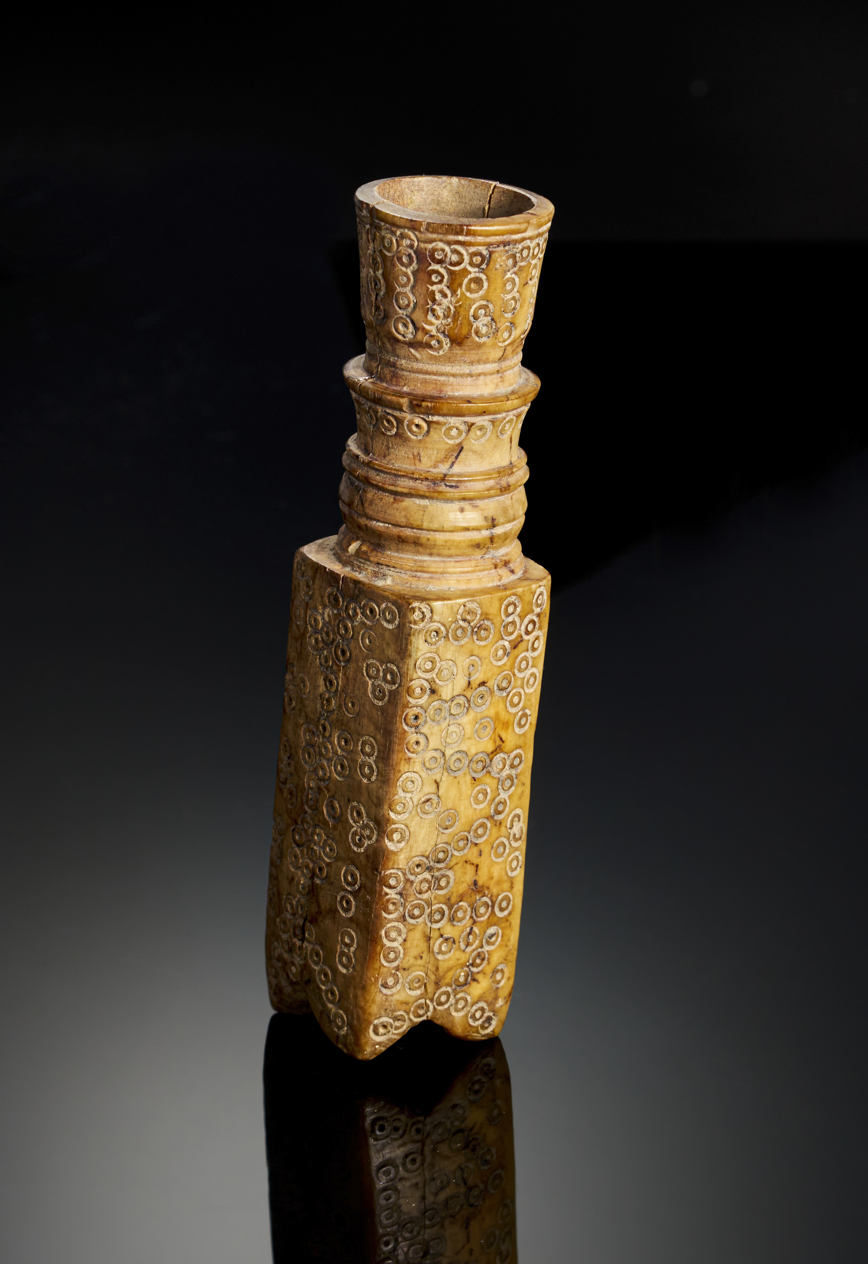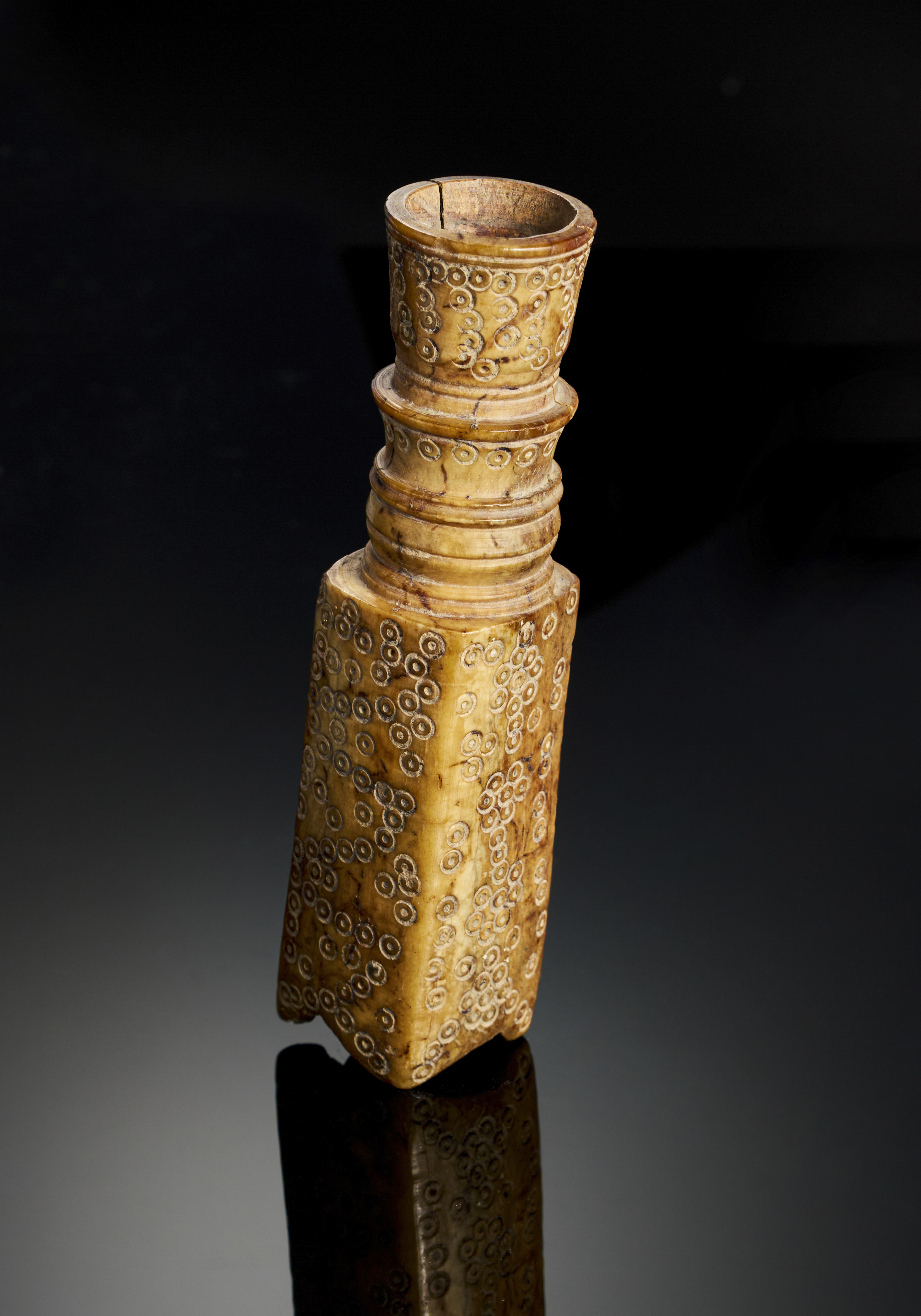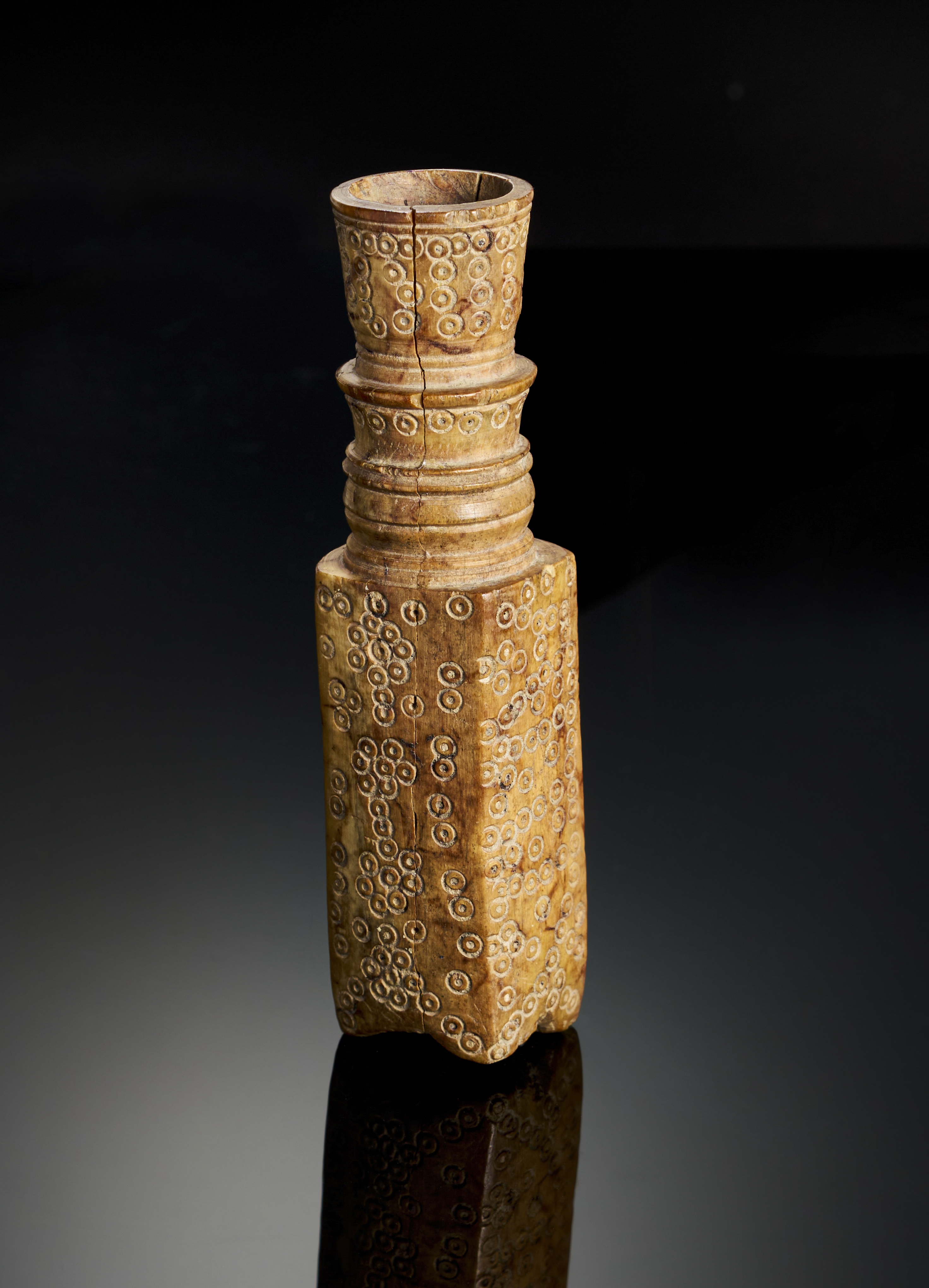 of rectangular form on four feet, the neck with waisted sections and raised bands rising to a flaring section, decorated with engraved circle motifs.