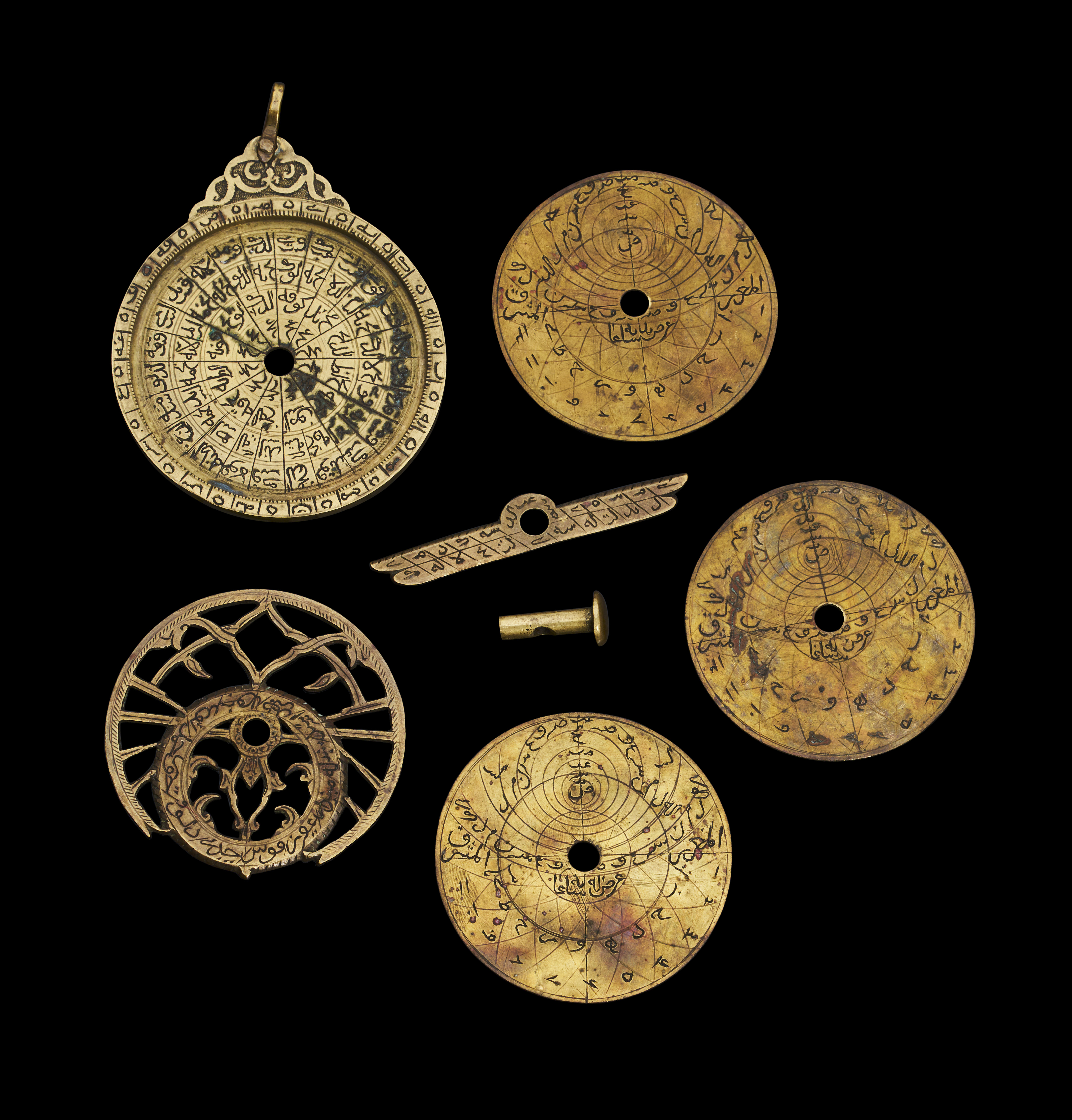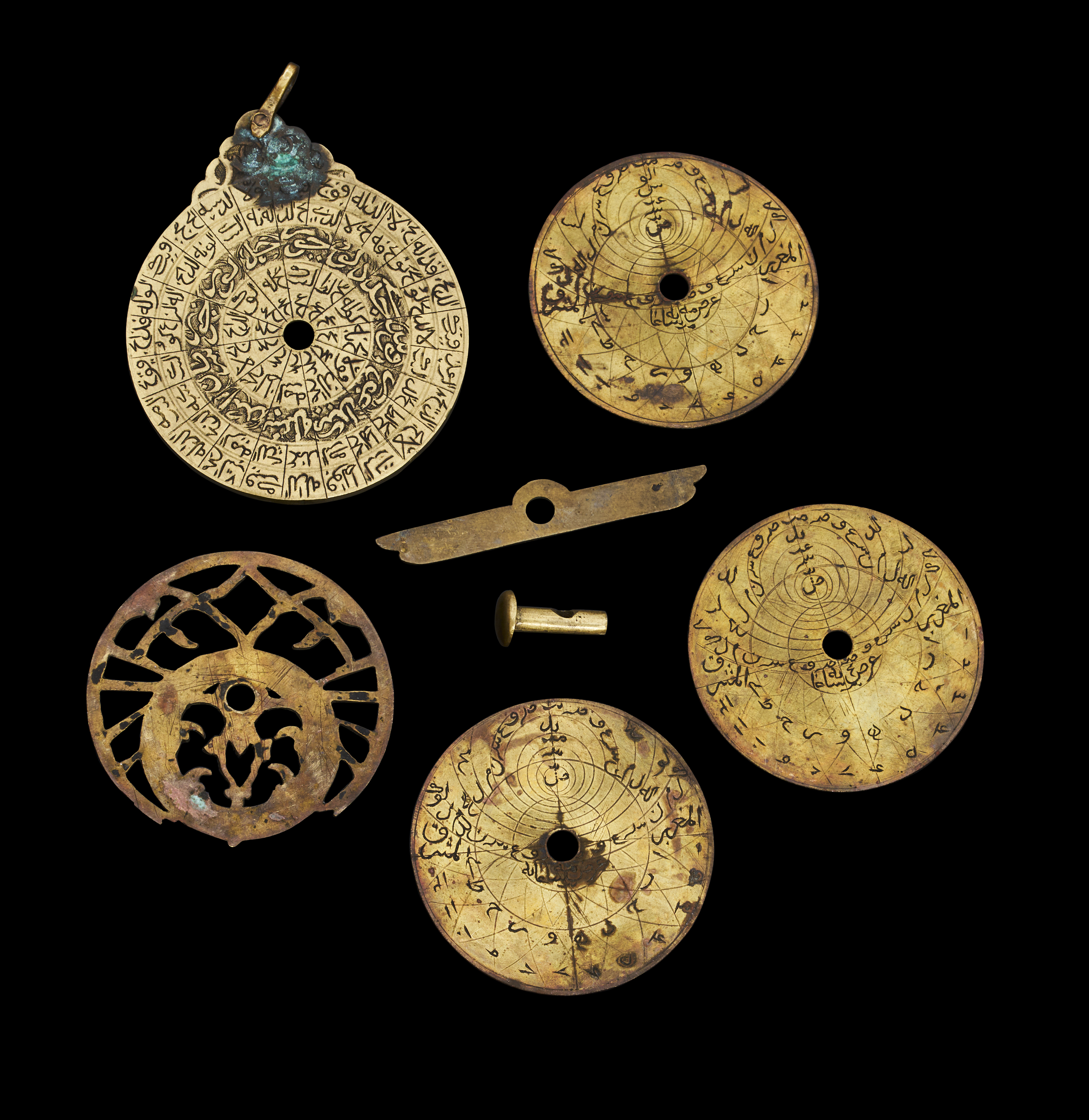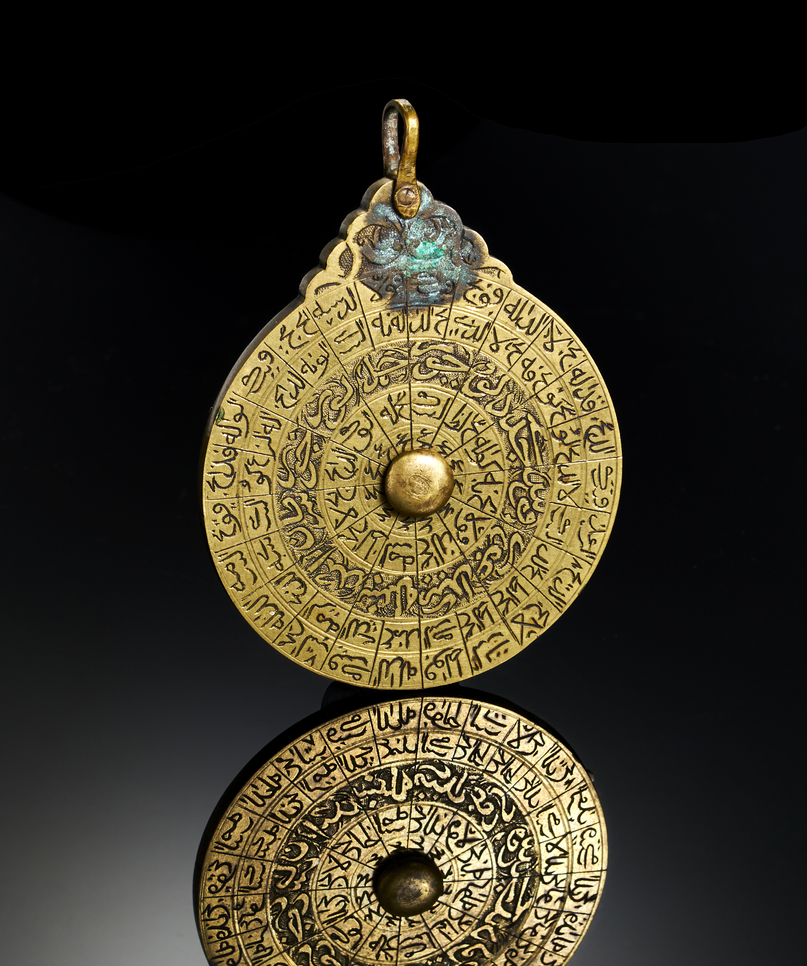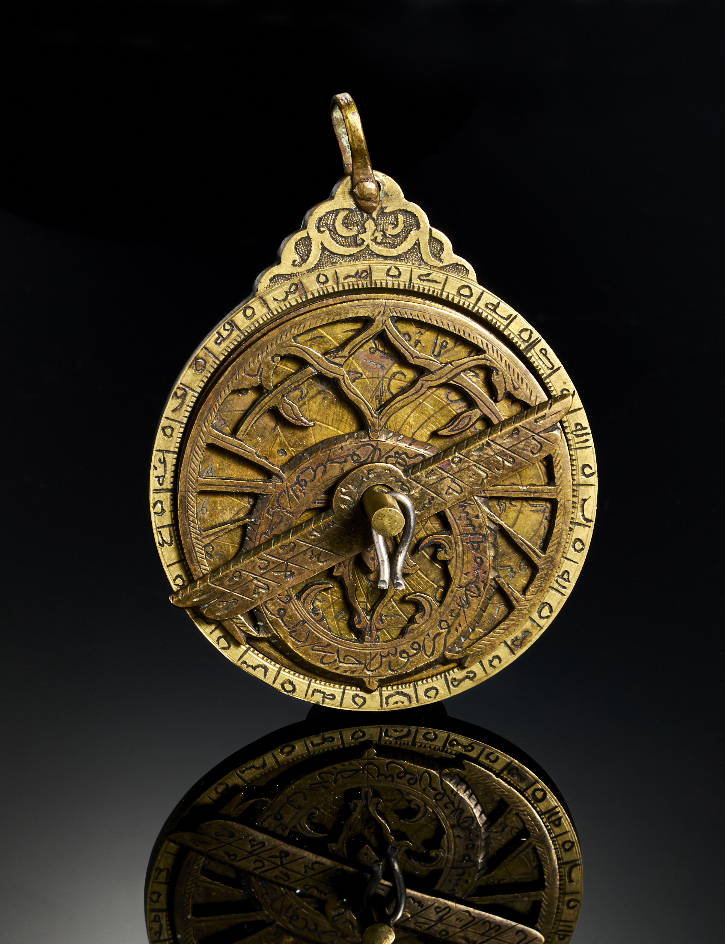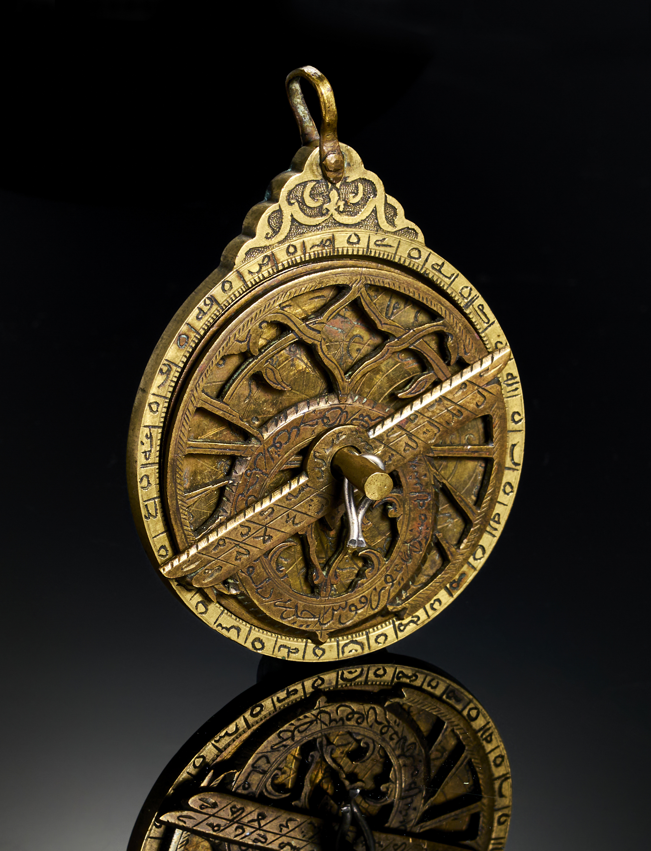 A 19th-century brass miniature astrolabe, Meticulously engraved with intricate Arabic inscriptions, celestial charts, and geometric patterns, this compact instrument was designed for astronomical observations and navigation. The astrolabe comprises multiple finely engraved brass plates, a rete with an elegant openwork design, and a pivoting rule.