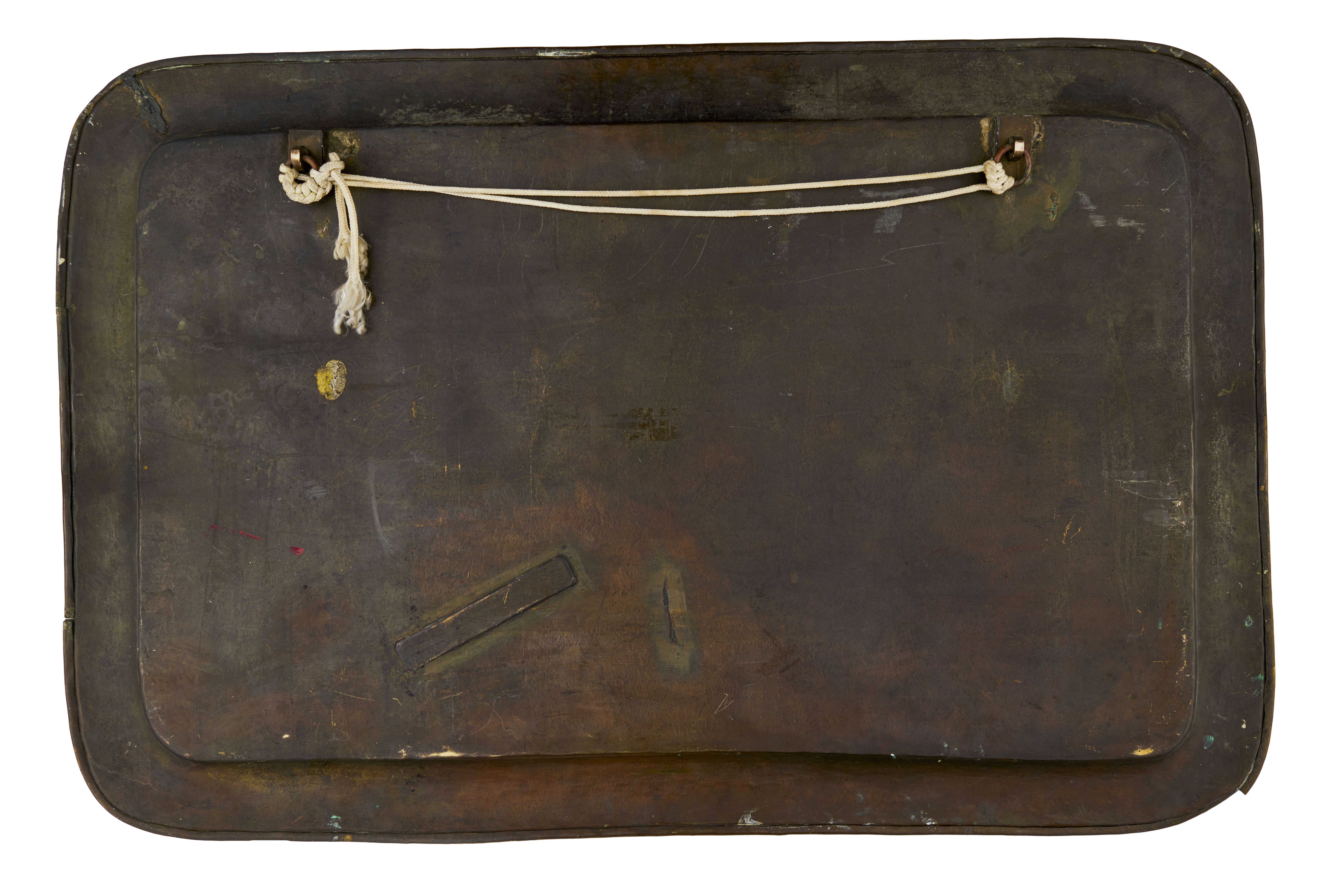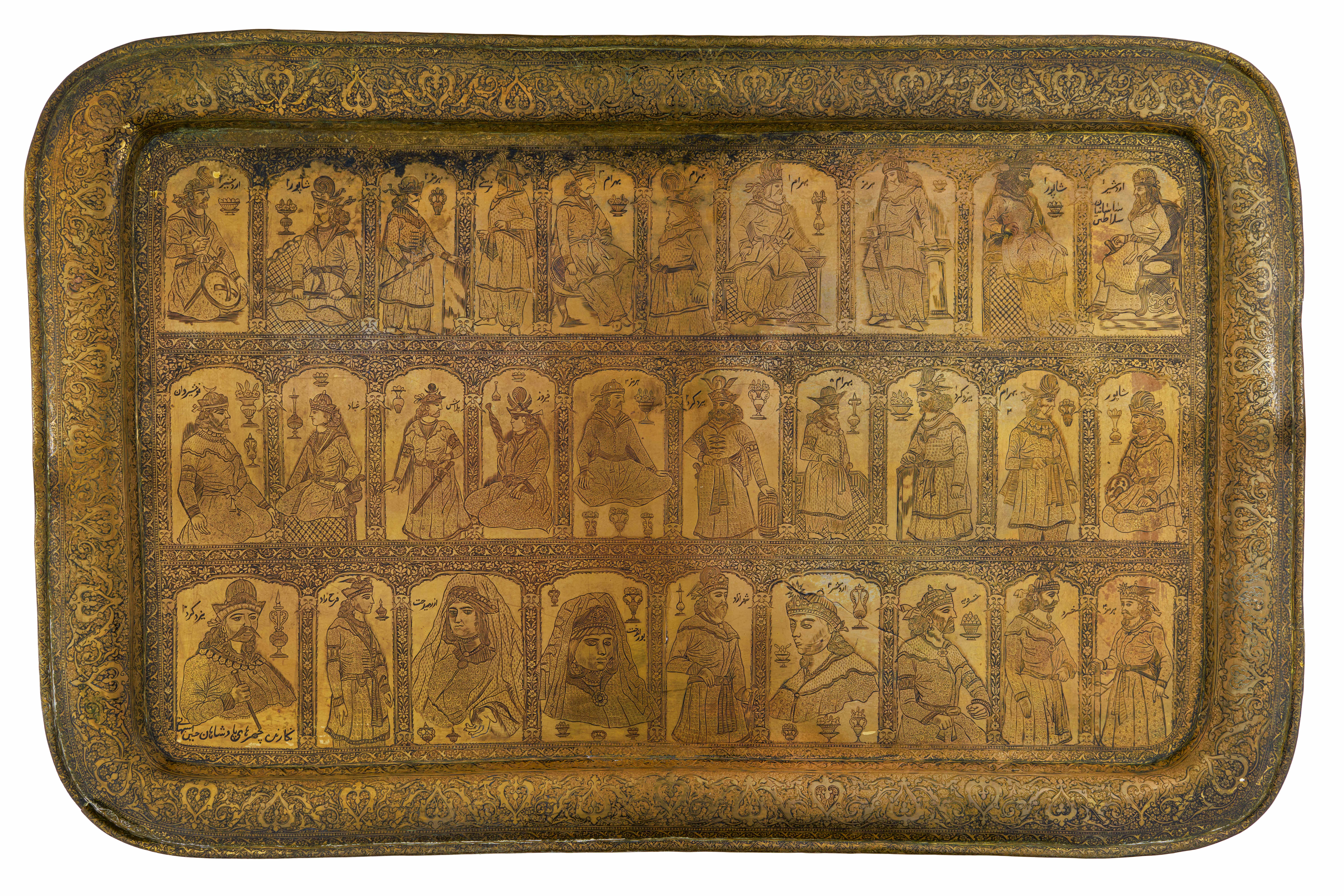 A LARGE QAJAR ENGARVED BRASS TRAY DEPICTING ANCIANT SASSANIAN PERSIAN KINGS AND QUEENS SIGNED HUSSEIN ISFAHANI
