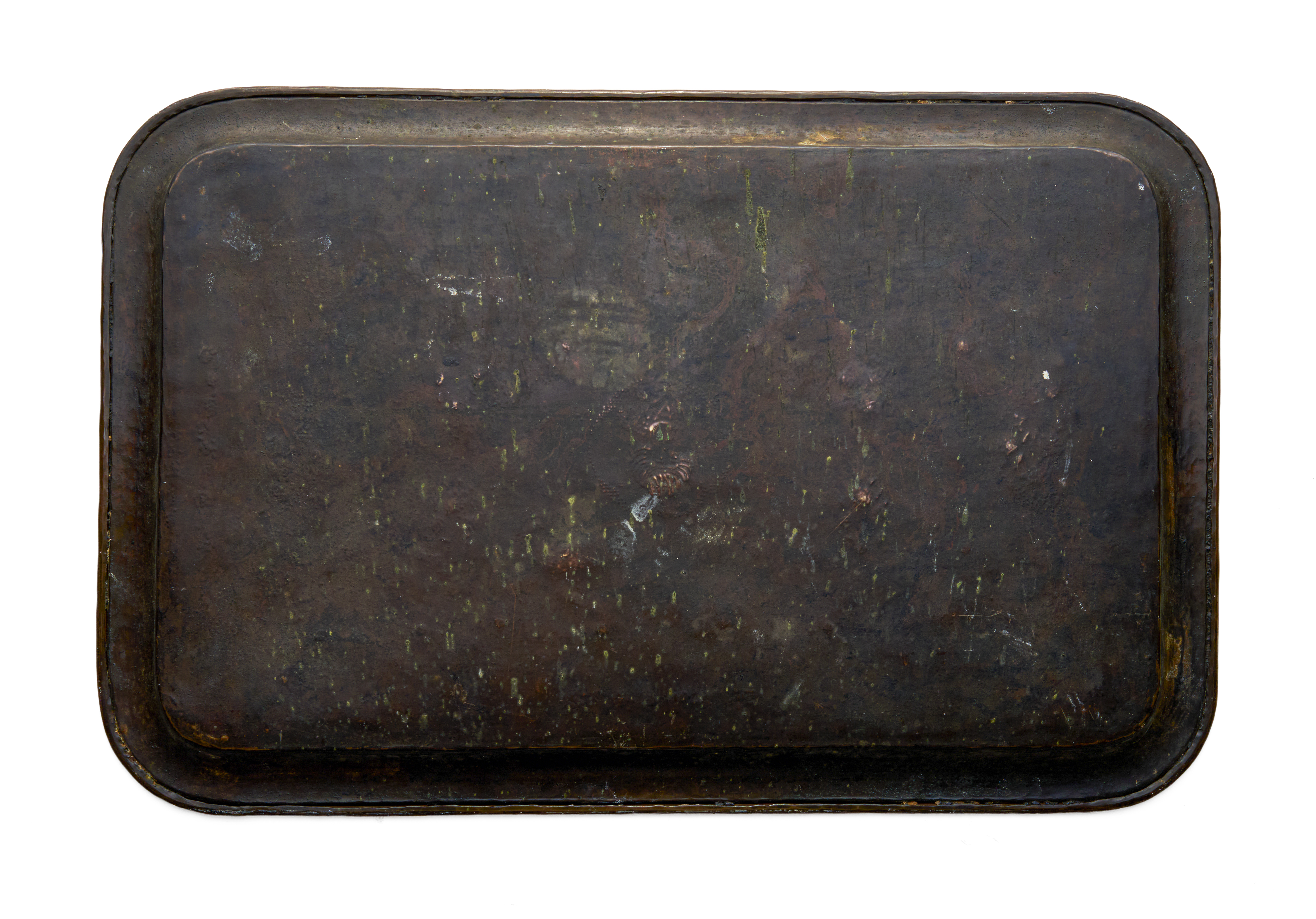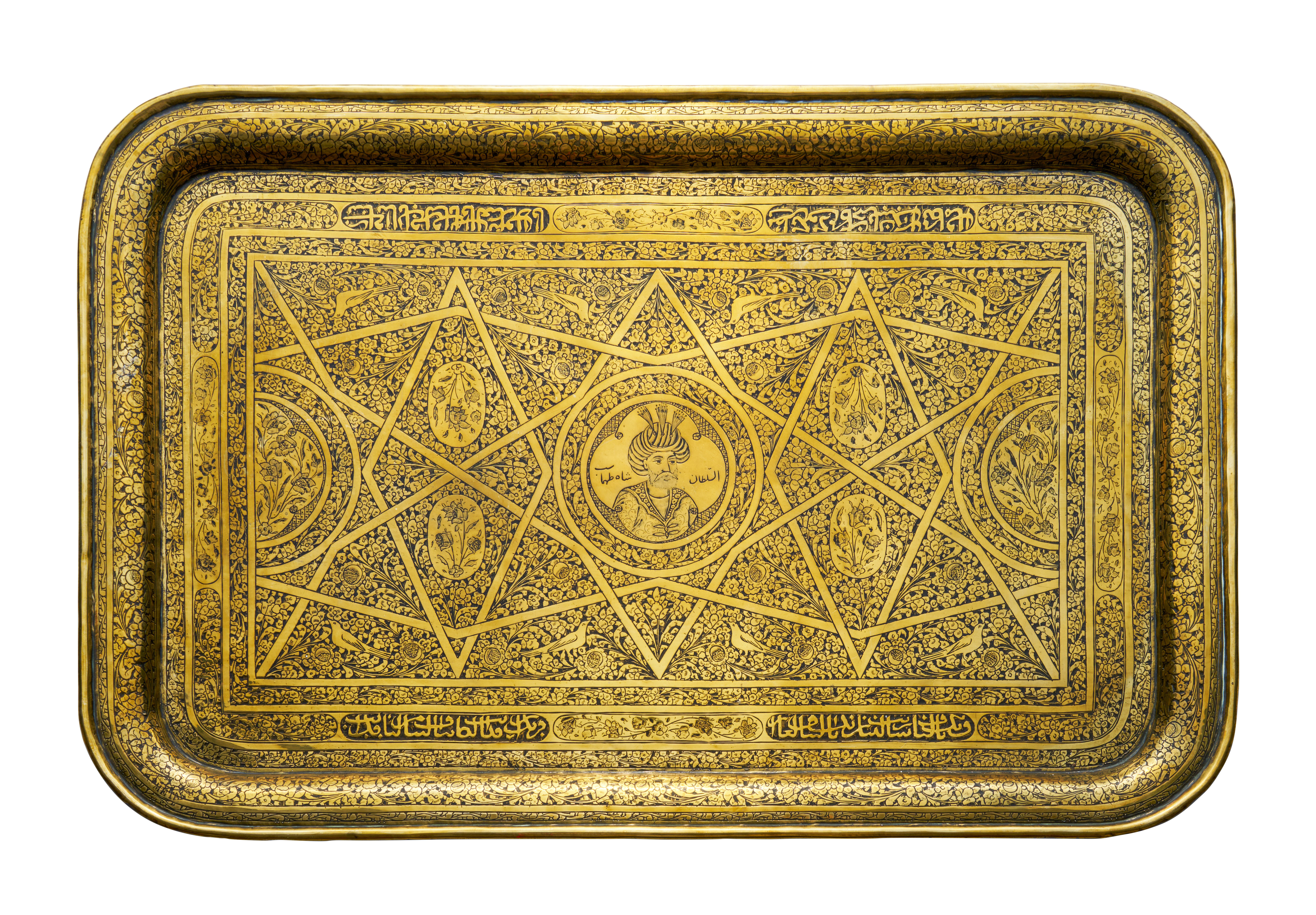 A PERSIAN QAJAR BRASS TRAY DEPICTING SHAH TAHMASP, 19TH CENTURY
