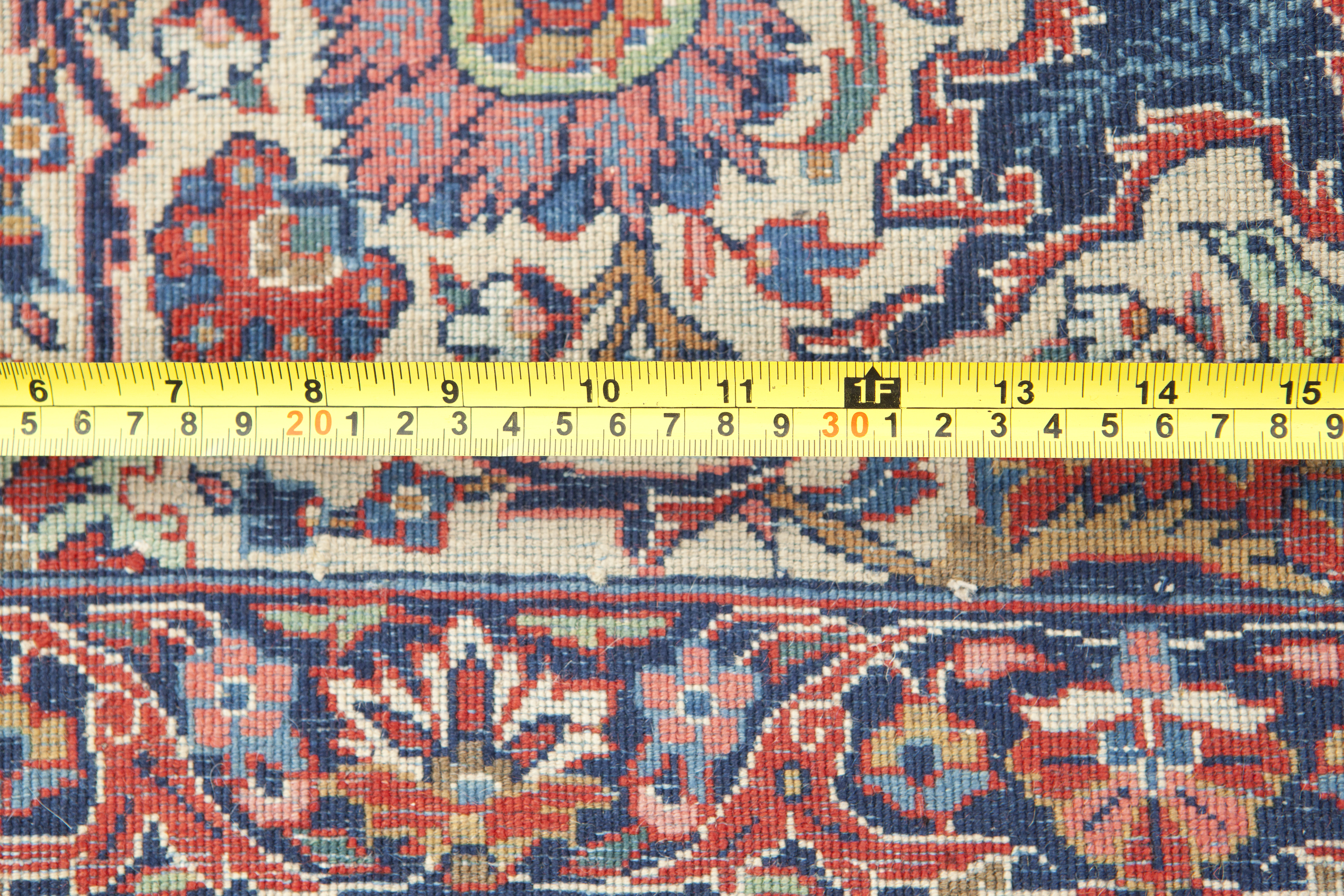 Rare and impressive antique Kashan Dabir carpet. Dabir was one of the most famous weavers in Kashan. Not many pieces woven by his workshop are available, and the remaining ones have been very sought after. He is very well known for the quality of his rugs’ designs and colours combination and their very high quality of execution. The elegant central motif stands out against the cream background. The wool quality is excellent, as you would expect from antique pieces from this city. This piece has a full pile and is in very good condition, apart from an old repair, hardly visible.