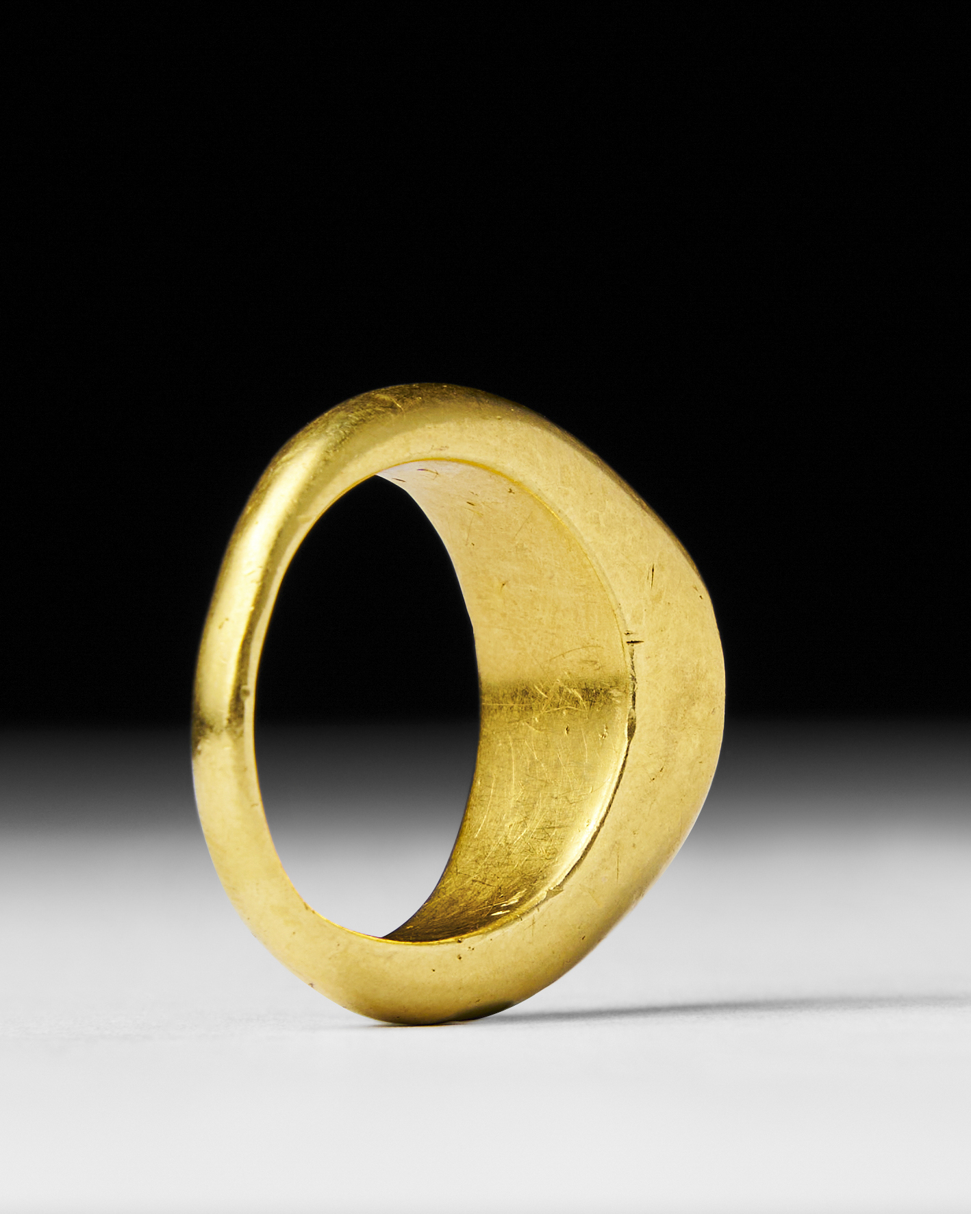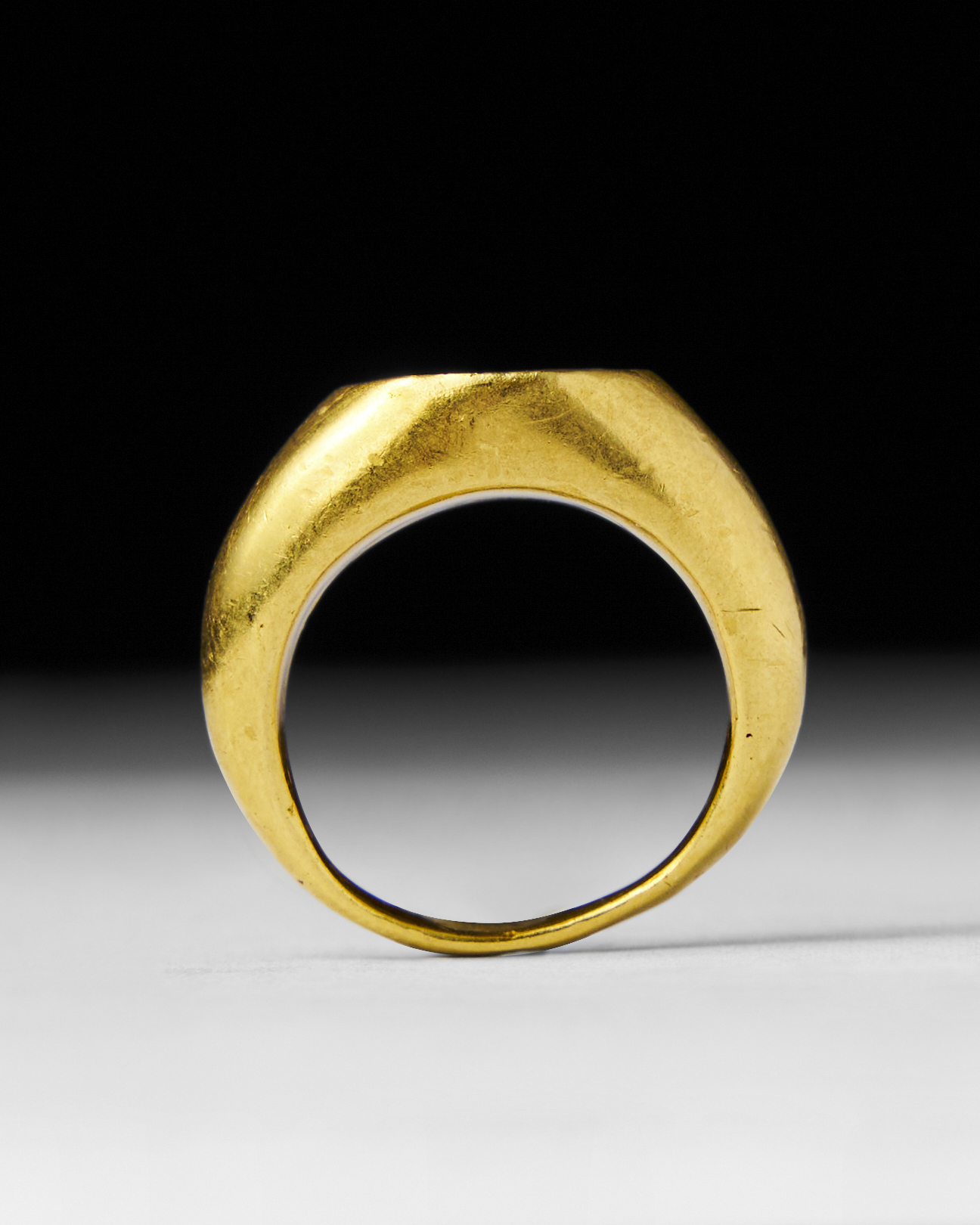 Ancient Roman ring, dating from approximately 100-200 A.D., showcases a beautifully carved carnelian intaglio. The intaglio features the figure of a standing goddess, possibly representing Minerva or Victory, holding a spear, symbolising protection or triumph. The deep red carnelian stone is finely set in a smooth gold band.