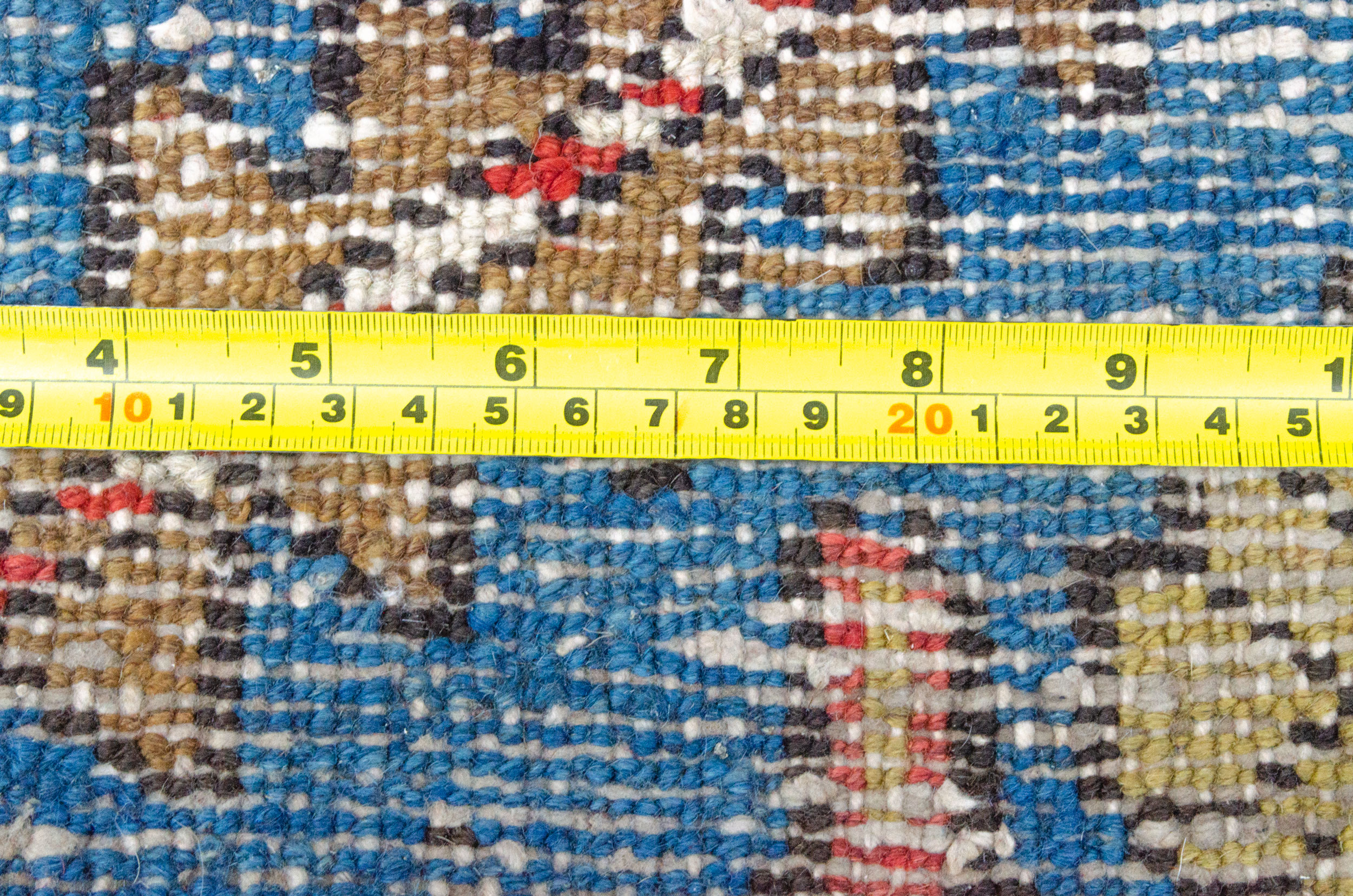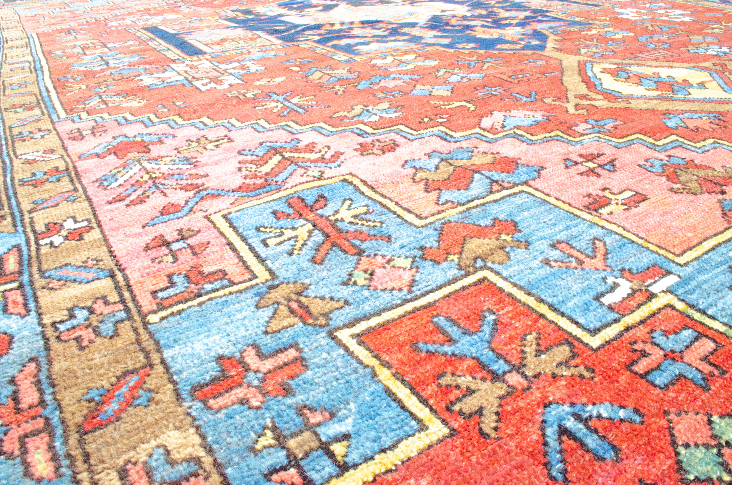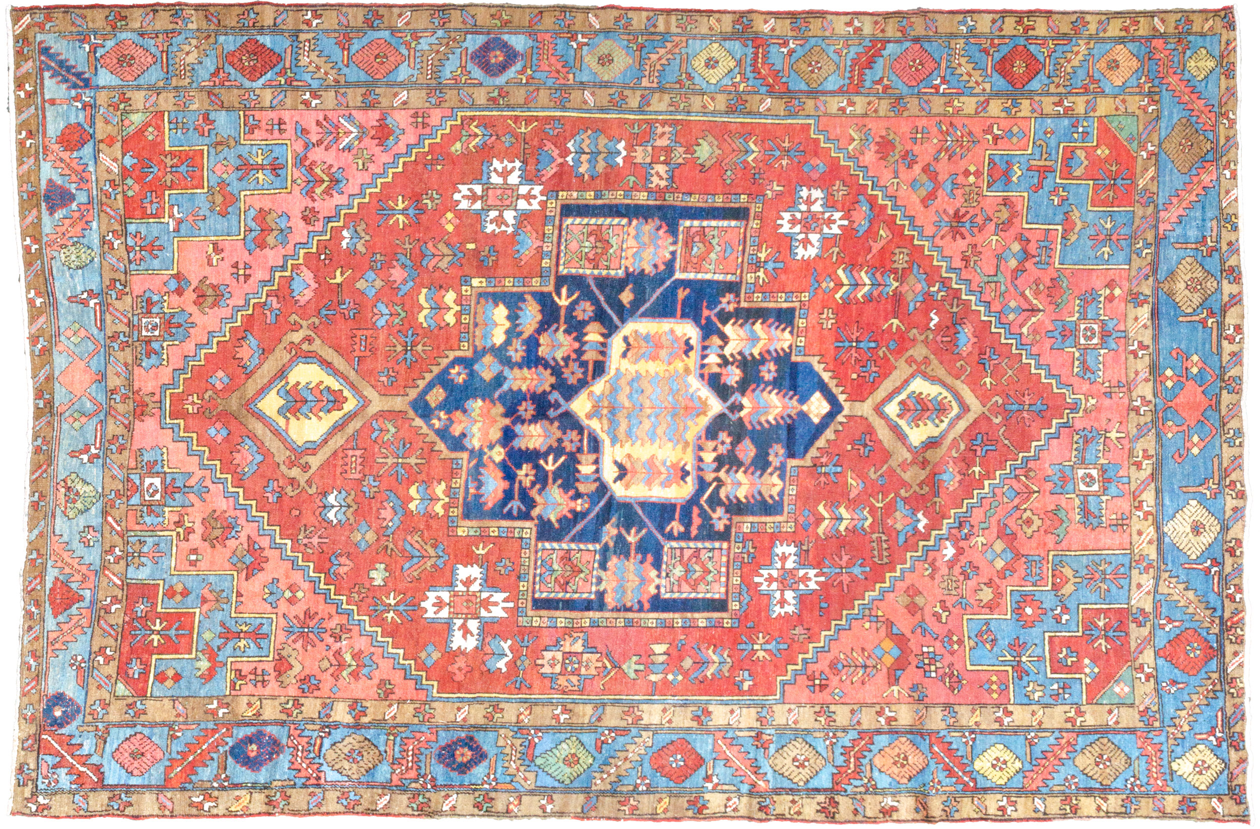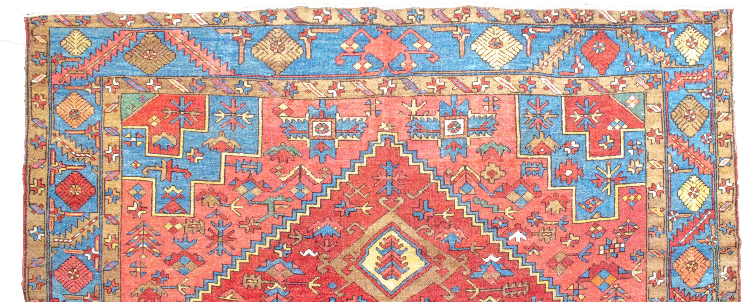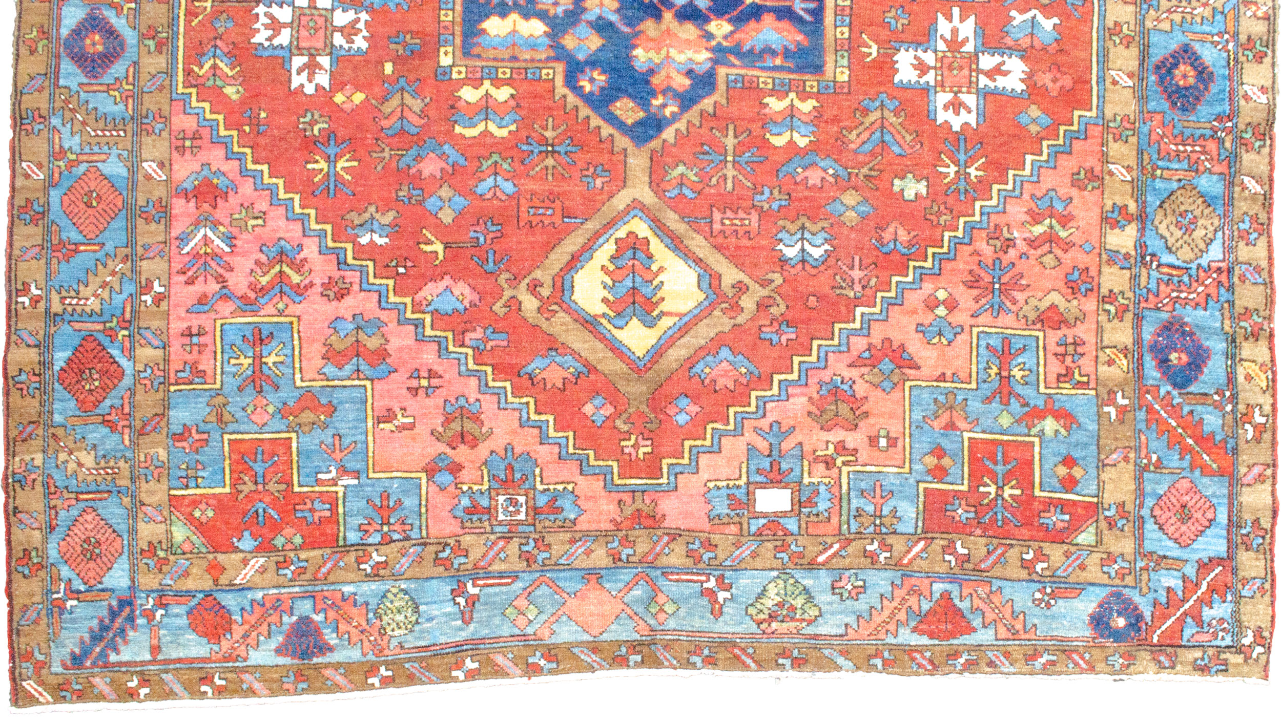 Terracotta ground colour has a wonderful harmony with the blue and the peach in this carpet. The mellow yellow adds that little bit of extra to lift this even further. The medallion and spandrels are very unusual. The various motifs give much character.
