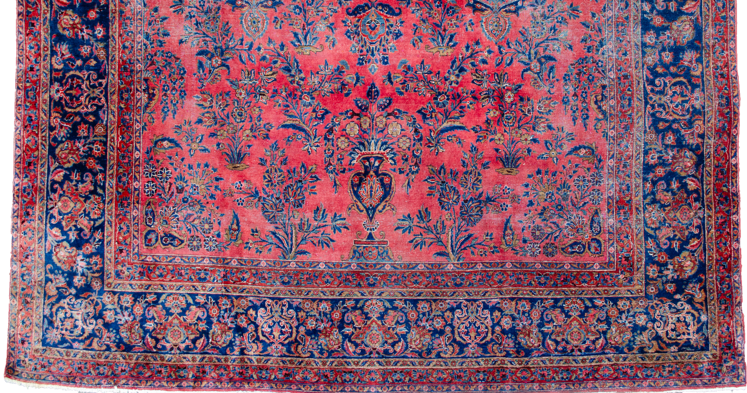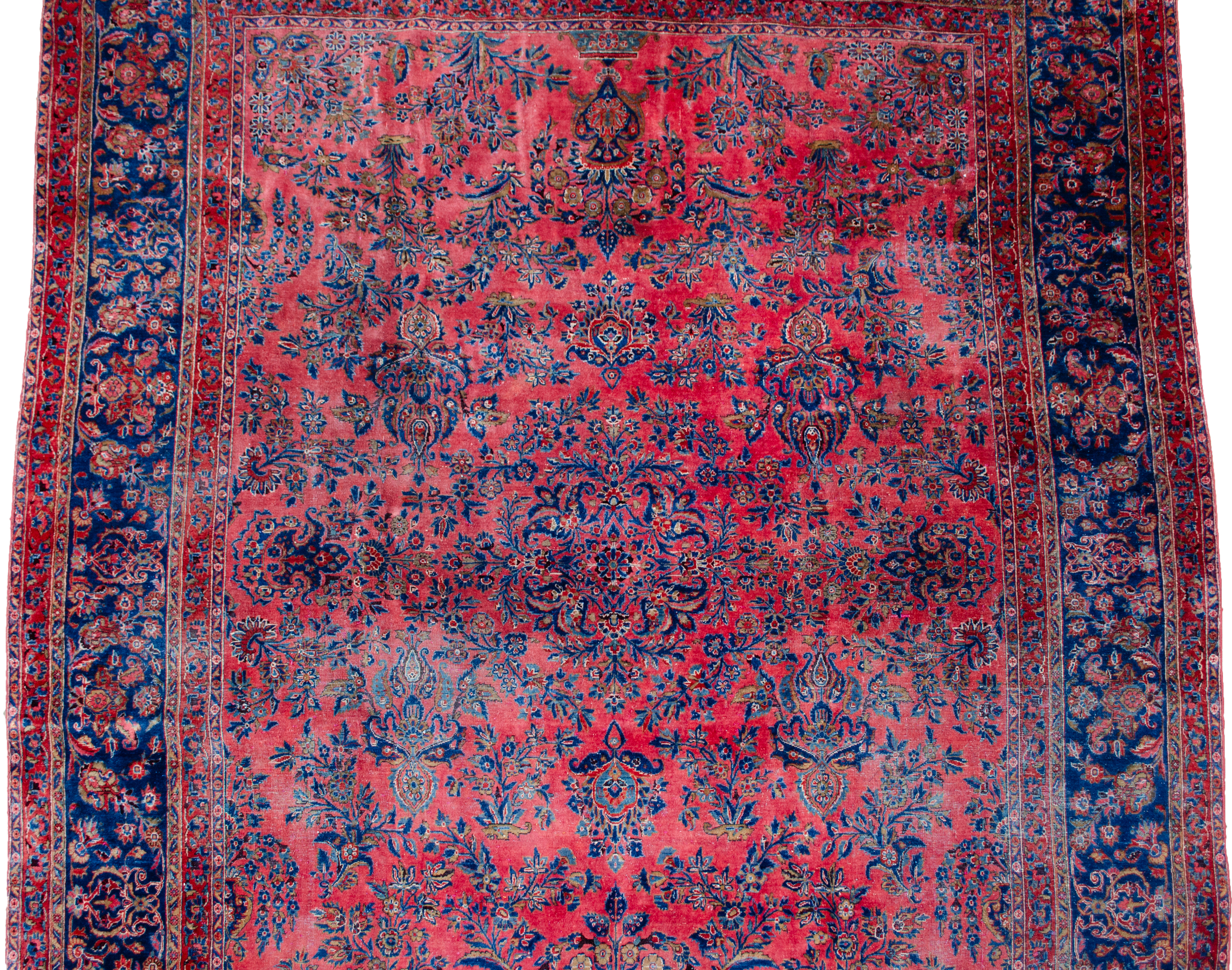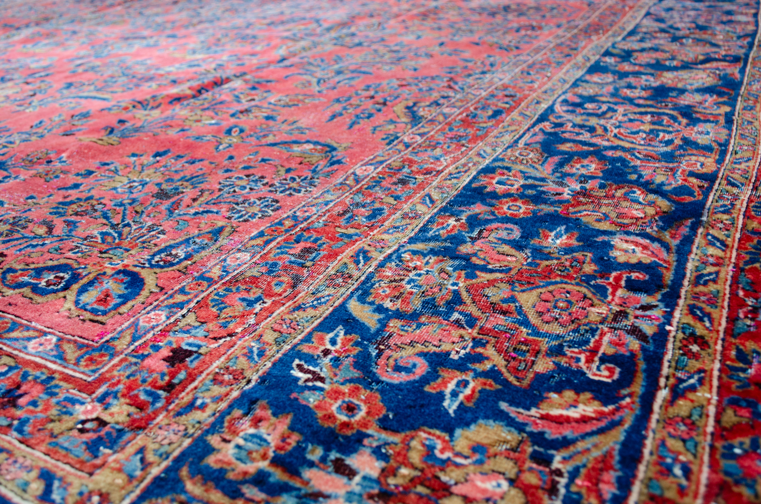 Decorative antique Kashan carpet with magnificent colours. It has a lovely hue of red ground, which is decorated with bouquets of flowers with a royal blue floral border. It’s very finely woven and in a shabby chic condition, reflected in the price.