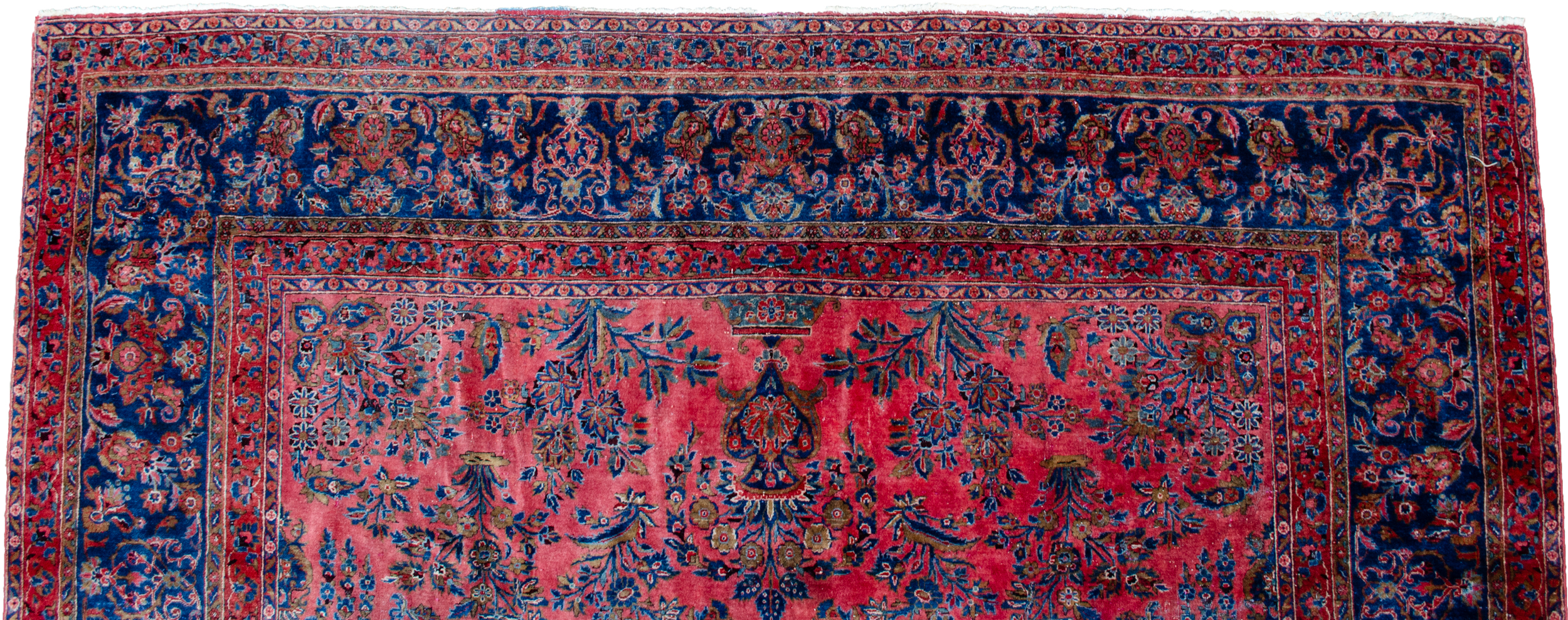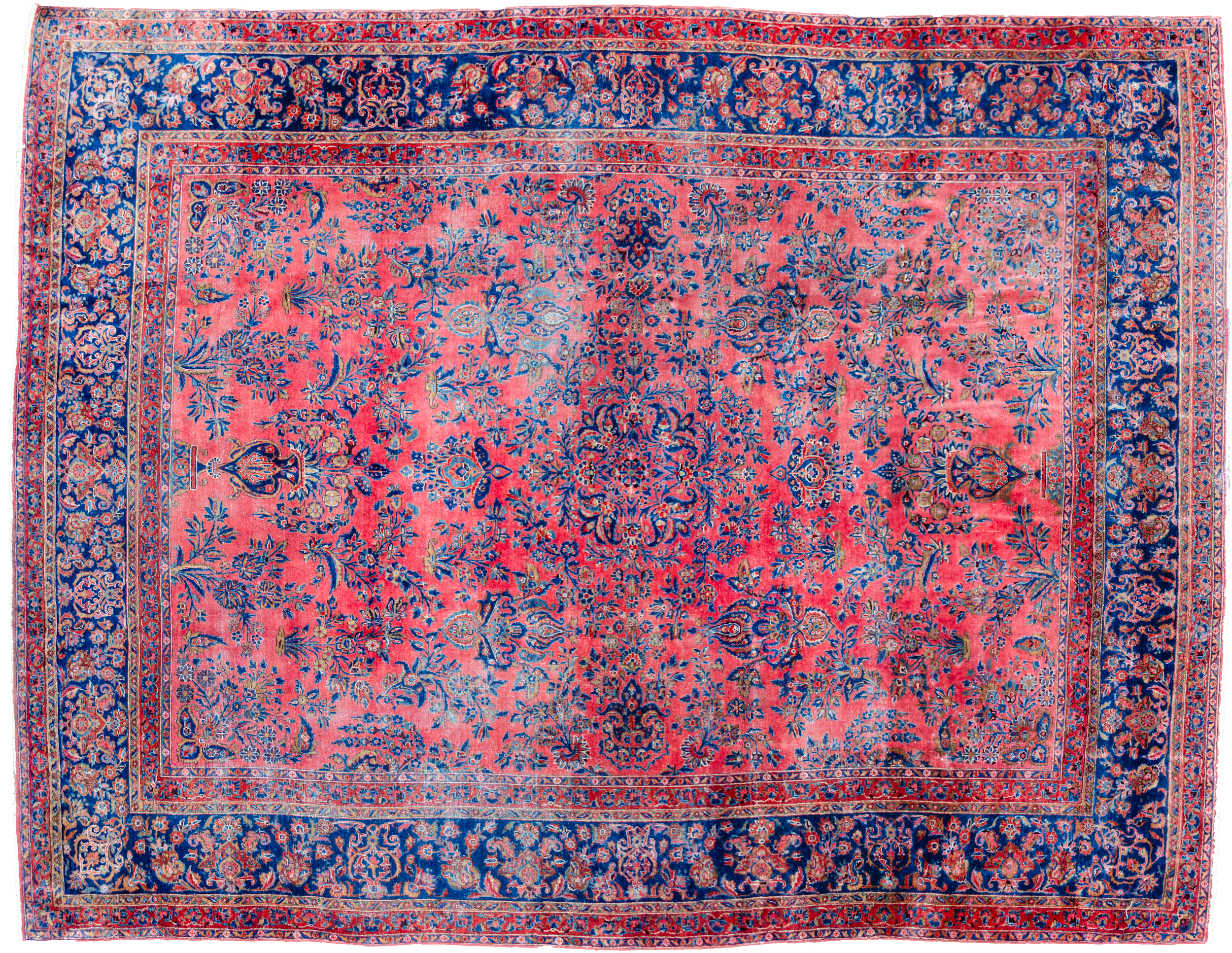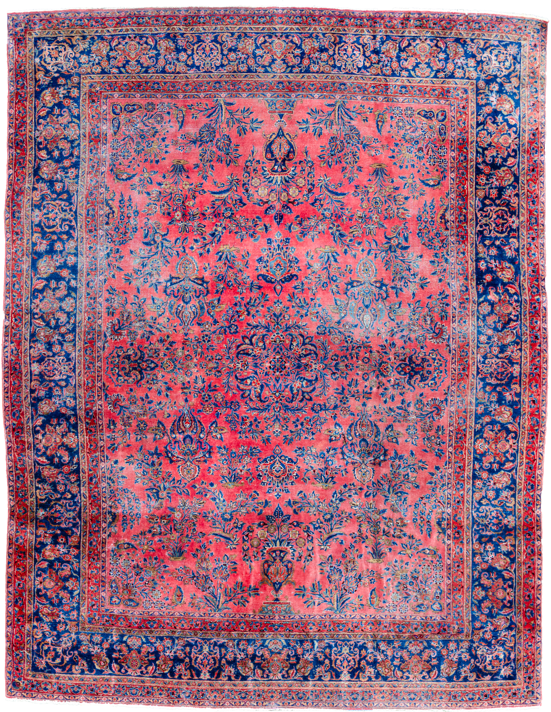 Decorative antique Kashan carpet with magnificent colours. It has a lovely hue of red ground, which is decorated with bouquets of flowers with a royal blue floral border. It’s very finely woven and in a shabby chic condition, reflected in the price.