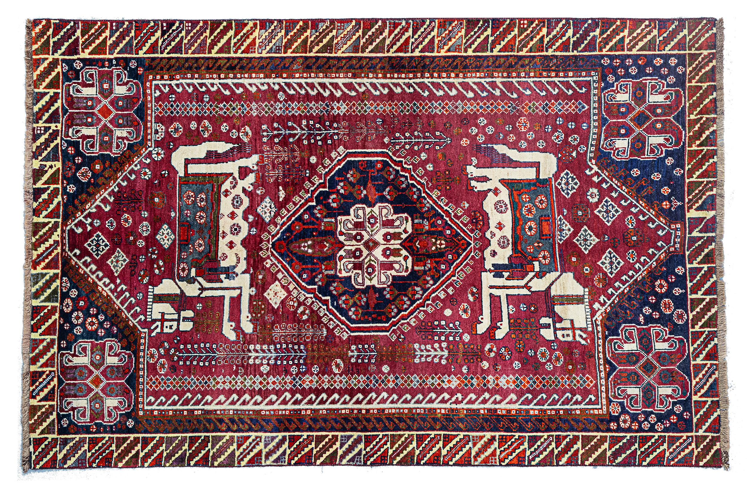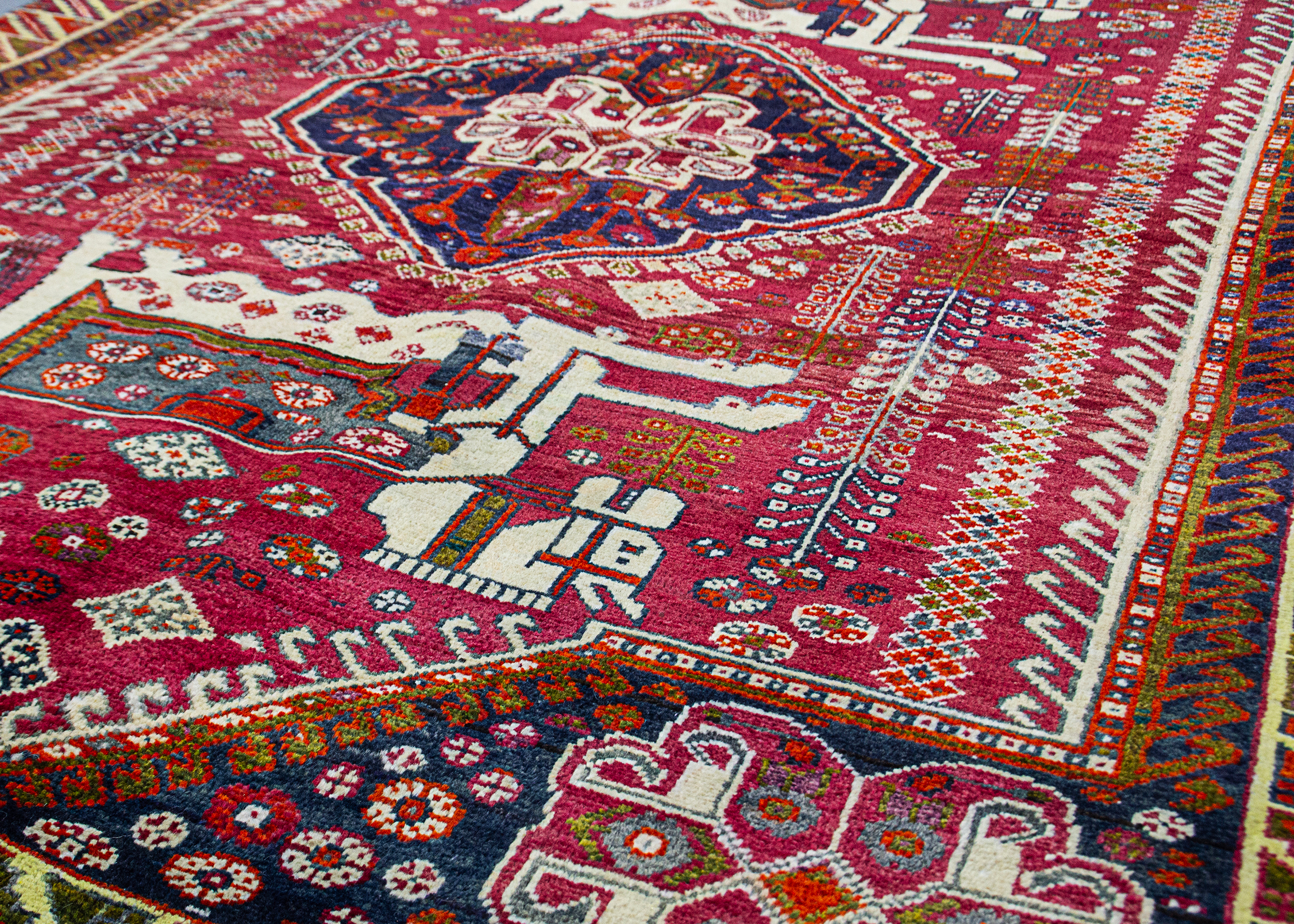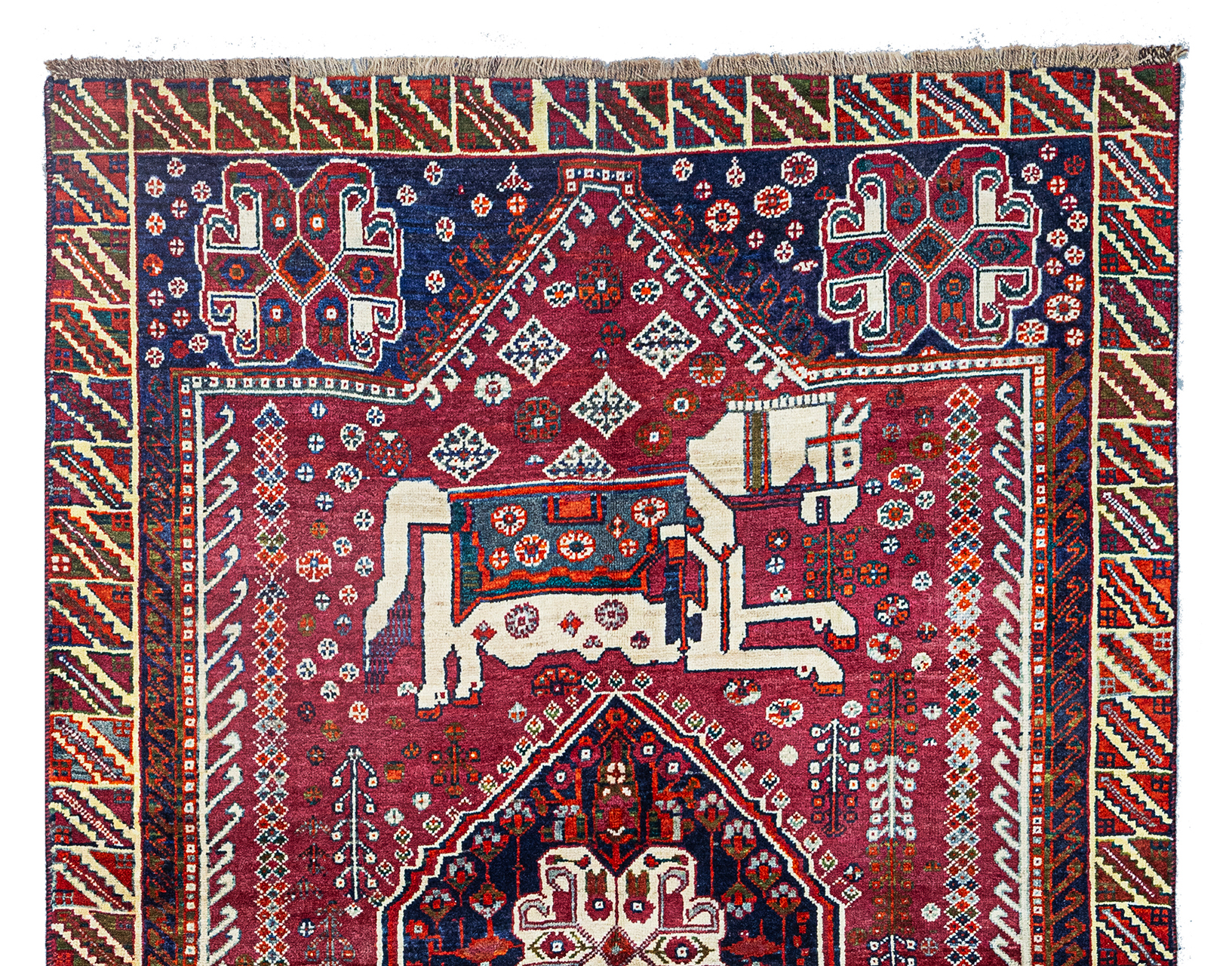 Charming vintage Qashqai rug featuring two large horses with beautiful horse covers on either side of the central medallion on a rich red ground colour with various motifs.