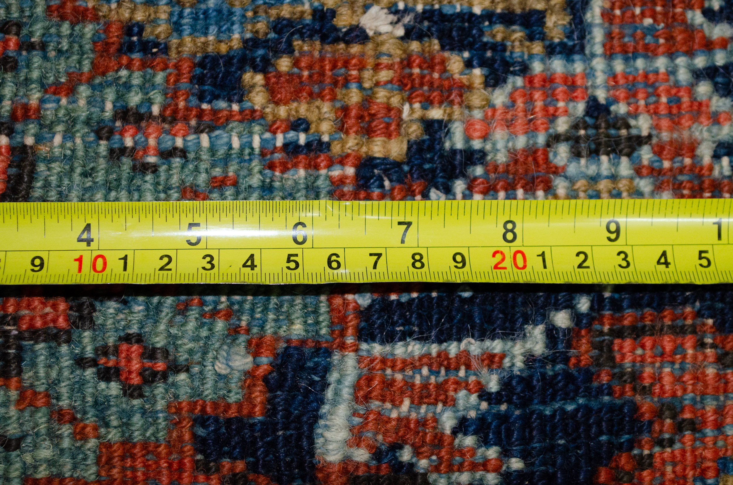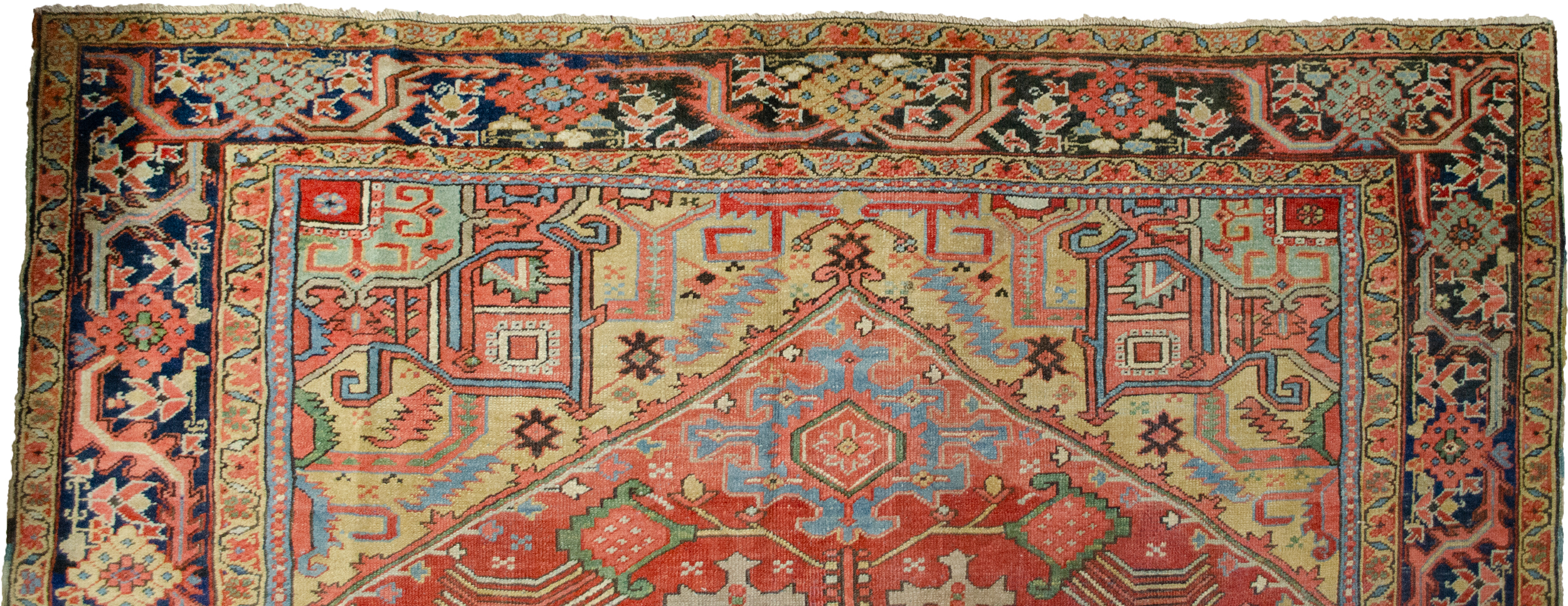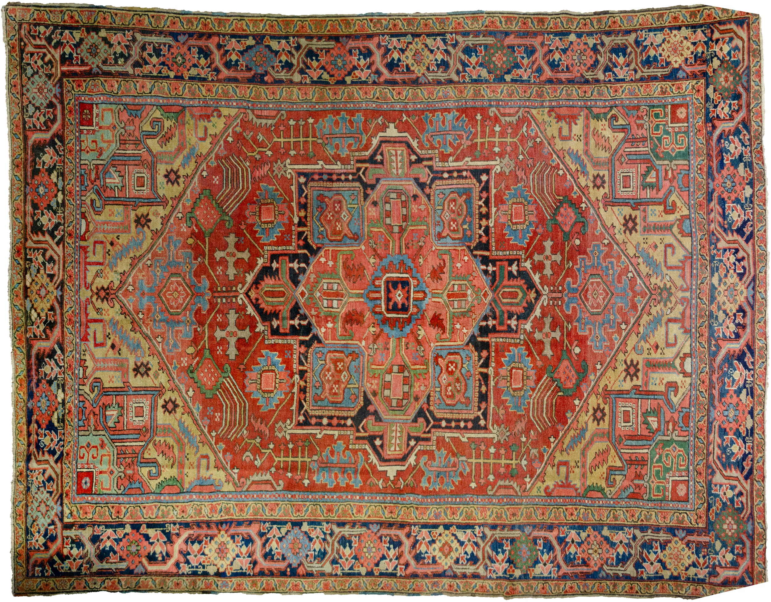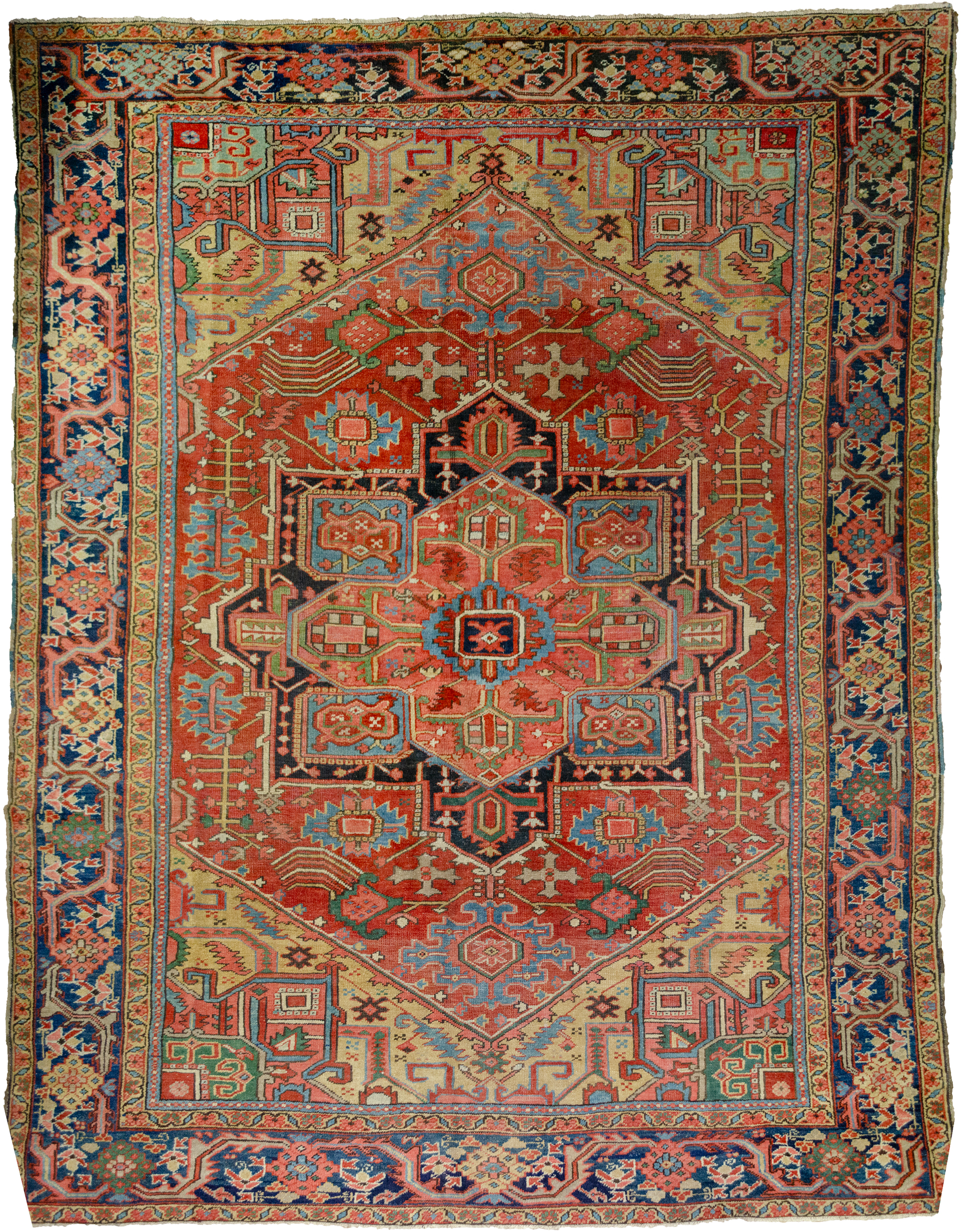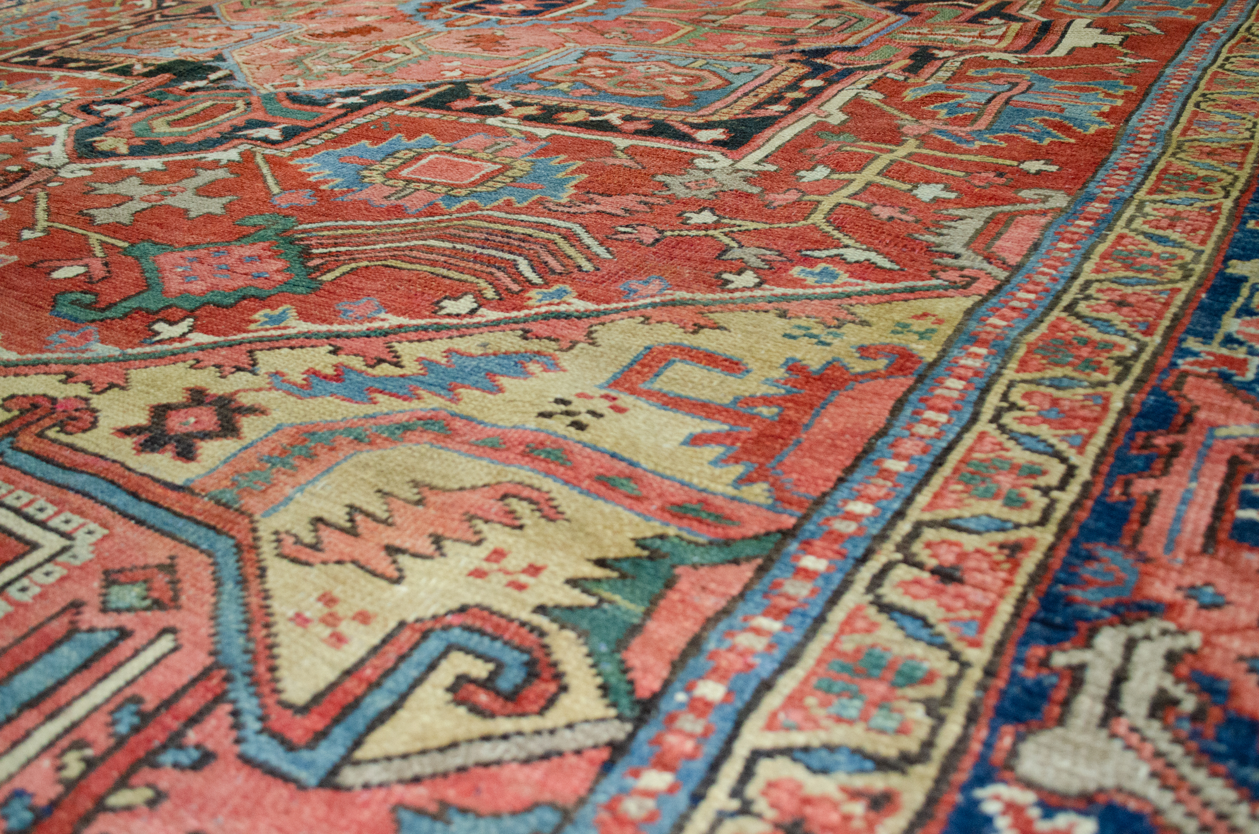 With rich red ground colour contains a large red medallion. The motifs around the medallion have unusual features, like the multicoloured branches coming out of the flowers next to the spandrels. This subtle unusualness in the motif is also repeated in a pair of blue leaves on either side of the medallion. The mustard-coloured spandrels bring a harmonious hue of colour into the carpet that adds to its attractiveness. The blue border contains stylised flower heads, which are unusually flanked by stems of flowers.