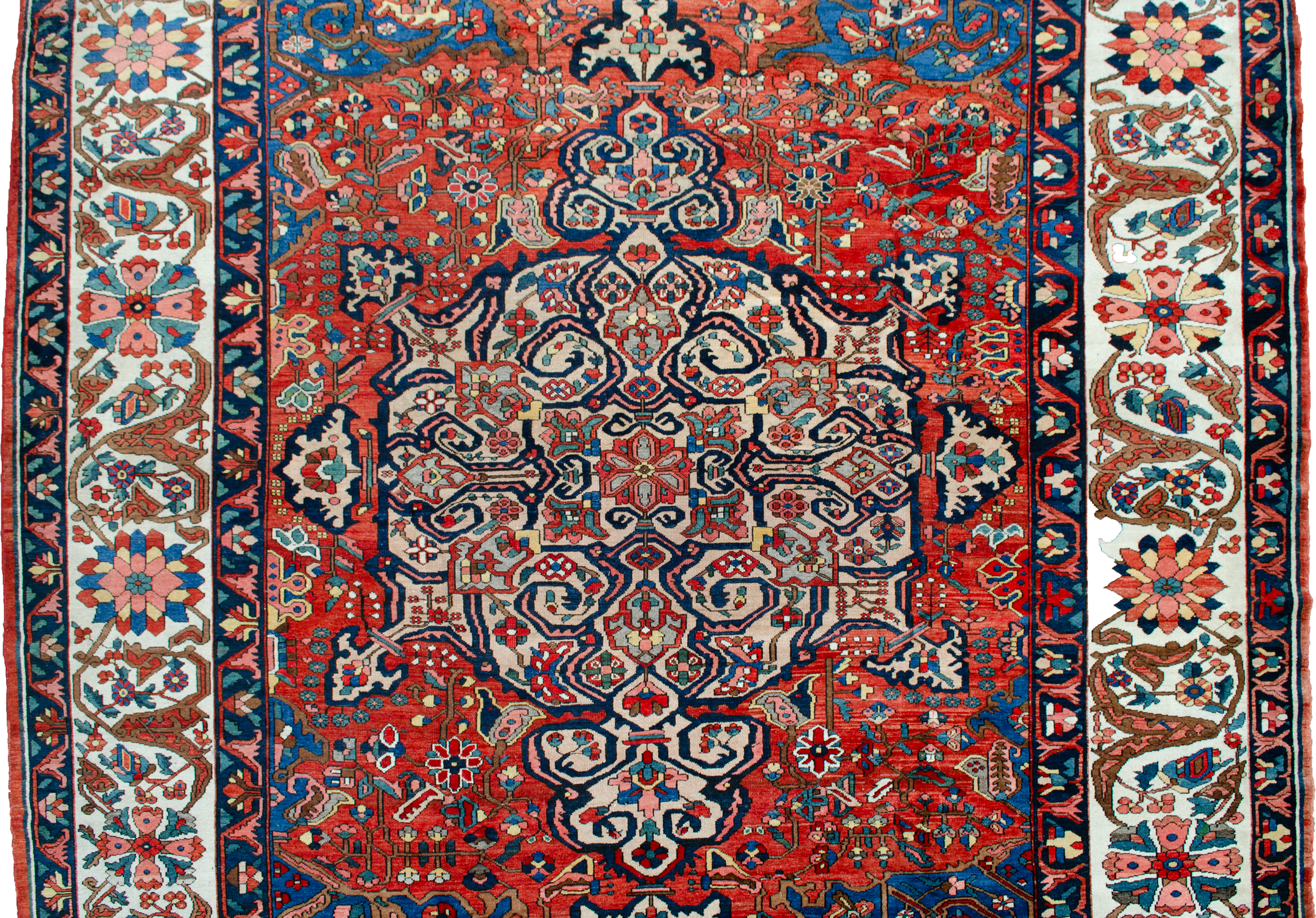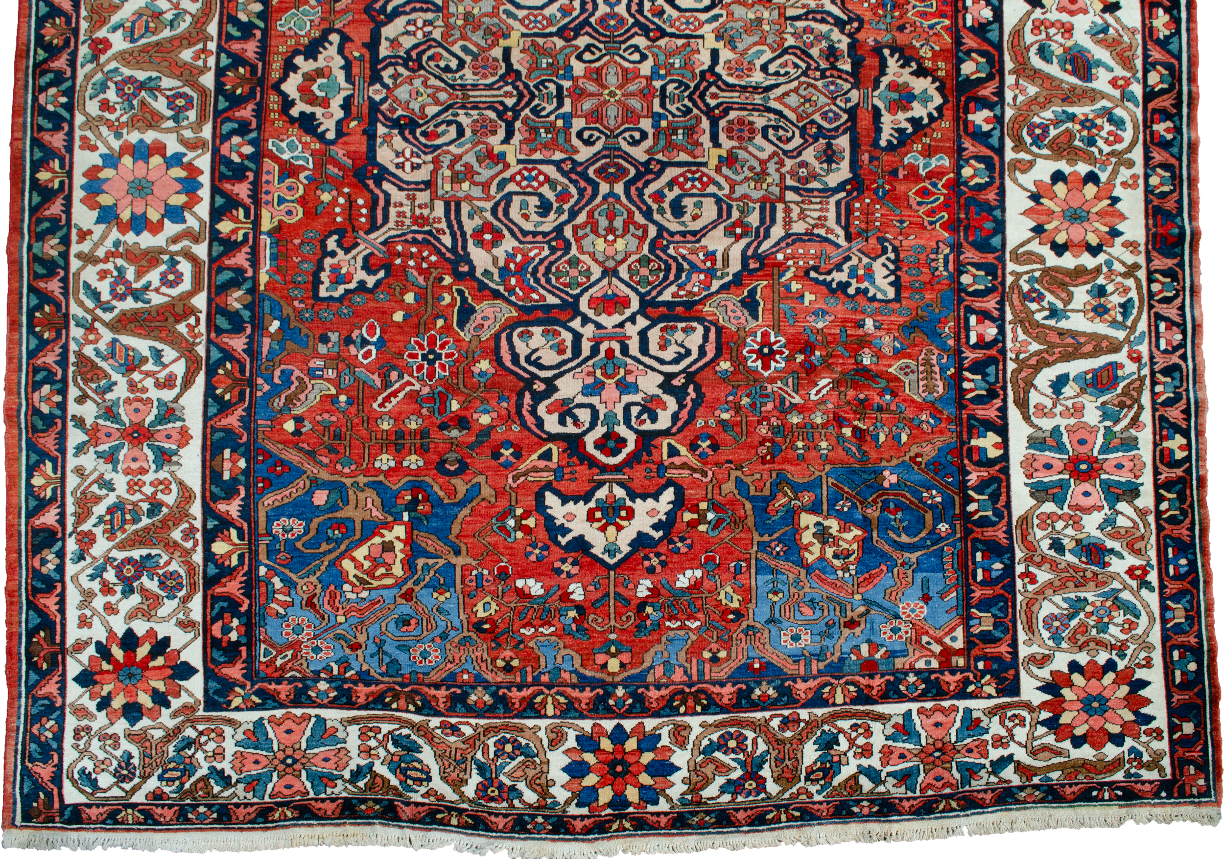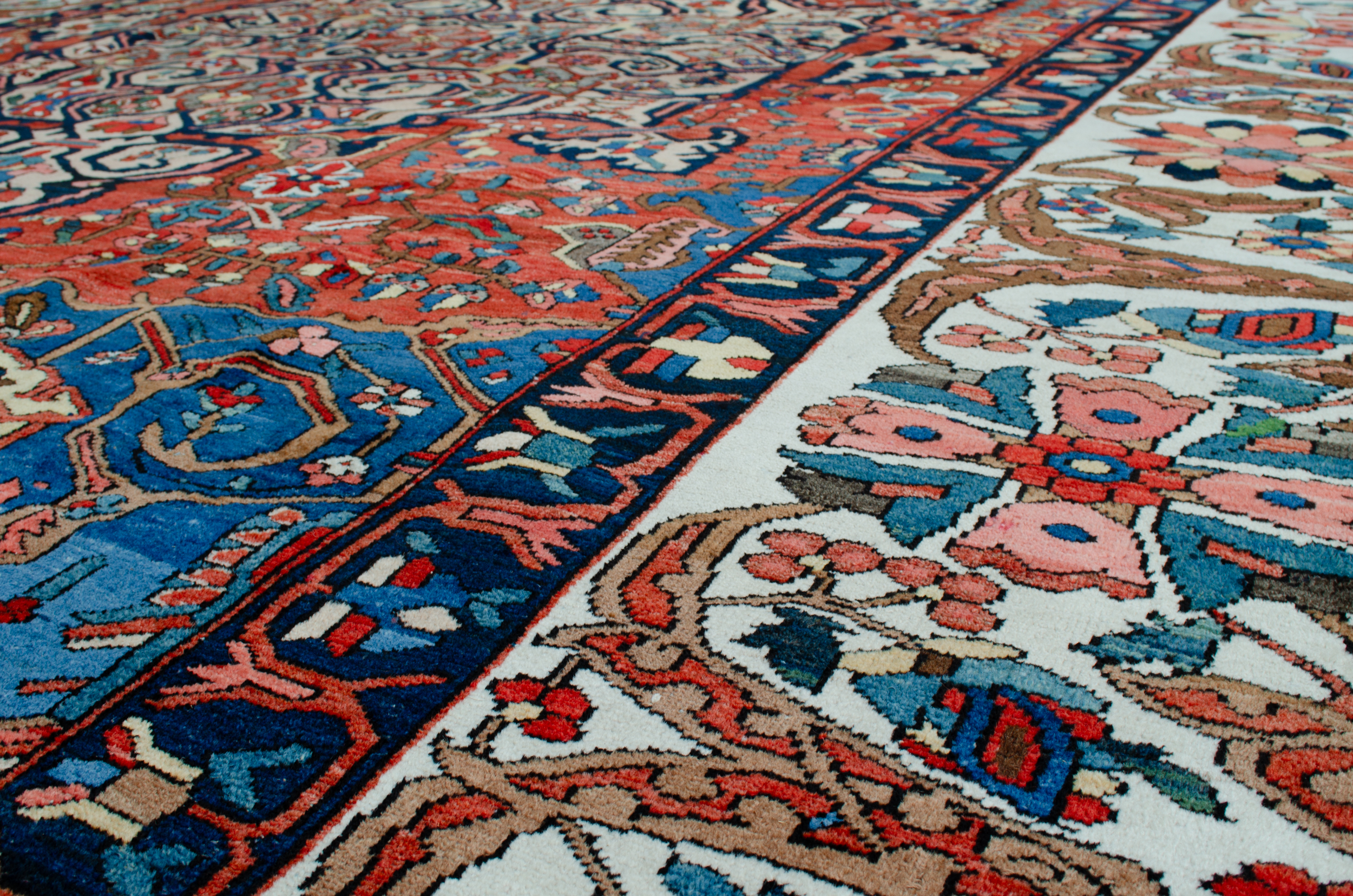 A striking Bakhtiar medallion on a rich terracotta background, coupled with the light blue spandrels, The delicate cream floral border adds a touch of elegance and refinement to the overall aesthetic. The use of natural dyes and handspun wool lends a unique and authentic quality to the carpet that can be appreciated even from afar.