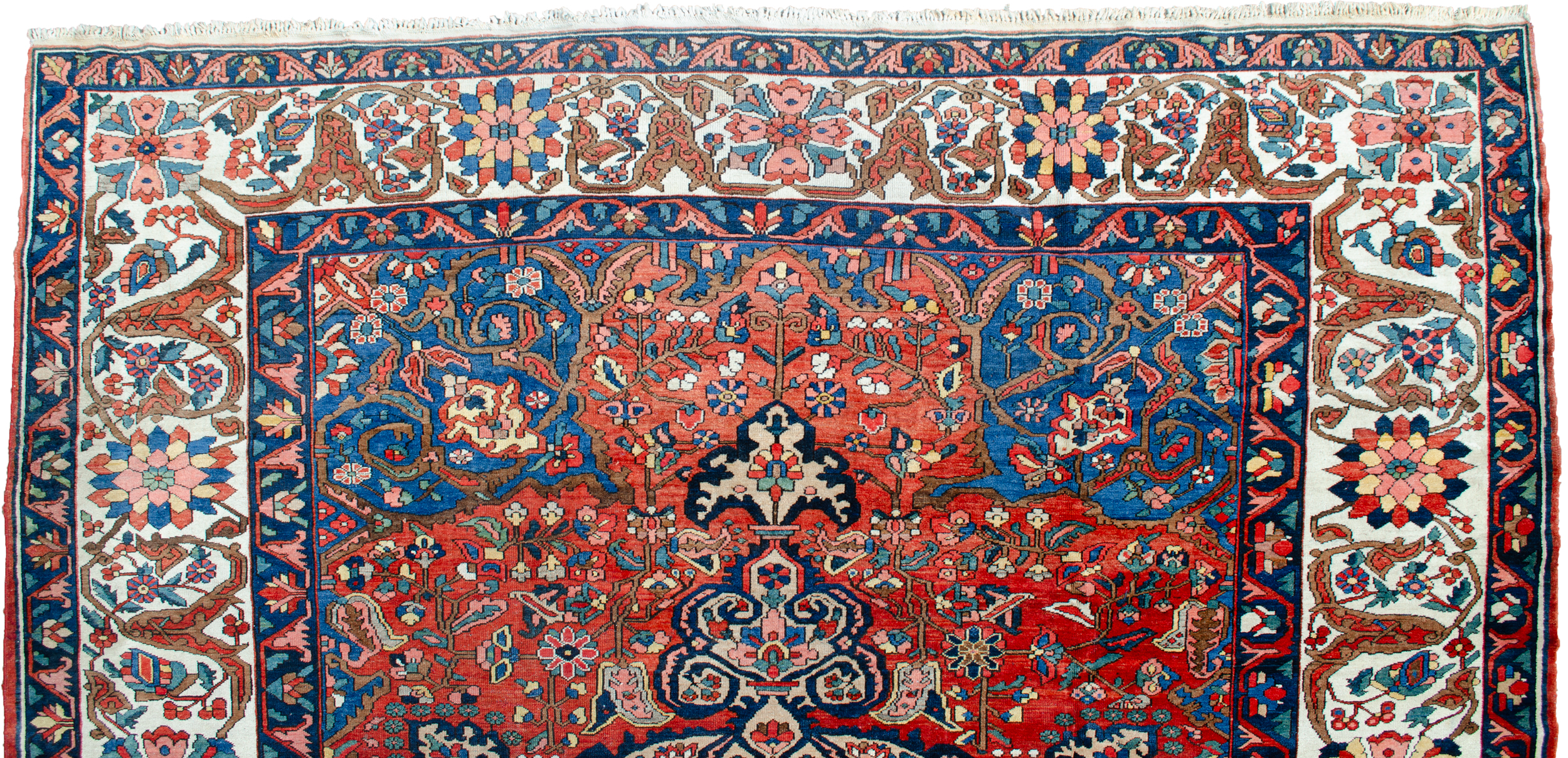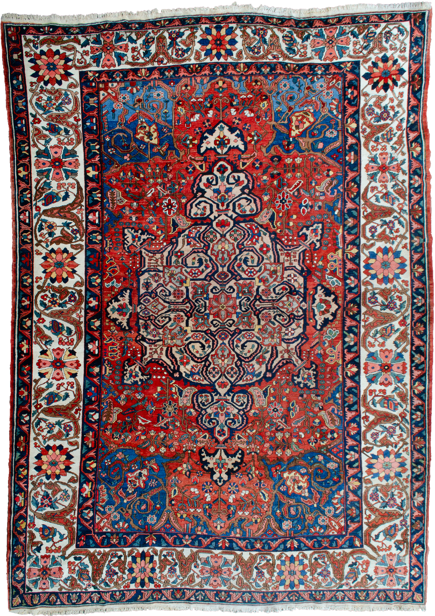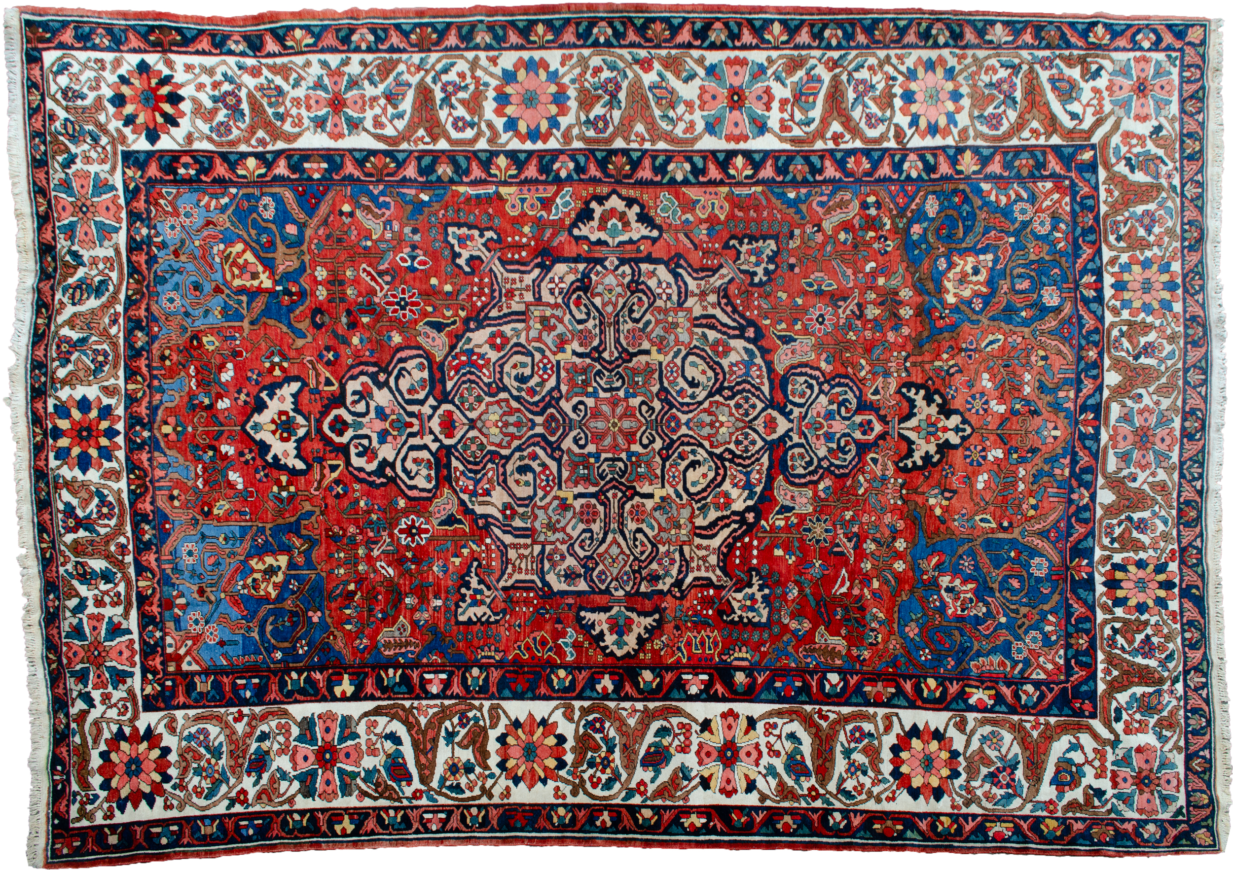 A striking Bakhtiar medallion on a rich terracotta background, coupled with the light blue spandrels, The delicate cream floral border adds a touch of elegance and refinement to the overall aesthetic. The use of natural dyes and handspun wool lends a unique and authentic quality to the carpet that can be appreciated even from afar.