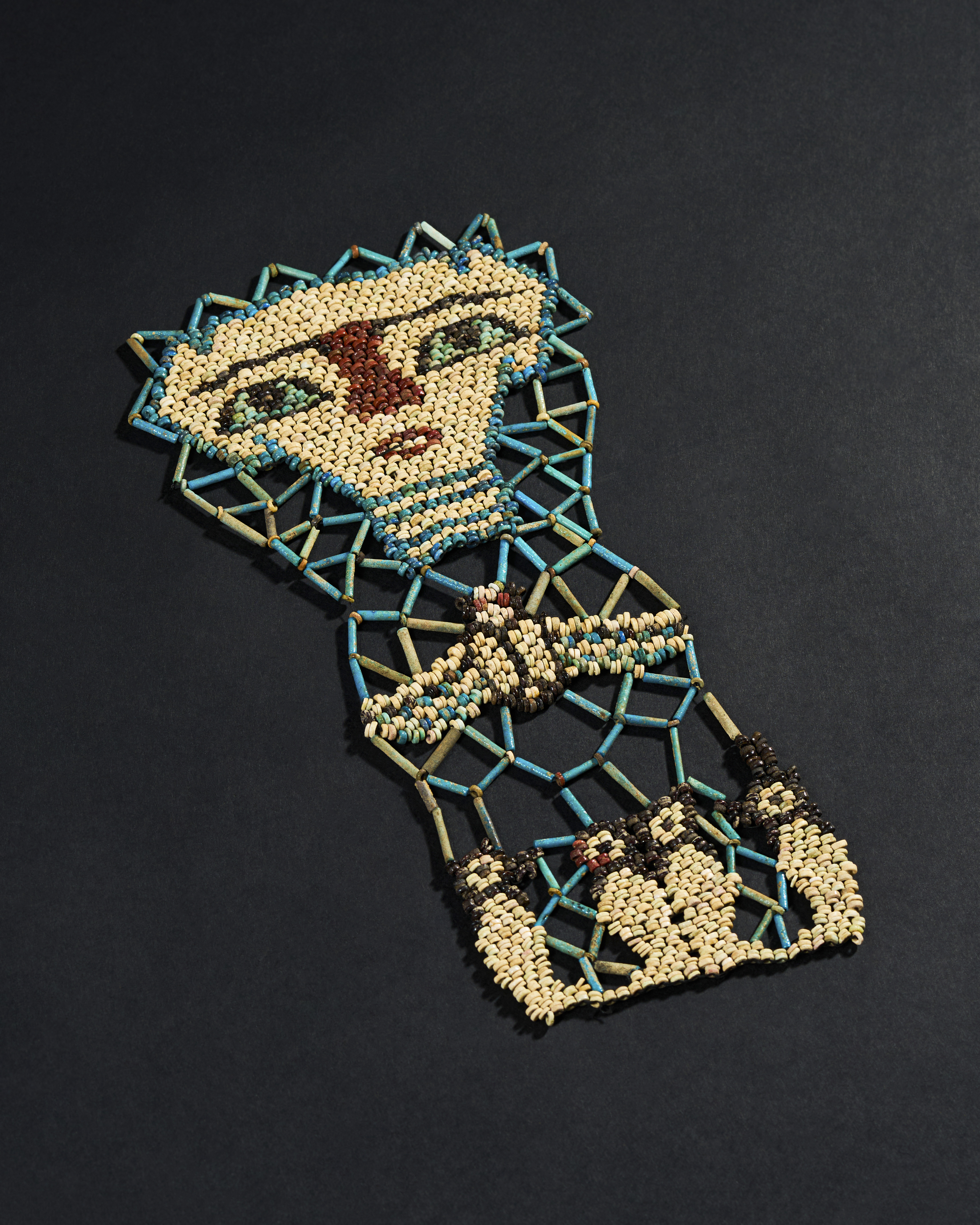 The mask is composed of multicolored faience beads, arranged to form a stylized face with serene, almond-shaped eyes, and a body adorned with sacred symbols. The vibrant colors, including shades of turquoise, ivory, and deep red.