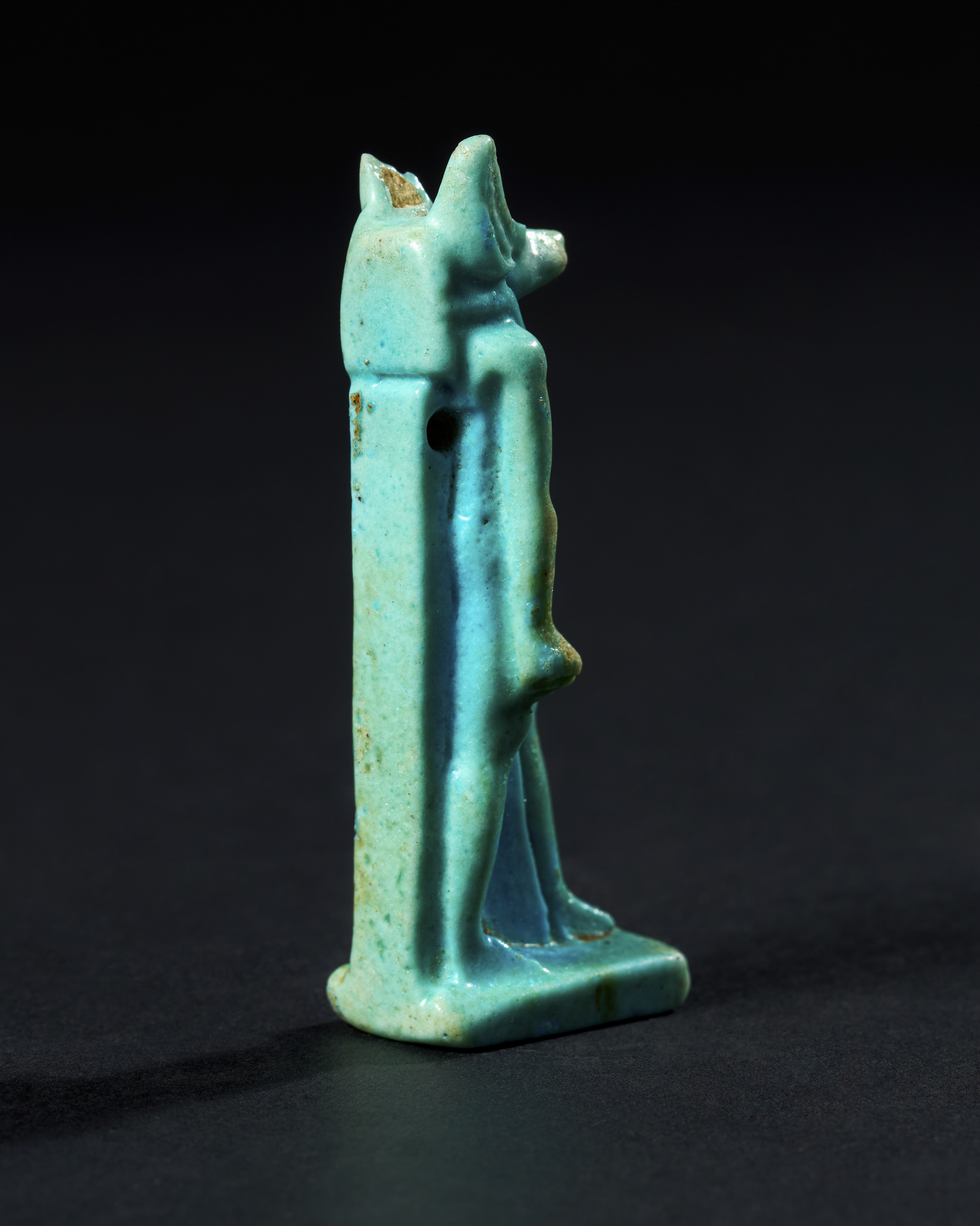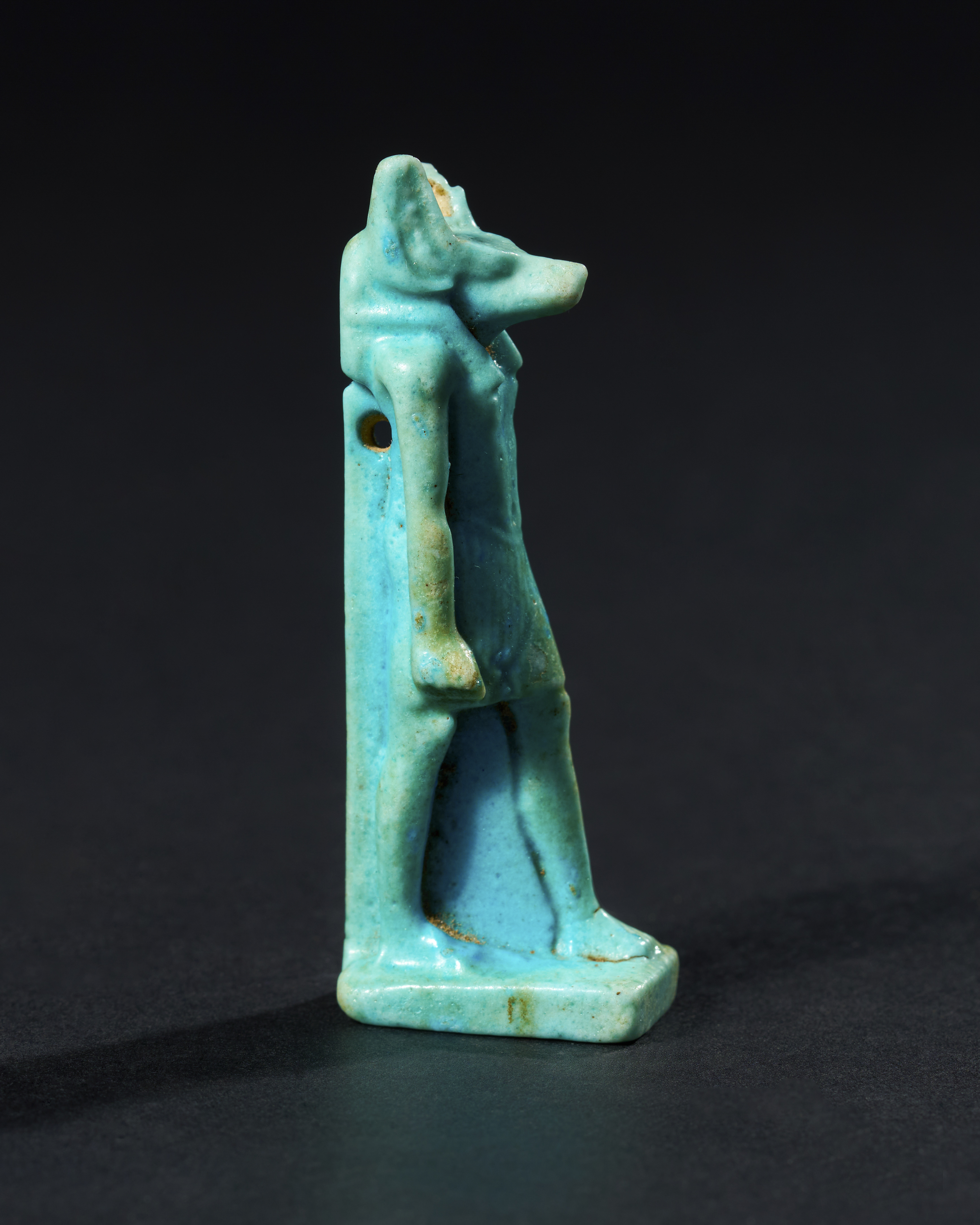 The amulet features a finely detailed figure, with Anubis dressed in traditional garb and standing on a rectangular base. The loop at the back suggests that it was likely worn as a pendant, serving both as a protective talisman and a symbol of the wearer’s devotion to the god.