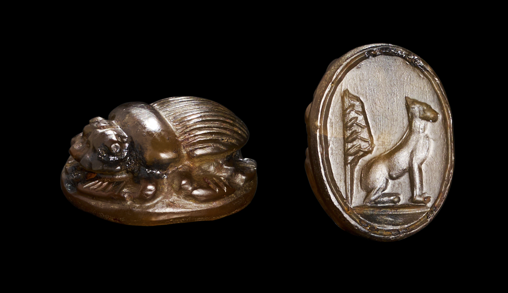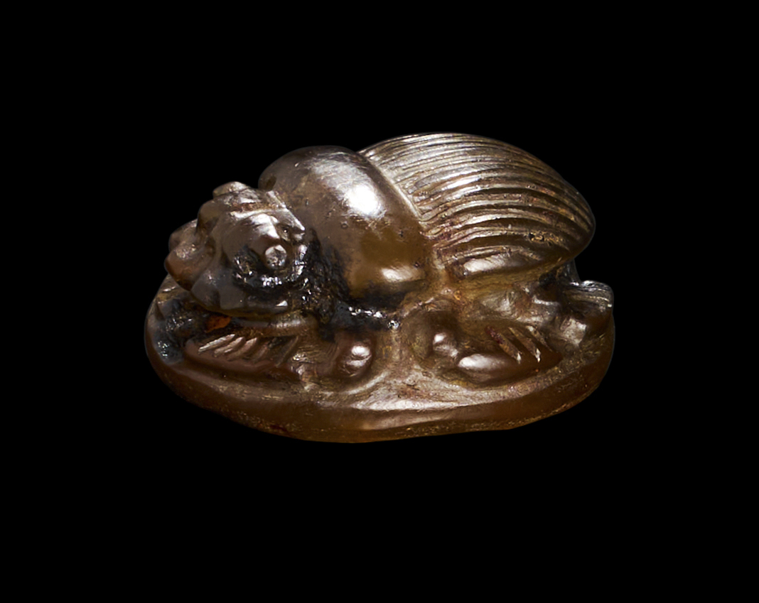 AN EGYPTIAN AGATE SCARAB WITH A SEATED CAT, MIDDLE KINGDOM