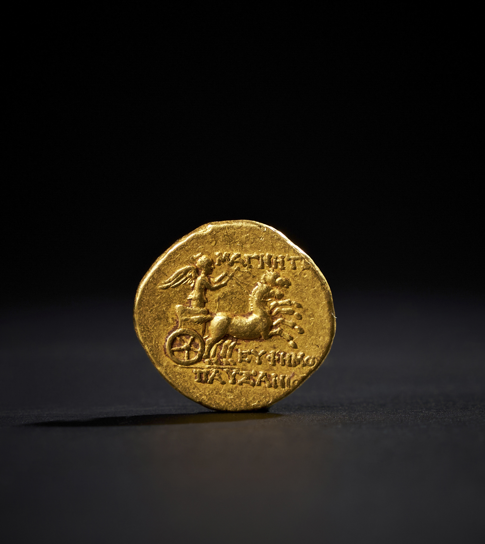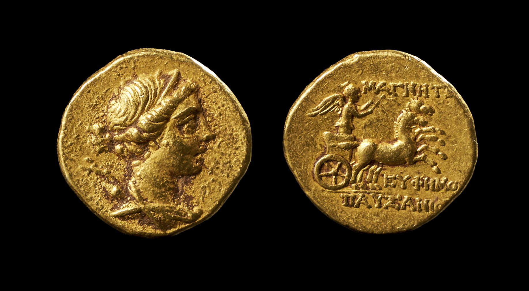 Ancient Greek Gold Stater originates from Magnesia ad Maeandrum, a prominent Ionian city. Struck during the Classical period, this coin is dedicated to the distinguished magistrate Euphemos, son of Pausanias. The obverse side of the coin presents a finely detailed portrait of a goddess, likely Artemis, adorned with a laurel wreath. The reverse depicts the Winged Victory (Nike) standing triumphantly in a chariot, with horses in motion.