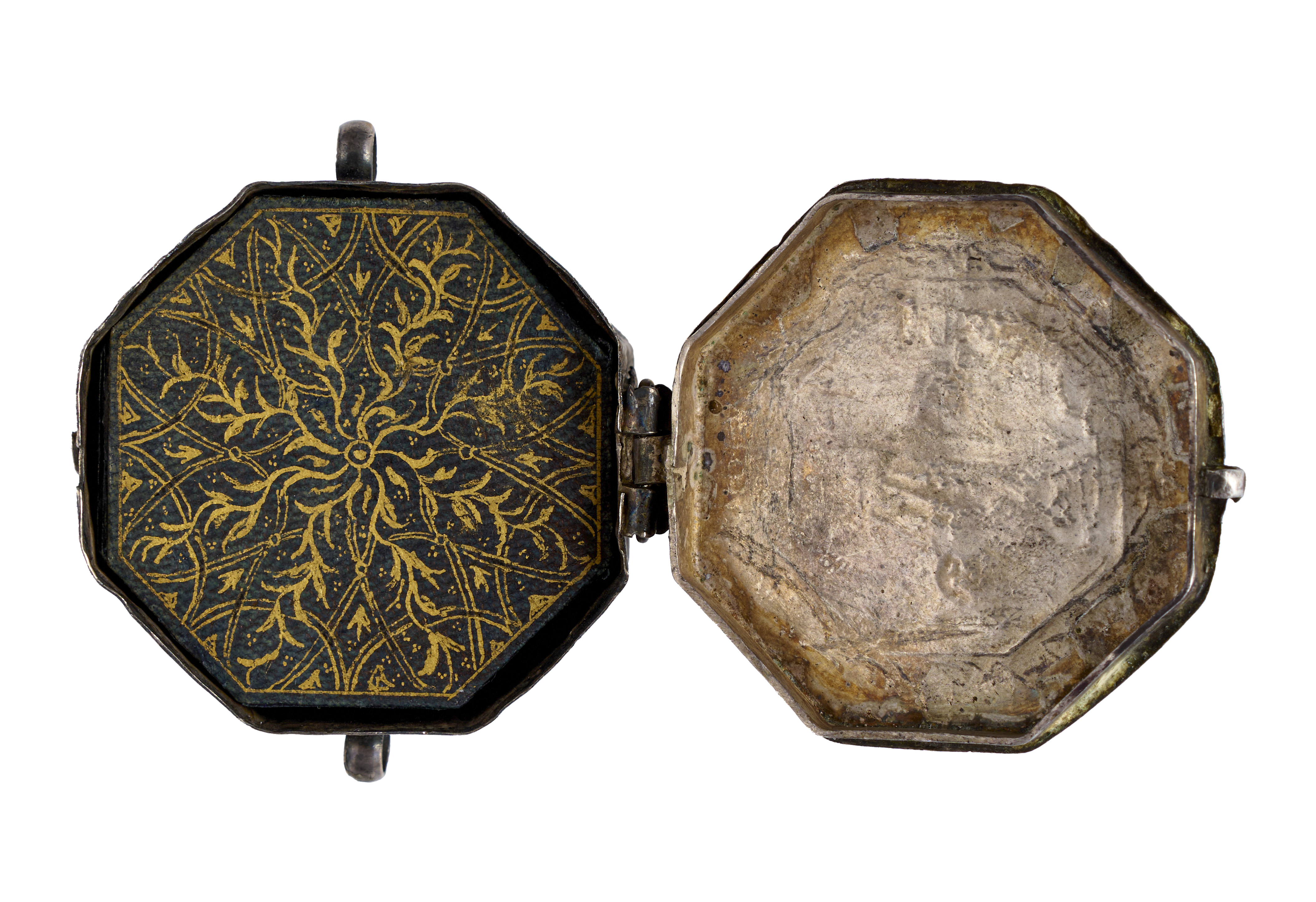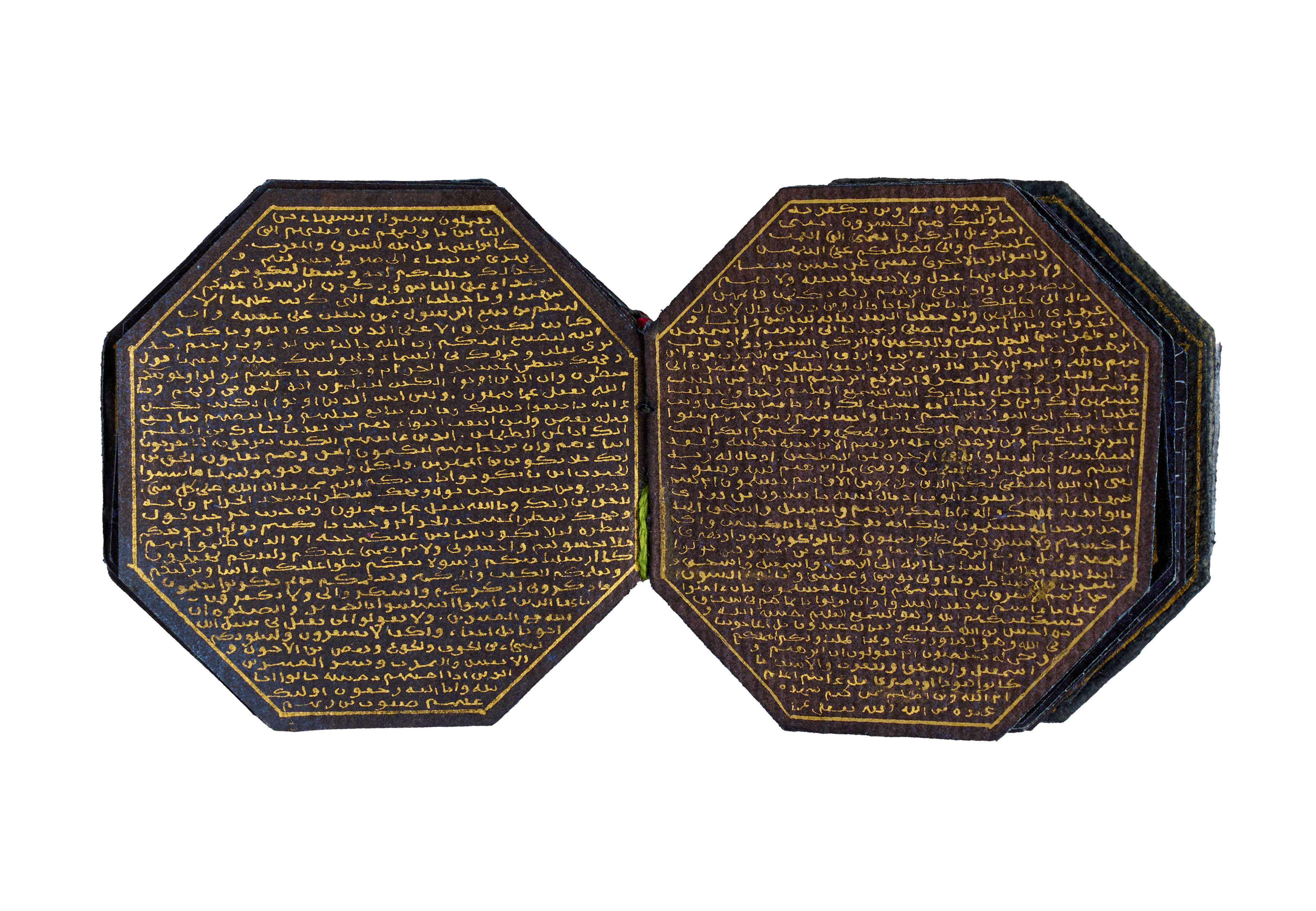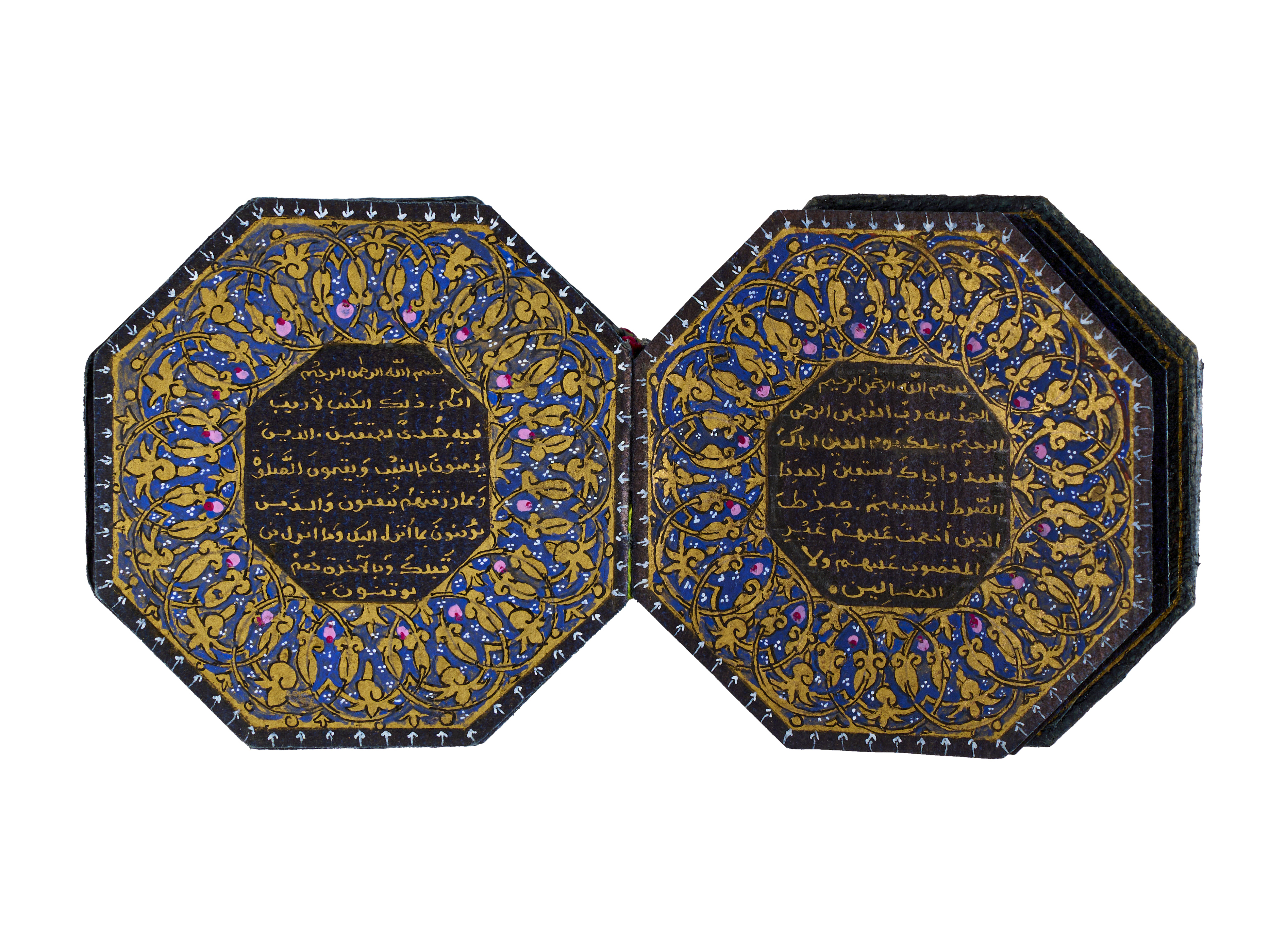 A finely crafted hexagonal miniature Ottoman Quran, featuring Kufic script meticulously written on rich blue paper. This exquisite manuscript is enclosed within a beautifully adorned silver case, decorated with intricate designs and inscriptions.