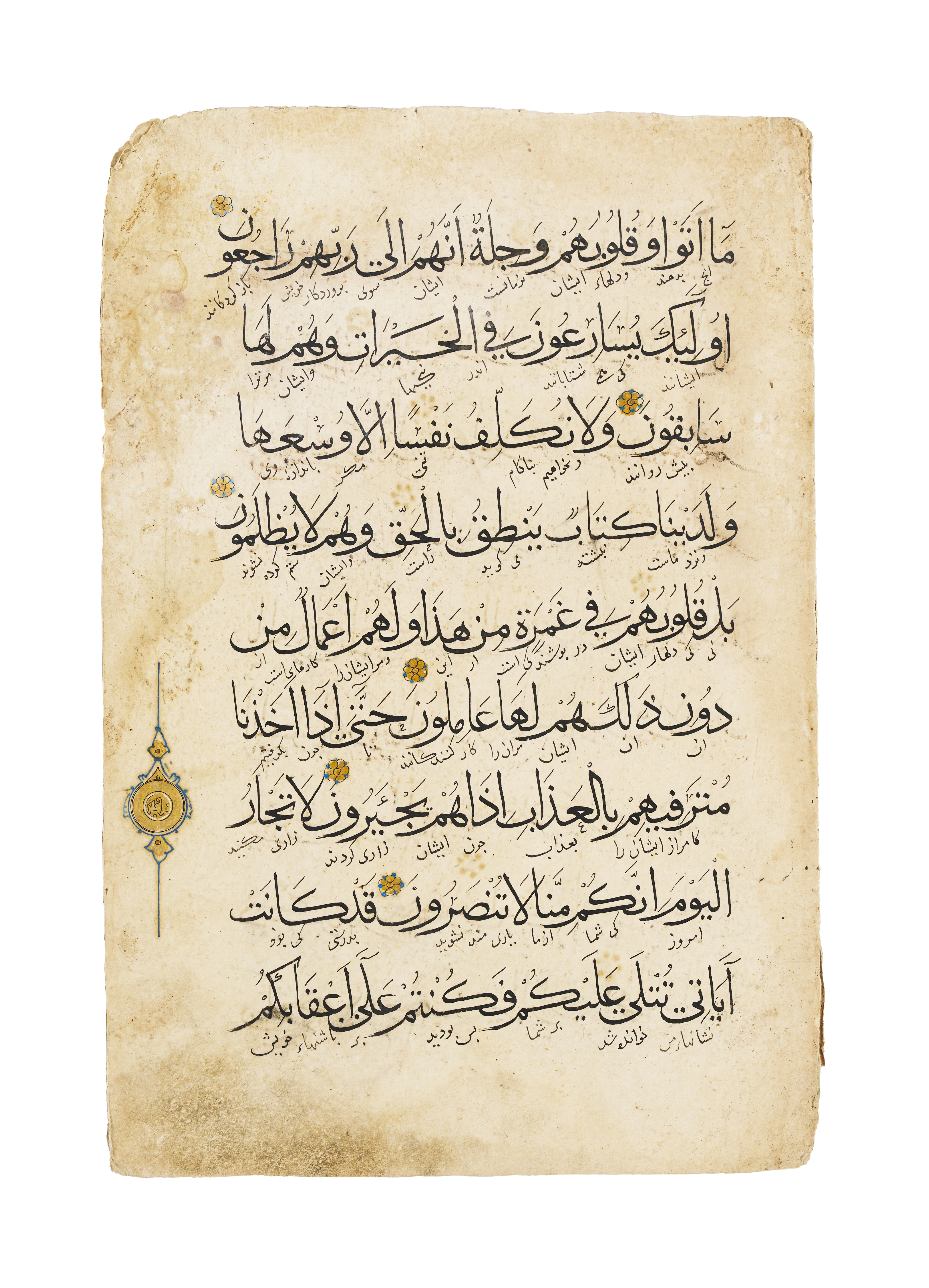 A pair of large Quran leaves from the Ilkhanid period, showcasing the refined Islamic calligraphy of the 14th century. The elegant Arabic script is meticulously written, highlighted by ornamental gold decorations.