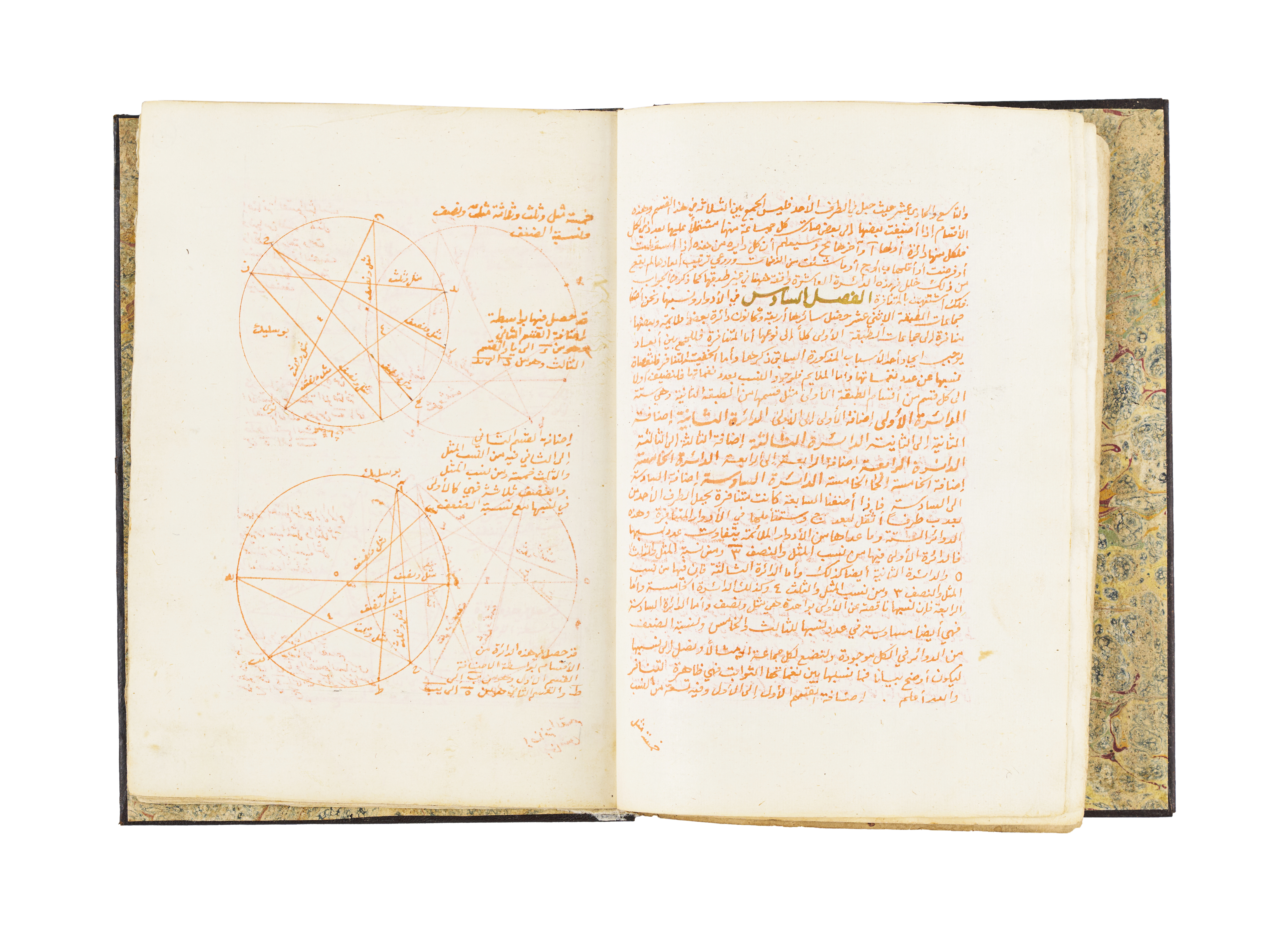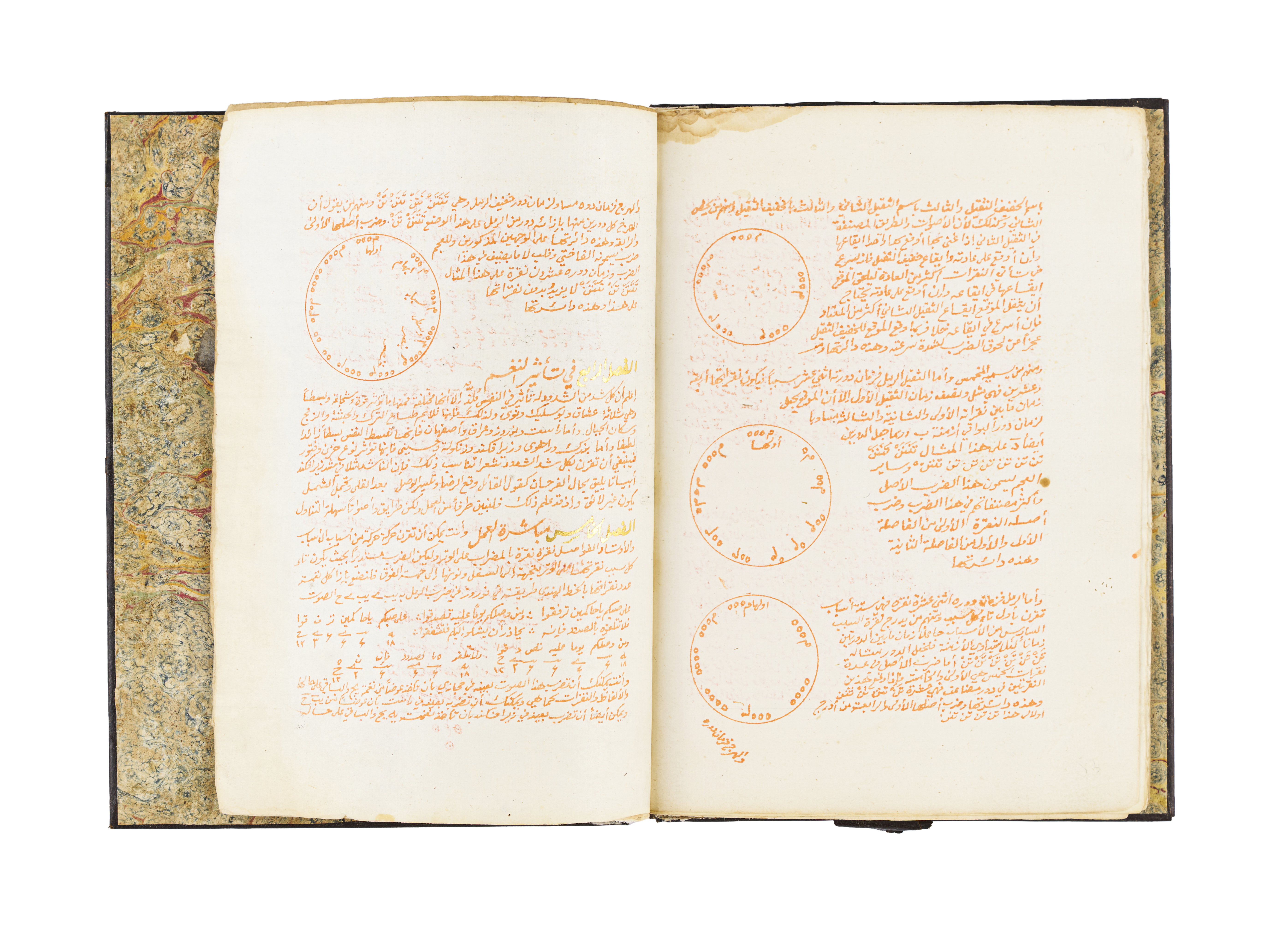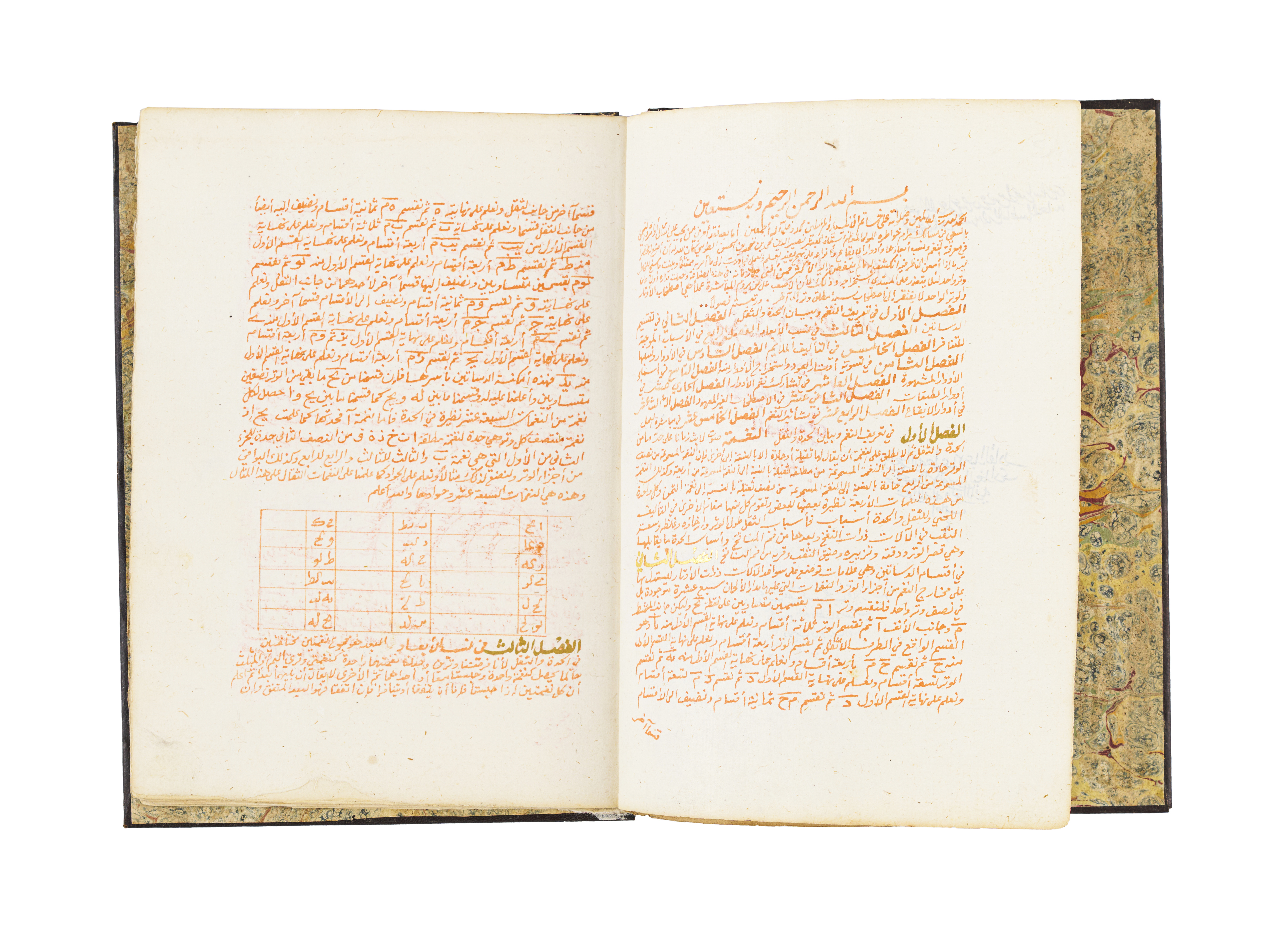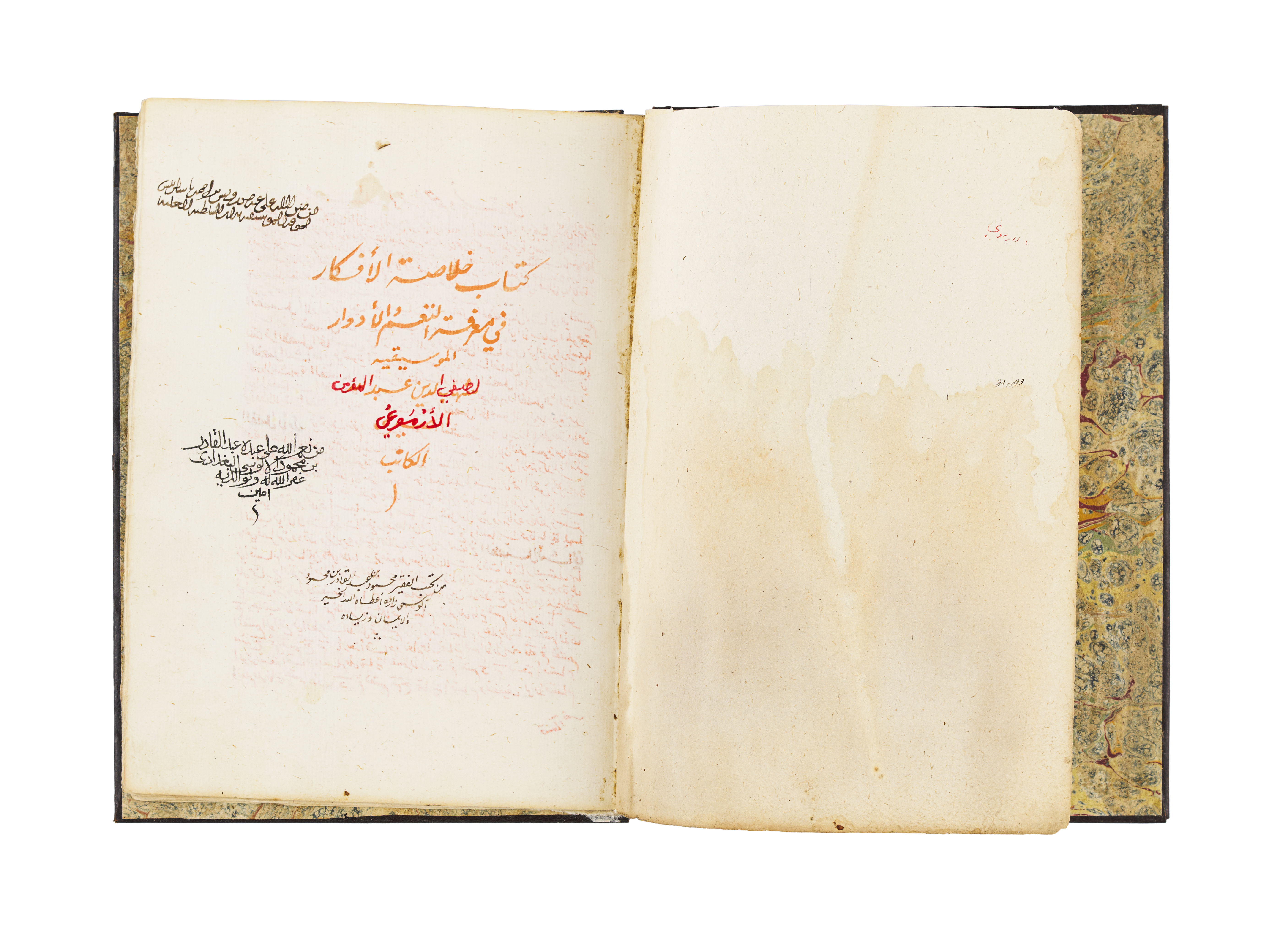 An exceptional 18th-century manuscript, Kitab Khulast Alafkar Fe Maraft Alnagham, exploring the intricate art of musical scales. This remarkable work, dated AH 1201 / 1786 AD, is uniquely written in saffron water.
