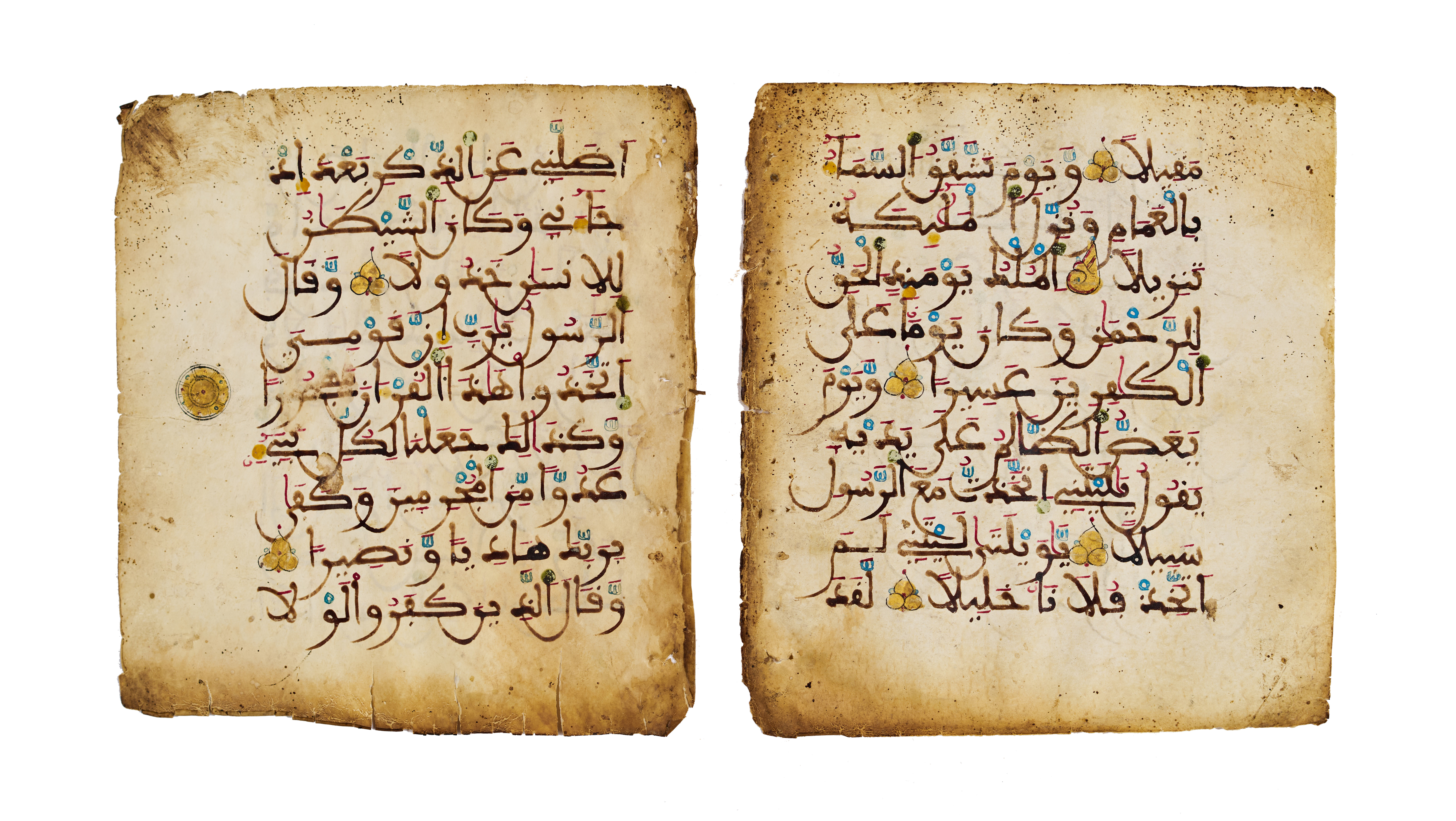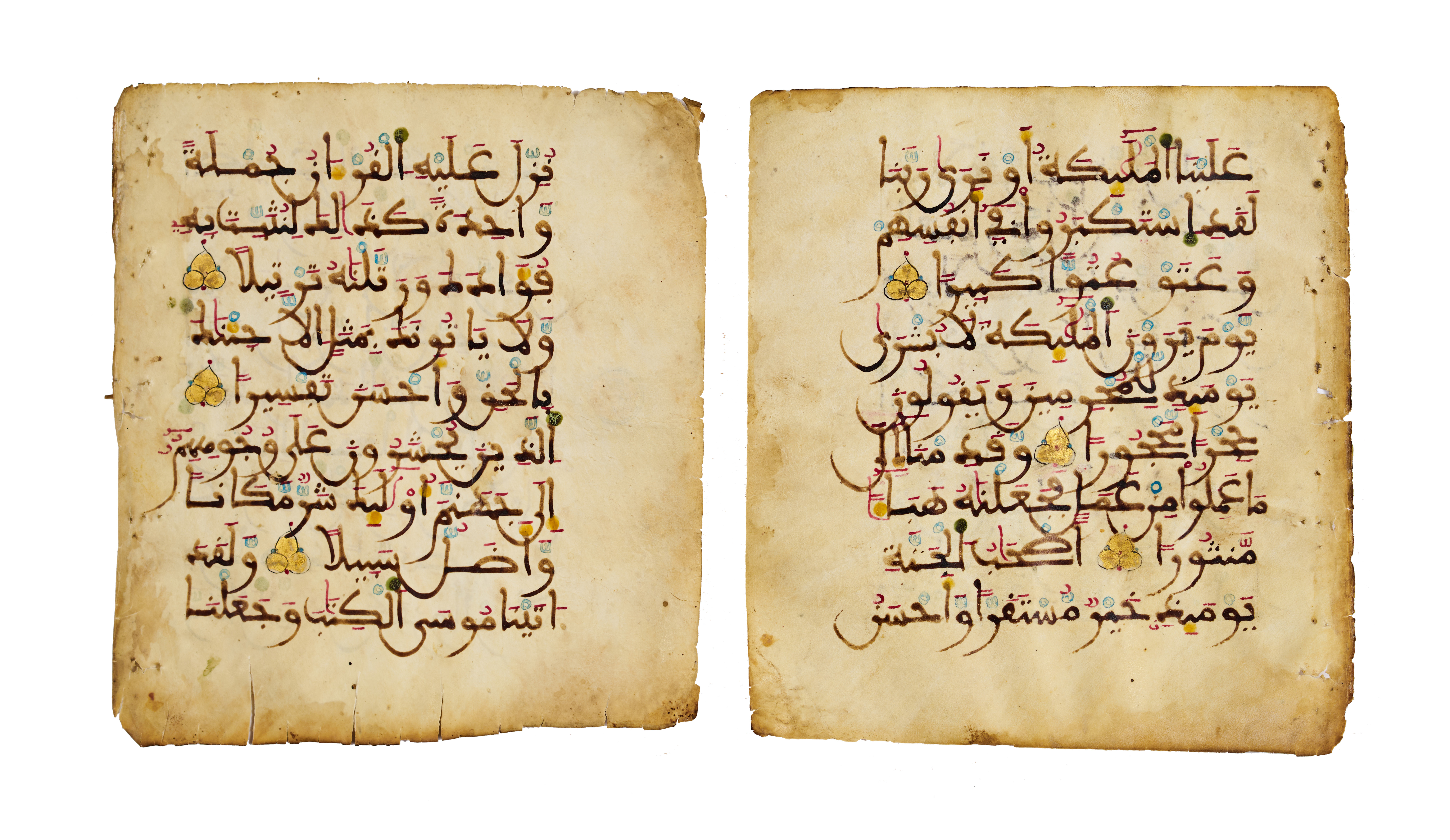 The script is large, bold Maghribi, written in a rich dark brown ink, with sweeping curves and distinctive, angular. Diacritical marks (vowelization) are meticulously added in vivid red, green, blue, and yellow inks, providing both phonetic guidance and visual rhythm across the lines.