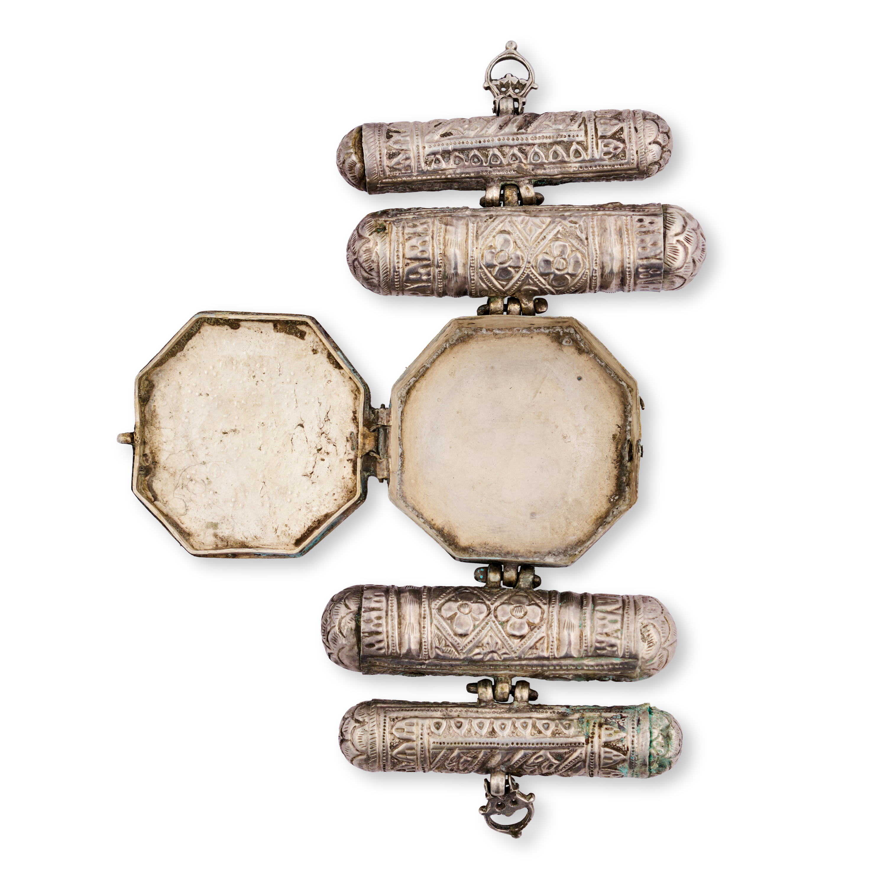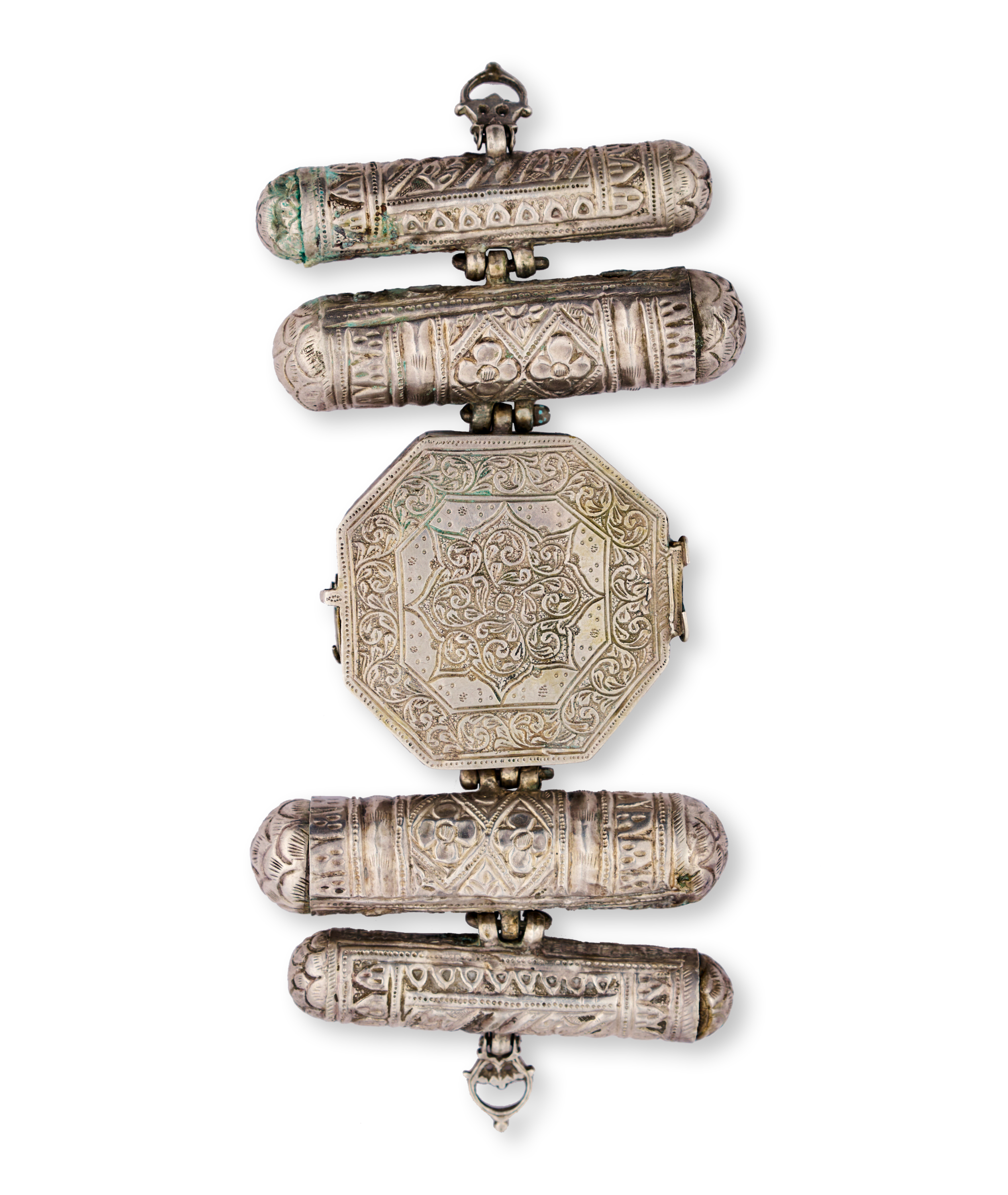 Comprises a central octagonal locket-style Quran case flanked by four tubular amulet holders, each intricately decorated with chased floral and geometric motifs. The hinged central compartment opens to reveal a hollow interior, likely intended to house a miniature Quran or sacred text. Fitted with loops at both ends for suspension.