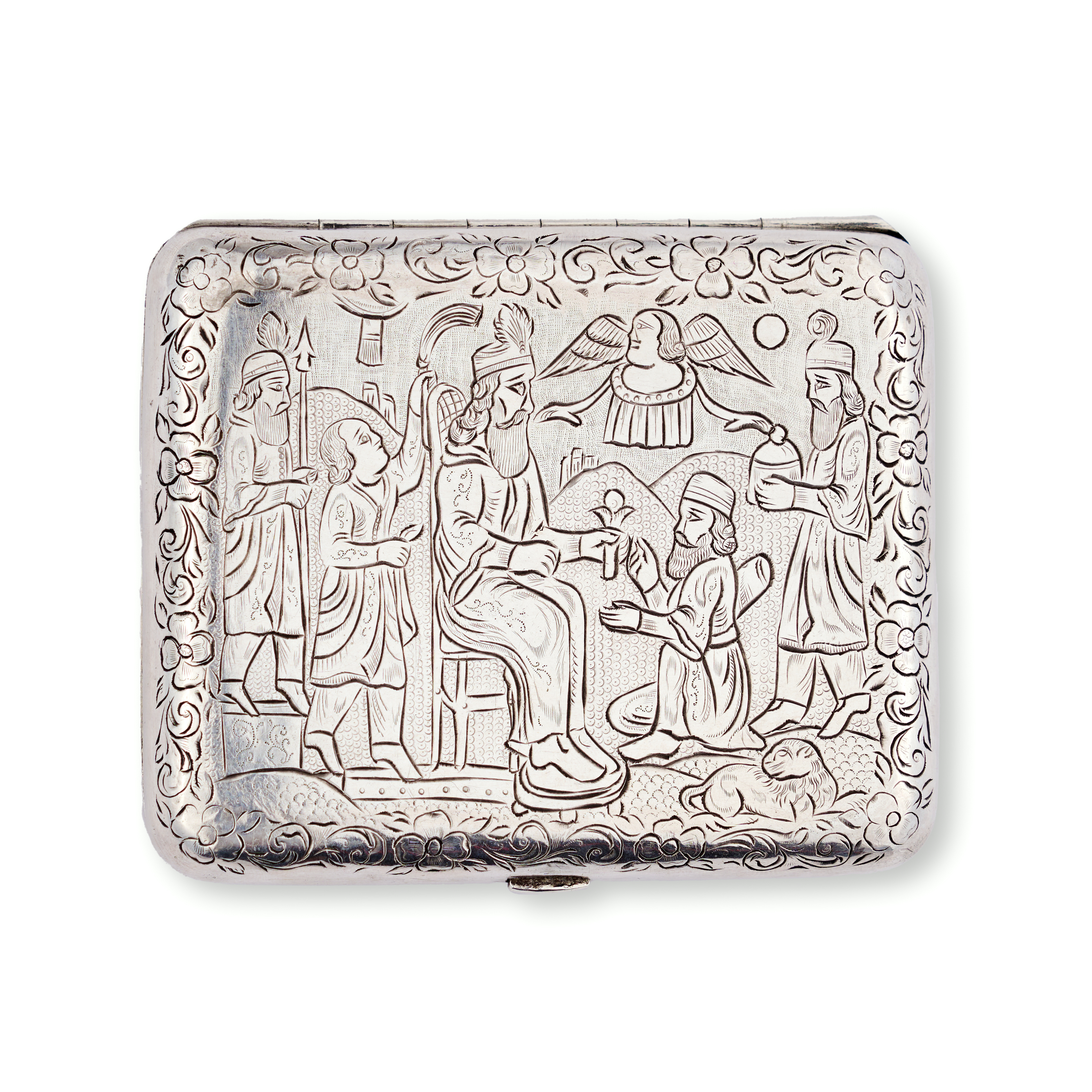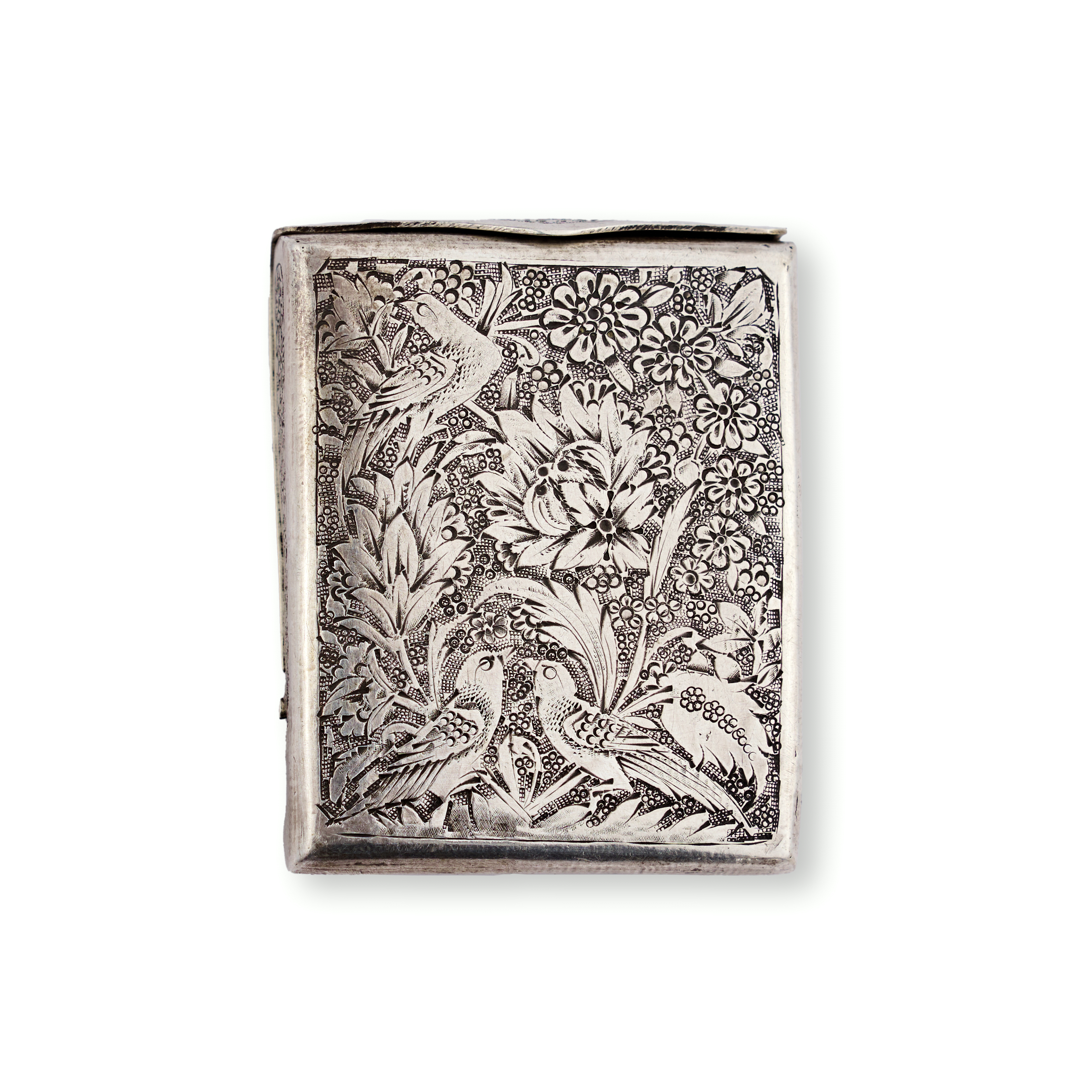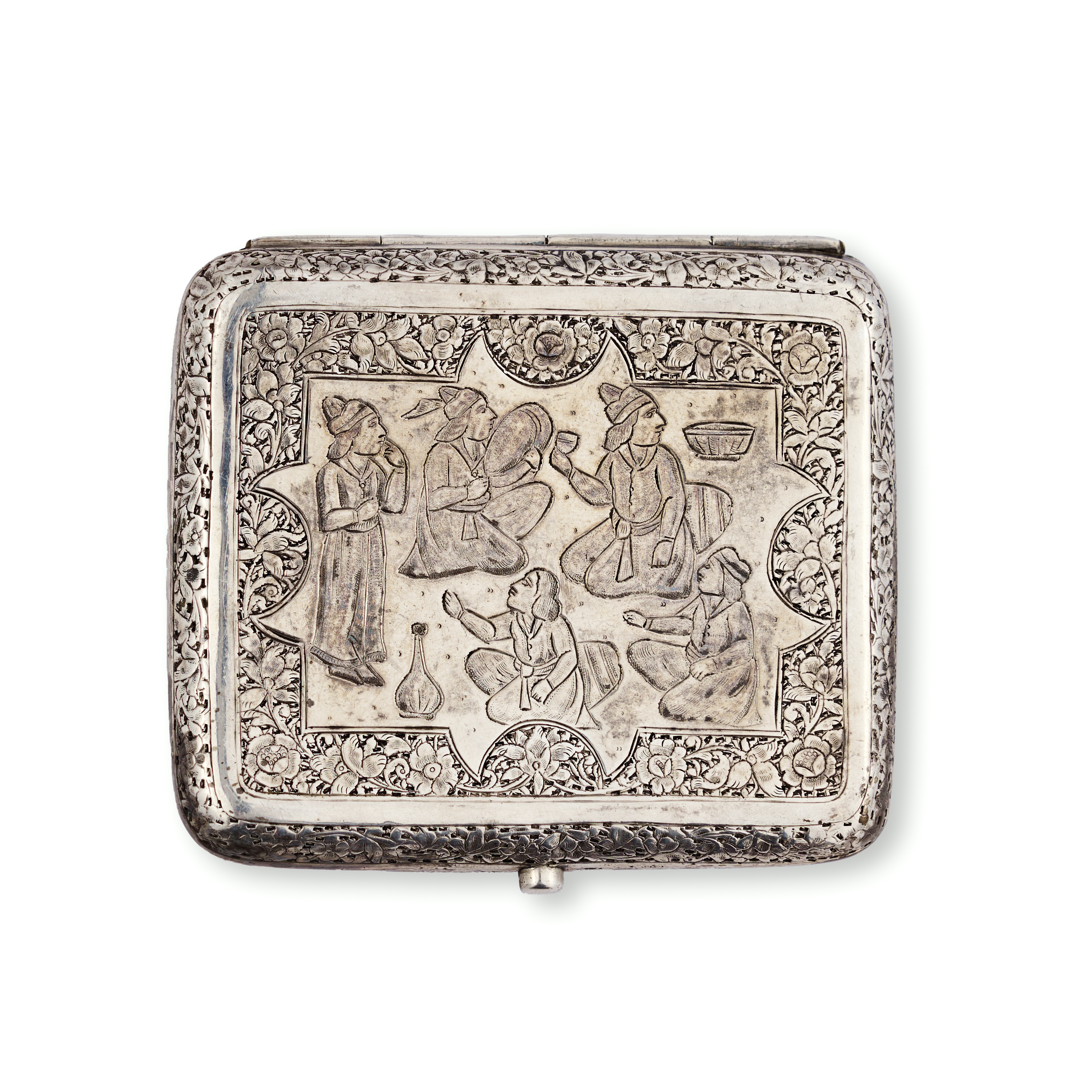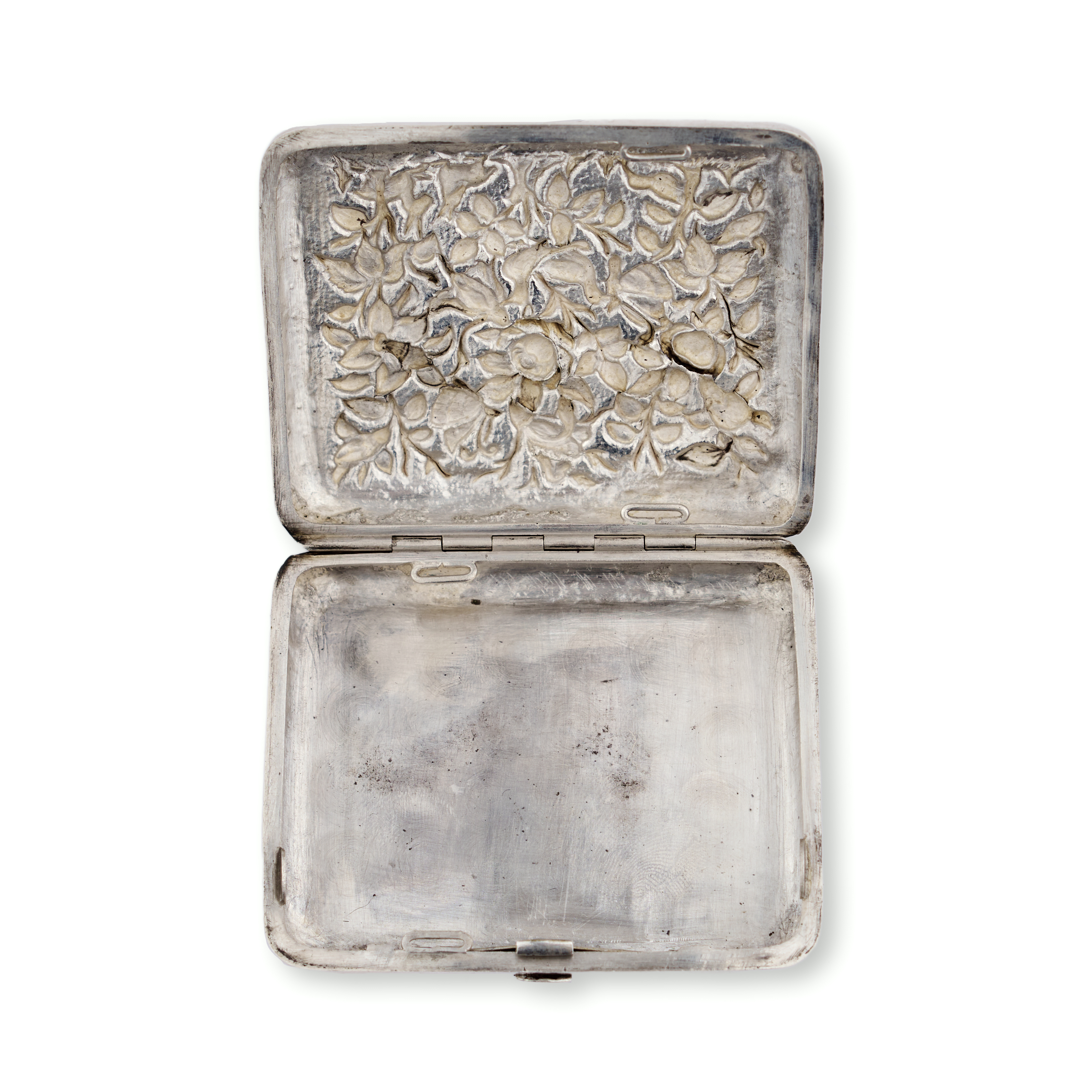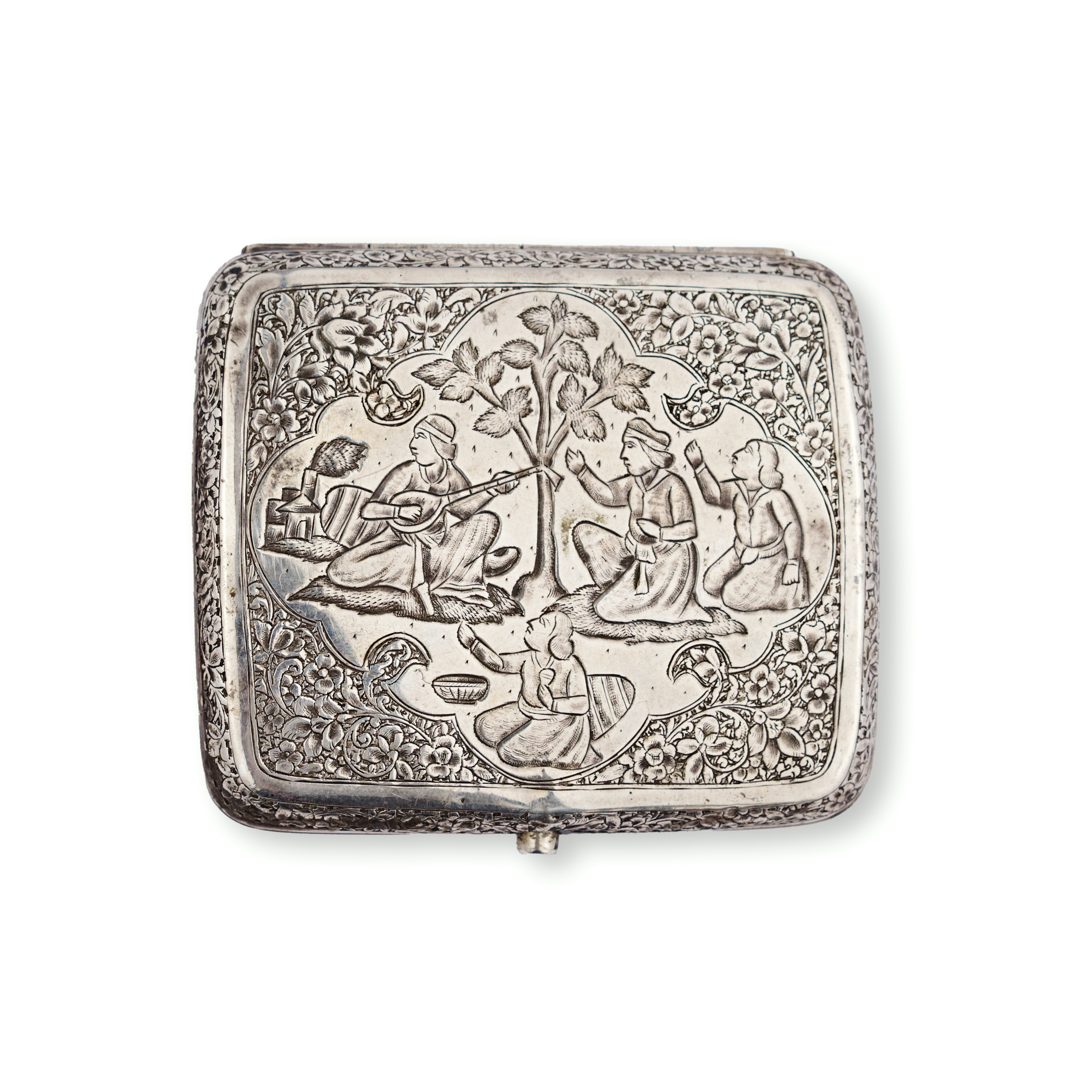 A refined group comprising three rectangular silver tobacco boxes and a single silver match holder. Each piece is adorned with intricate repoussé and chased decoration—ranging from dense floral and foliate motifs to figural scenes in garden settings, One tobacco box features a finely rendered pastoral scene of seated figures engaged in music and conversation beneath a tree, while others exhibit lush botanical patterns and delicate arabesques. The match holder bears a more compact design with a central cartouche surrounded by scrolling vegetation.