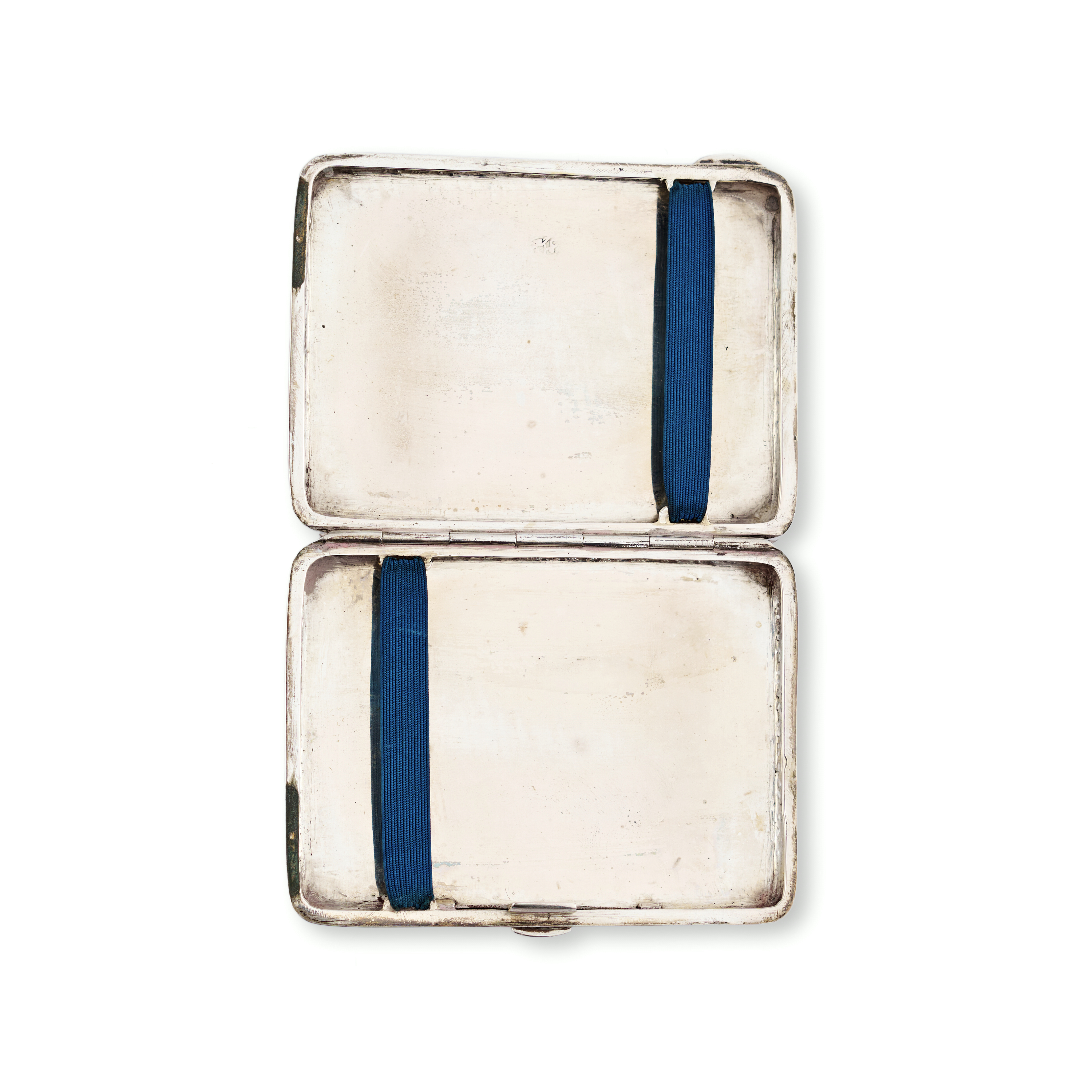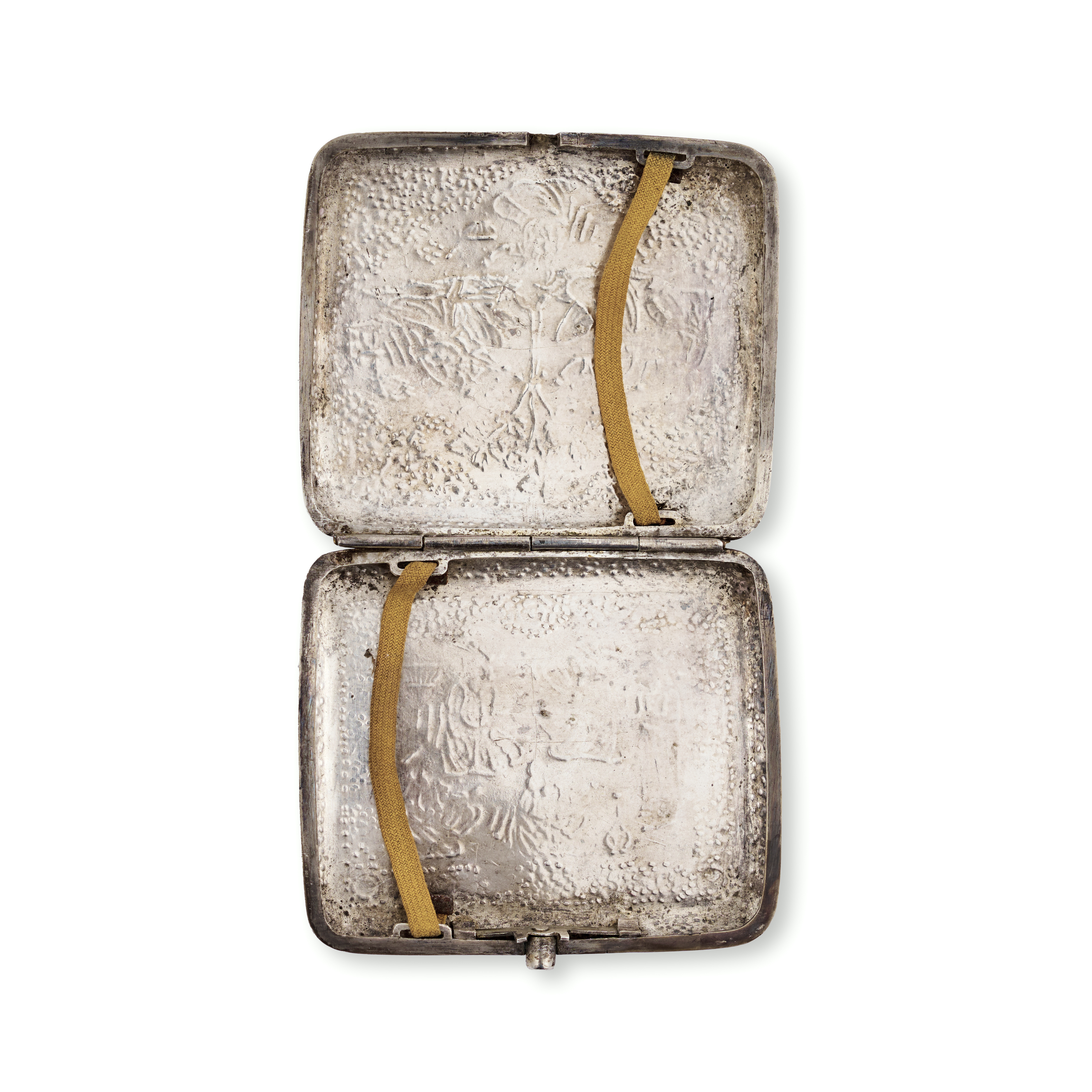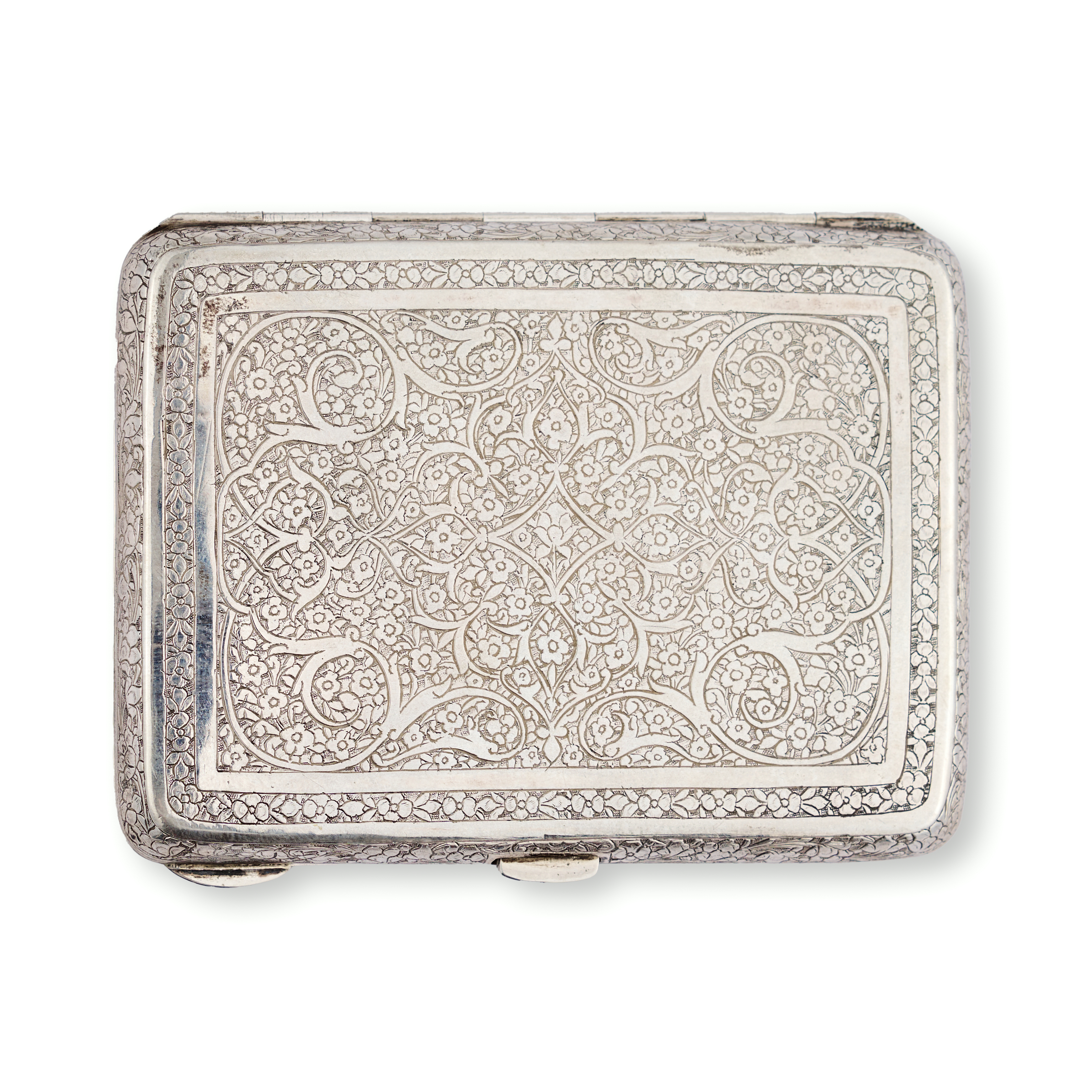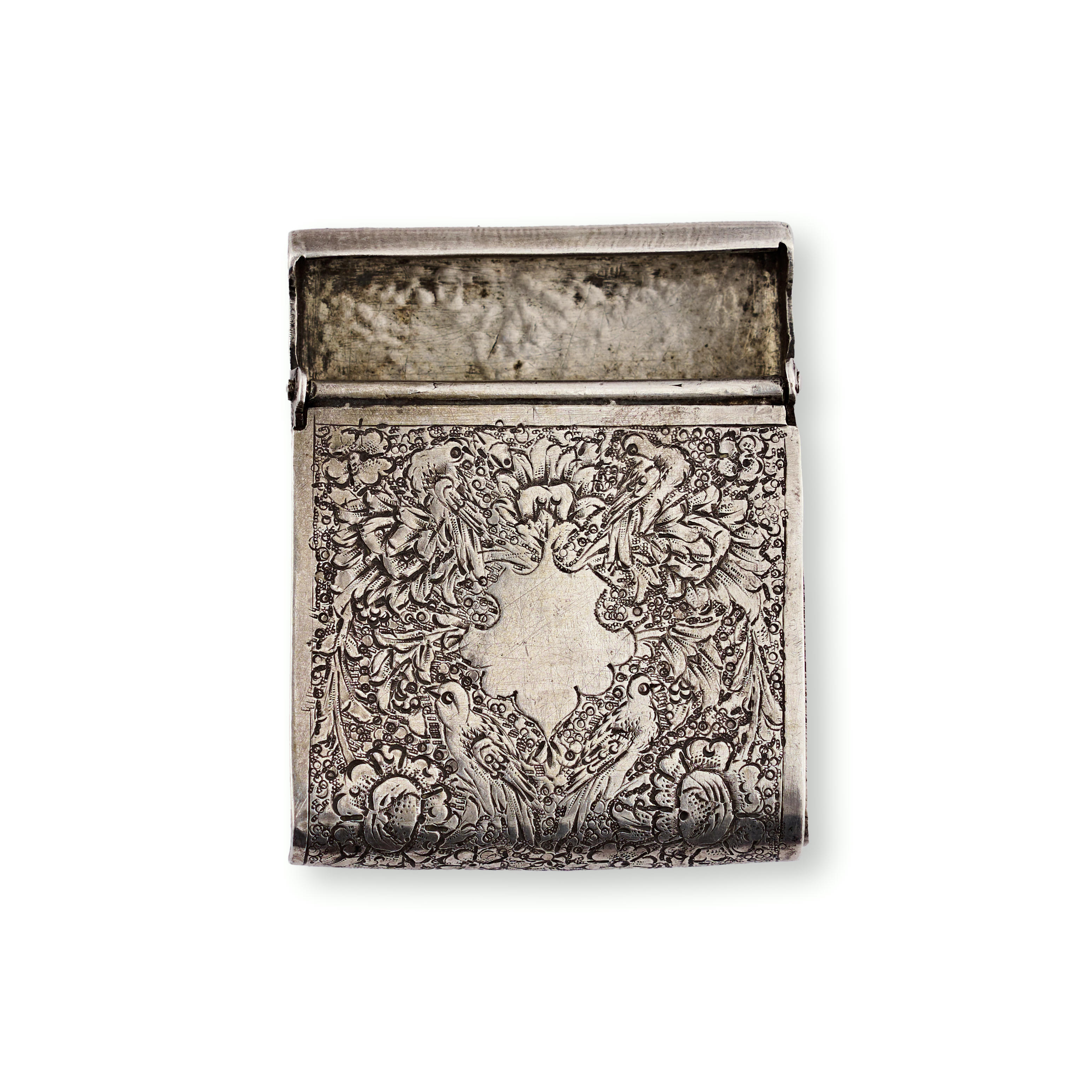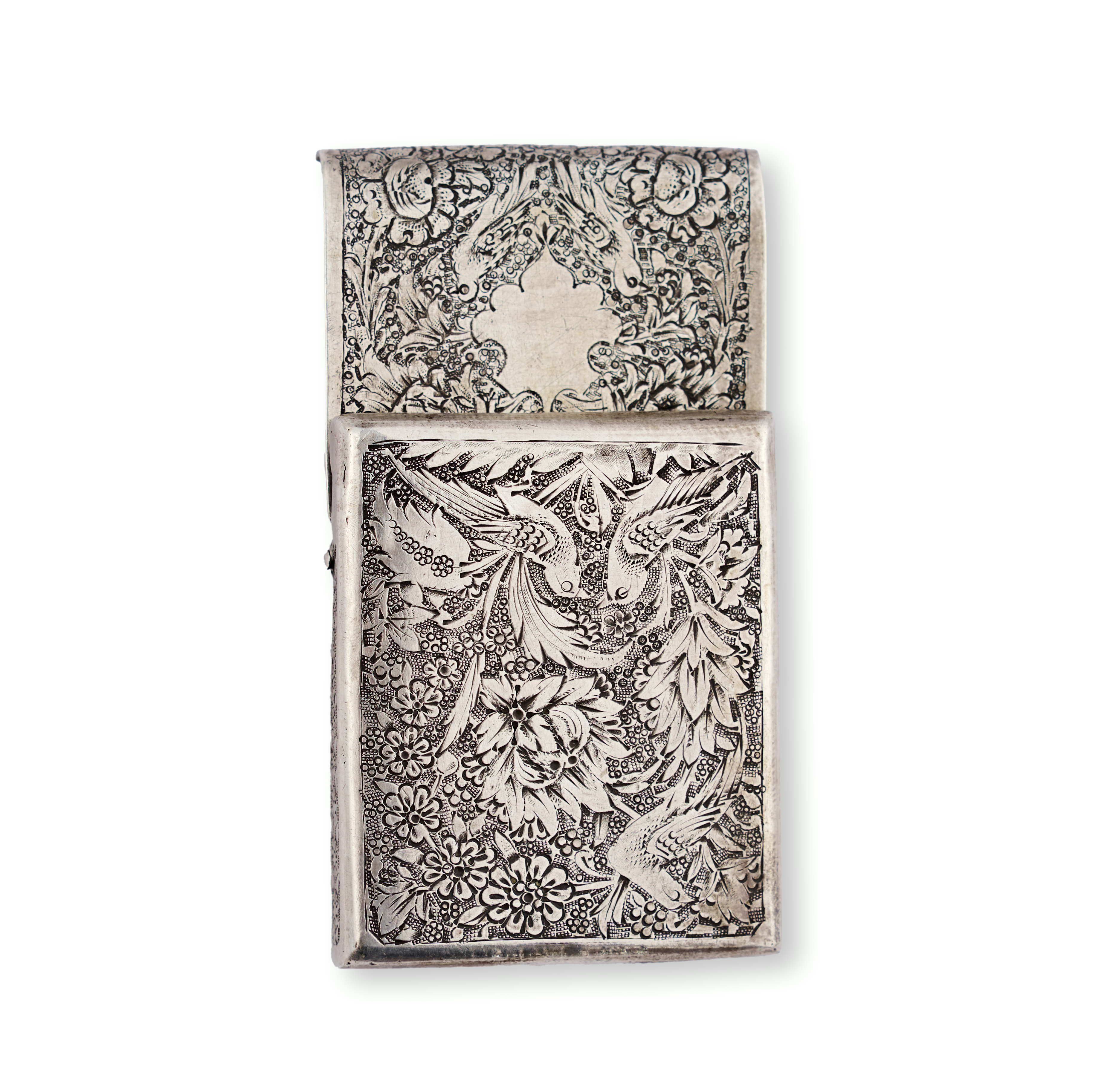A refined group comprising three rectangular silver tobacco boxes and a single silver match holder. Each piece is adorned with intricate repoussé and chased decoration—ranging from dense floral and foliate motifs to figural scenes in garden settings, One tobacco box features a finely rendered pastoral scene of seated figures engaged in music and conversation beneath a tree, while others exhibit lush botanical patterns and delicate arabesques. The match holder bears a more compact design with a central cartouche surrounded by scrolling vegetation.