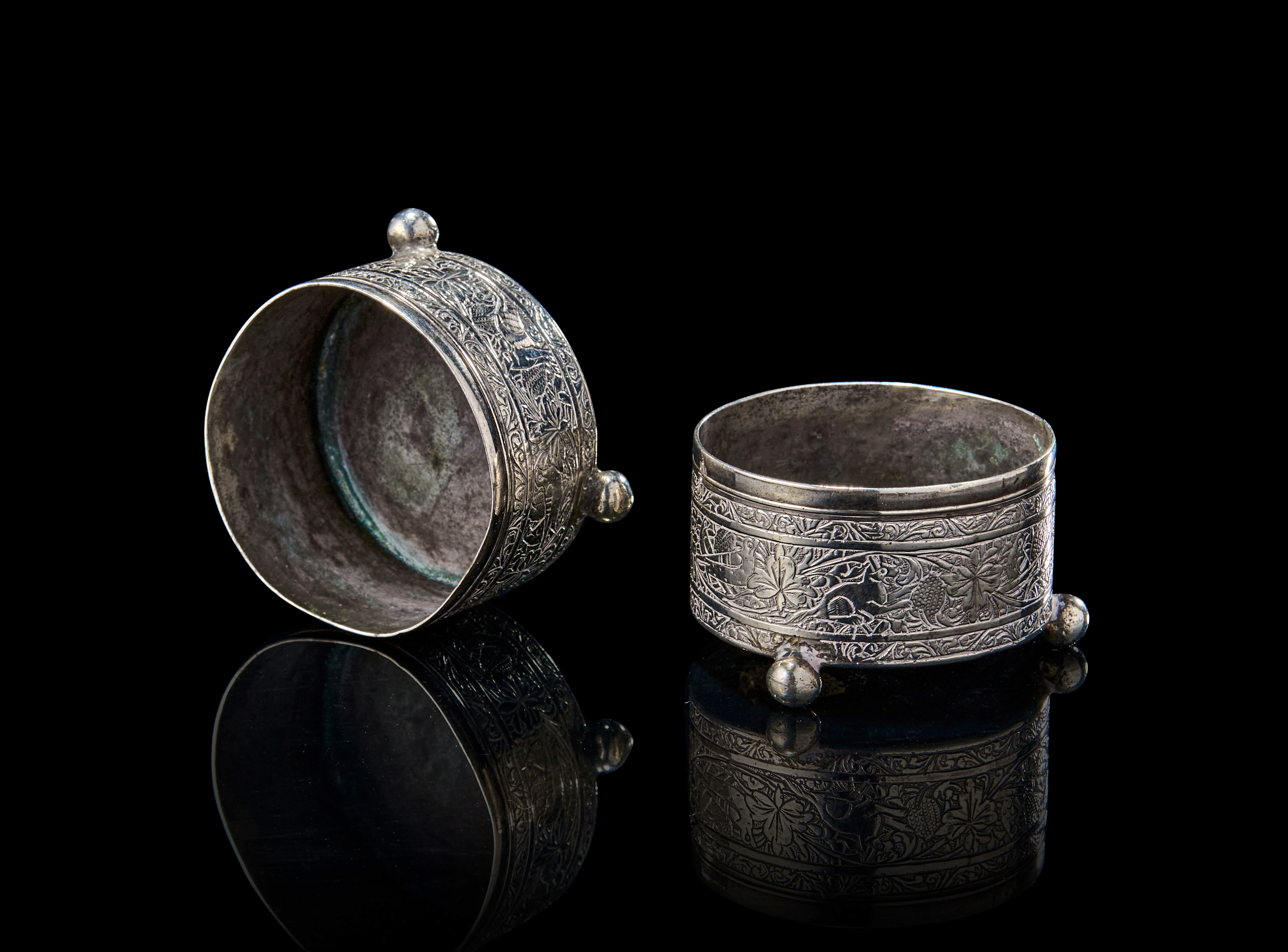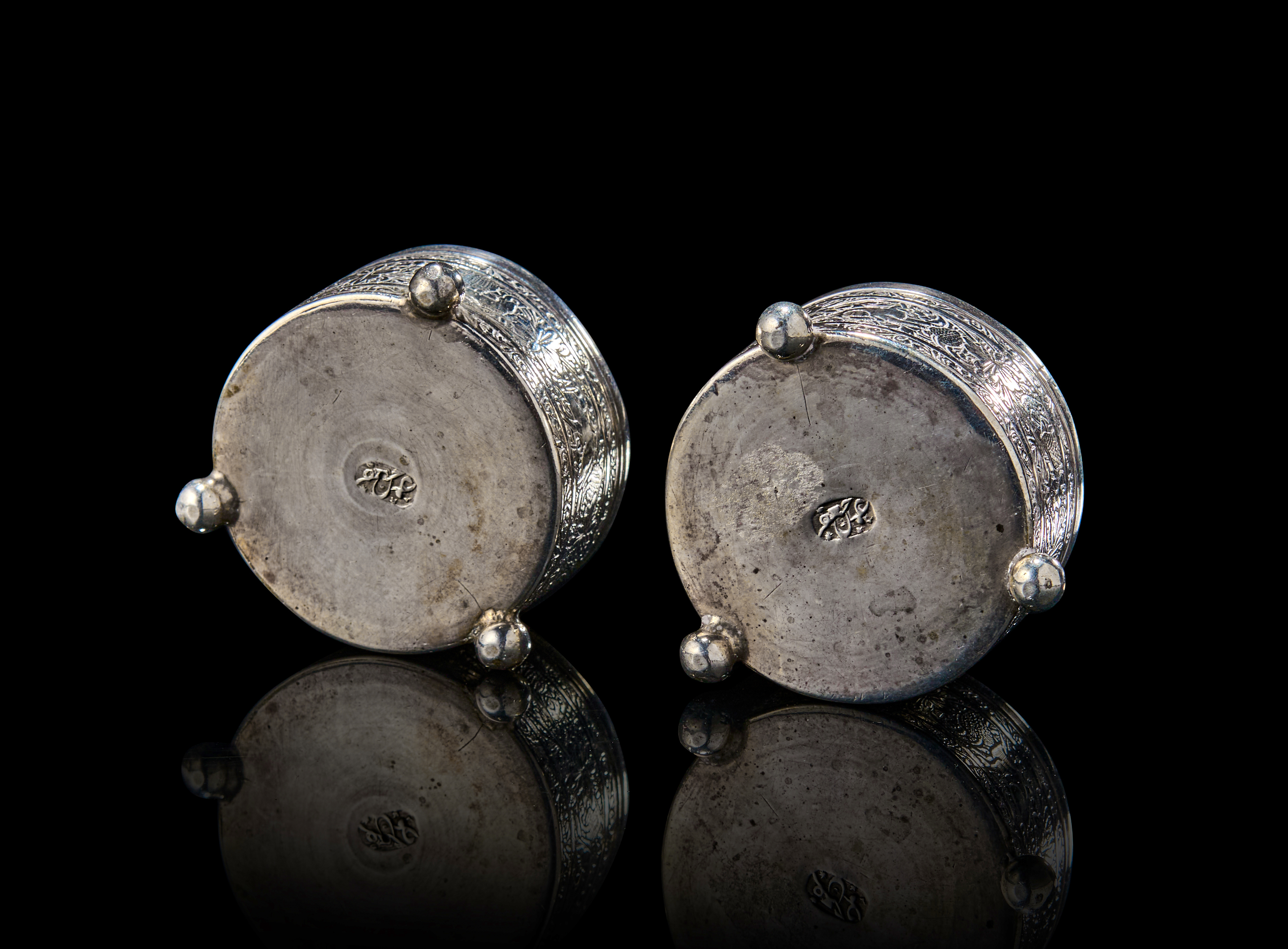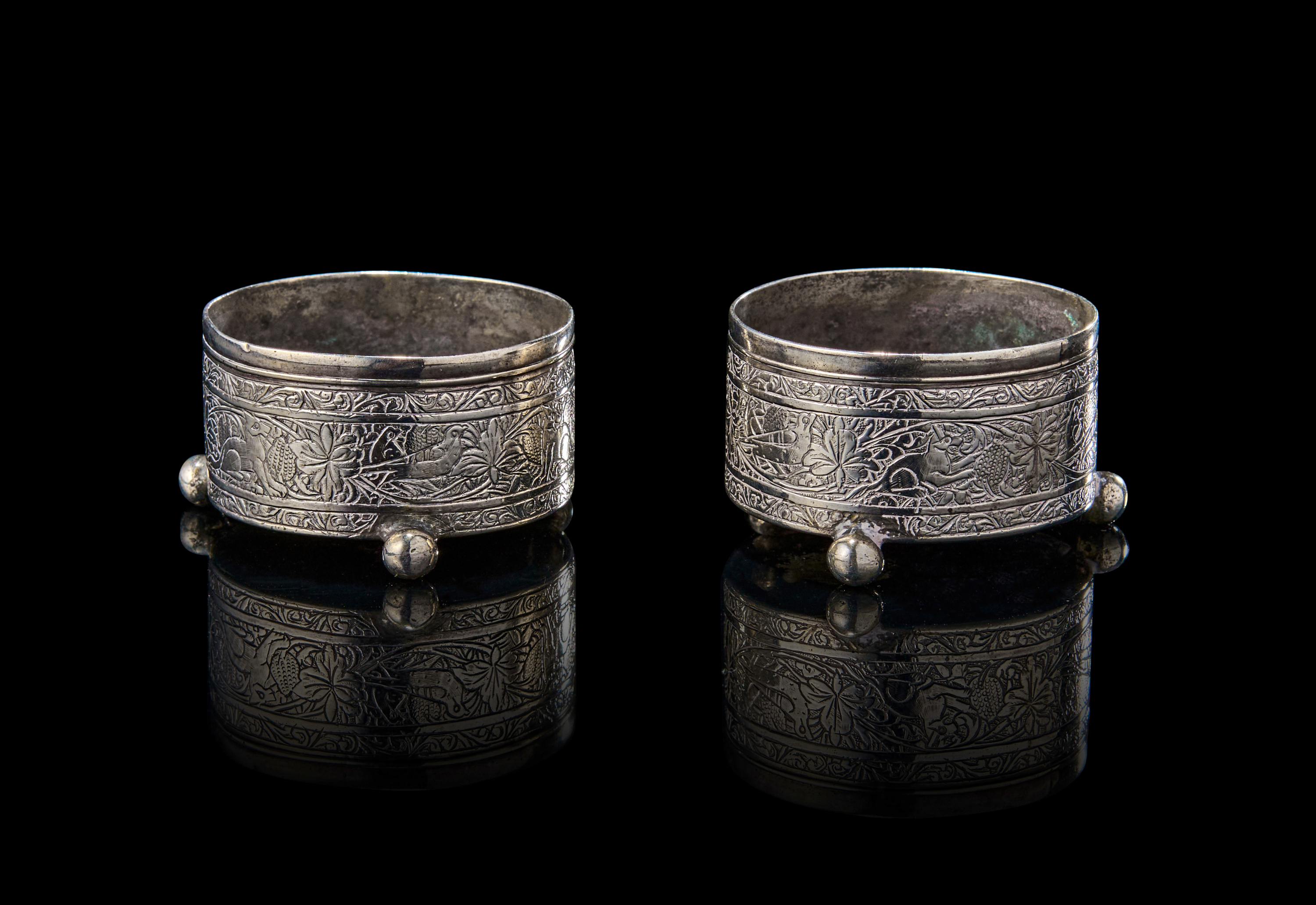 Each of these salt cellars rests on three spherical feet and is engraved in deep relief with a continuous band of fauna and floral motifs, featuring birds among blossoming foliage. The upper and lower rims are bordered with fine geometric bands. Stamped to the base with the maker’s mark of the renowned silversmith Master Jaafar.