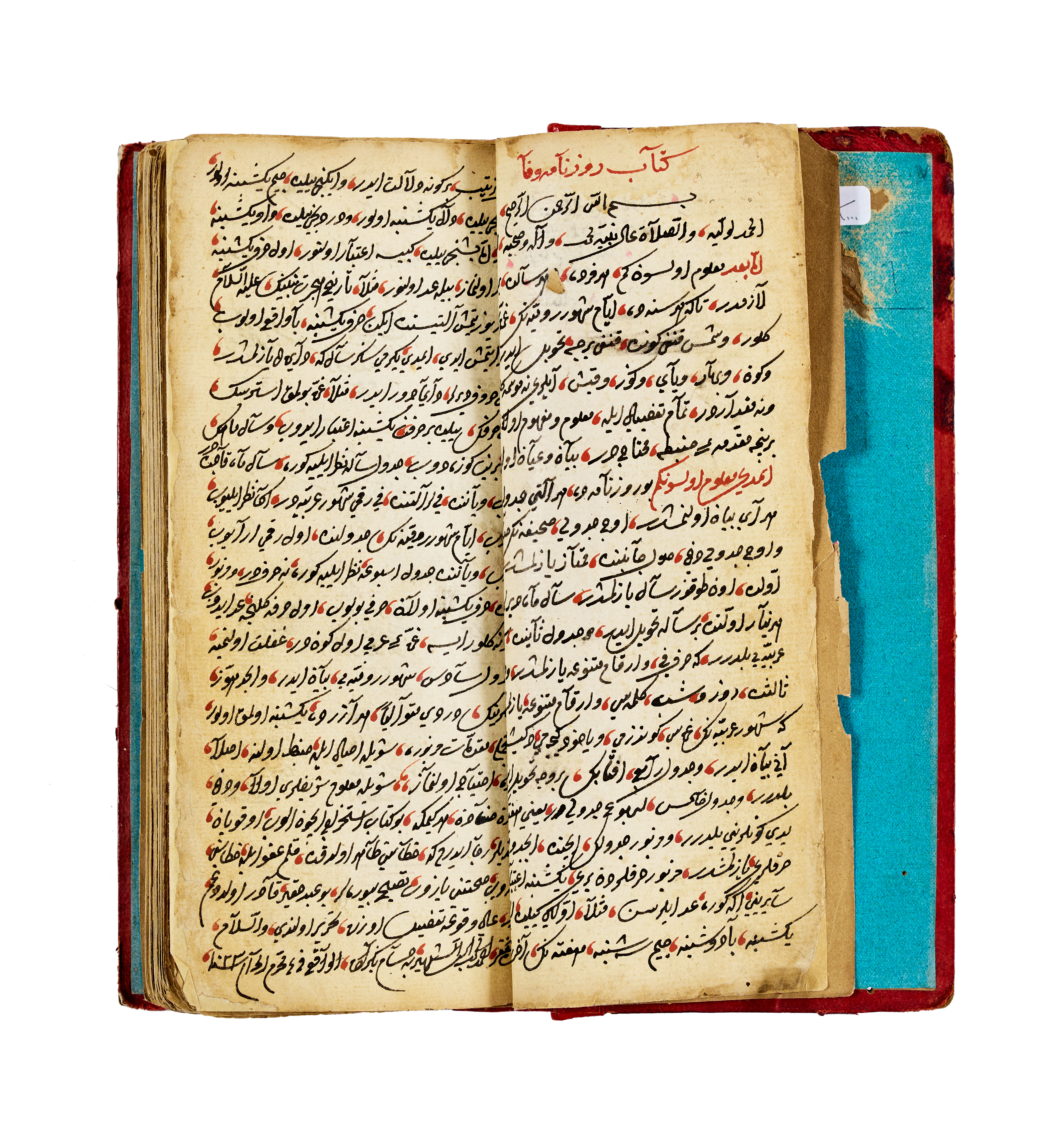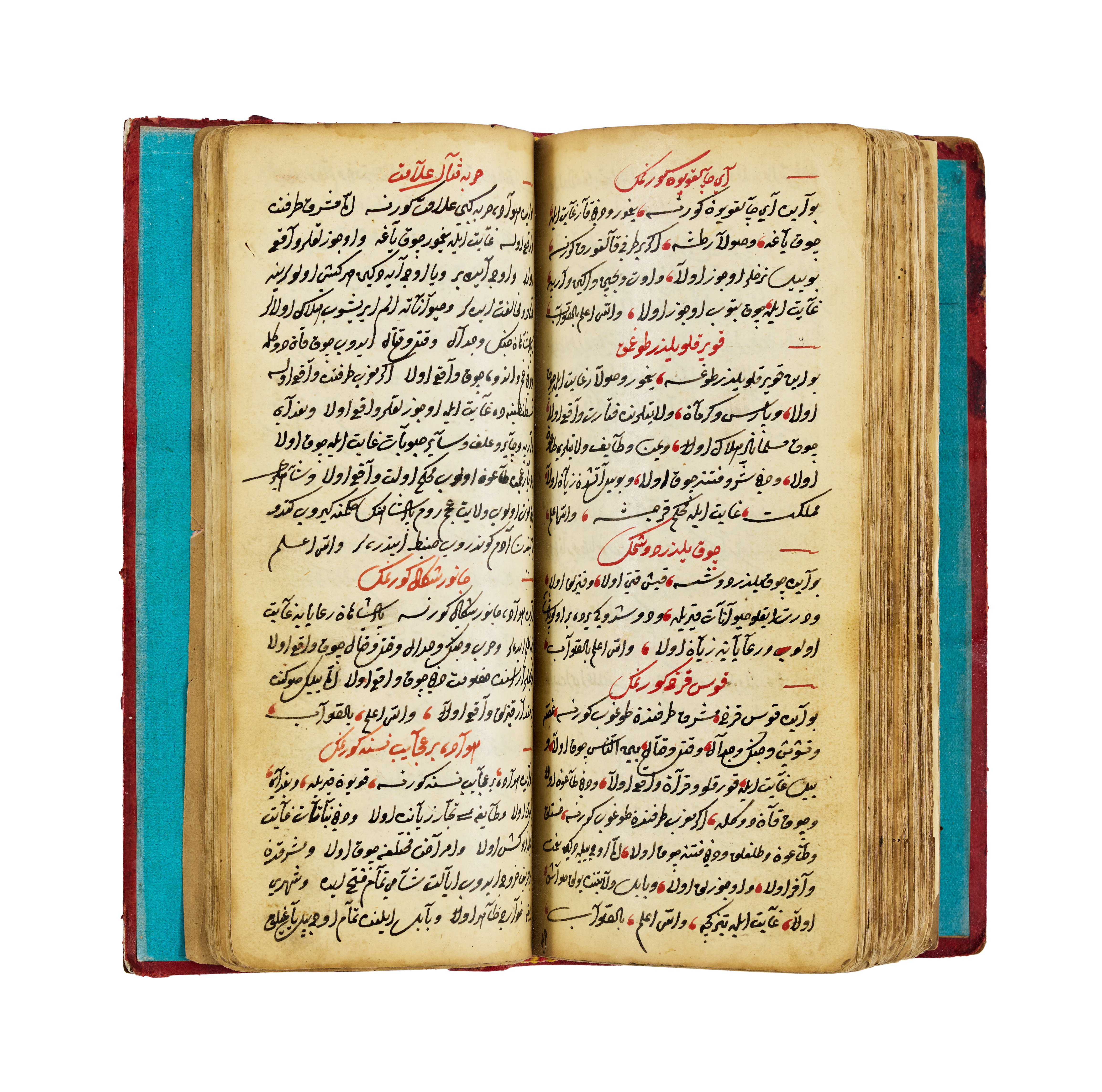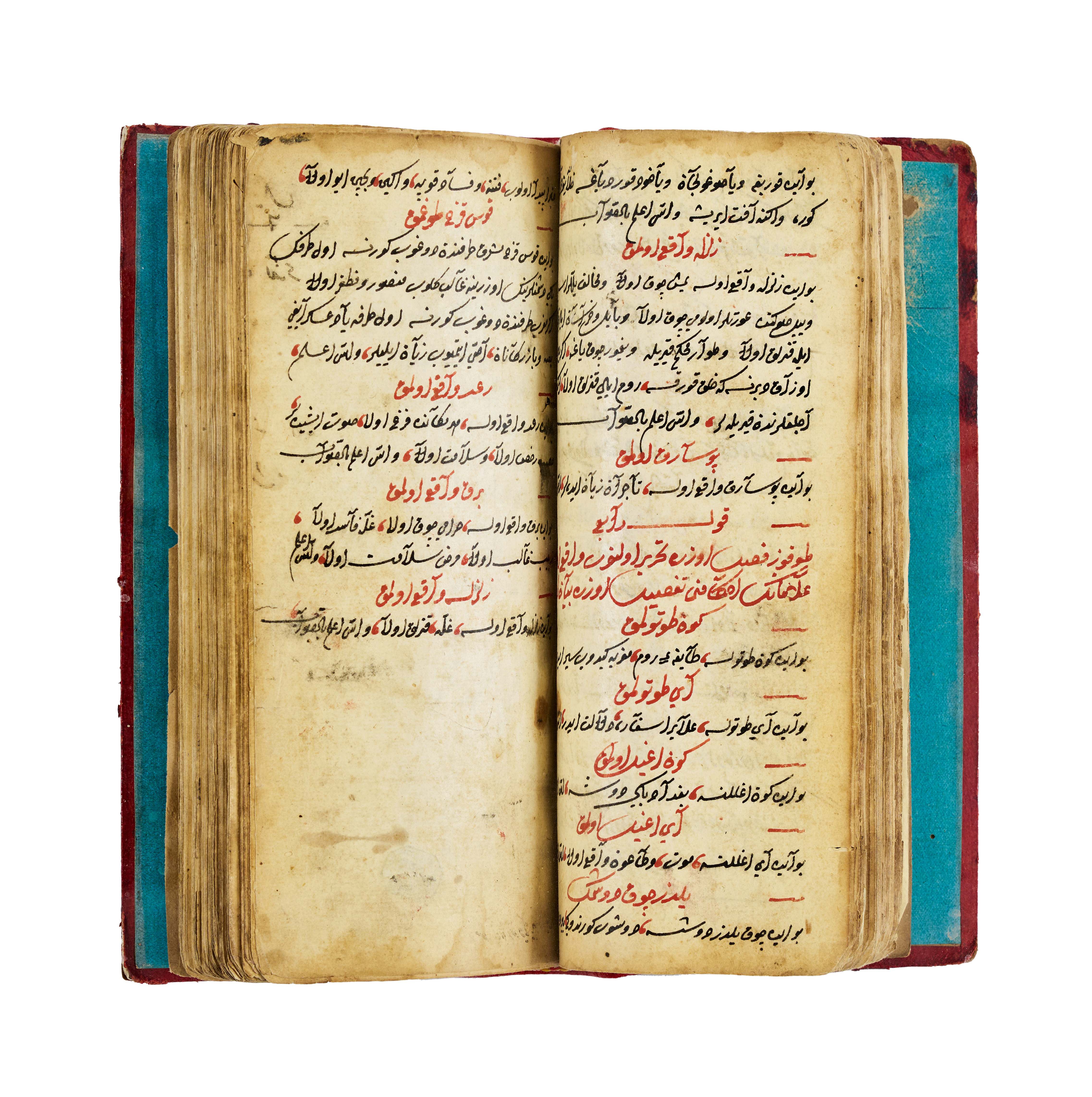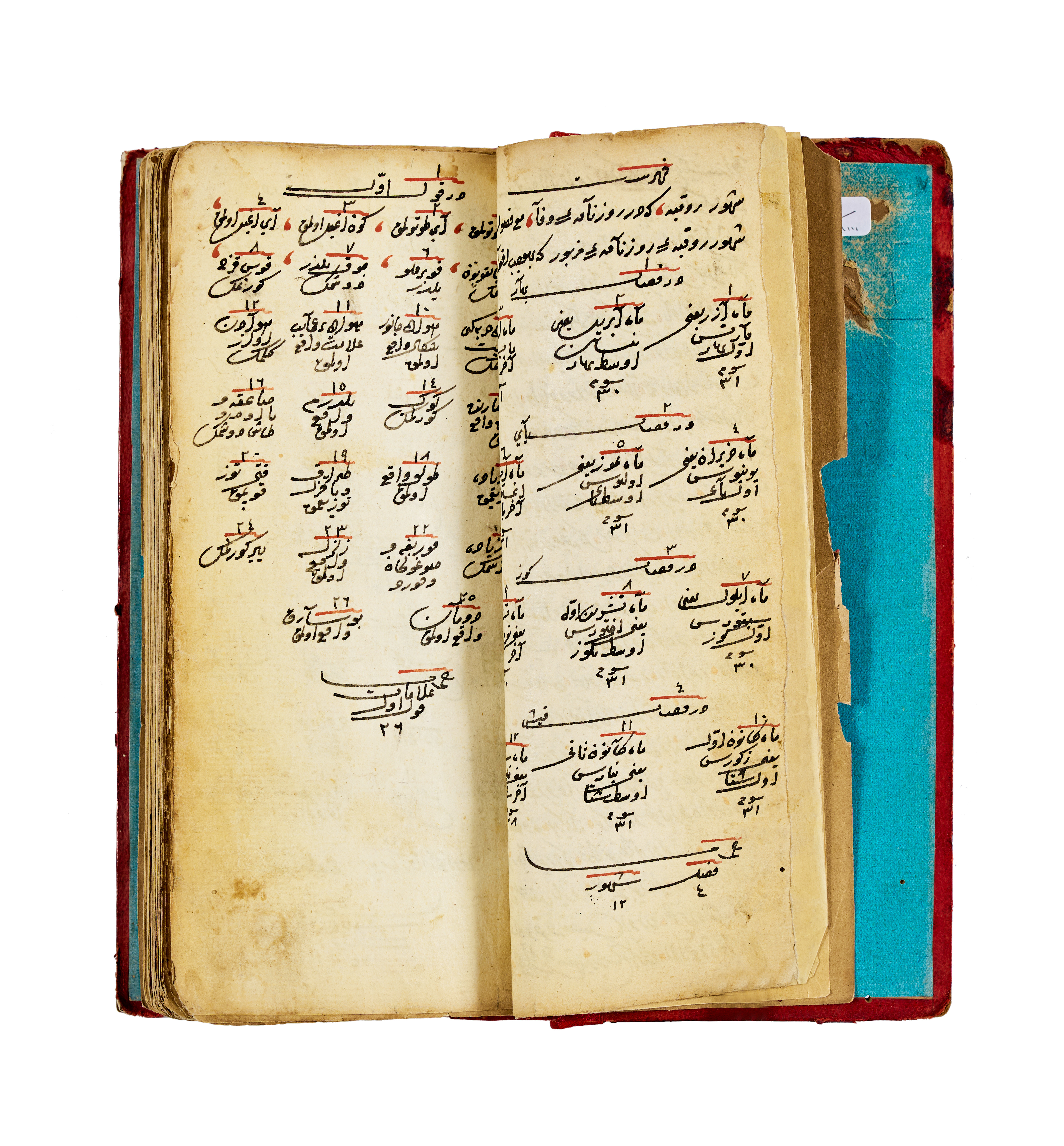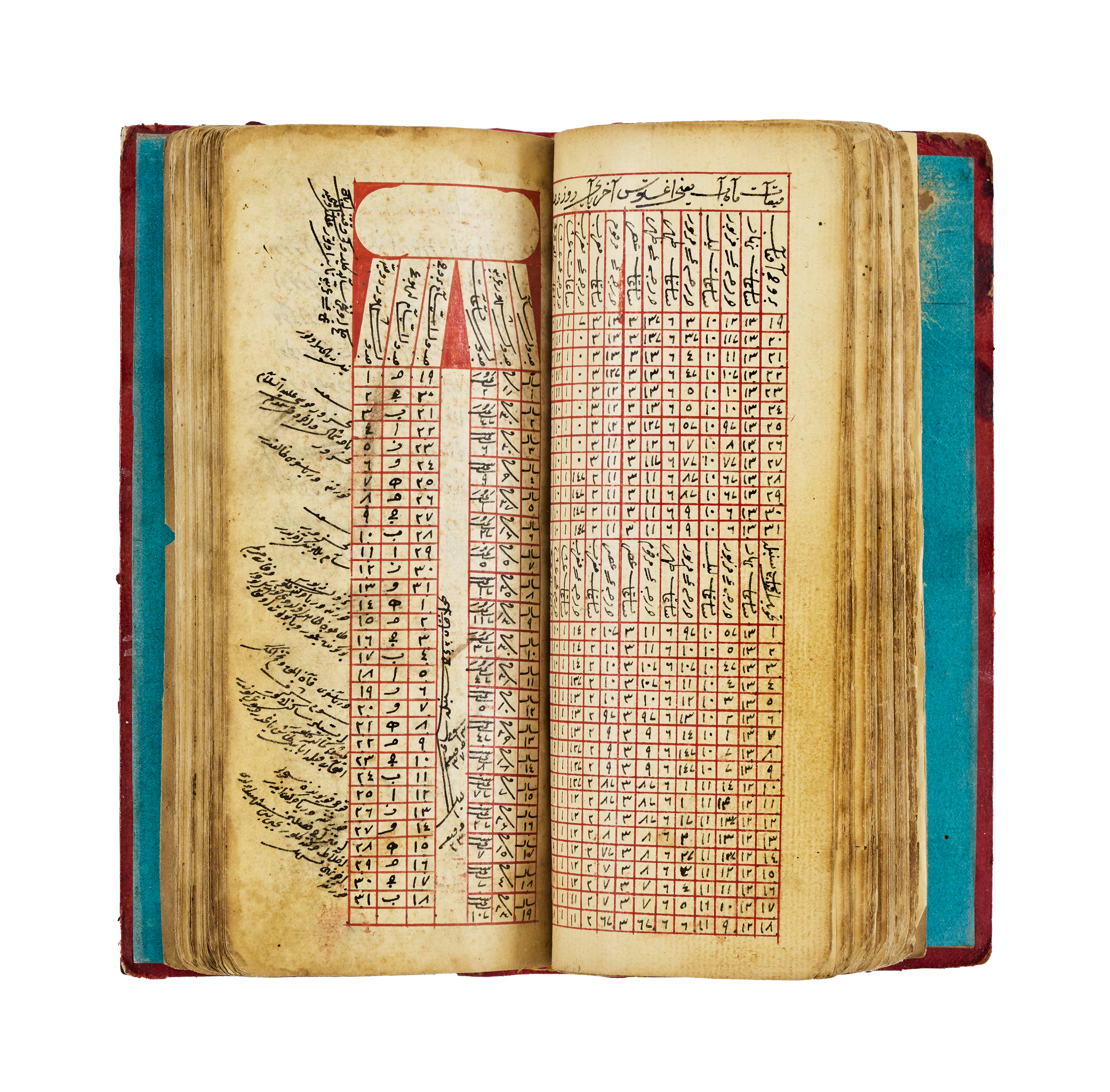 Written in a combination of Ottoman Turkish and Arabic, the manuscript serves as a Roznamah (astronomical calendar) that outlines prayer times, lunar and solar movements, and various astrological and religious calculations. Featuring handwritten text in black and red ink, ornate tables, and margin notes. The manuscript includes: