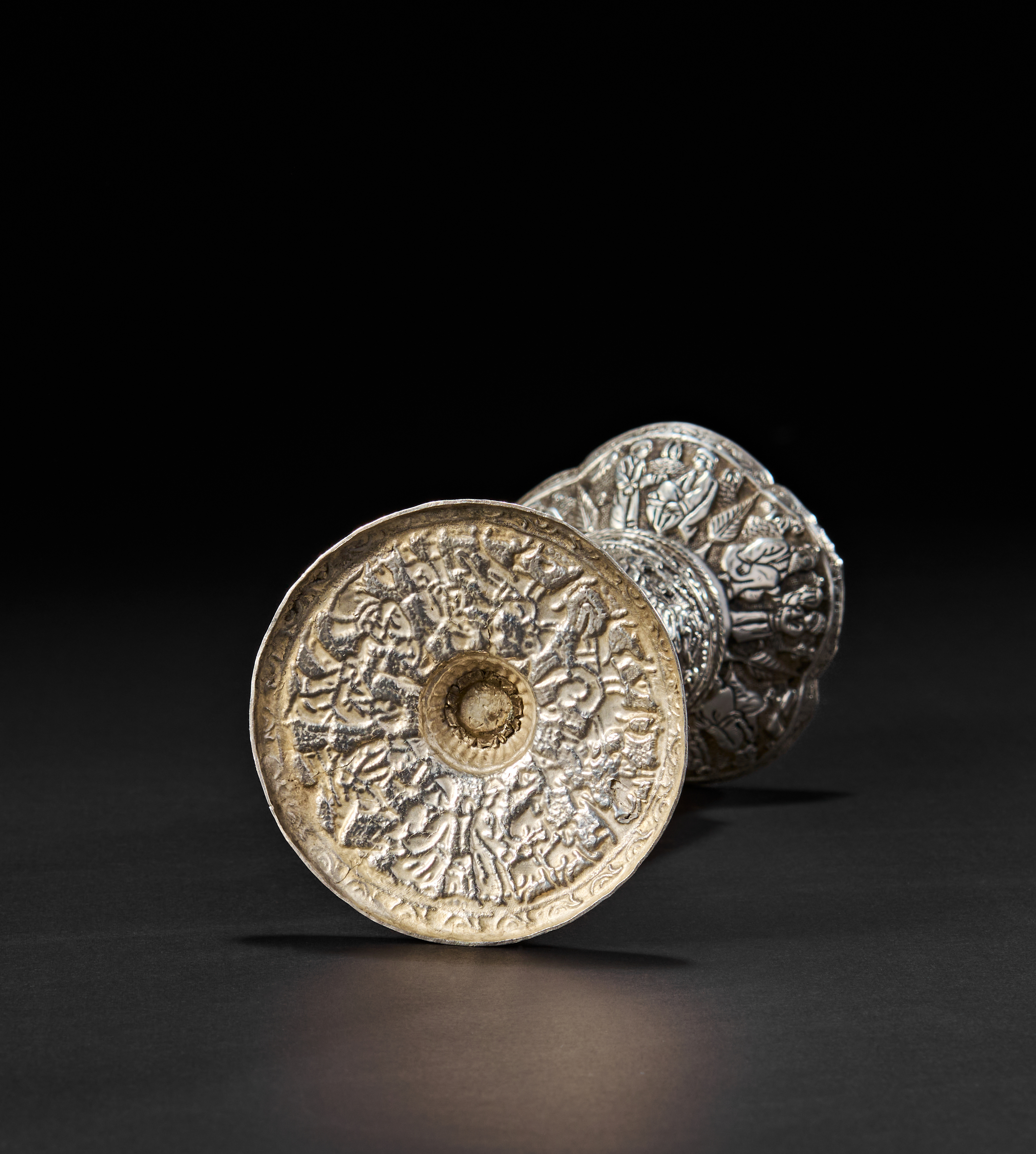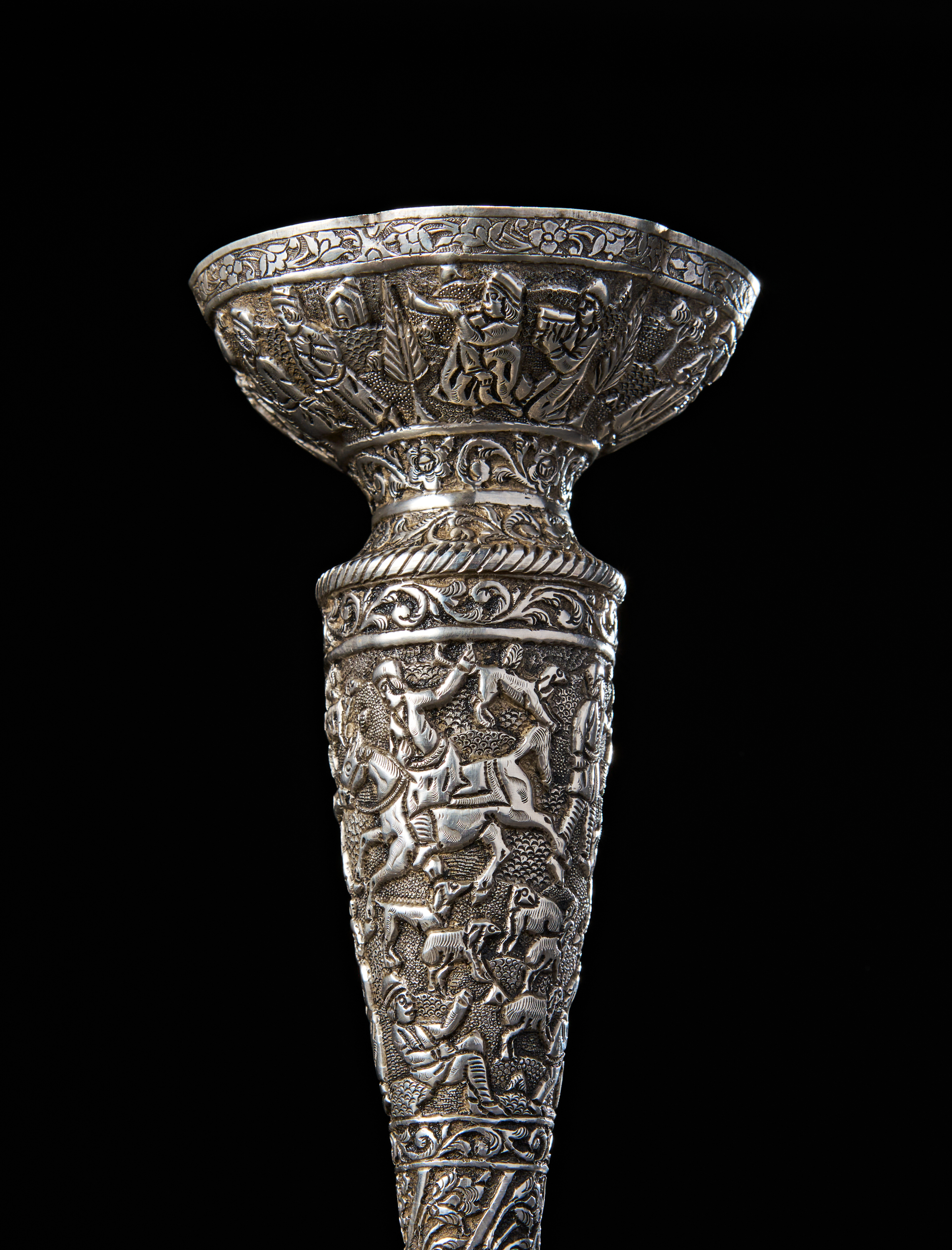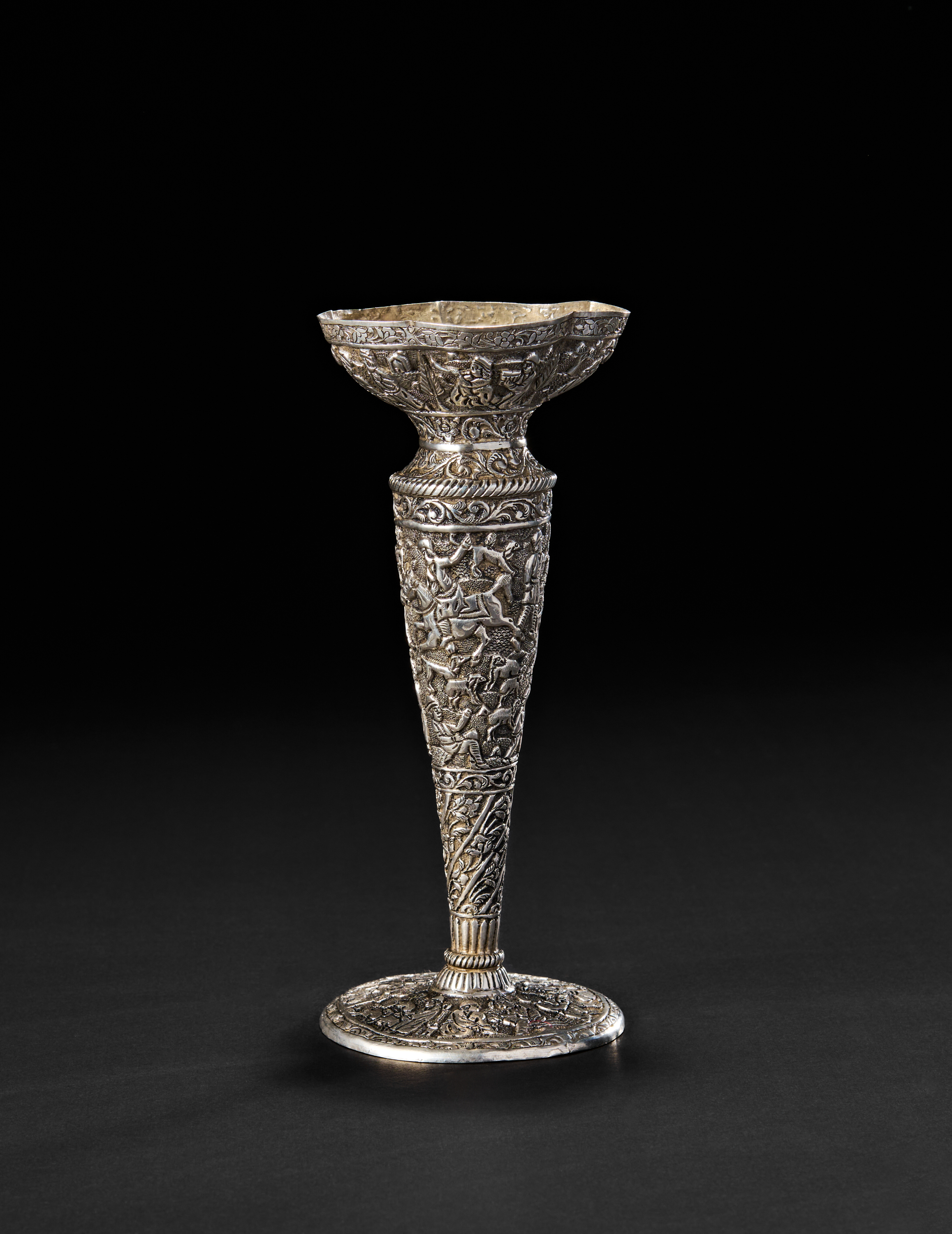 Of a flaring form, this finely hand-chased silver vase is richly adorned with a dynamic band of figures and animals in various animated scenes, including horseback riders, musicians, and pastoral motifs, all rendered in high relief. The neck and foot are encircled with intricate floral and vegetal scrolls, culminating in a everted lip with further floral detailing.