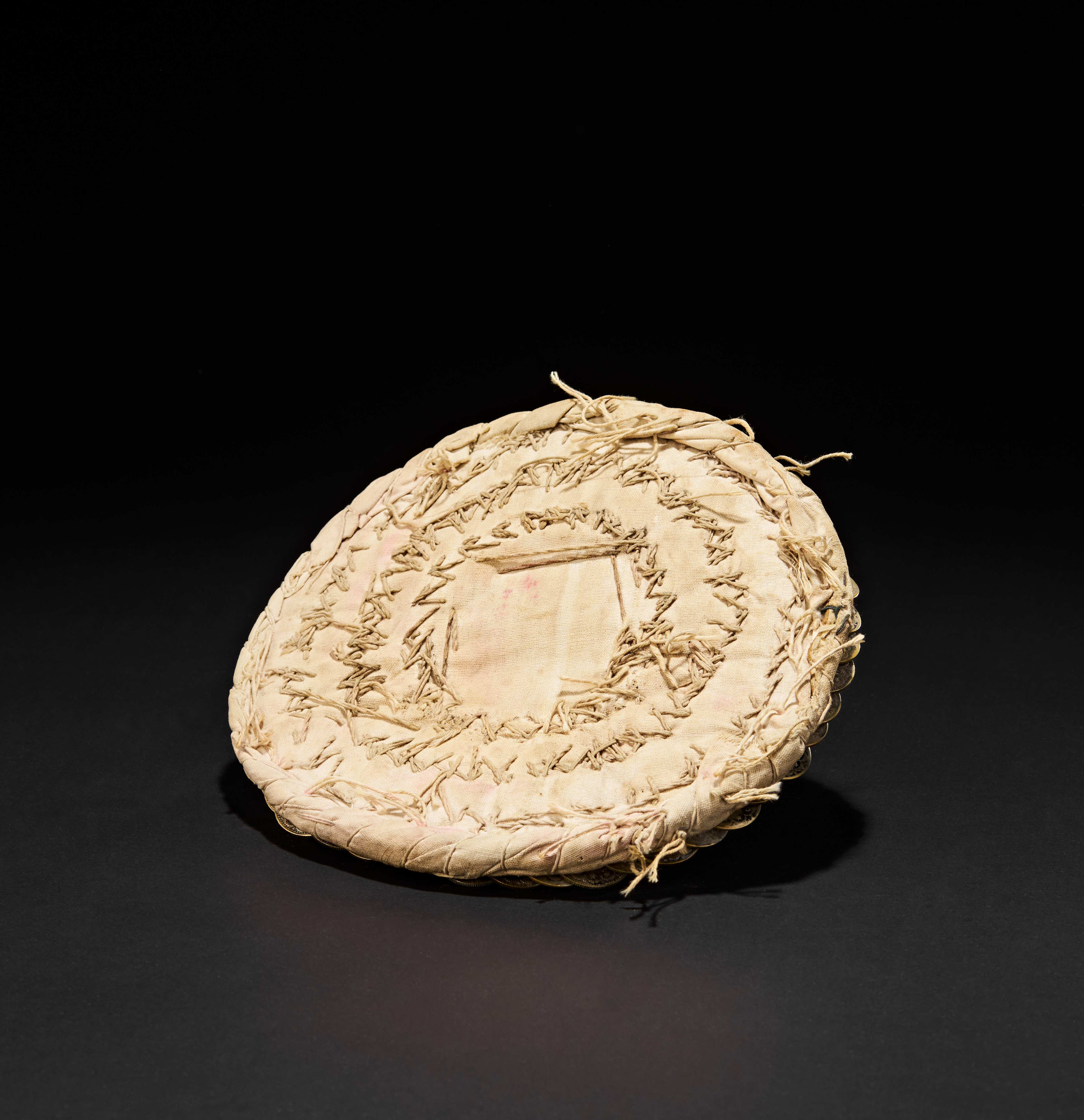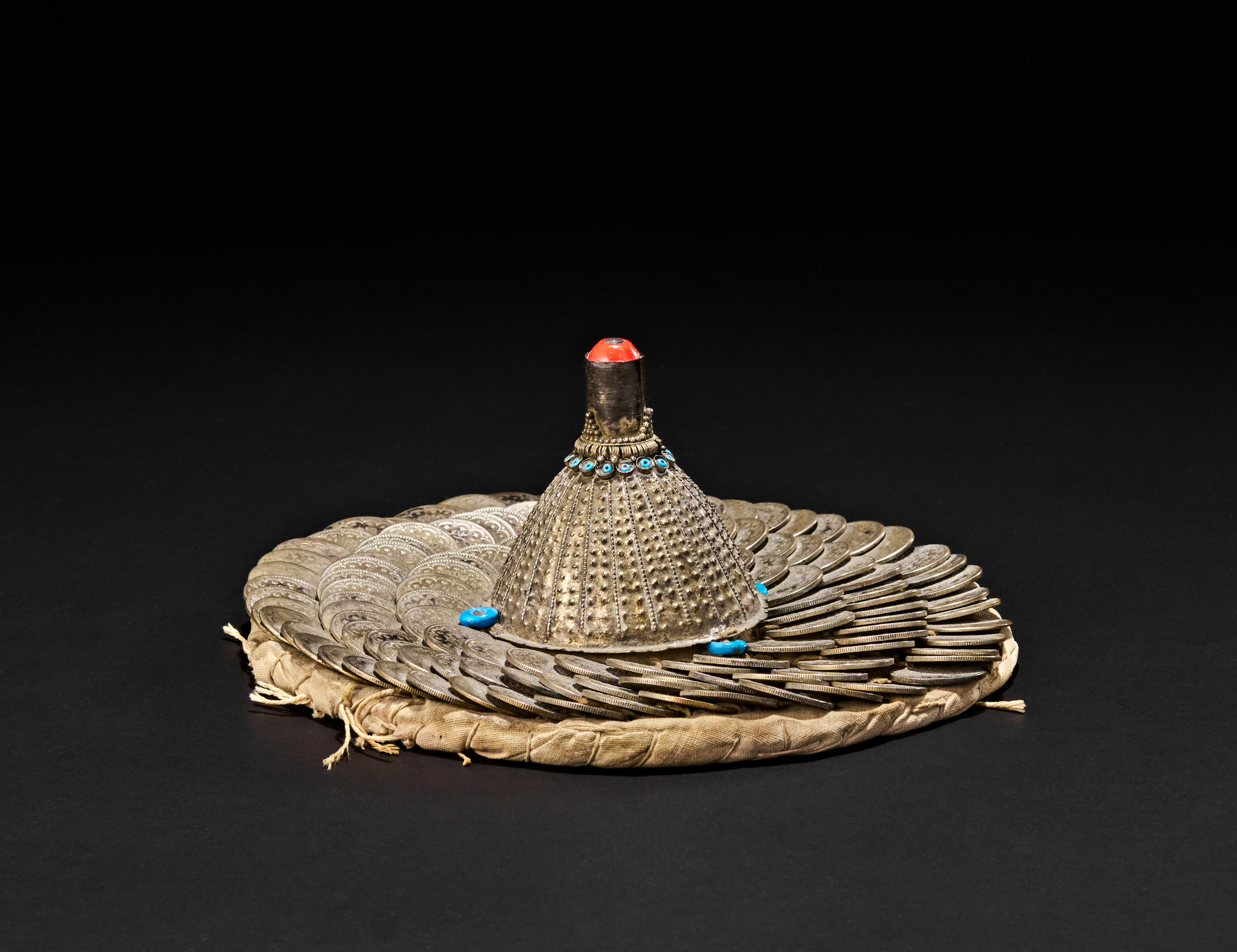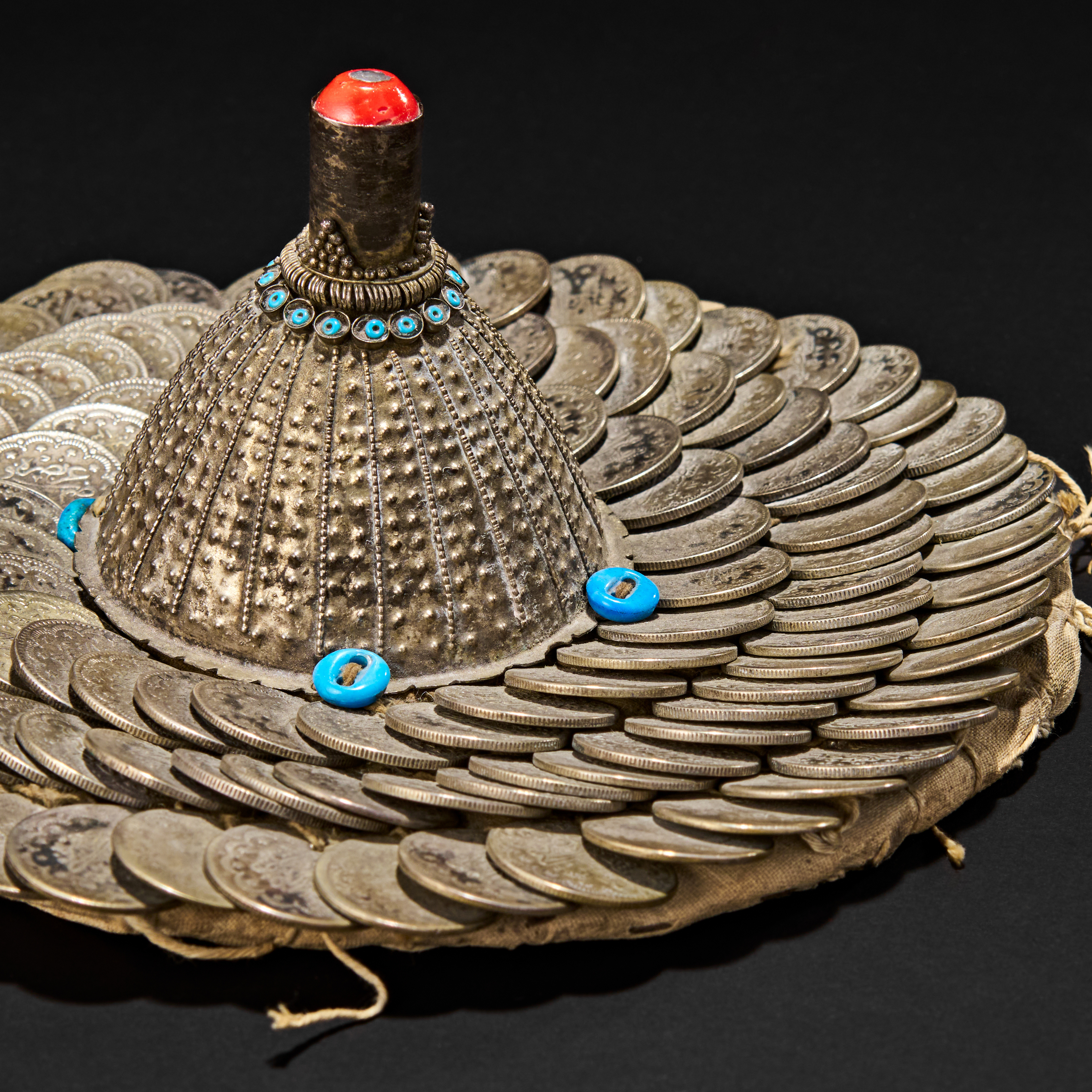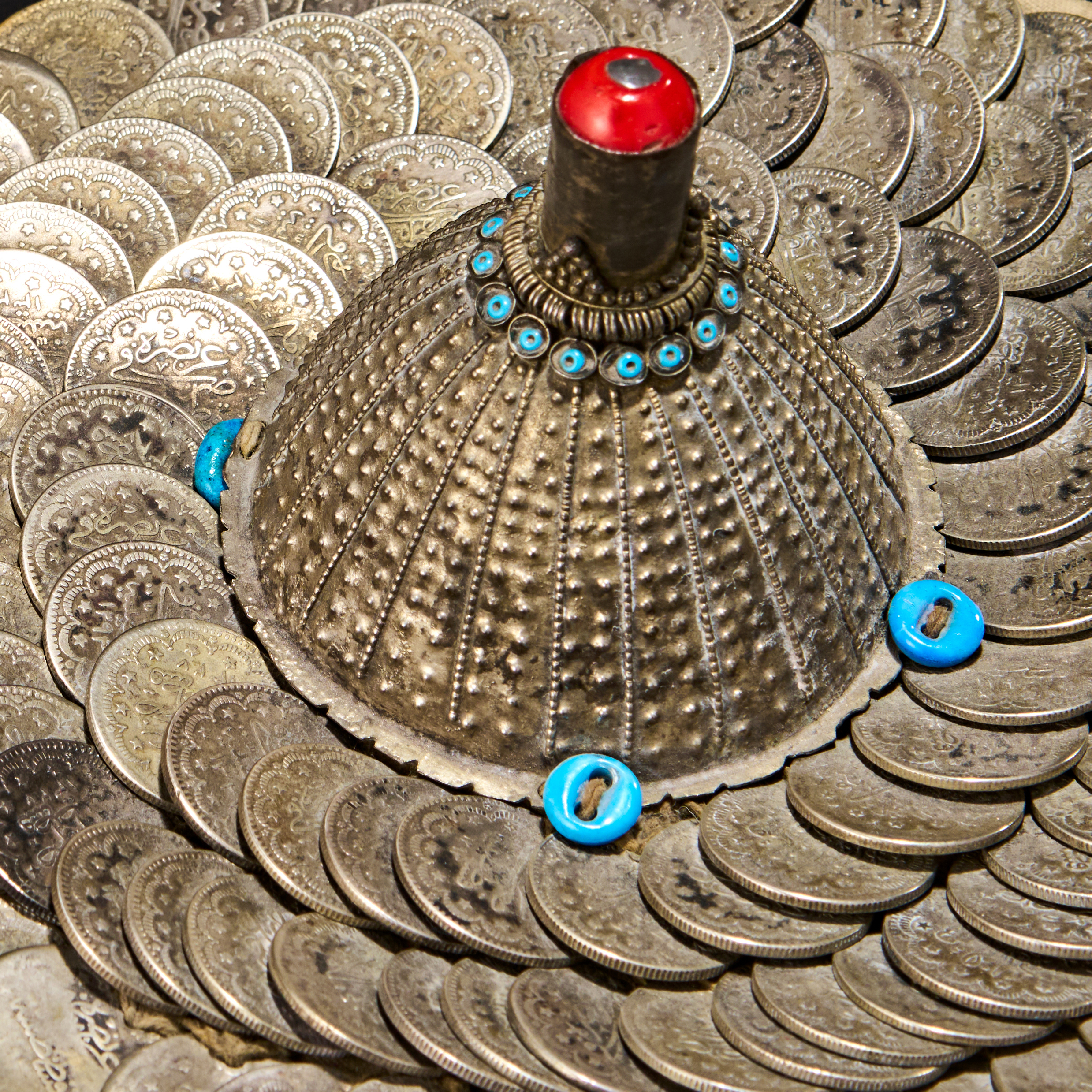 A ceremonial wedding hat, possibly Palestinian, known as a “wuqayat”, traditionally worn by brides during festive celebrations. This rare headdress is richly adorned with layered silver coins, meticulously arranged in concentric circles atop a padded base. At the centre rises a domed silver cone, intricately decorated with embossed patterns and accented by a vivid red cabochon finial and a ring of turquoise-blue glass beads. Additional blue ceramic beads are attached around the base.