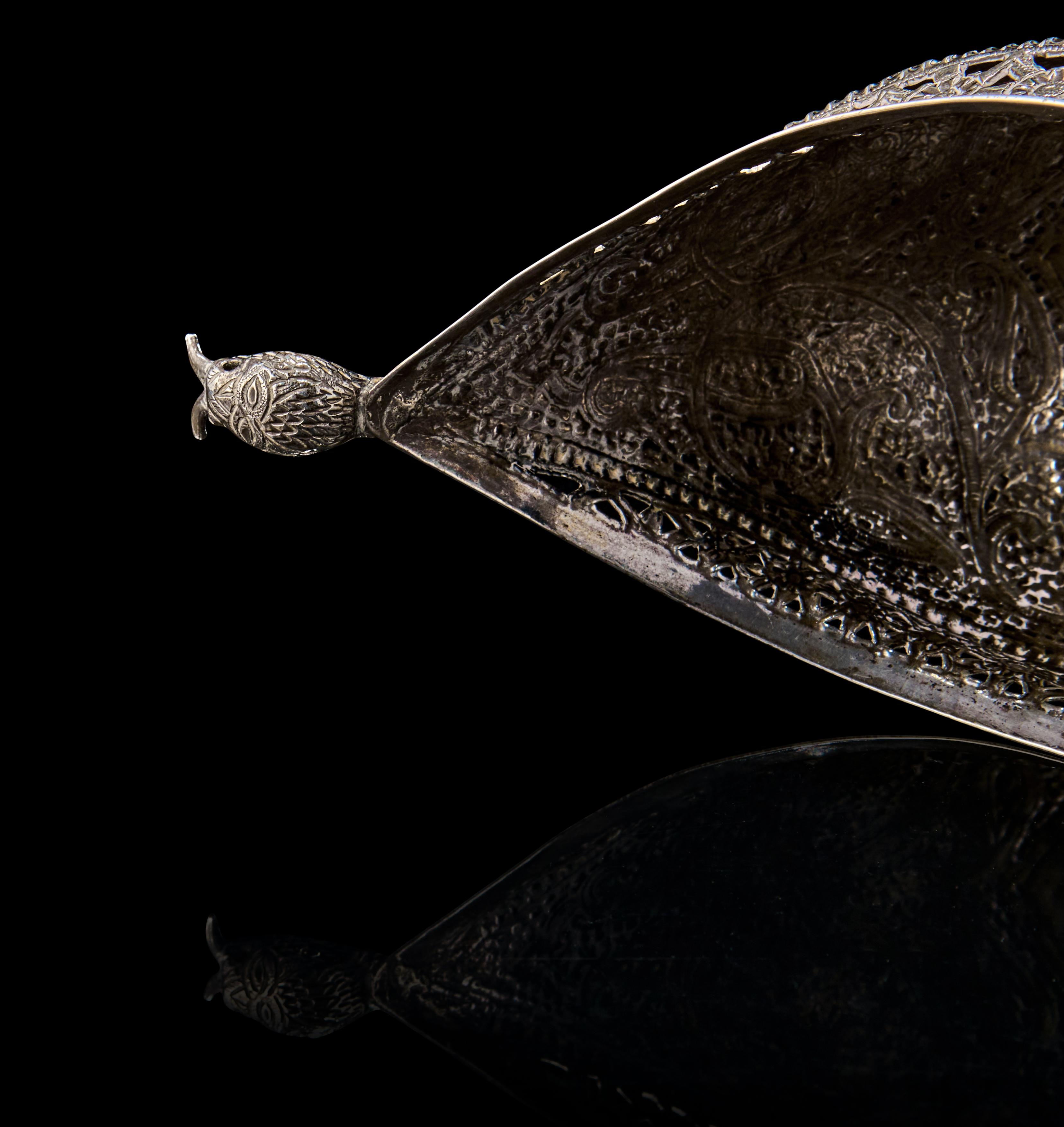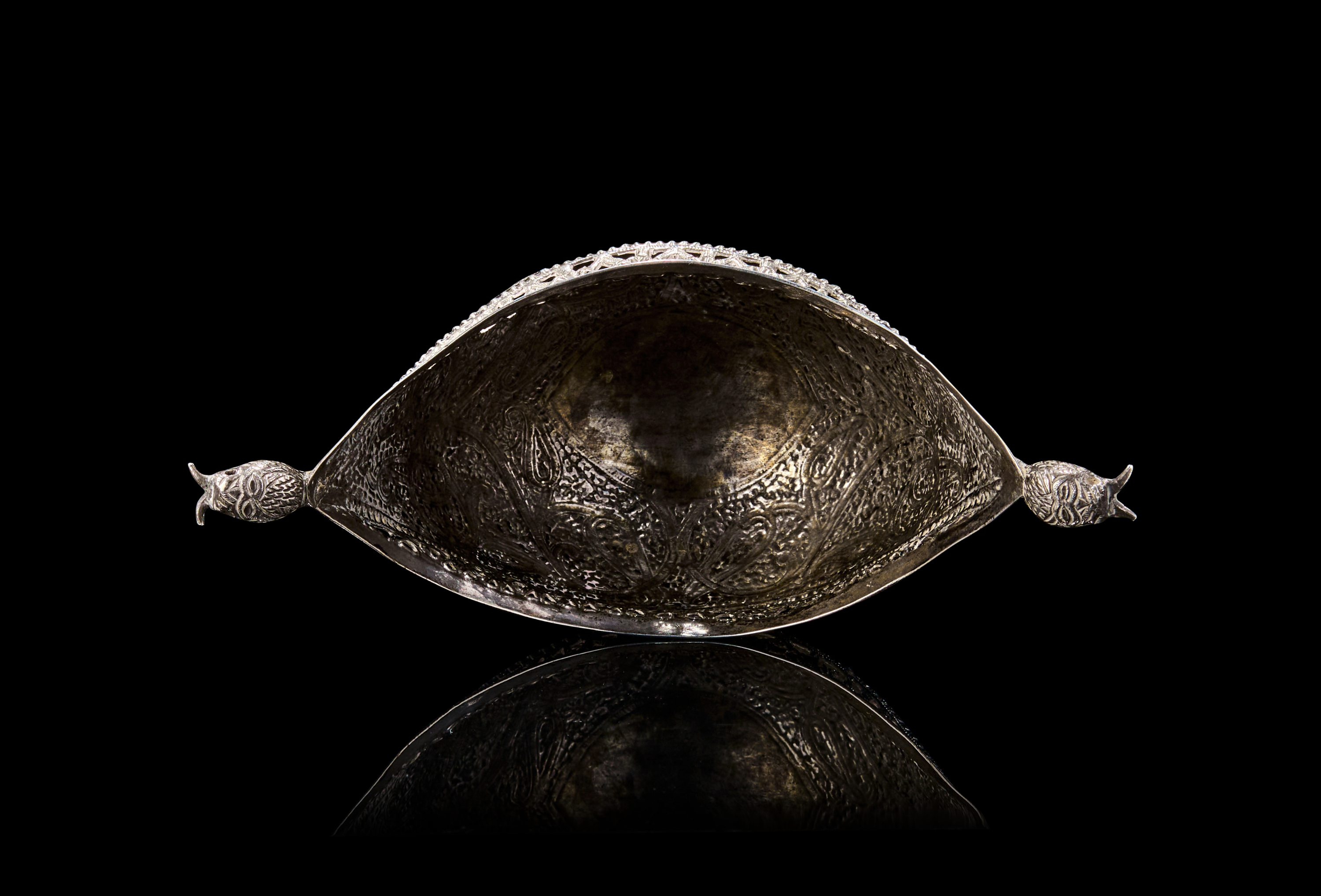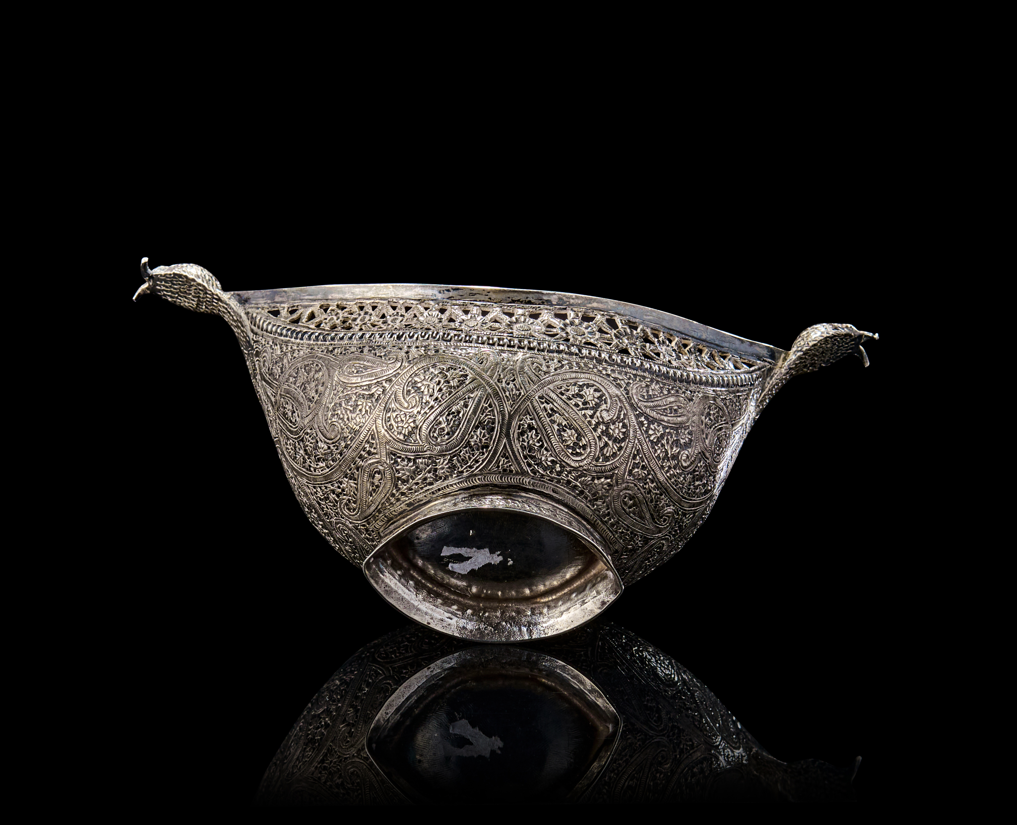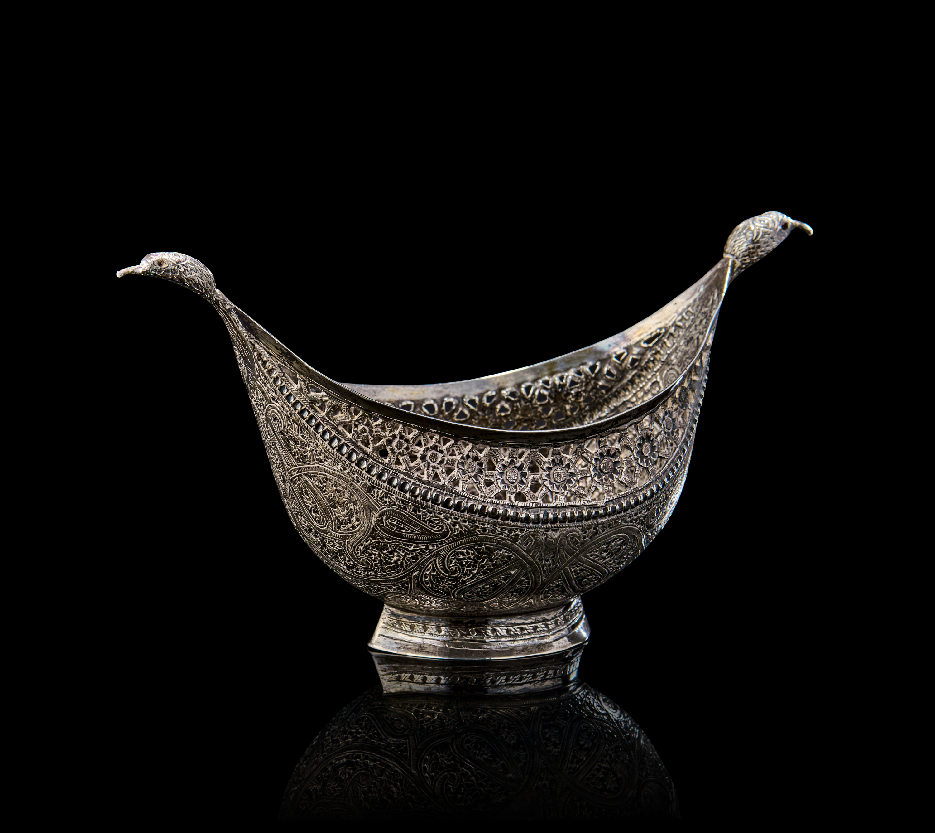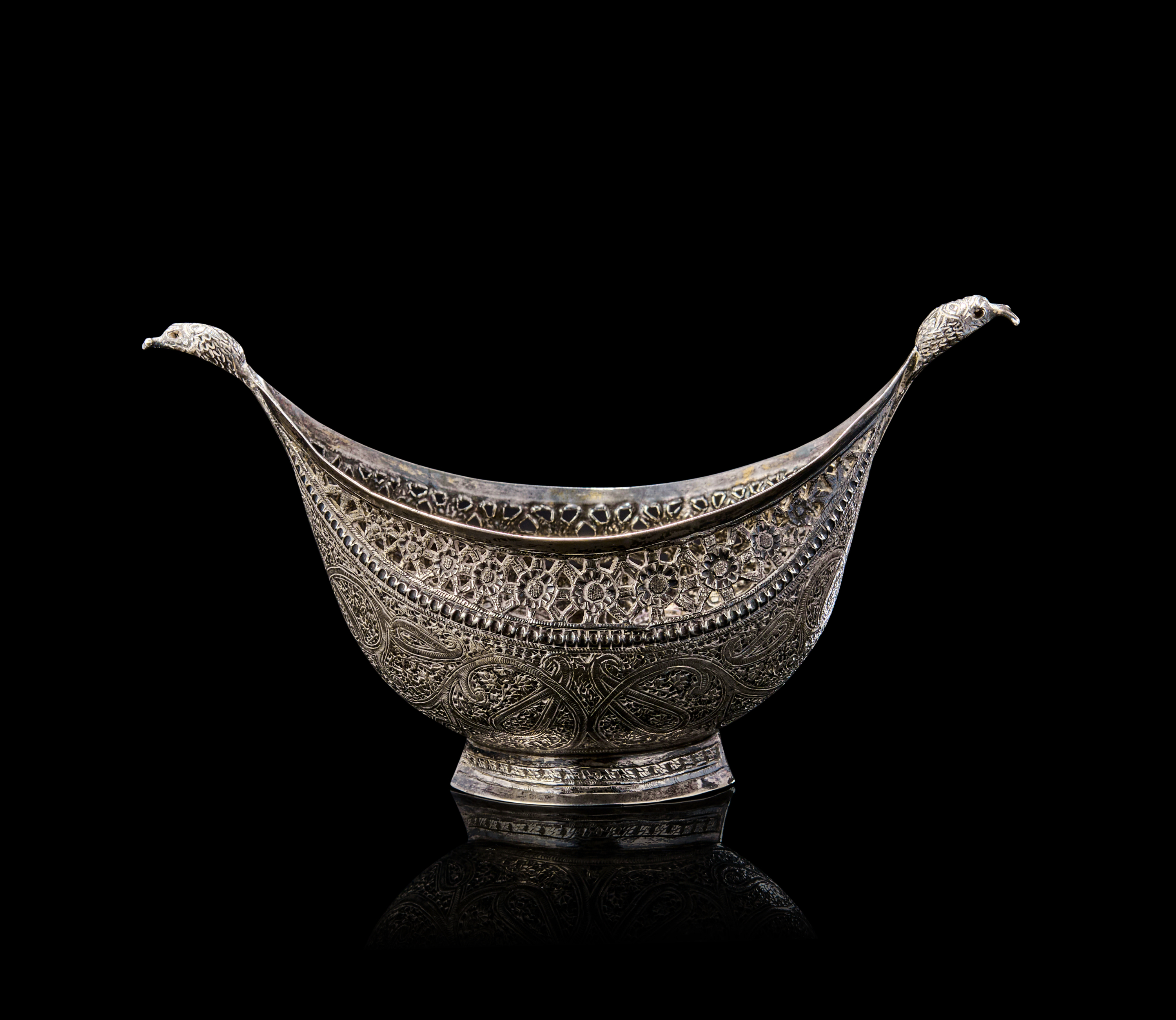 Of boat-shaped form with dramatically upturned ends terminating in finely chased serpent/dragon heads, the body richly adorned with dense floral and paisley motifs, bordered by pierced openwork trellis patterns beneath the rim. The underside of the bowl is raised on a flattened oval foot, echoing the curvature of the form.