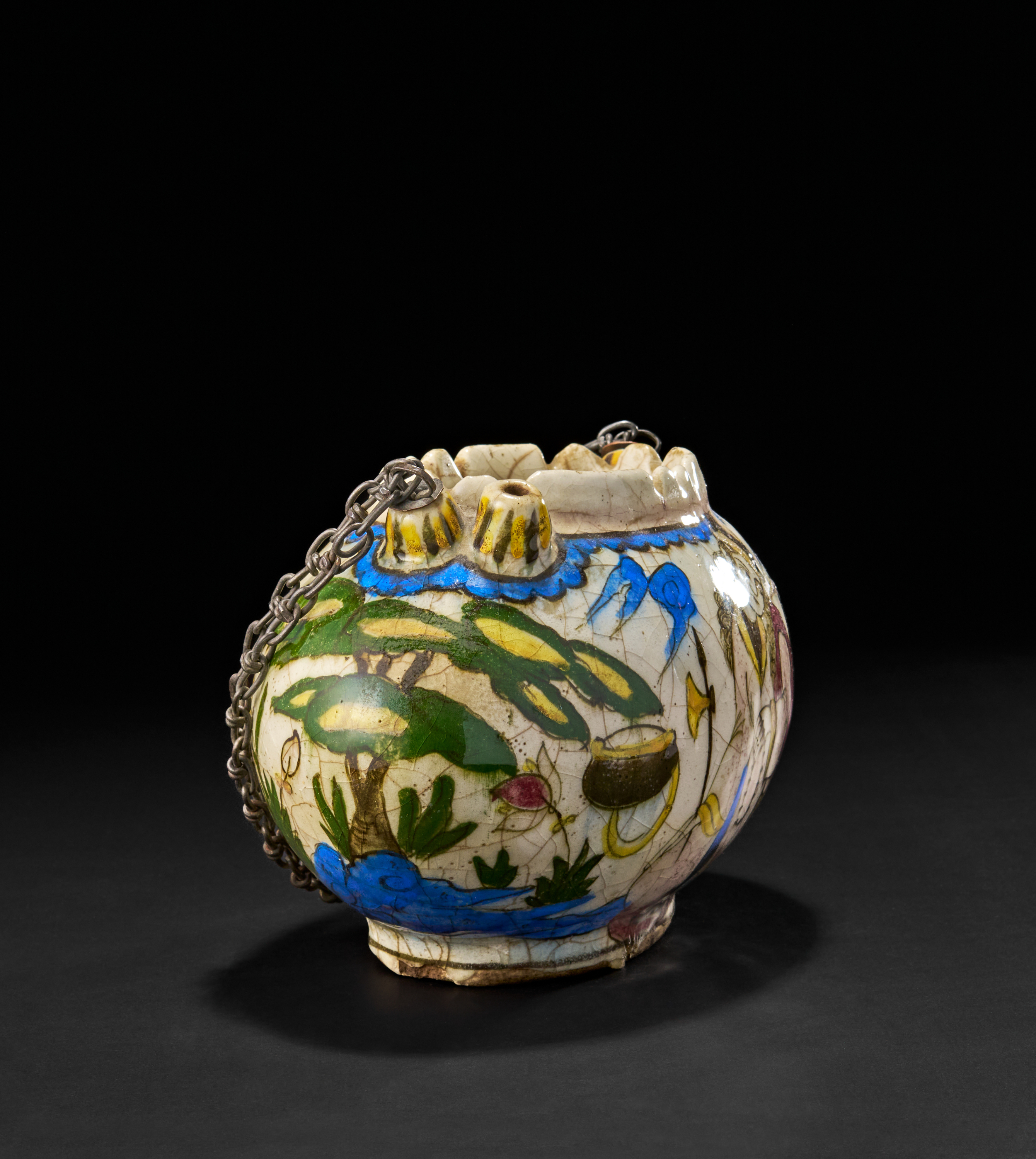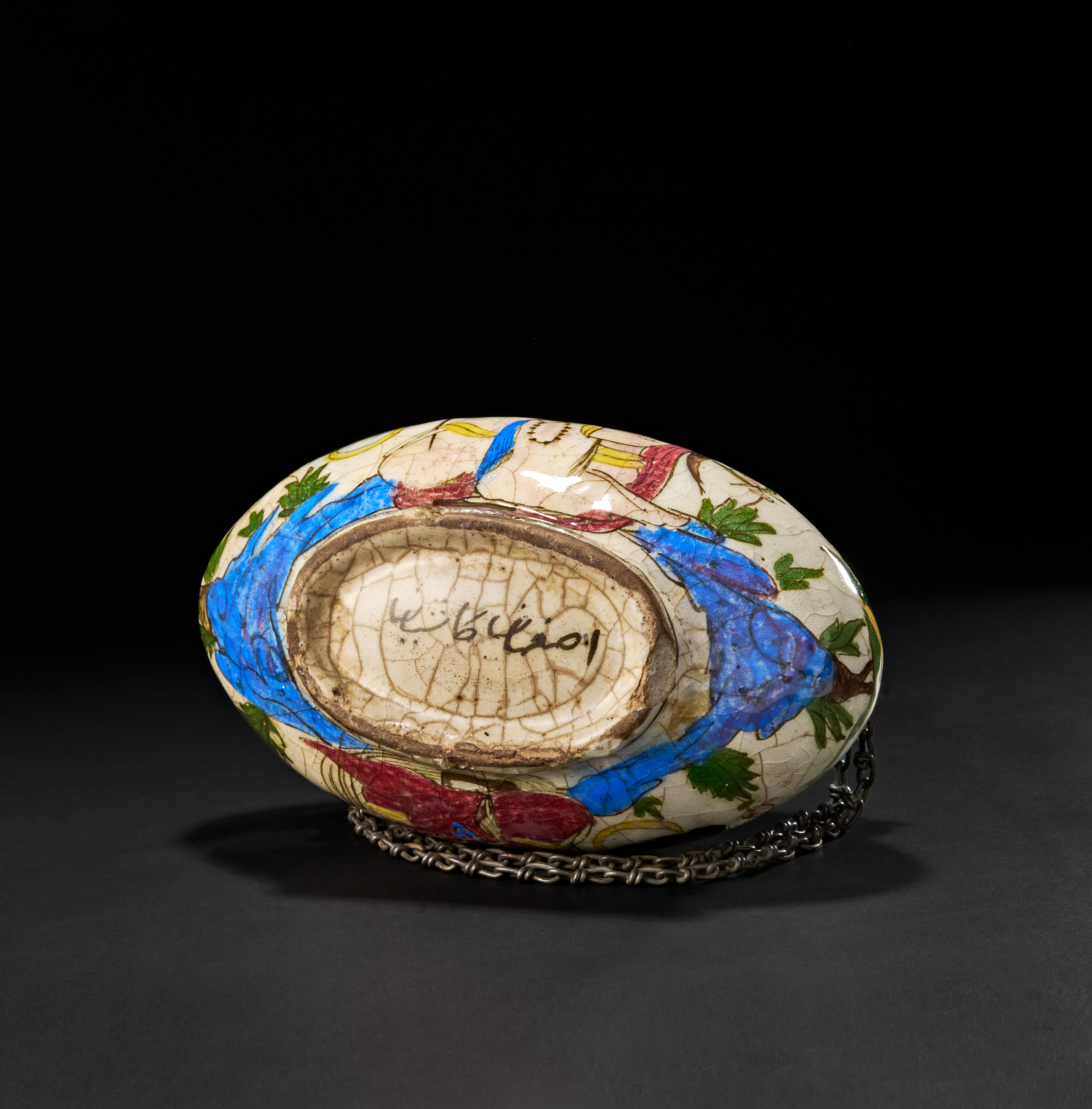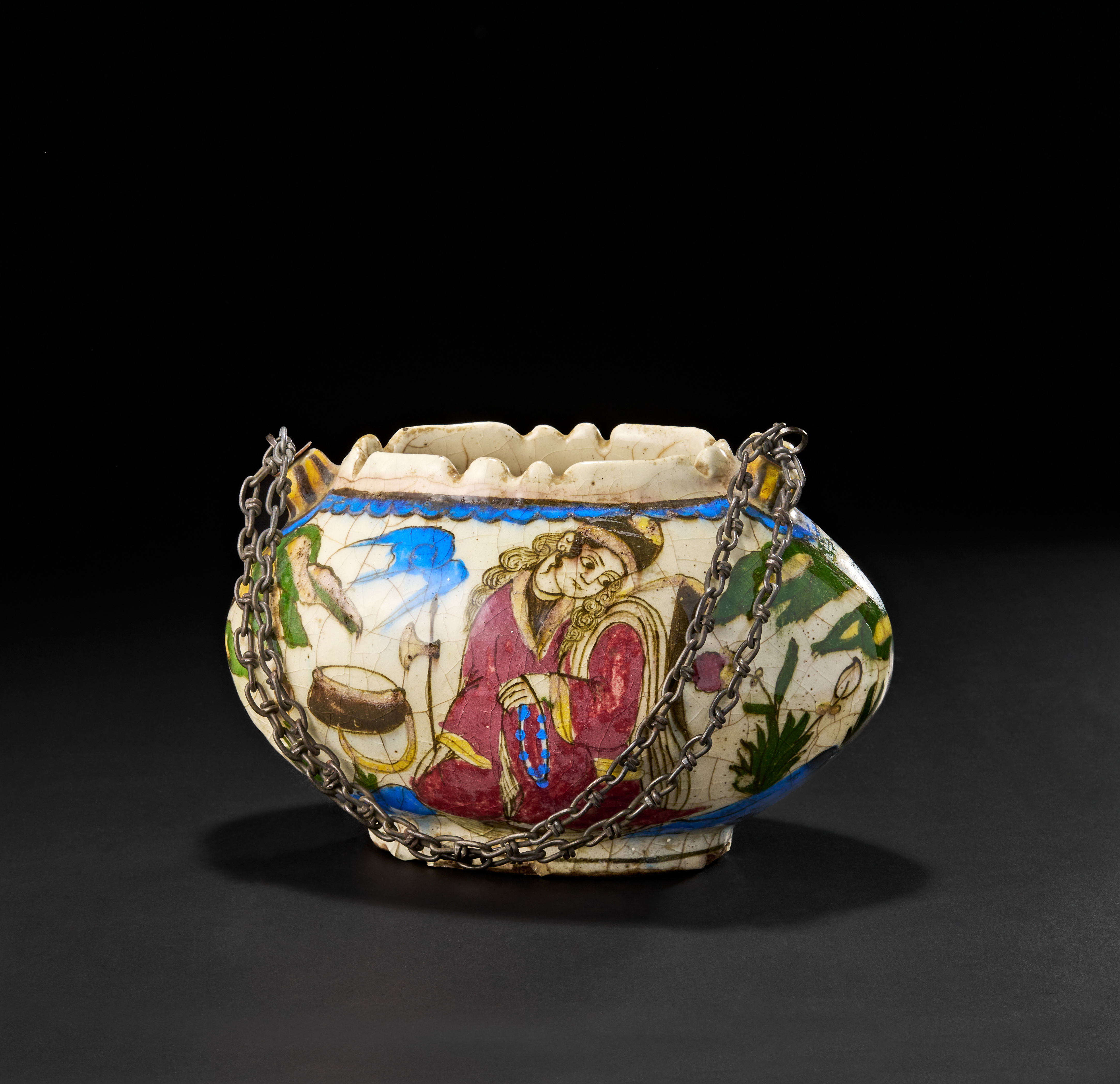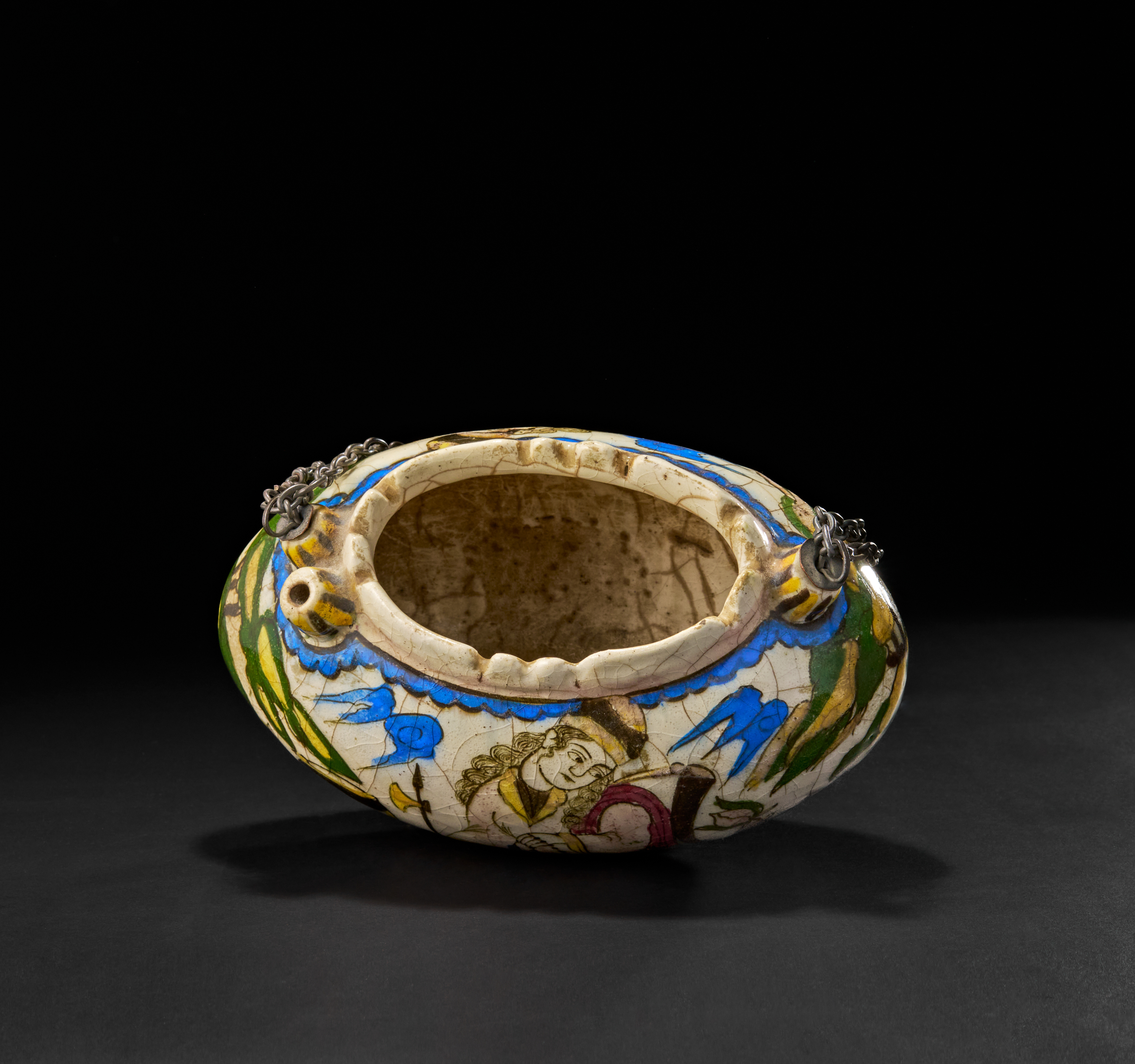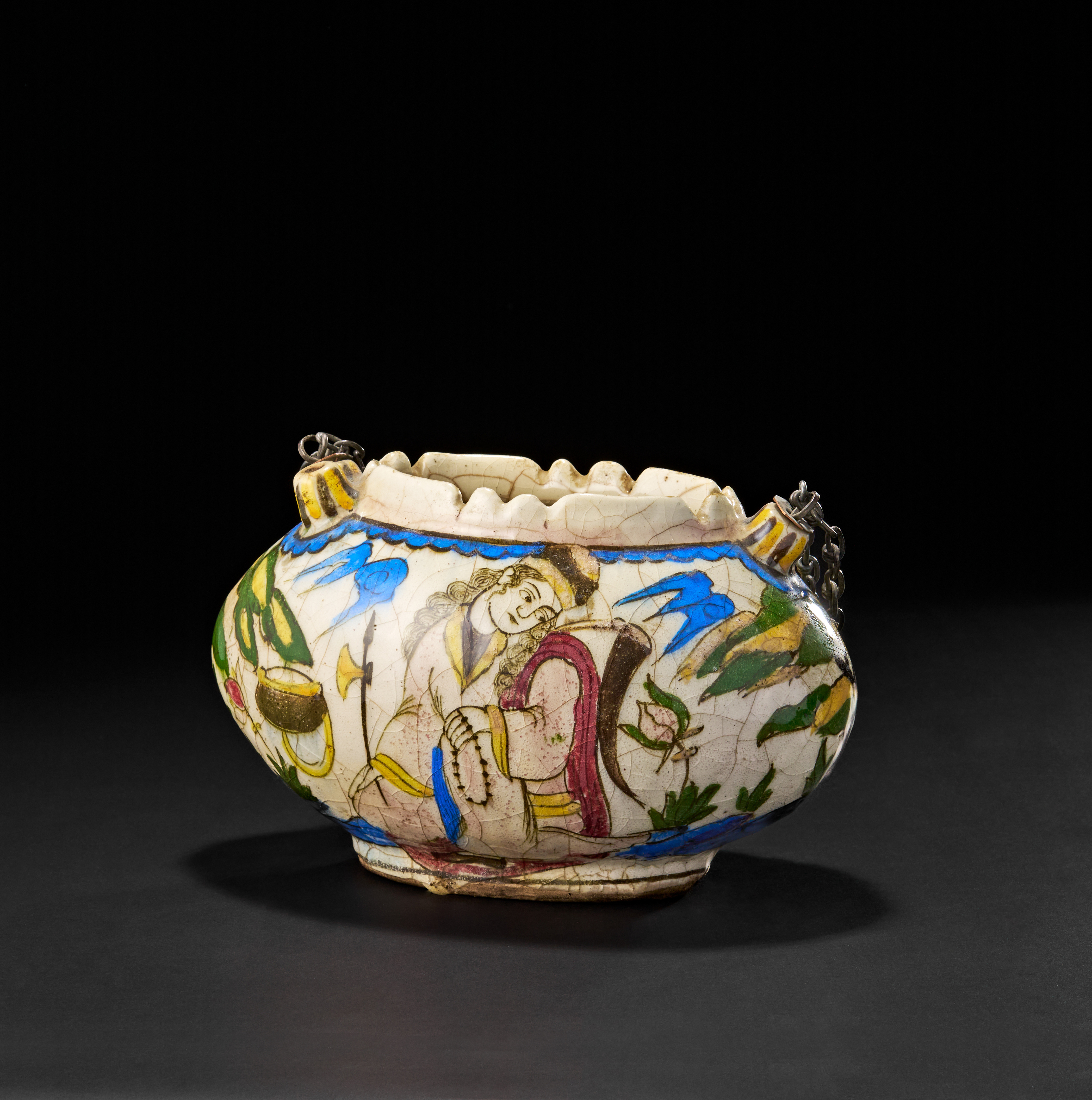 A rare and beautifully hand-painted Kashkul bowl from 19th-century Qajar Persia. Traditionally used by dervishes to collect alms, this crescent-shaped bowl features an exquisite polychrome glaze with figural and floral motifs, including a finely detailed depiction of a seated figure holding prayer beads, surrounded by vibrant flora and birds in flight.