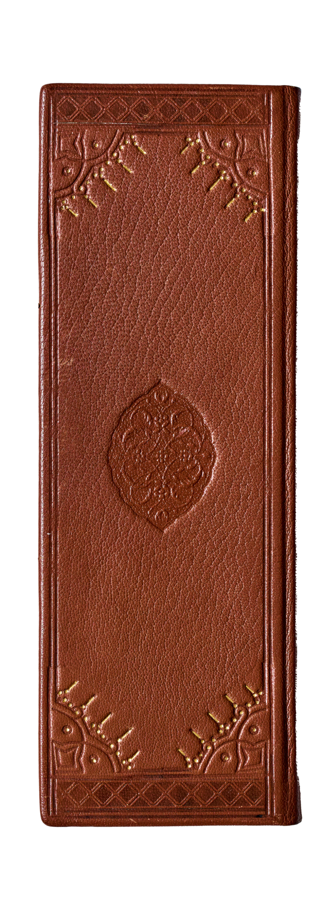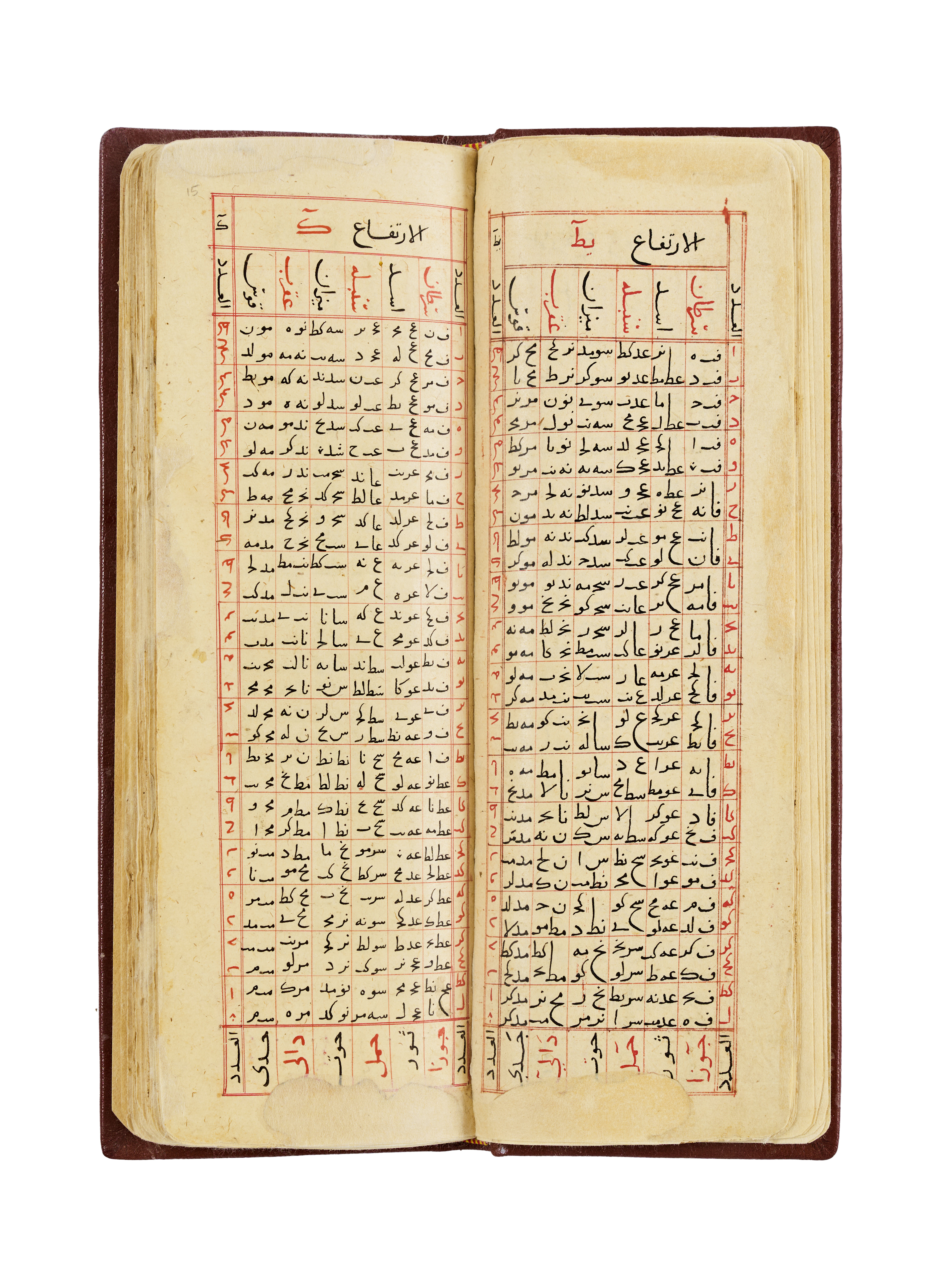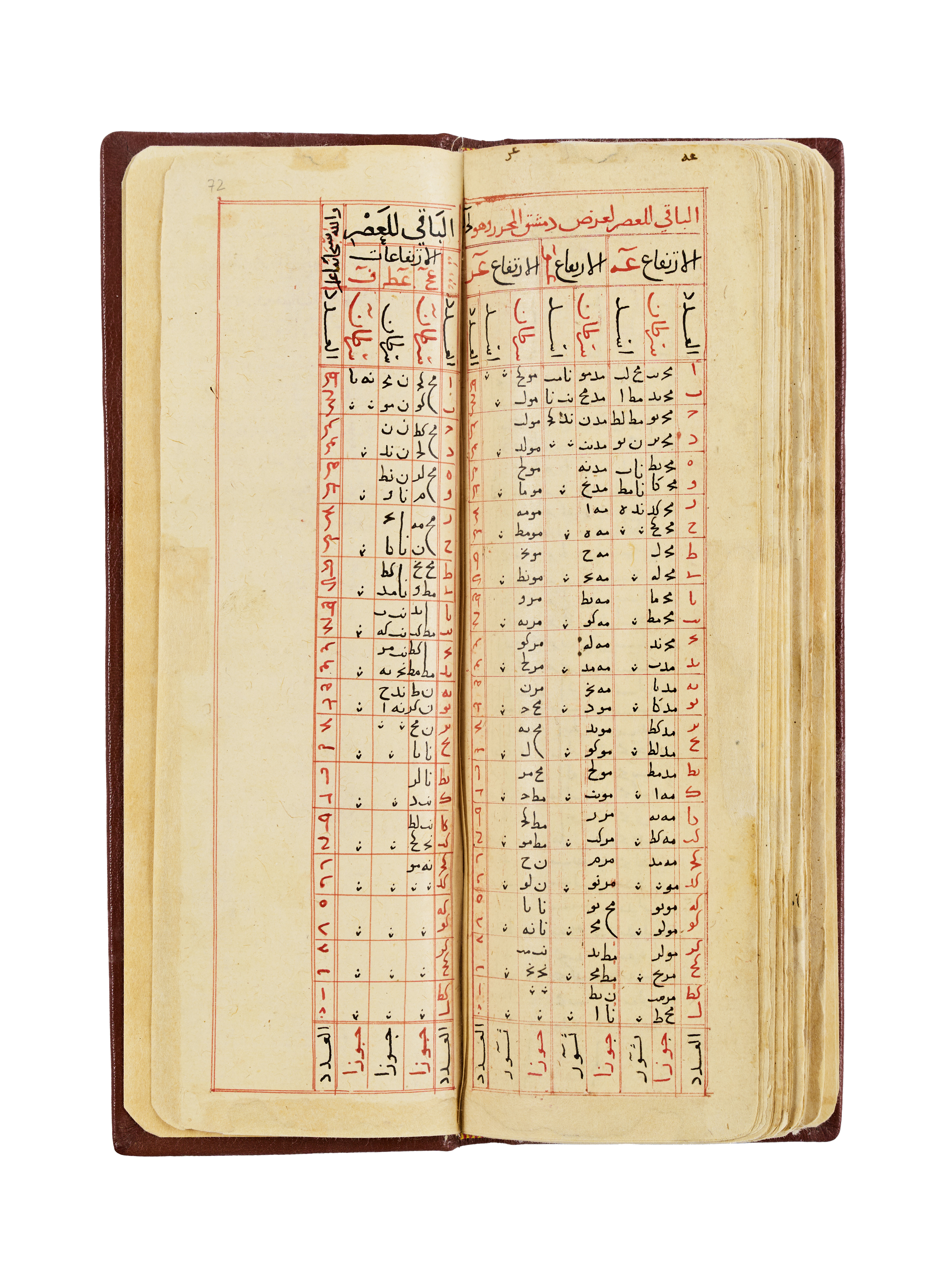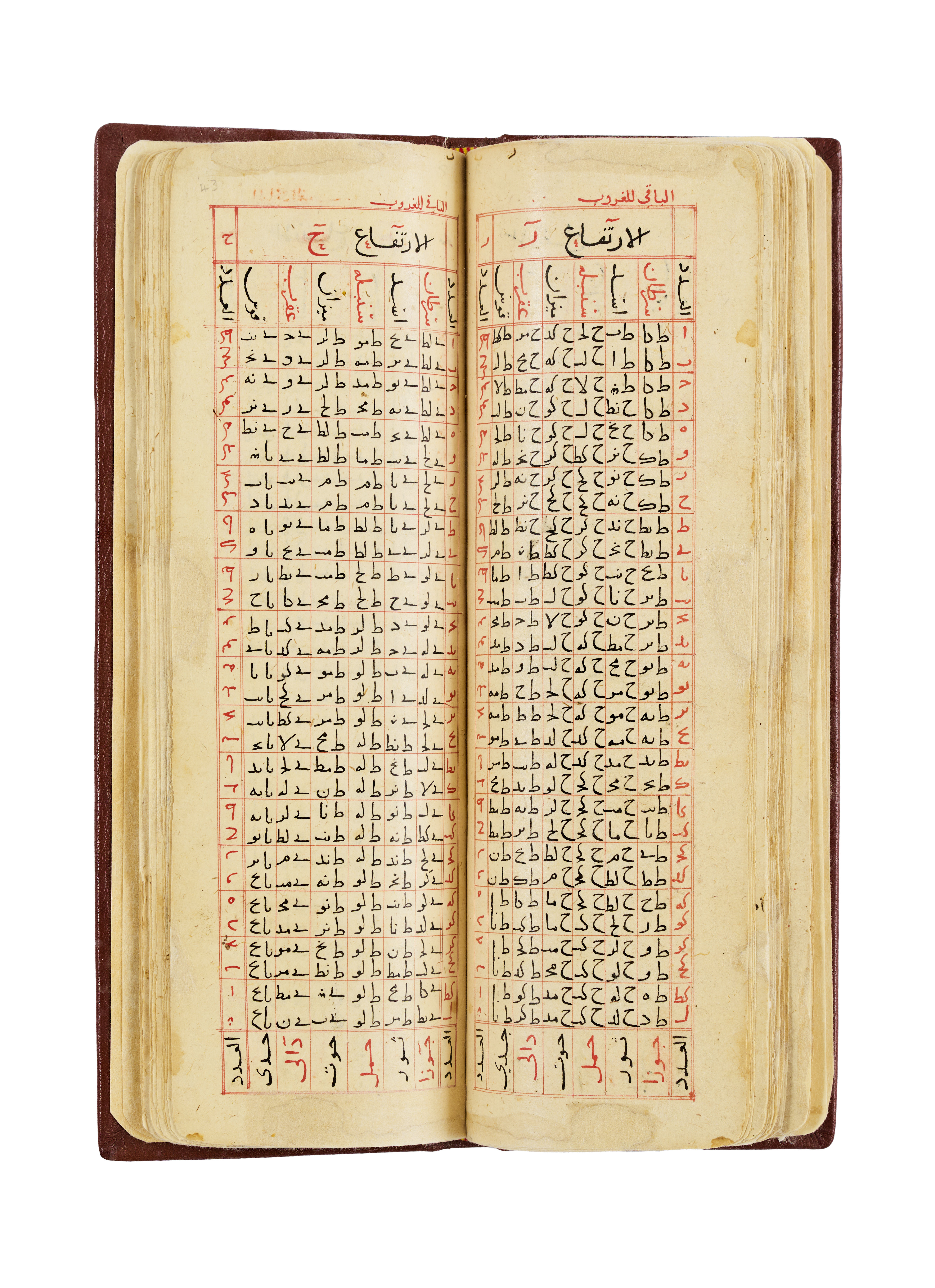 The manuscript features beautifully handwritten Arabic text in black and red inks. It includes precisely structured numerical and alphabetical tables, alongside narrative passages framed with red borders. The work is bound in a leather binding, richly tooled and decorated with embossed motifs and delicate gold highlights.