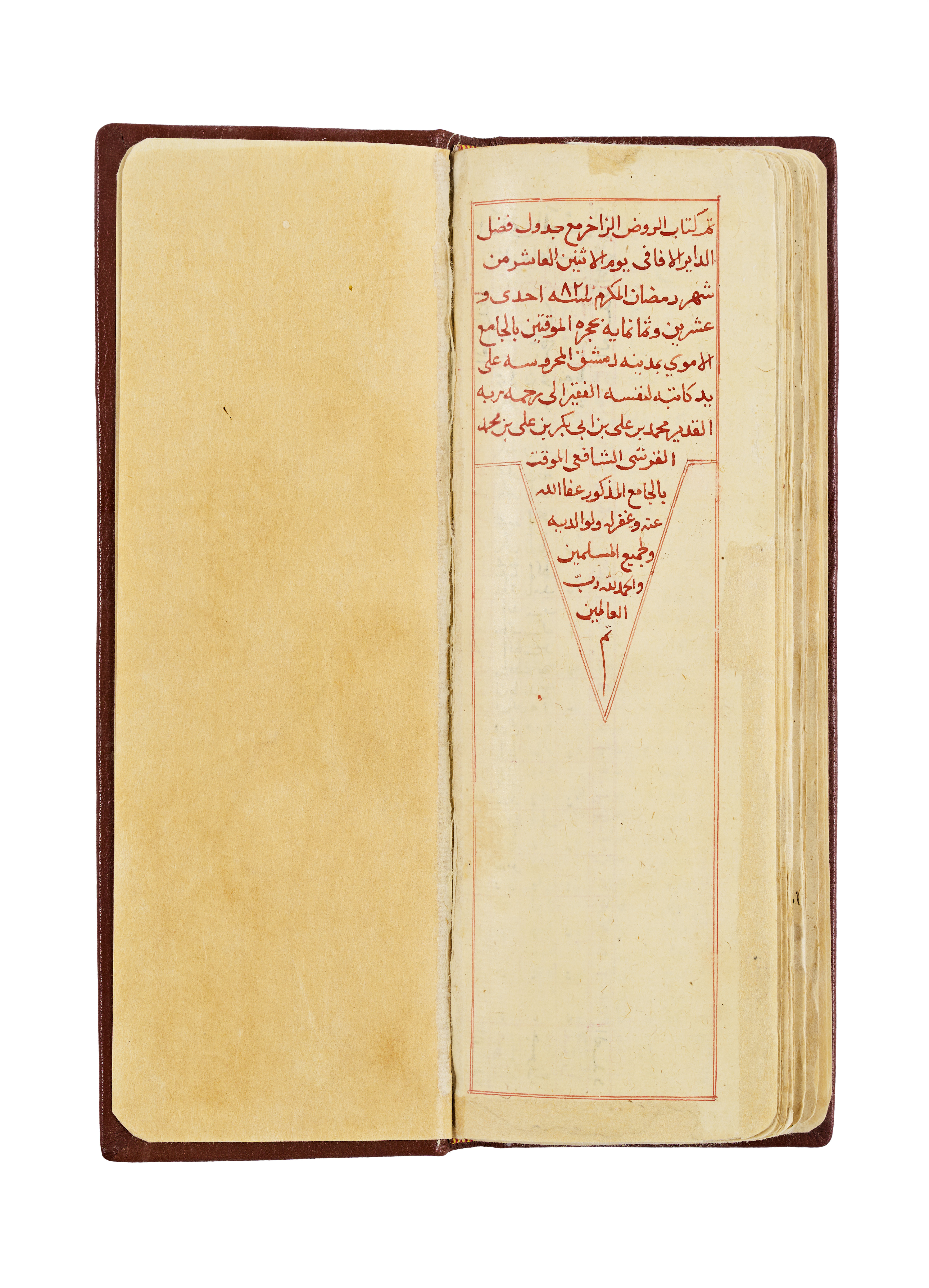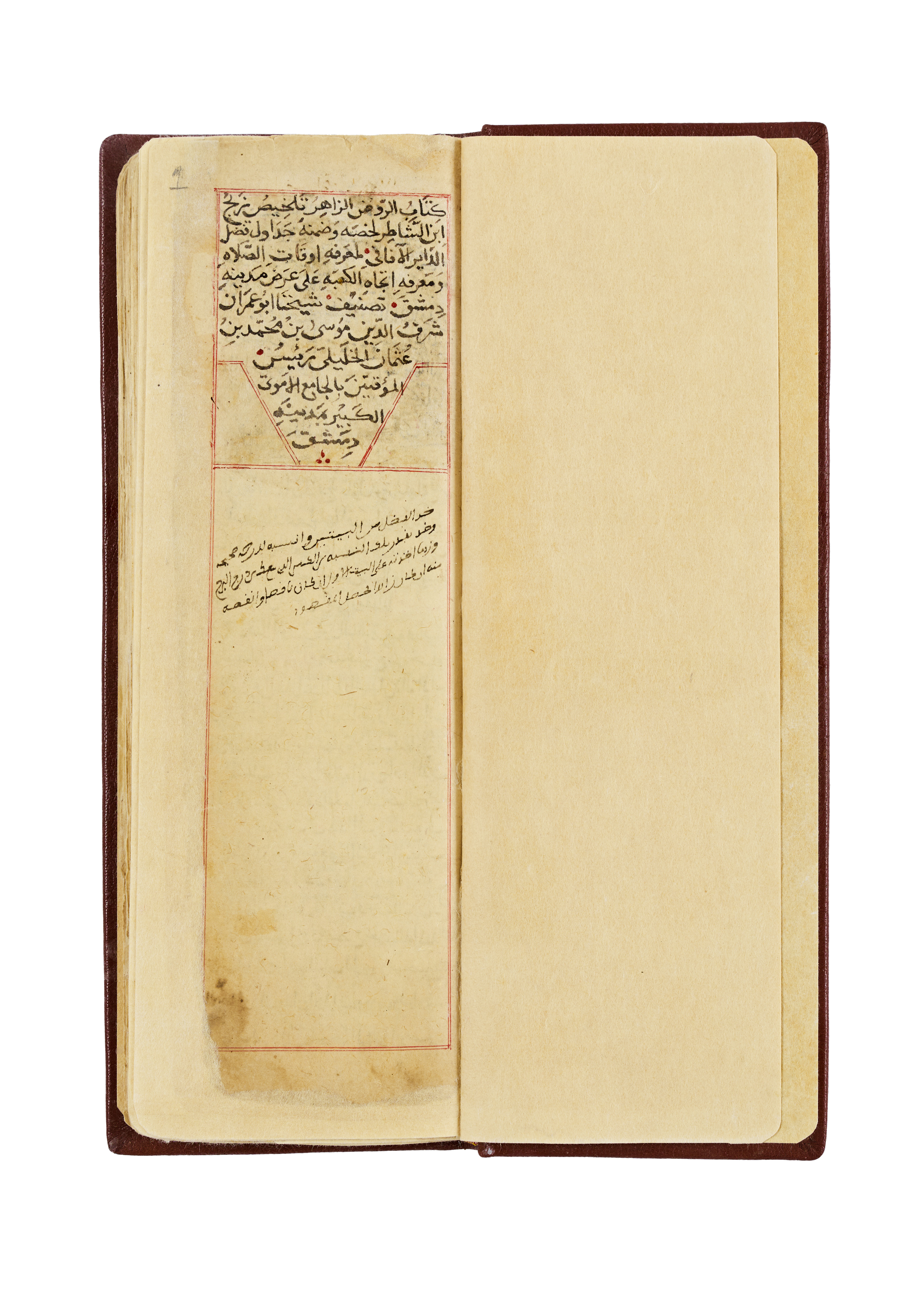 A rare and well-preserved Arabic manuscript titled Ketab al-Rawdh al-Zaher, authored by Sheikh Abu Imran Sharaf al-Deen al-Khalili, the chief timekeeper at the Umayyad Mosque in Damascus. The manuscript is a technical and religious treatise dedicated to determining the horizontal directions of the Kaaba from within the city of Damascus. It reflects a sophisticated understanding of astronomy and mathematics used in the service of Islamic ritual, specifically in establishing the correct direction for prayer (Qibla).