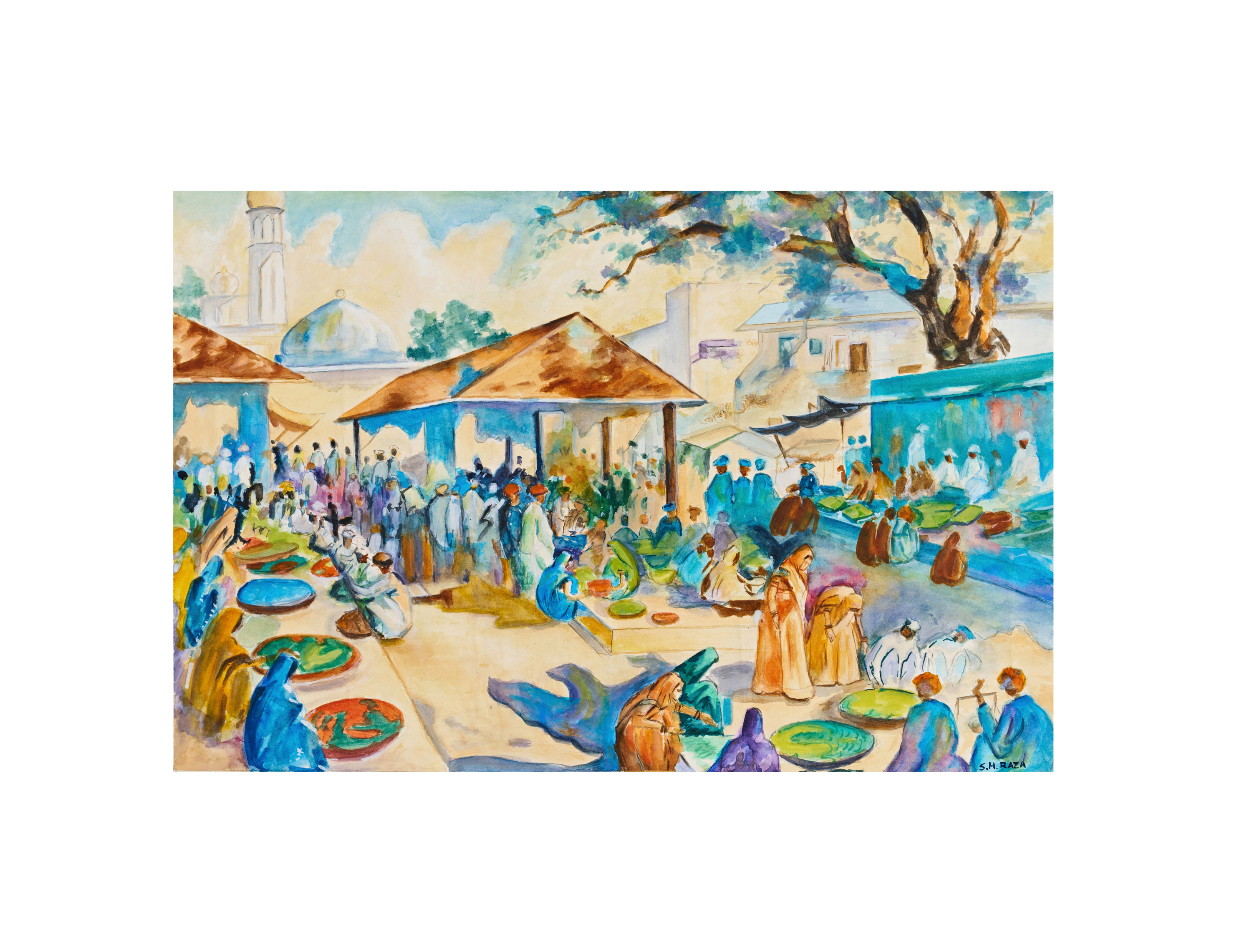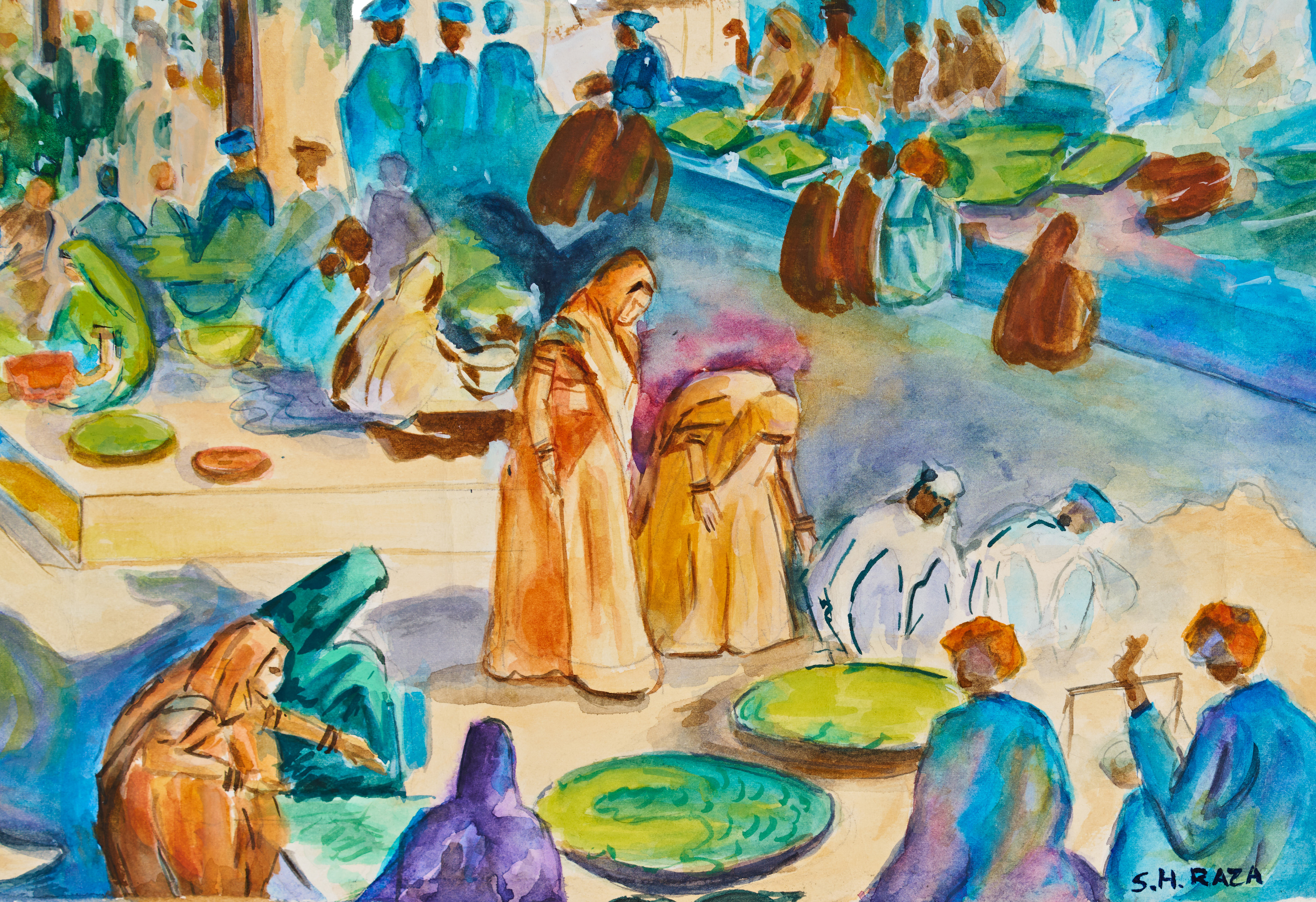 A vibrant watercolour painting signed Sayed Haider Raza captures the lively spirit of a traditional Indian marketplace. Rendered in fluid brushstrokes and a rich palette of earthy ochres, vibrant blues, and lush greens, the composition teems with figures engaged in daily activities.
