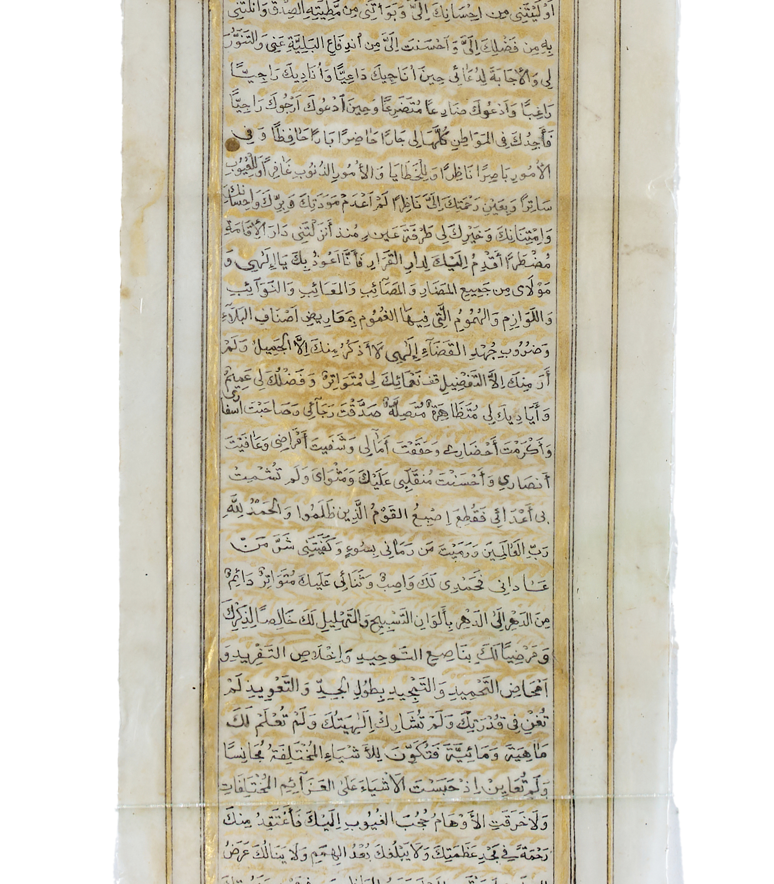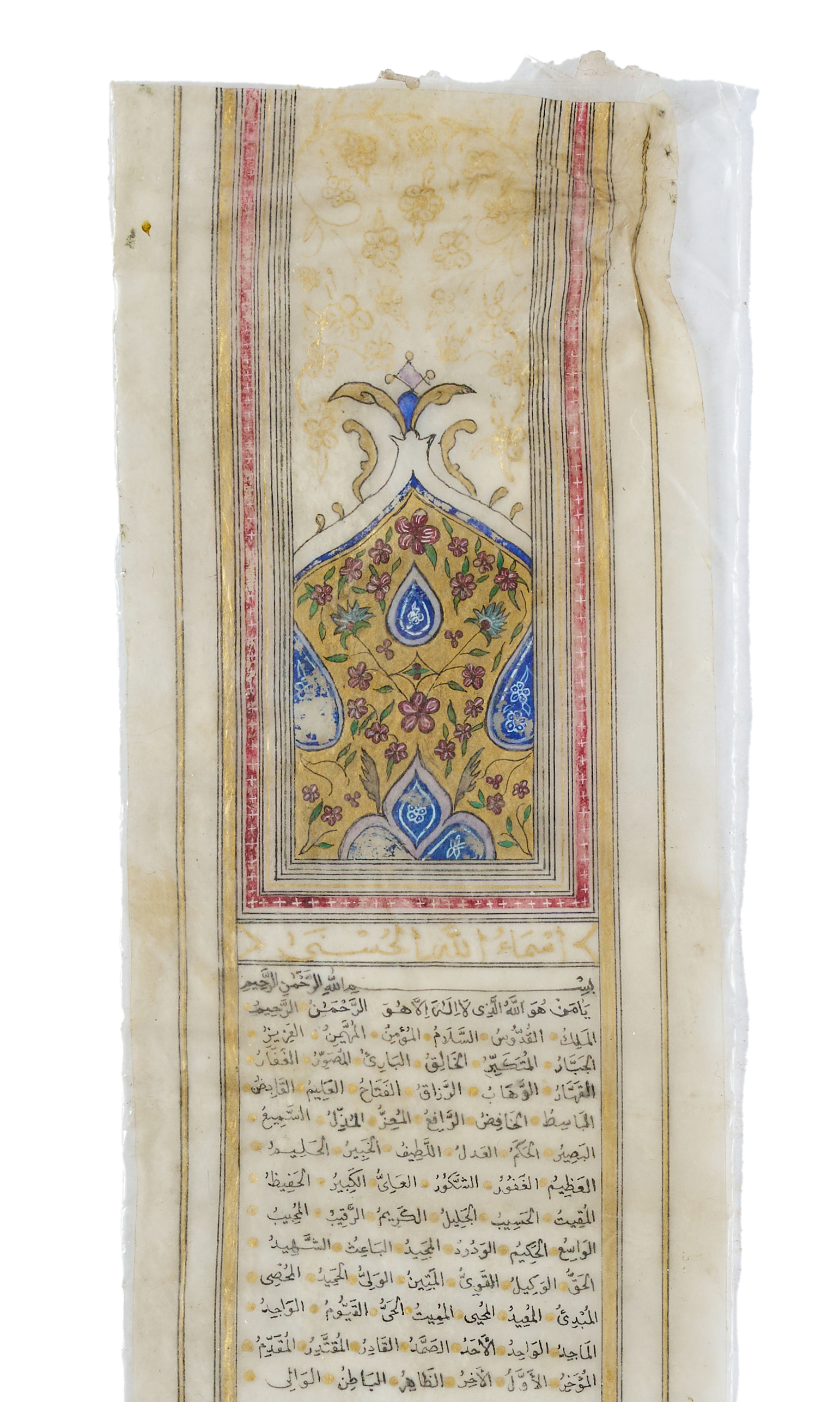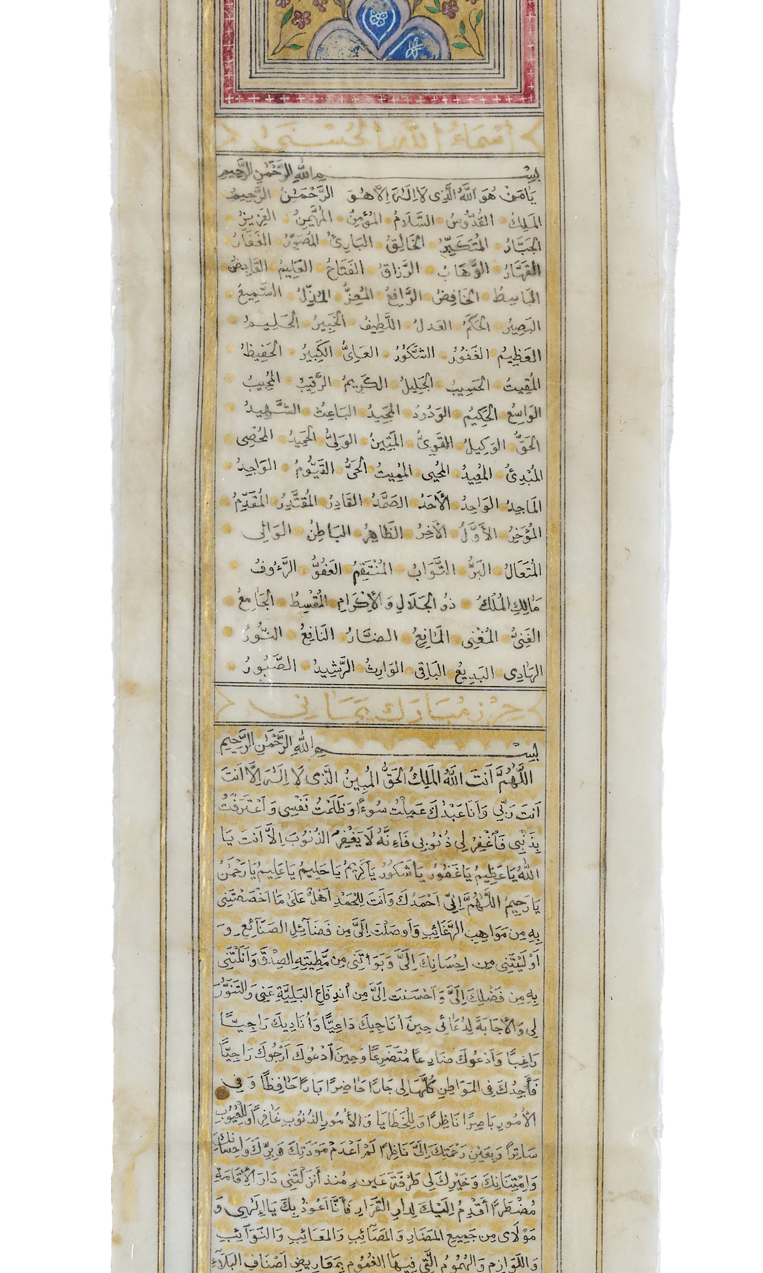 An amuletic prayer scroll from Safavid Persia, dating to the 17th or 18th century. Executed on a vellum, this elongated manuscript is penned in elegant black naskh script with gold embellishments and ruled borders throughout. The opening features a finely illuminated headpiece (ʿunwan) in vibrant blue, gold, and red pigments, displaying floral arabesques. The scroll contains a series of protective and devotional invocations. The text includes invocations to the Divine Names, Qur’anic verses, and prayers designed to guard the bearer from misfortune and illness.