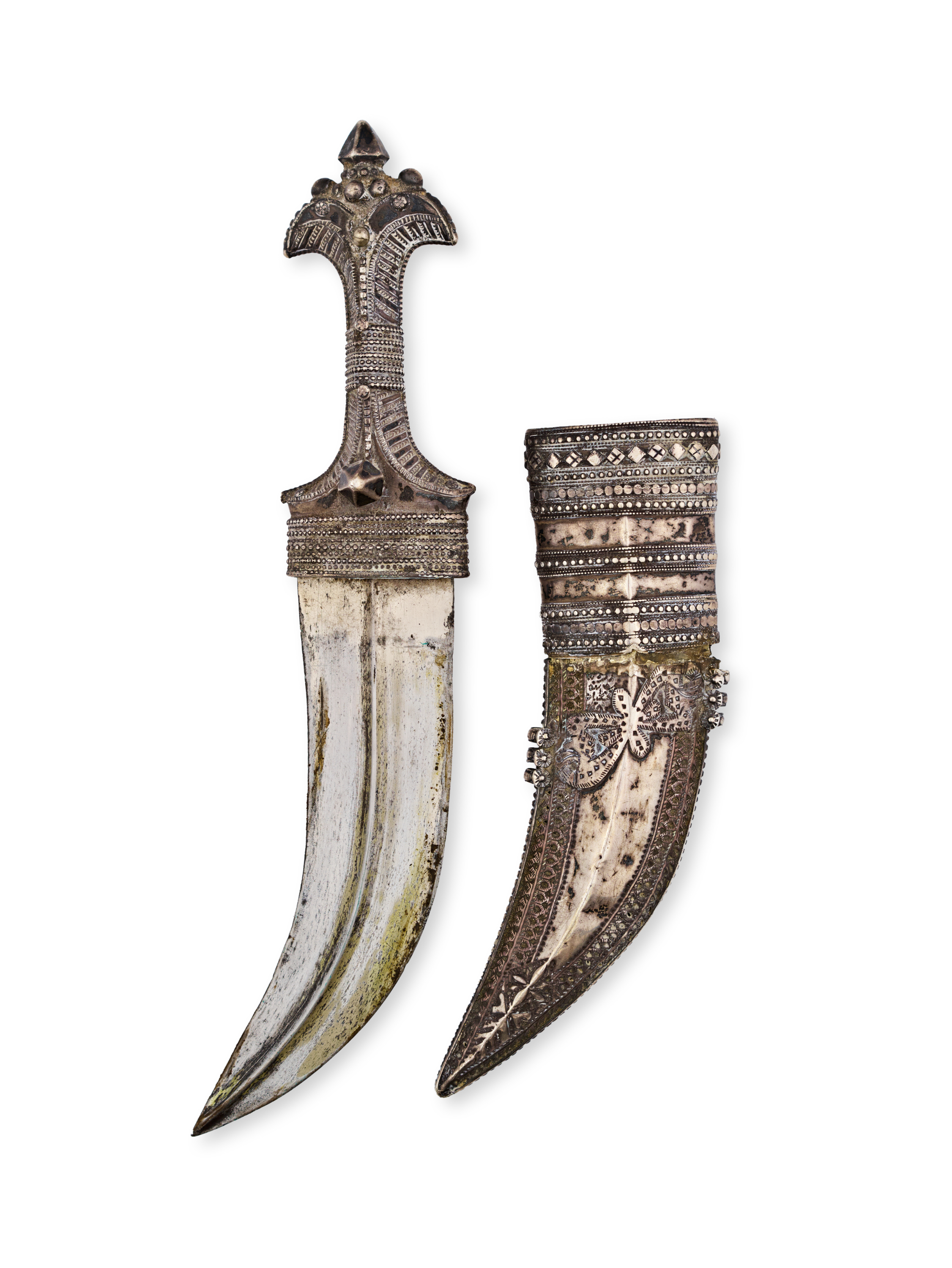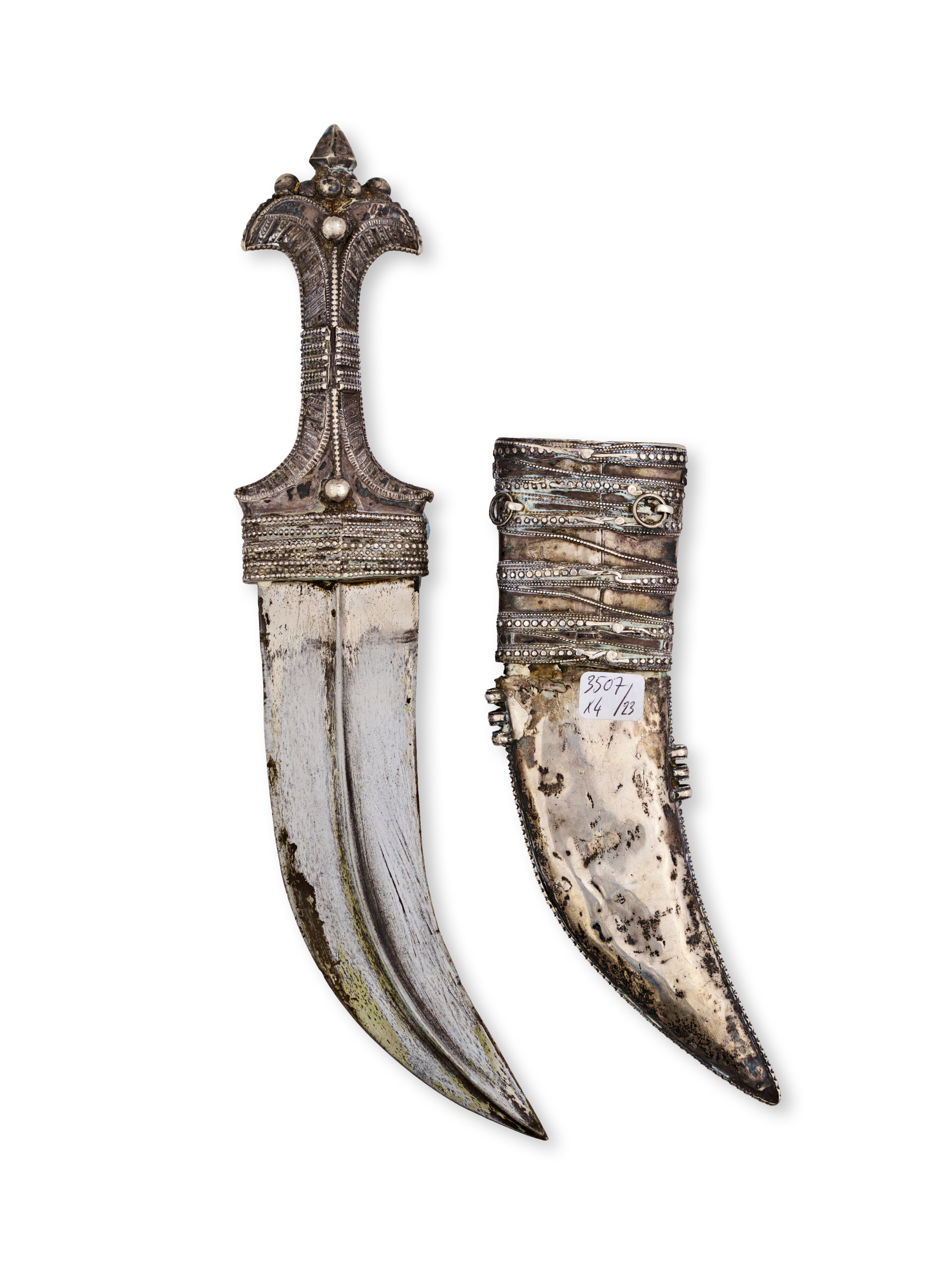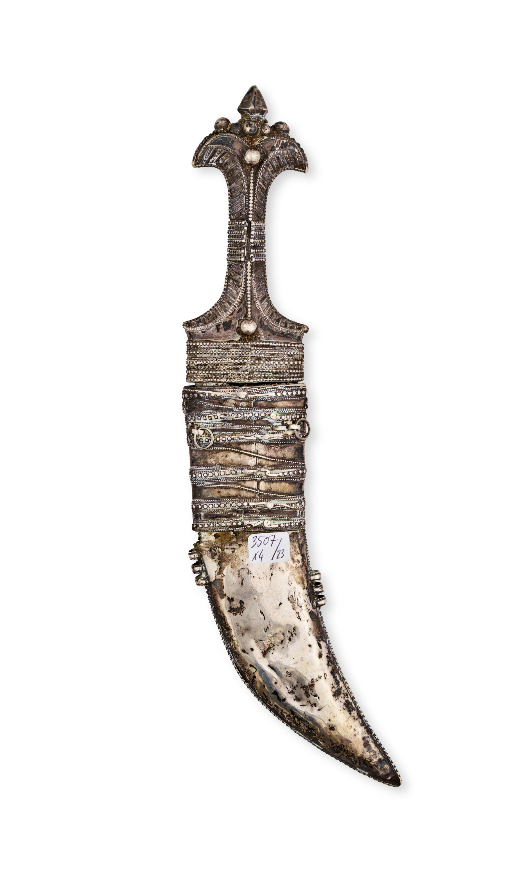 A curved Jambiya dagger housed in a finely crafted silver-mounted sheath. The hilt of distinctive flared design, entirely decorated with applied filigree motifs and intricate silver beading. The scabbard is profusely adorned with horizontal bands of applied filigree and chased motifs, interspersed with raised roundels and diamond motifs, culminating in a tapering chape with further foliate decoration. The blade with a pronounced central ridge and double-fullered design.