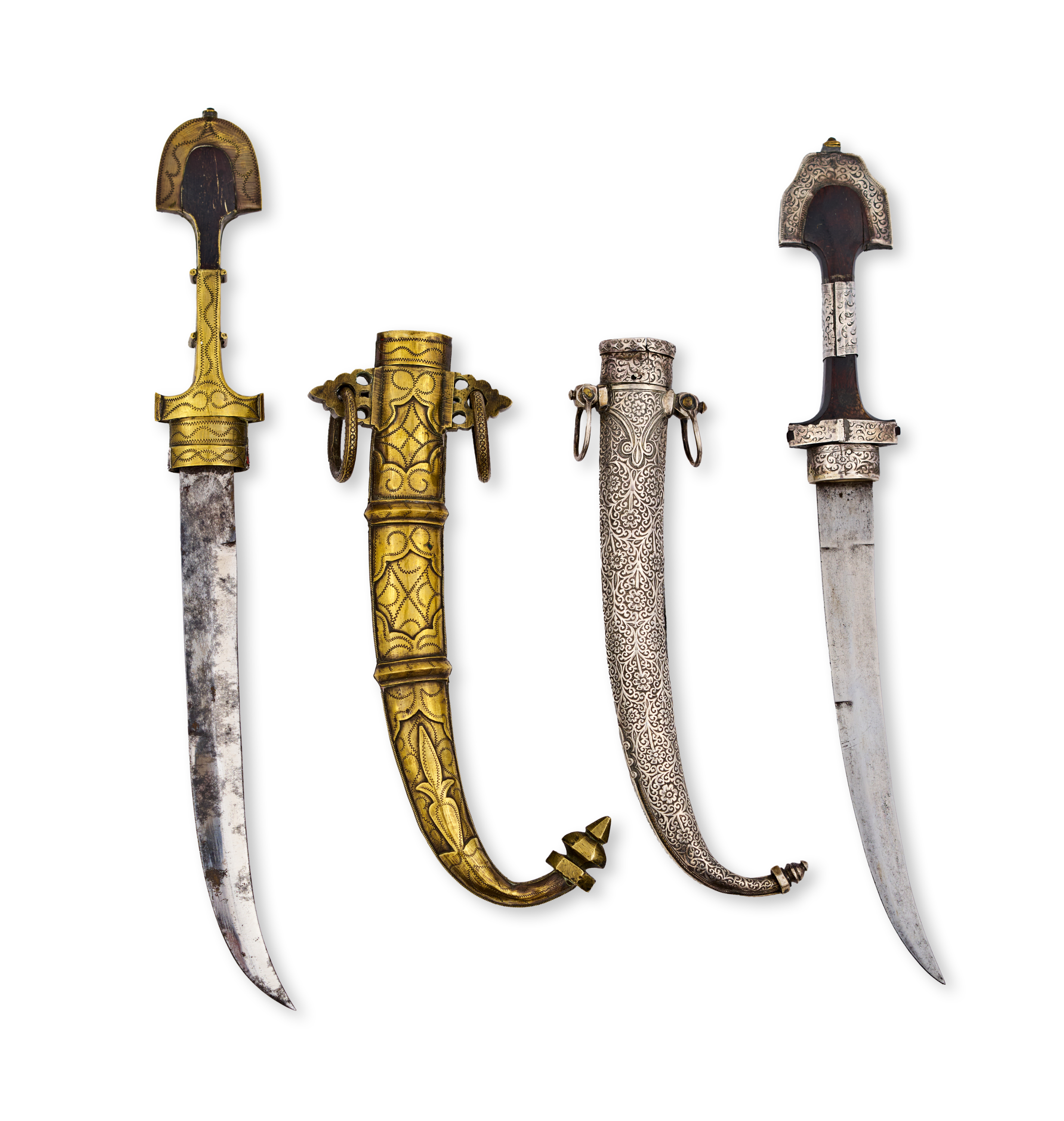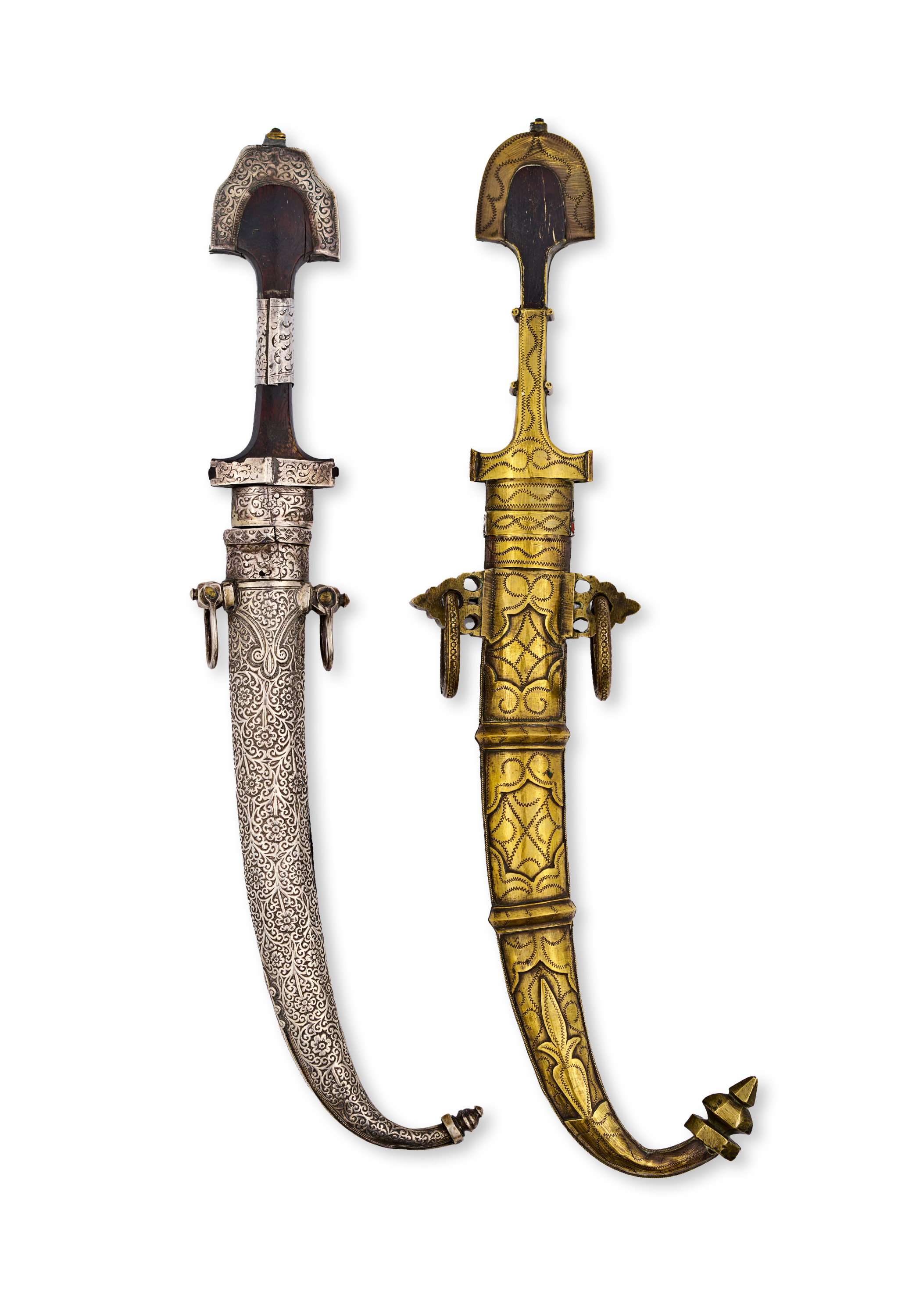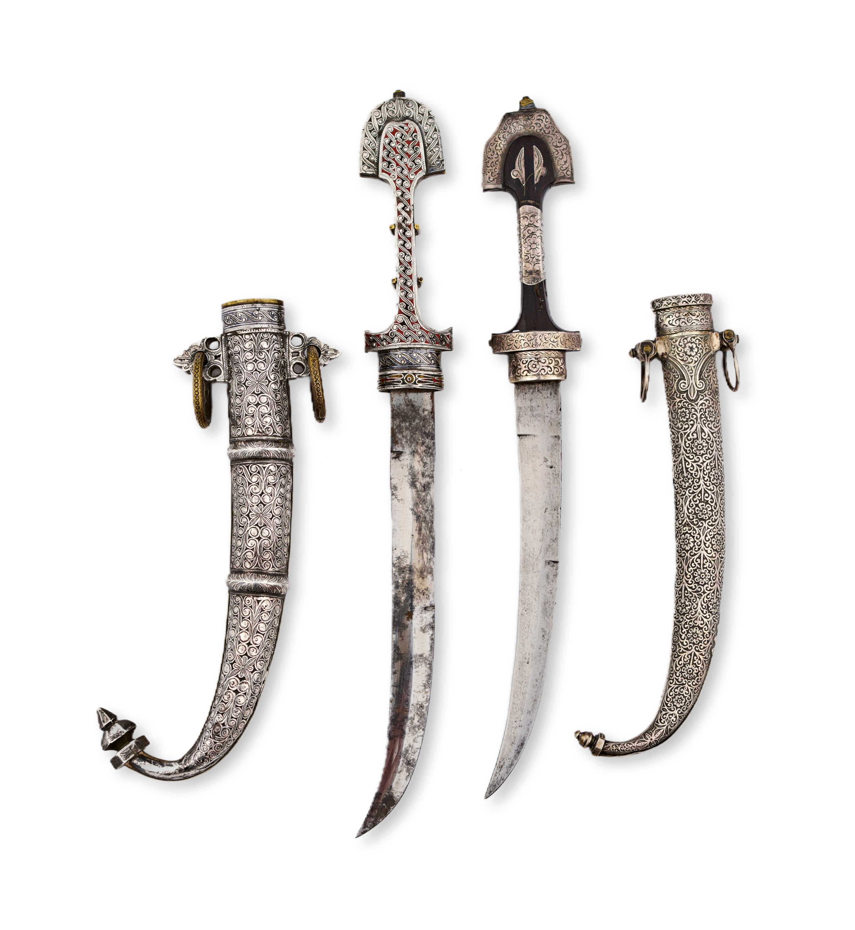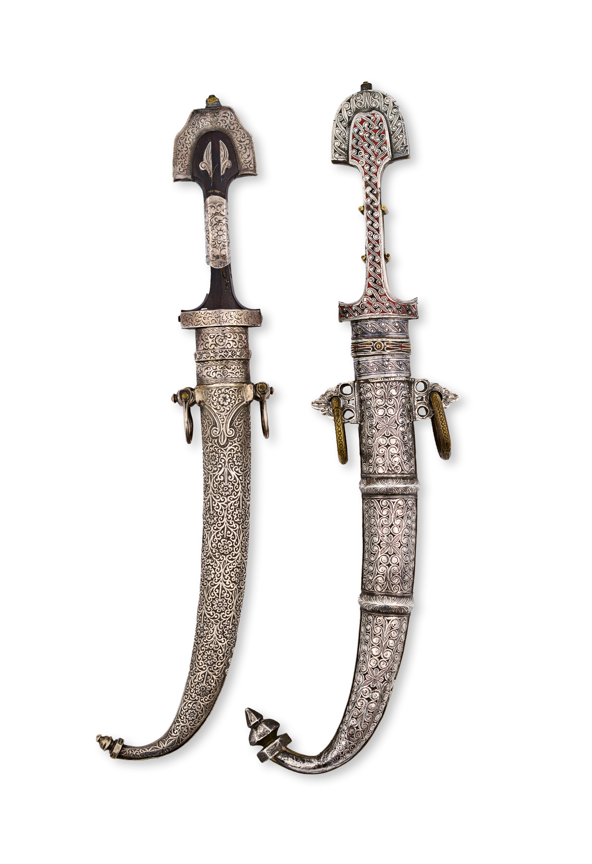 Each of curved form, the silver scabbards decorated with finely incised floral and foliate motifs, one further adorned with enamel details, the other with niello work; both hilts featuring traditional flared pommels and intricate engraving, retaining suspension rings and mounts; steel blades of slightly varying curvature.